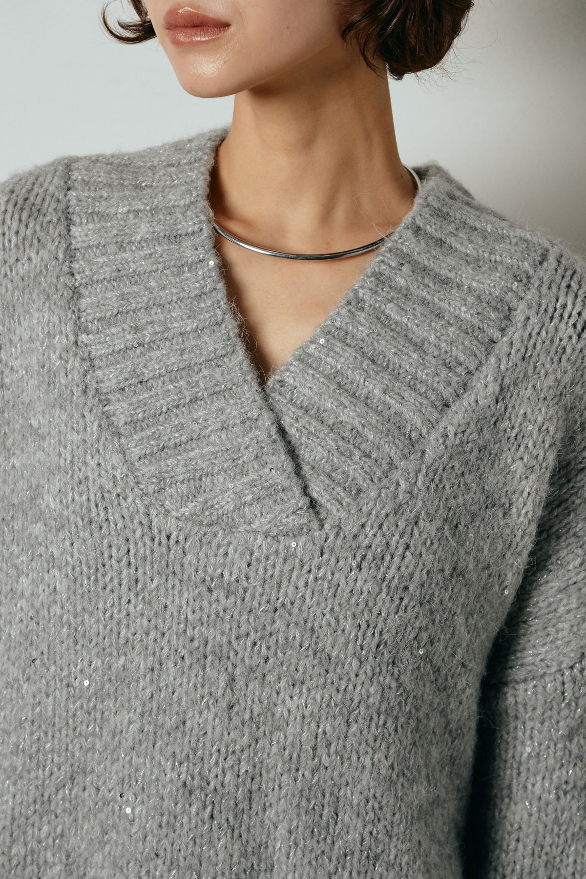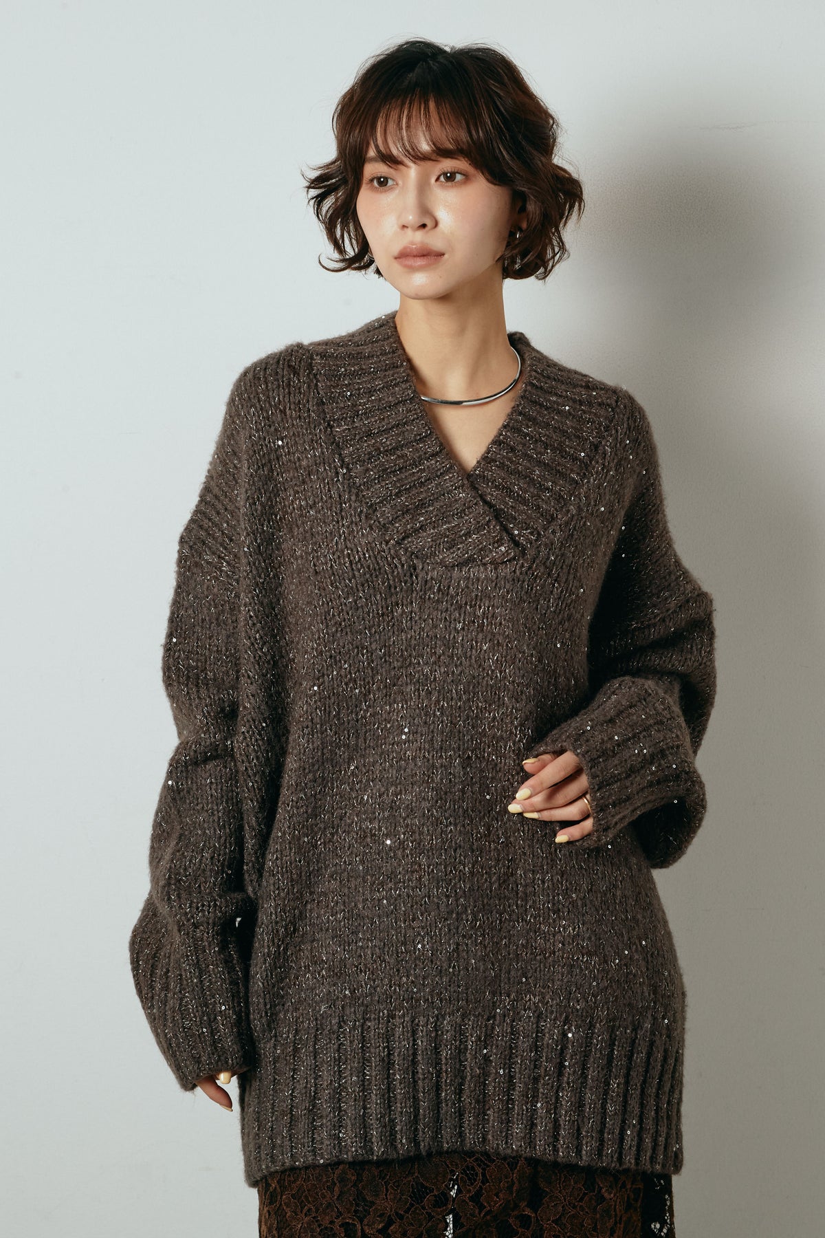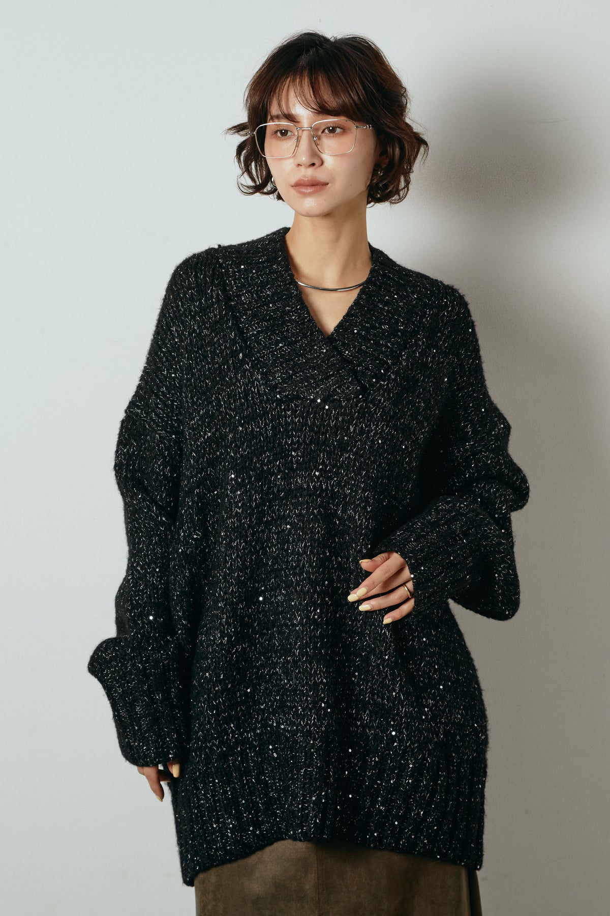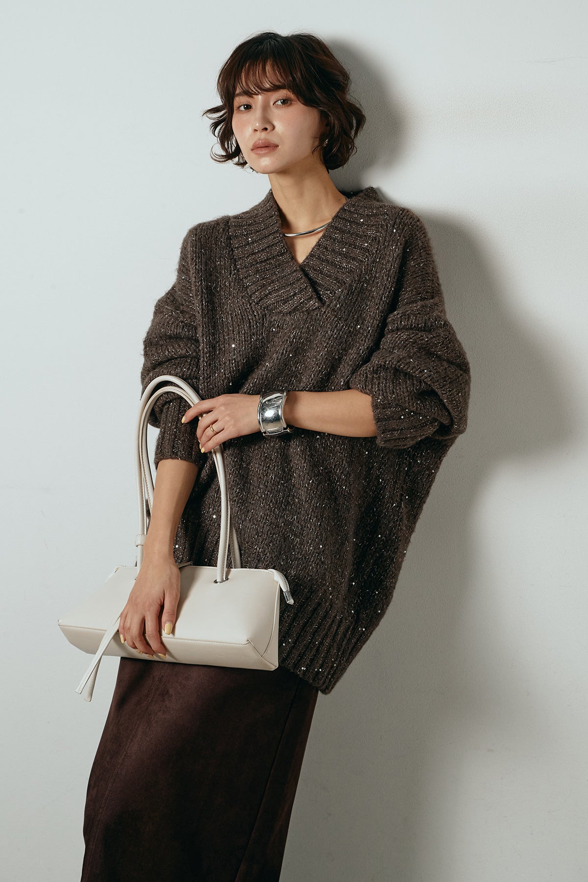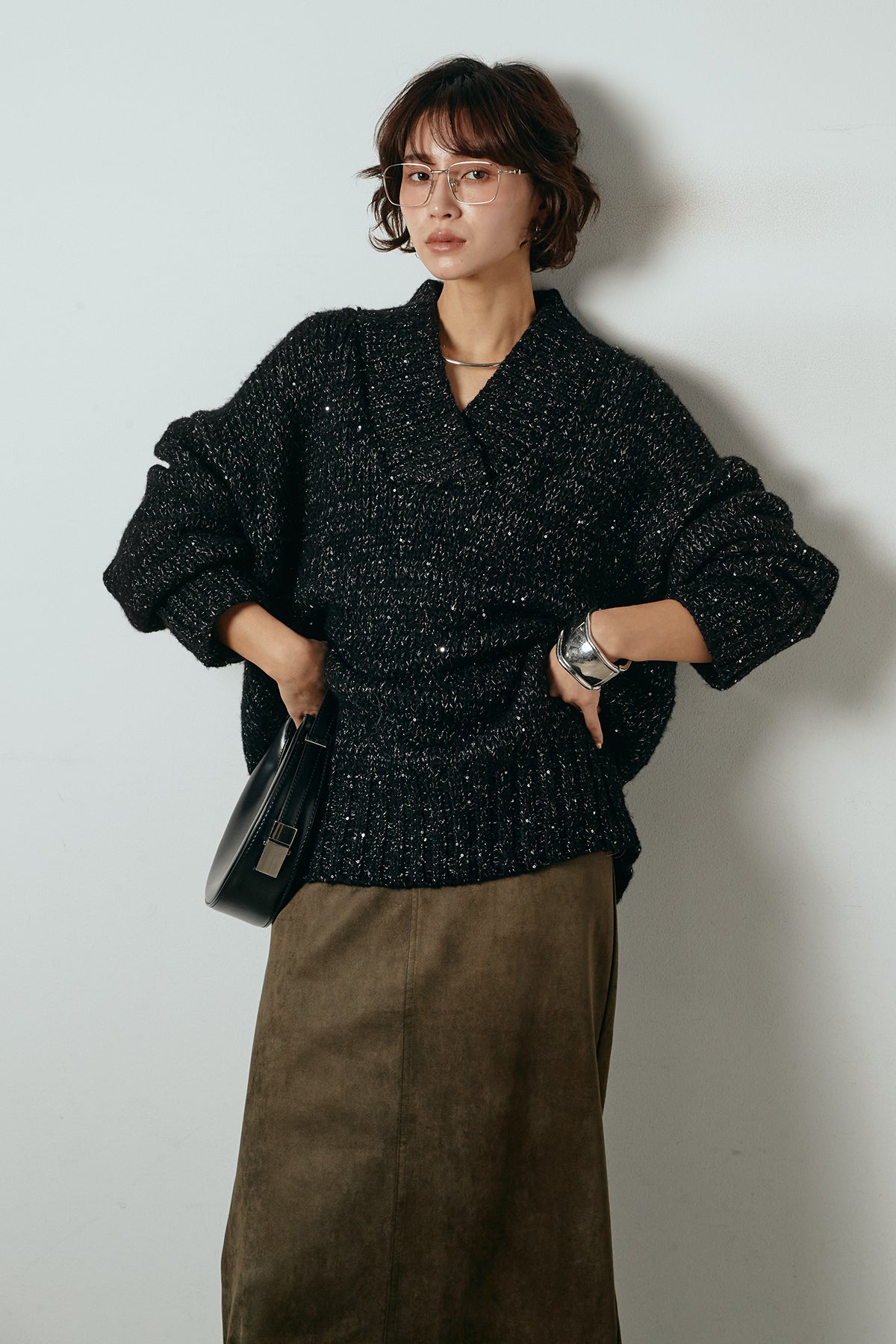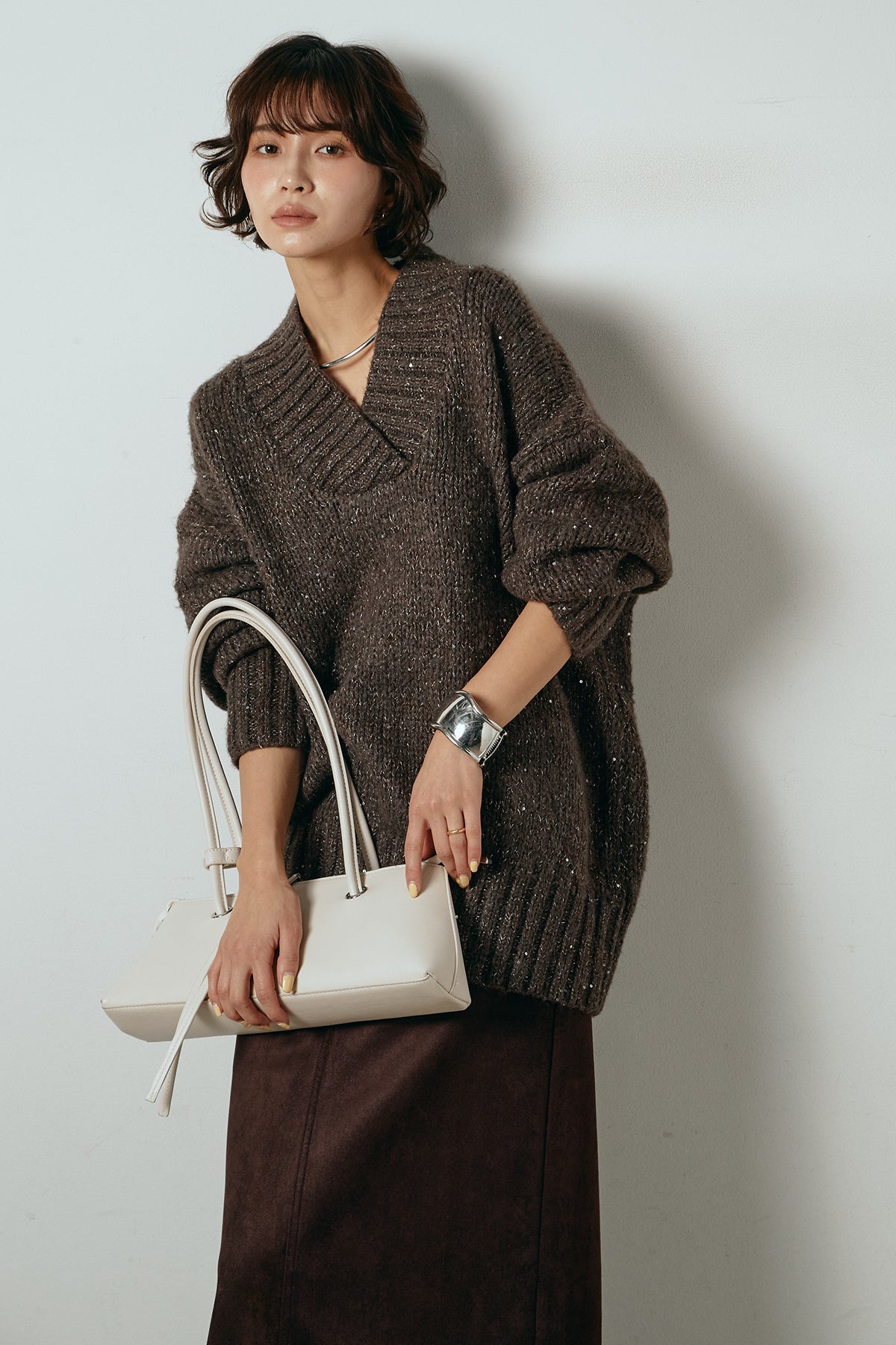 ラメ糸をさりげなく織り込んだ、上品な輝きが魅力のVネックニットトップス。程よくゆとりのあるシルエットと、広めに開いたVネックが顔まわりをすっきりと見せてくれます。リブ編みを効かせたネックラインと袖口が全体を引き締め、ラフになりすぎないバランスに。パンツにもスカートにも合わせやすく、シンプルながら華やかさを添える一枚です。