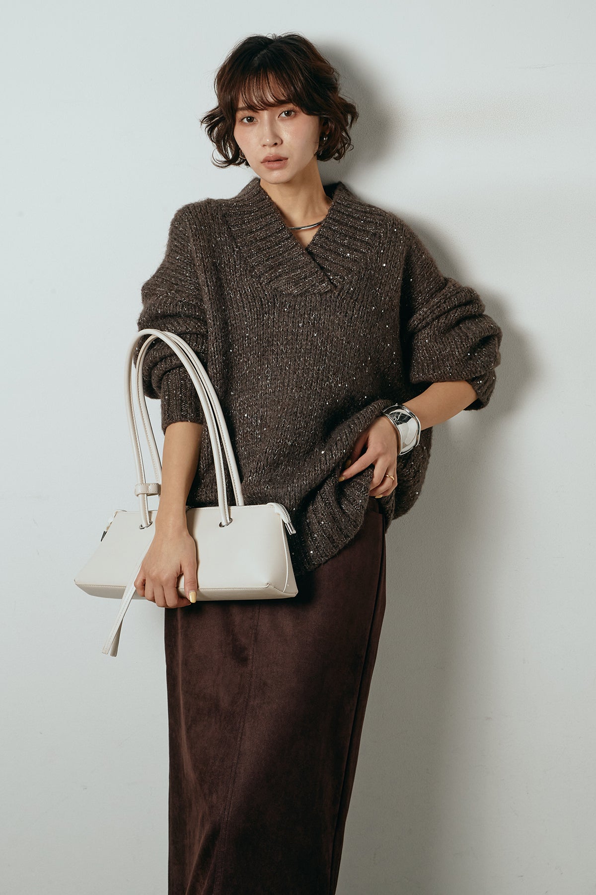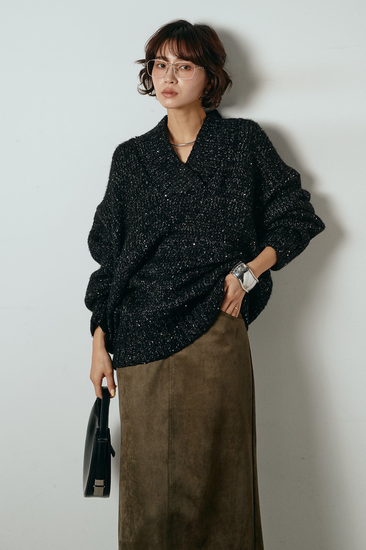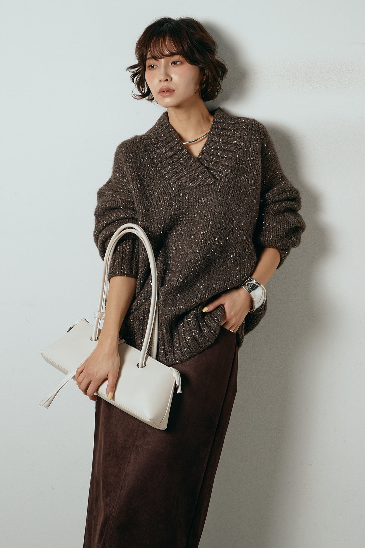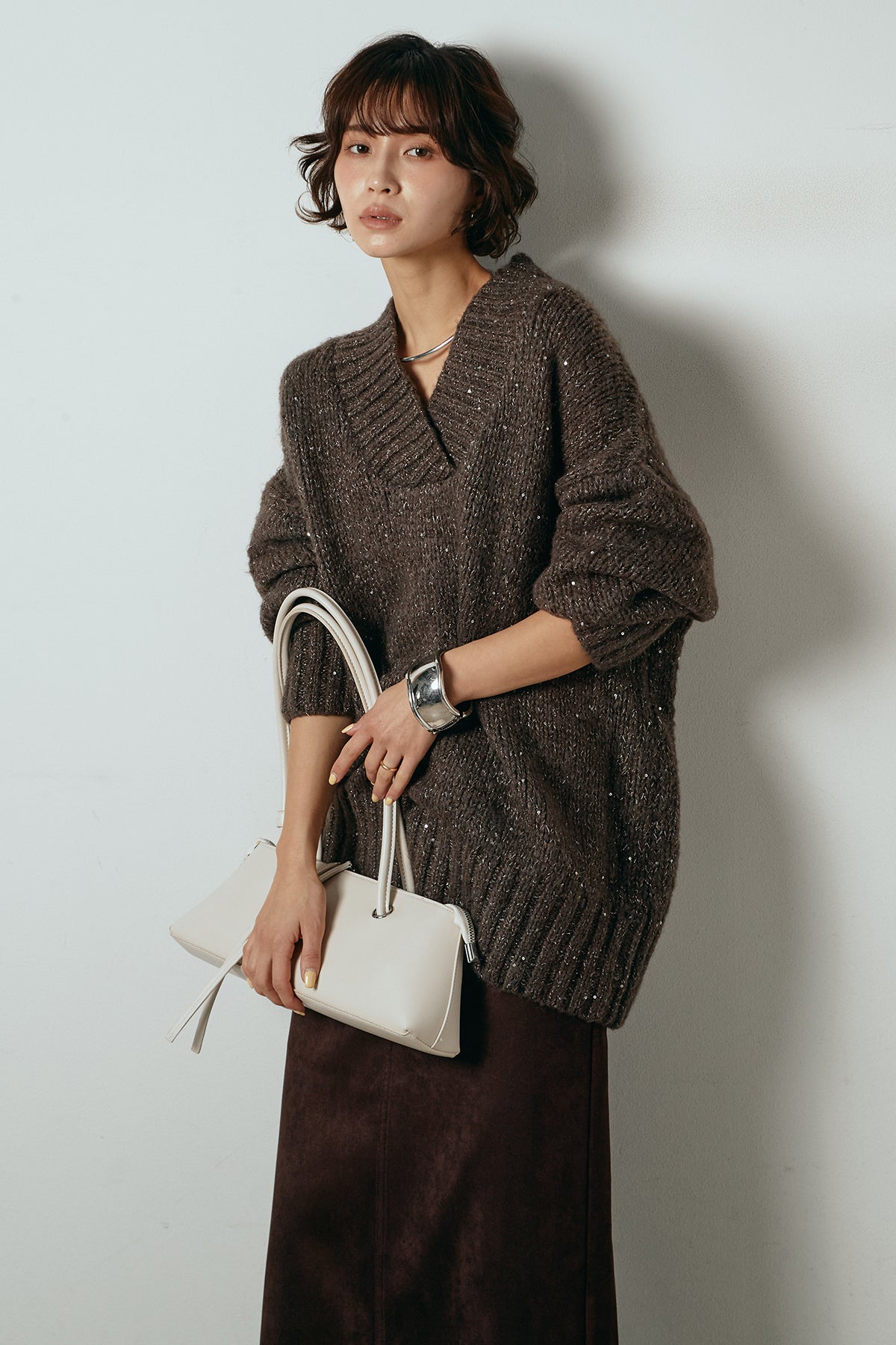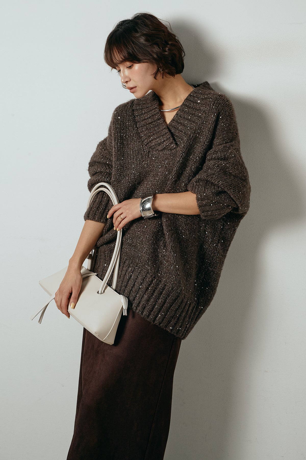 ラメ糸をさりげなく織り込んだ、上品な輝きが魅力のVネックニットトップス。程よくゆとりのあるシルエットと、広めに開いたVネックが顔まわりをすっきりと見せてくれます。リブ編みを効かせたネックラインと袖口が全体を引き締め、ラフになりすぎないバランスに。パンツにもスカートにも合わせやすく、シンプルながら華やかさを添える一枚です。
