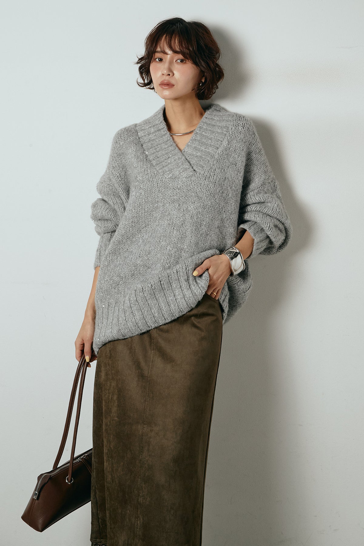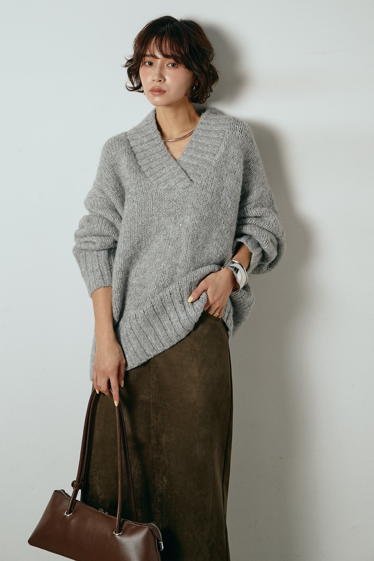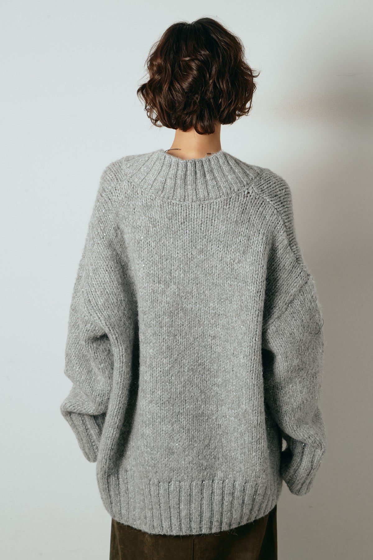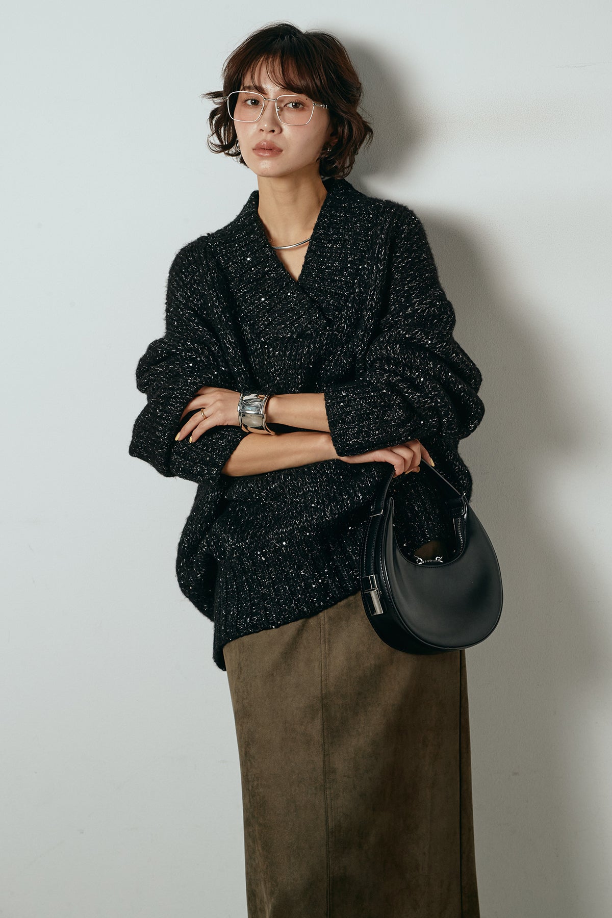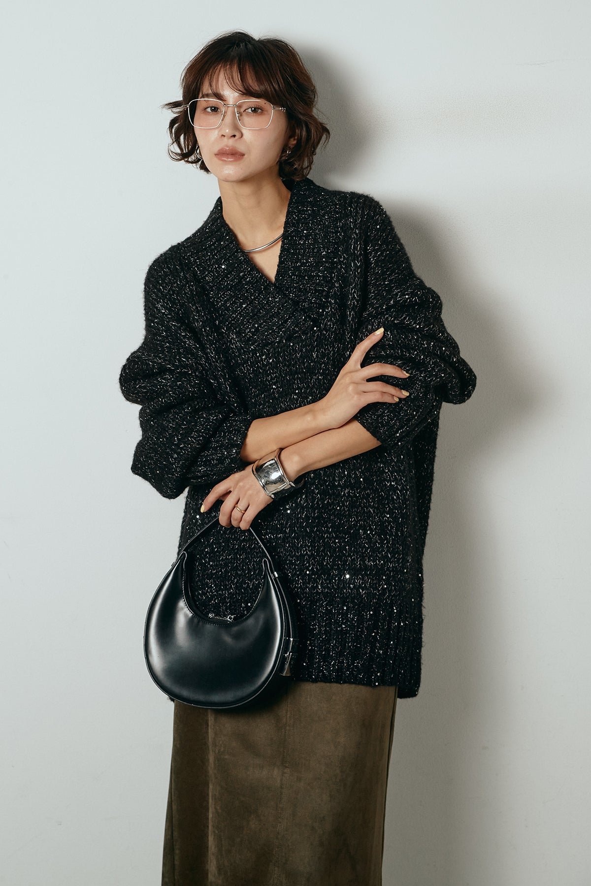 ラメ糸をさりげなく織り込んだ、上品な輝きが魅力のVネックニットトップス。程よくゆとりのあるシルエットと、広めに開いたVネックが顔まわりをすっきりと見せてくれます。リブ編みを効かせたネックラインと袖口が全体を引き締め、ラフになりすぎないバランスに。パンツにもスカートにも合わせやすく、シンプルながら華やかさを添える一枚です。