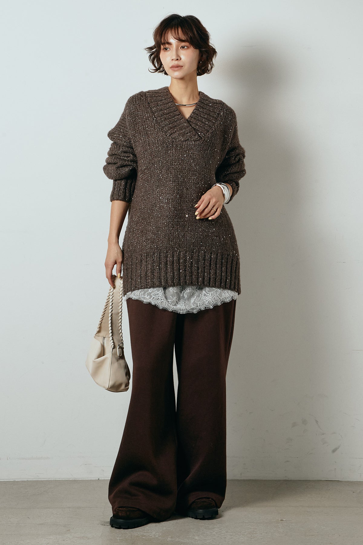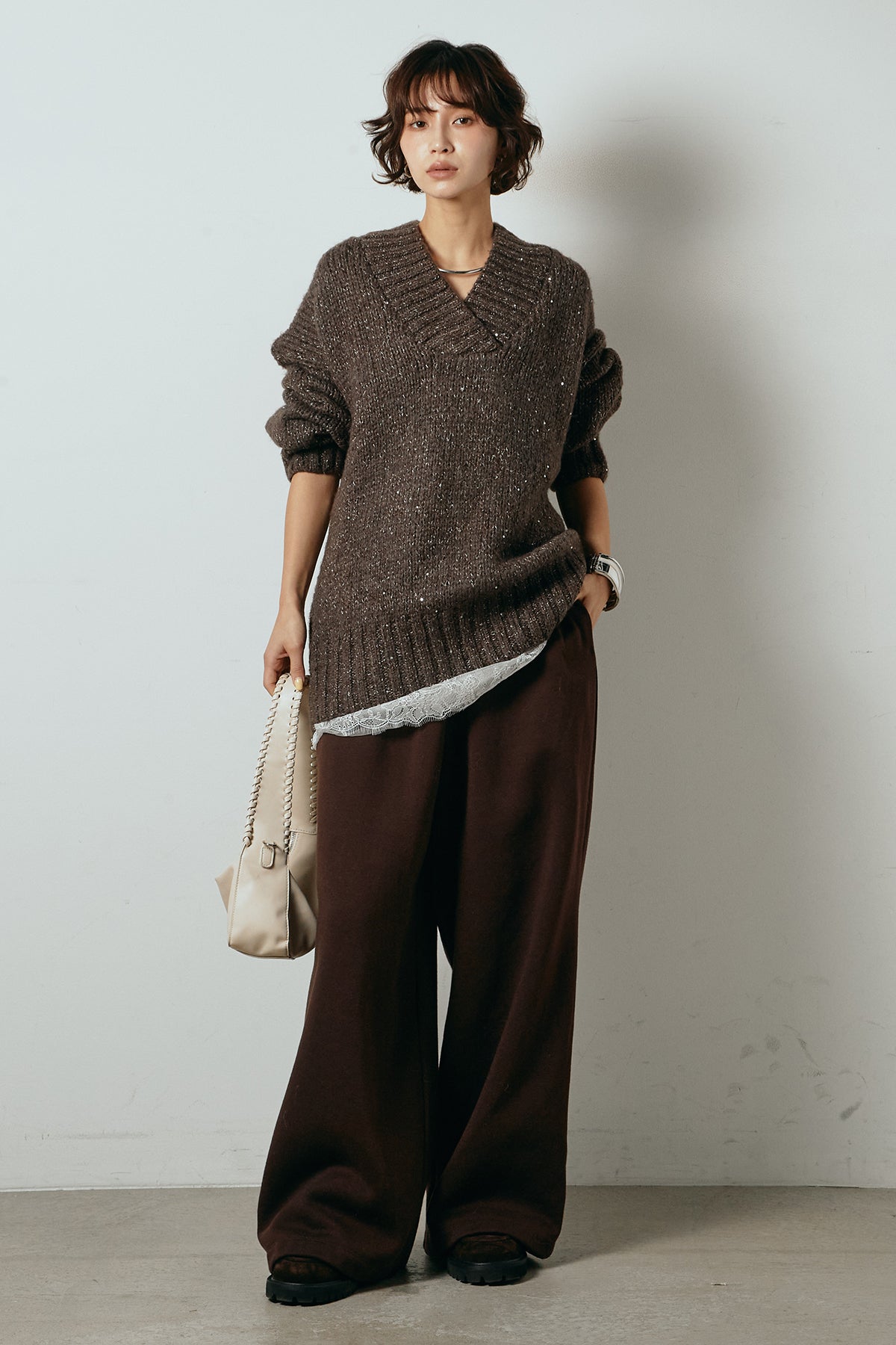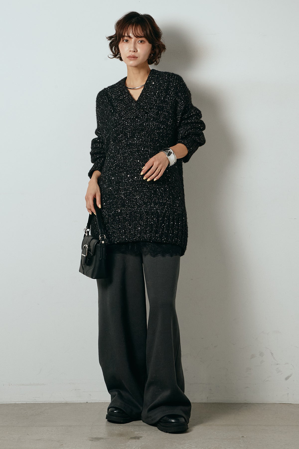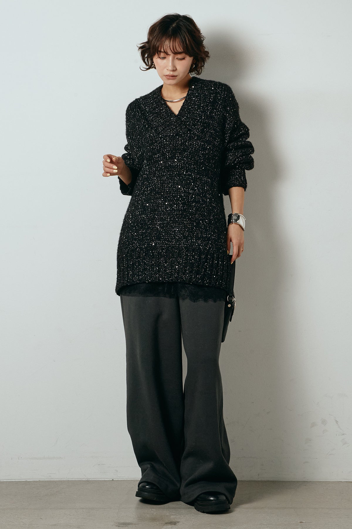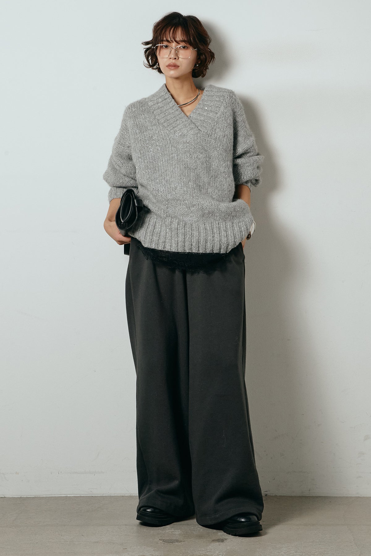 [SET]Vネックラメニットトップス+裏起毛スウェットワイドパンツ+レース切り替えキャミソール(3set)