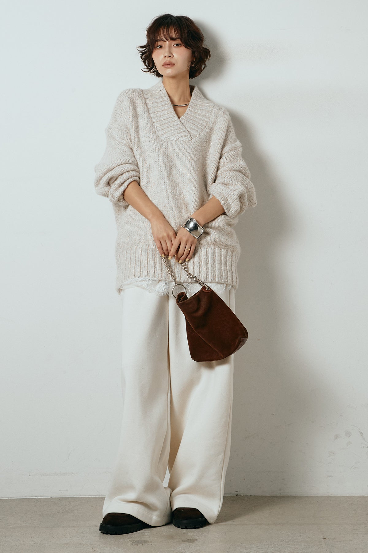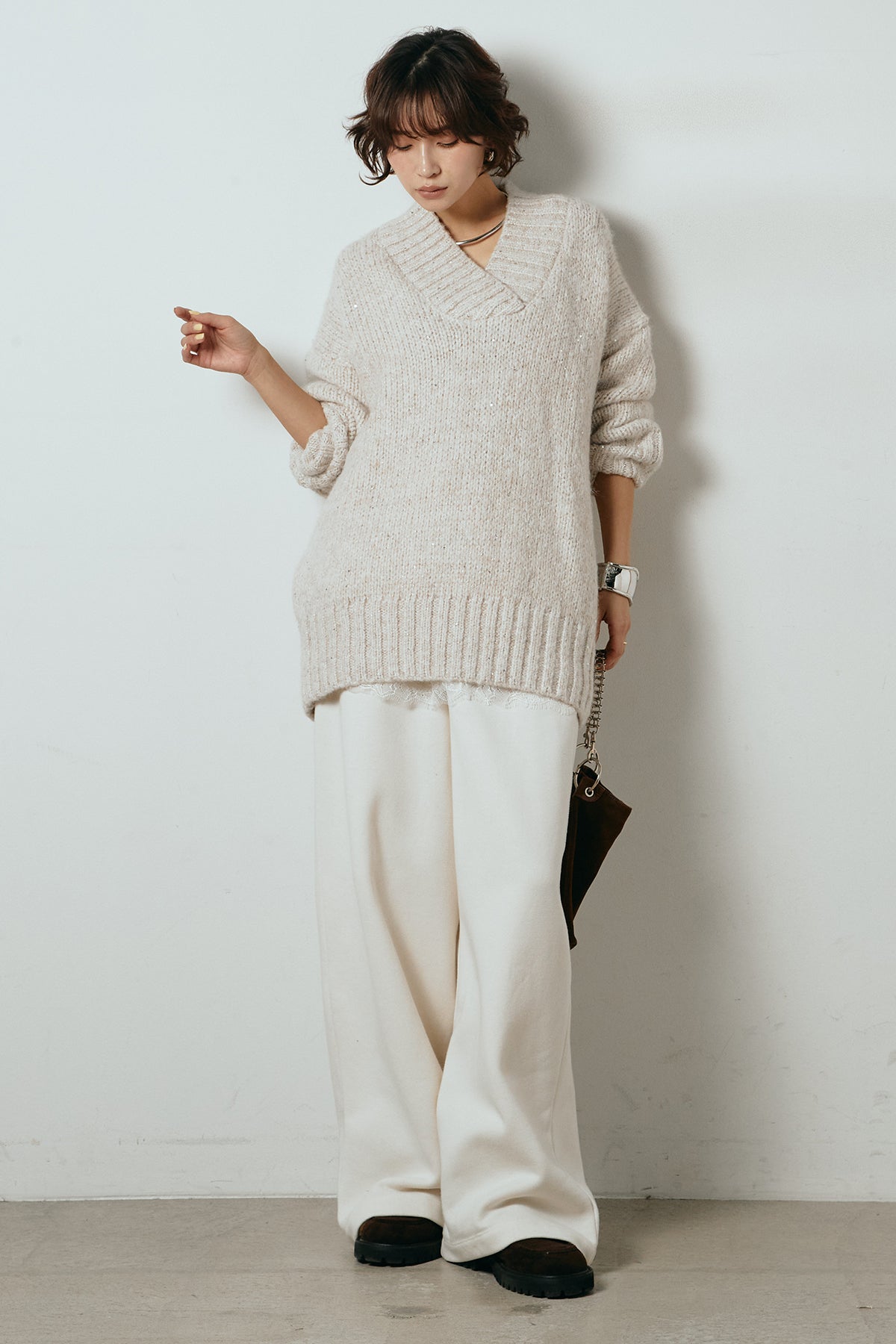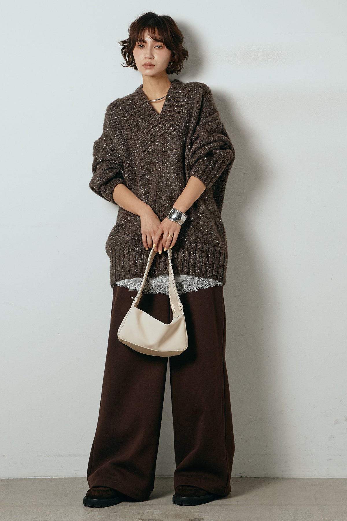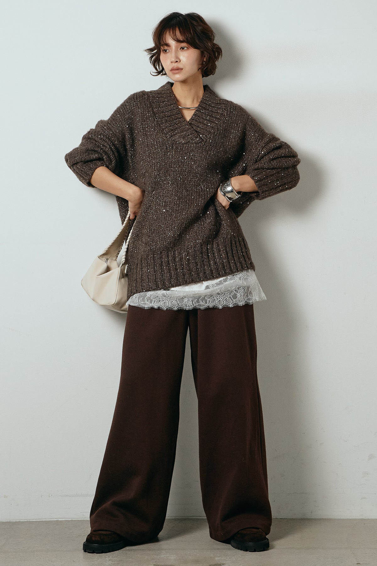 [SET]Vネックラメニットトップス+裏起毛スウェットワイドパンツ+レース切り替えキャミソール(3set)