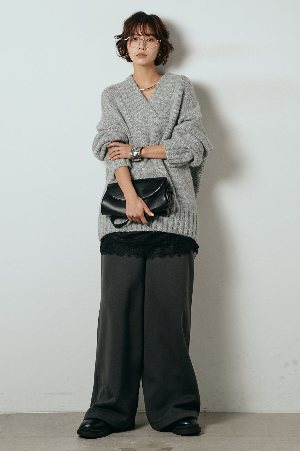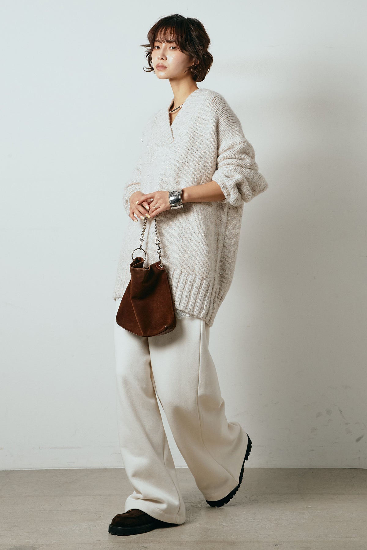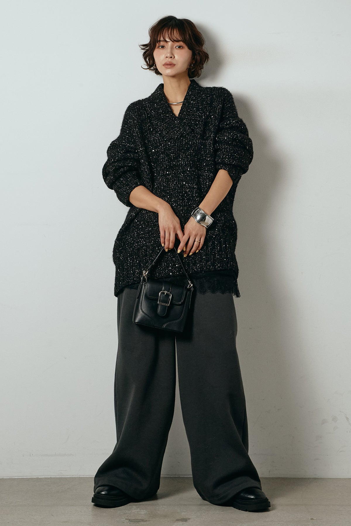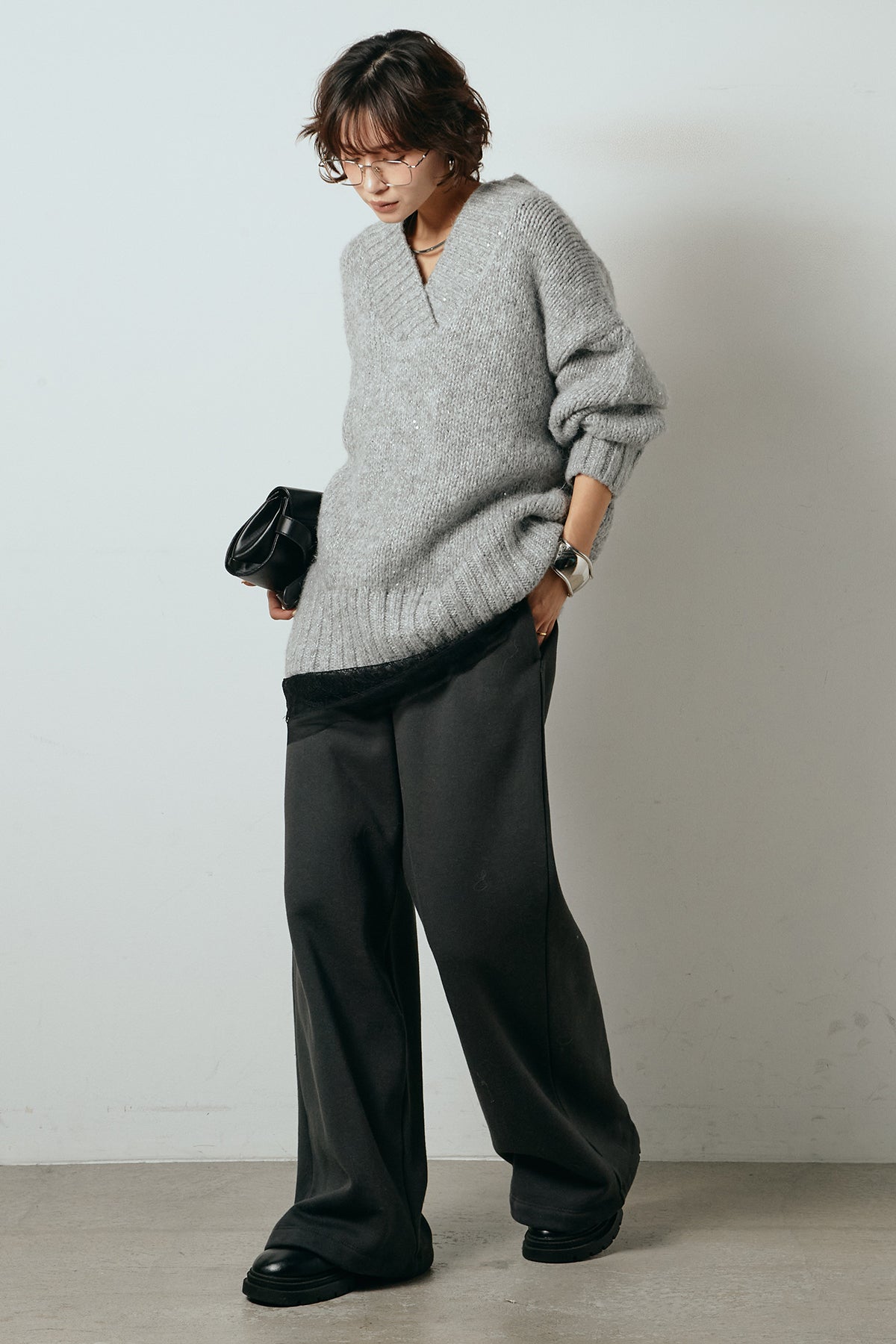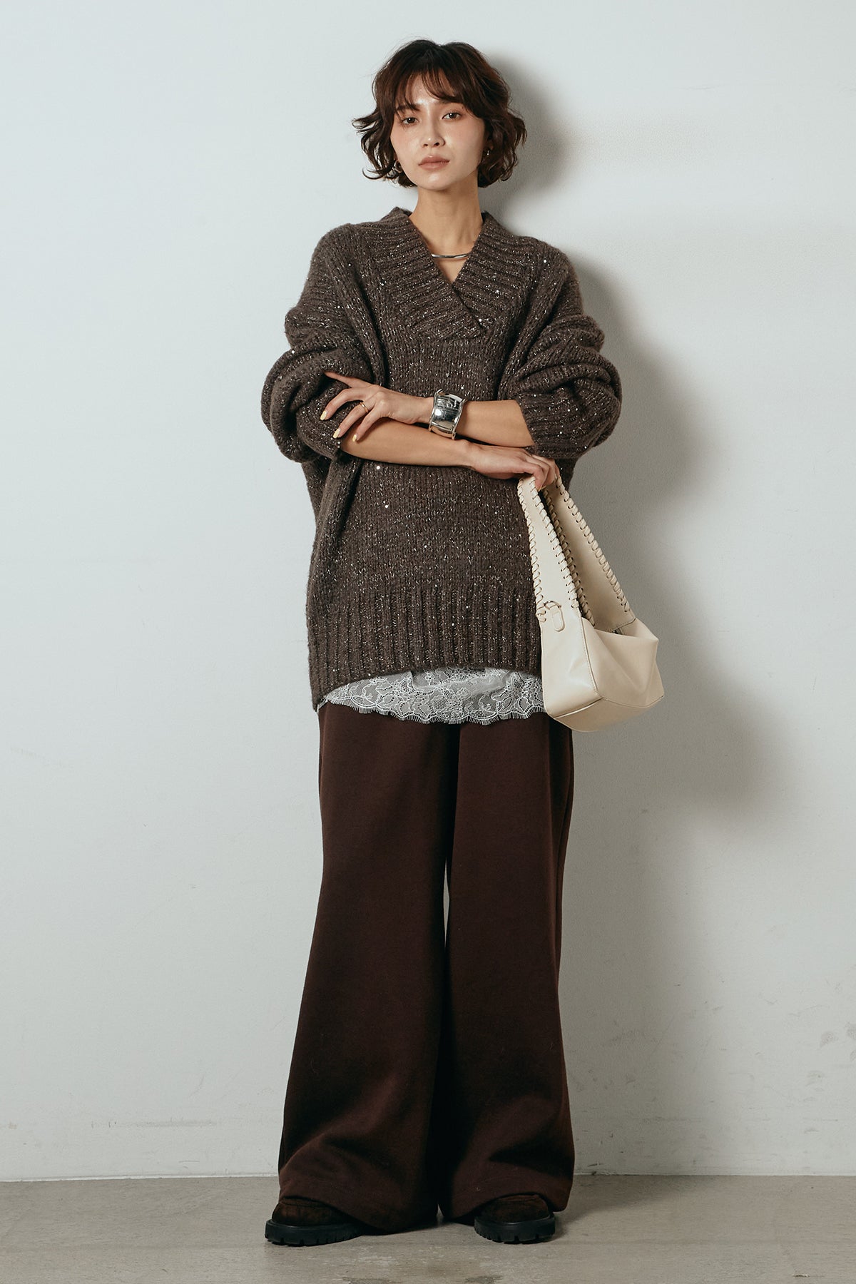 [SET]Vネックラメニットトップス+裏起毛スウェットワイドパンツ+レース切り替えキャミソール(3set)