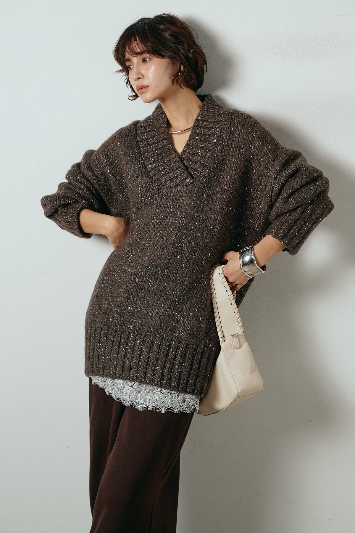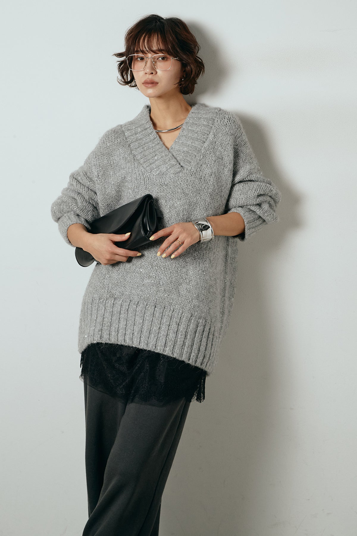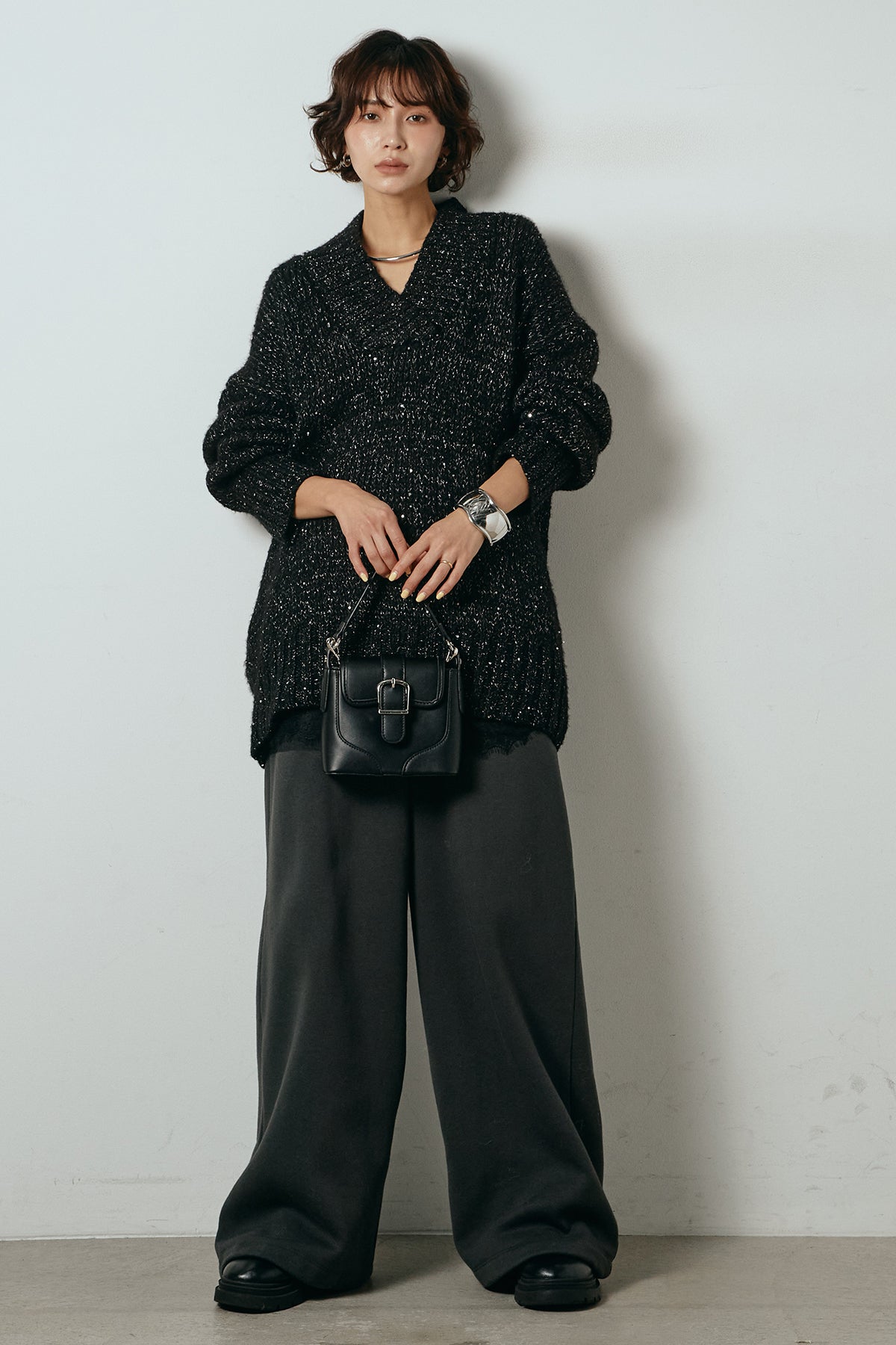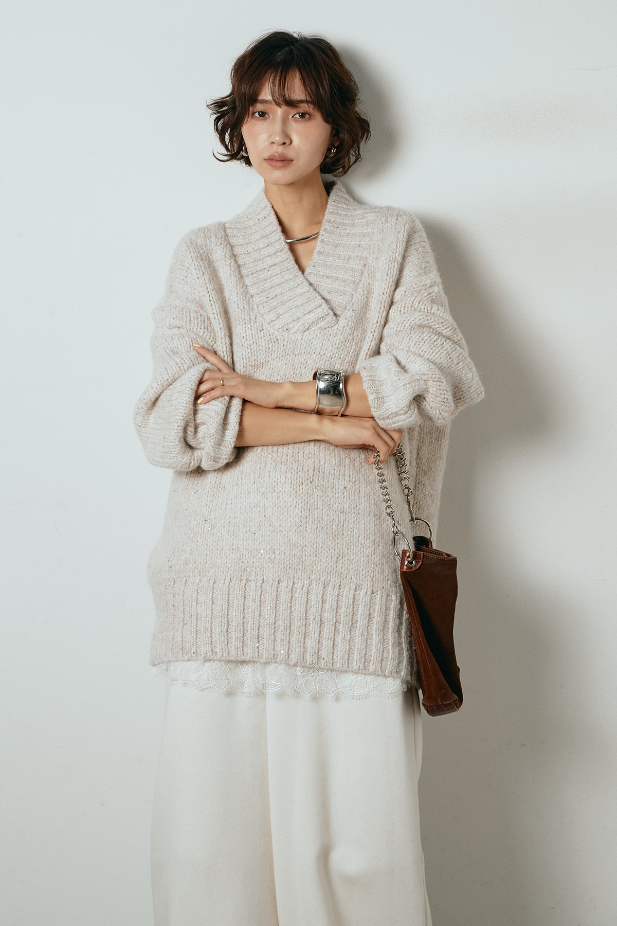 ラメ糸をさりげなく織り込んだ、上品な輝きが魅力のVネックニットトップス。程よくゆとりのあるシルエットと、広めに開いたVネックが顔まわりをすっきりと見せてくれます。リブ編みを効かせたネックラインと袖口が全体を引き締め、ラフになりすぎないバランスに。パンツにもスカートにも合わせやすく、シンプルながら華やかさを添える一枚です。