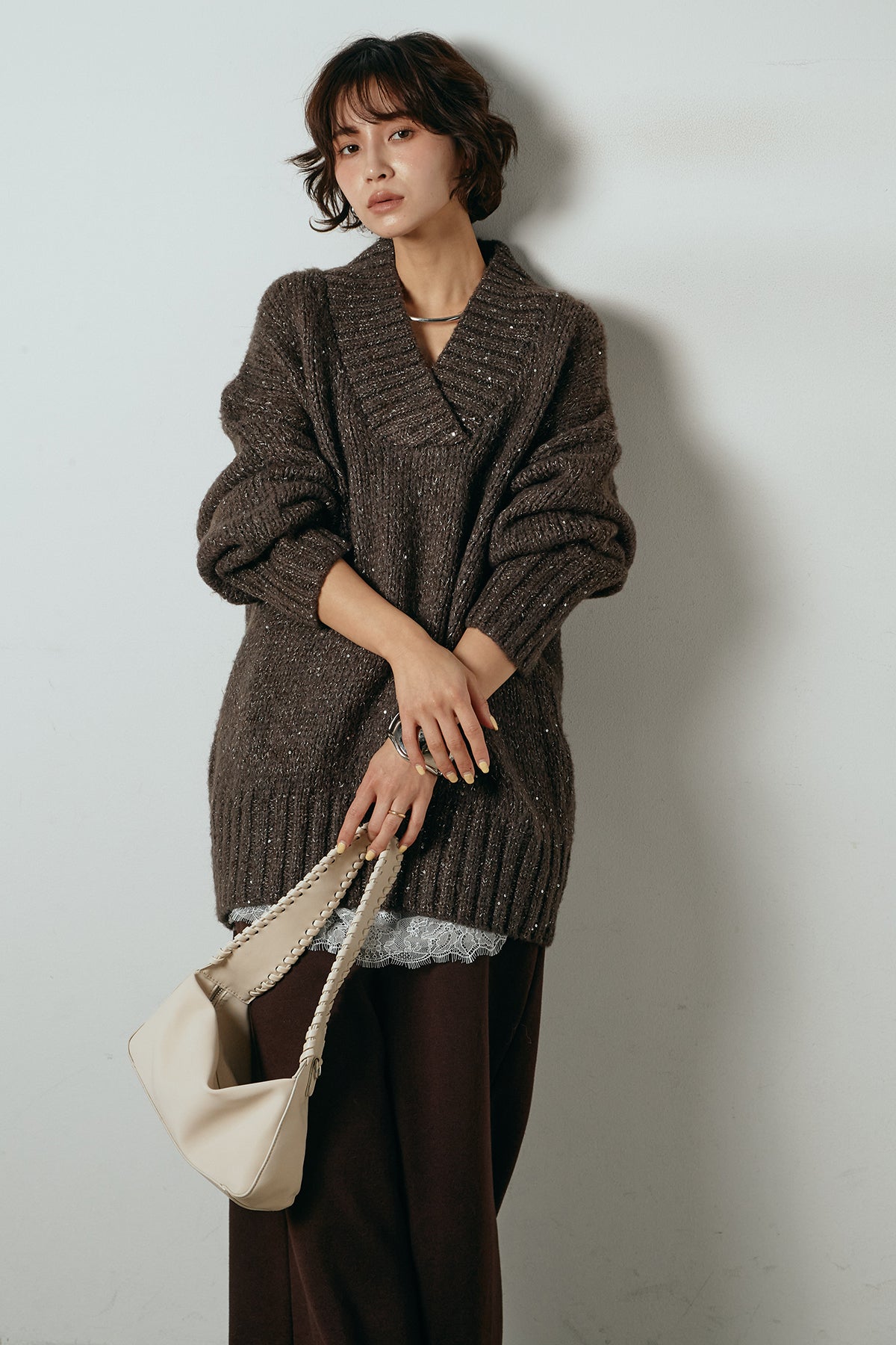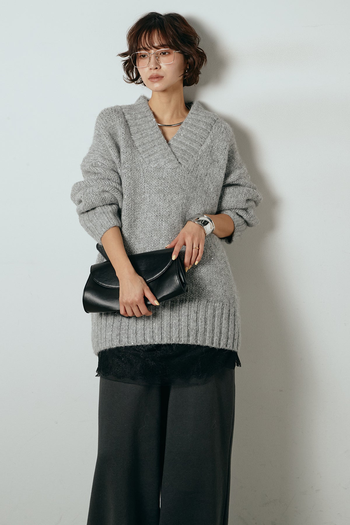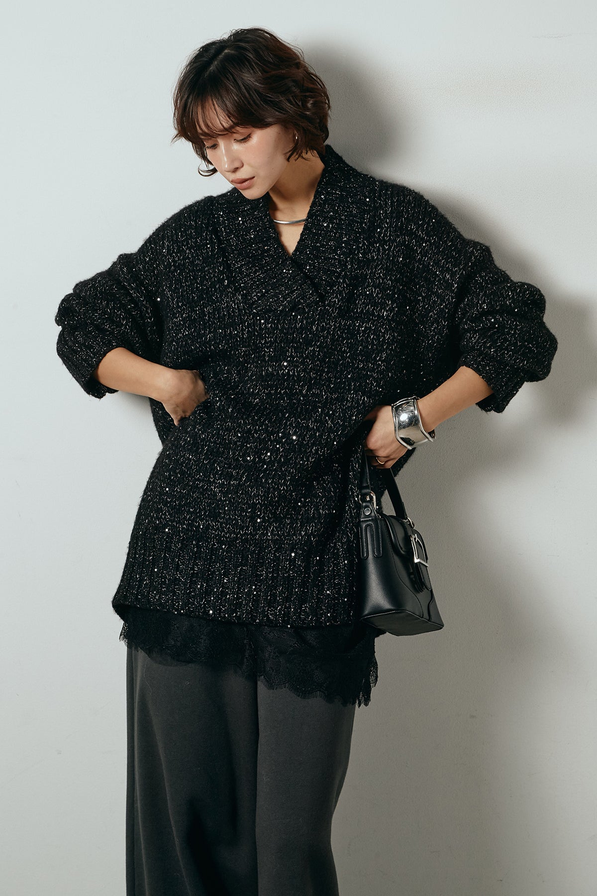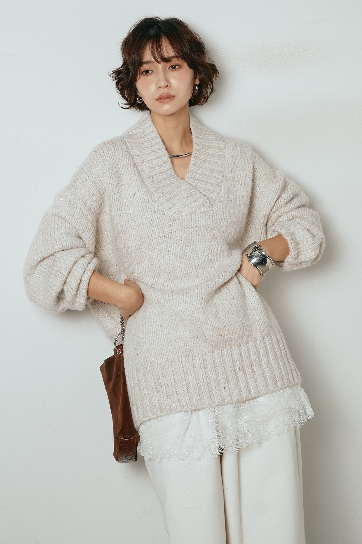 ラメ糸をさりげなく織り込んだ、上品な輝きが魅力のVネックニットトップス。程よくゆとりのあるシルエットと、広めに開いたVネックが顔まわりをすっきりと見せてくれます。リブ編みを効かせたネックラインと袖口が全体を引き締め、ラフになりすぎないバランスに。パンツにもスカートにも合わせやすく、シンプルながら華やかさを添える一枚です。