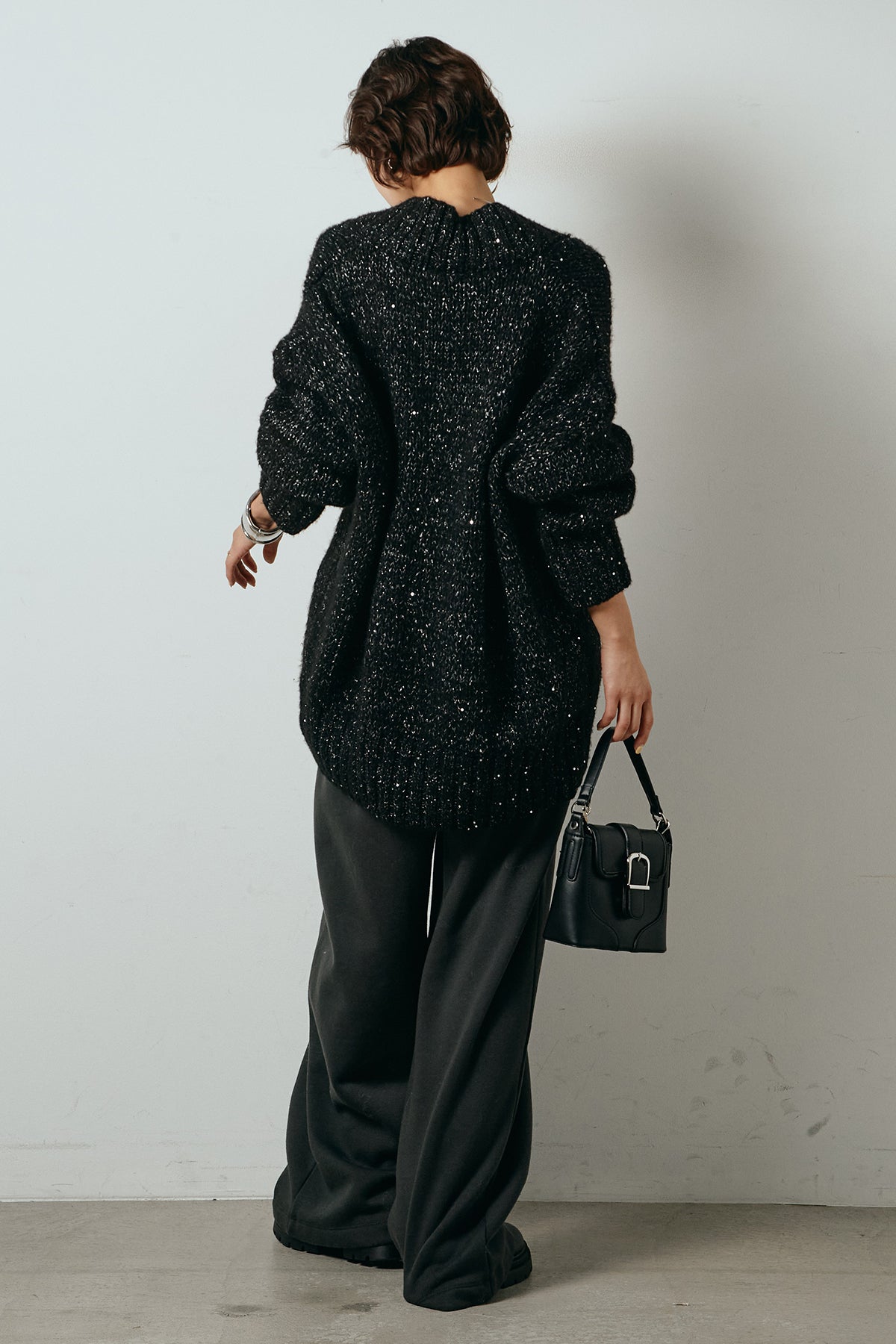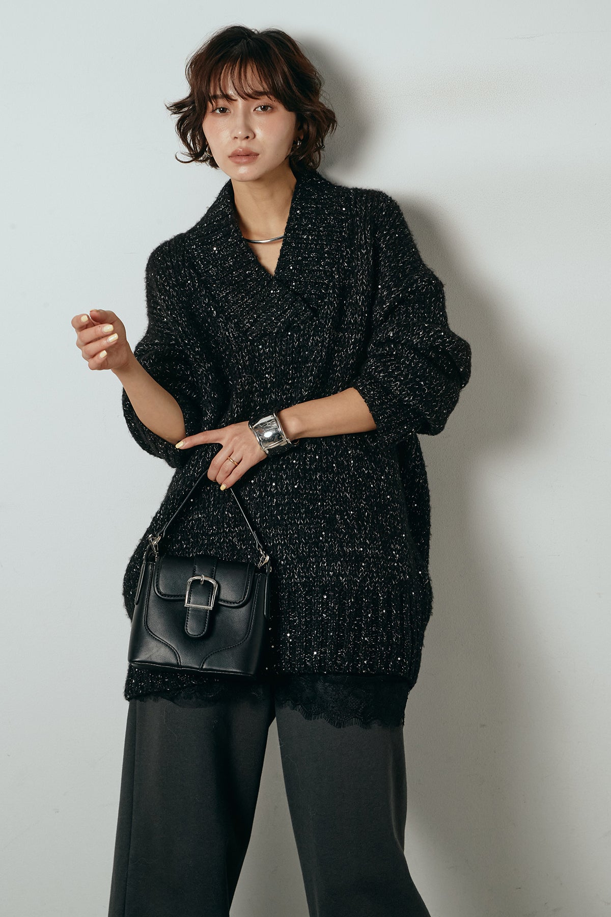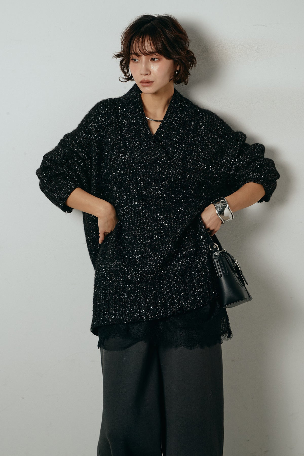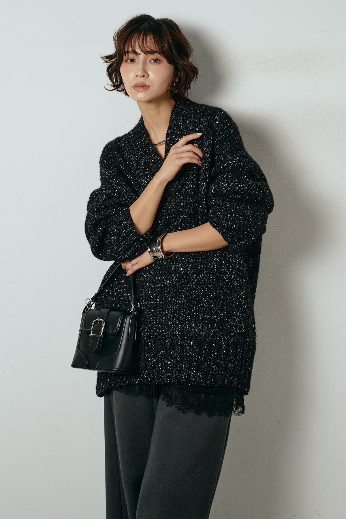 ラメ糸をさりげなく織り込んだ、上品な輝きが魅力のVネックニットトップス。程よくゆとりのあるシルエットと、広めに開いたVネックが顔まわりをすっきりと見せてくれます。リブ編みを効かせたネックラインと袖口が全体を引き締め、ラフになりすぎないバランスに。パンツにもスカートにも合わせやすく、シンプルながら華やかさを添える一枚です。