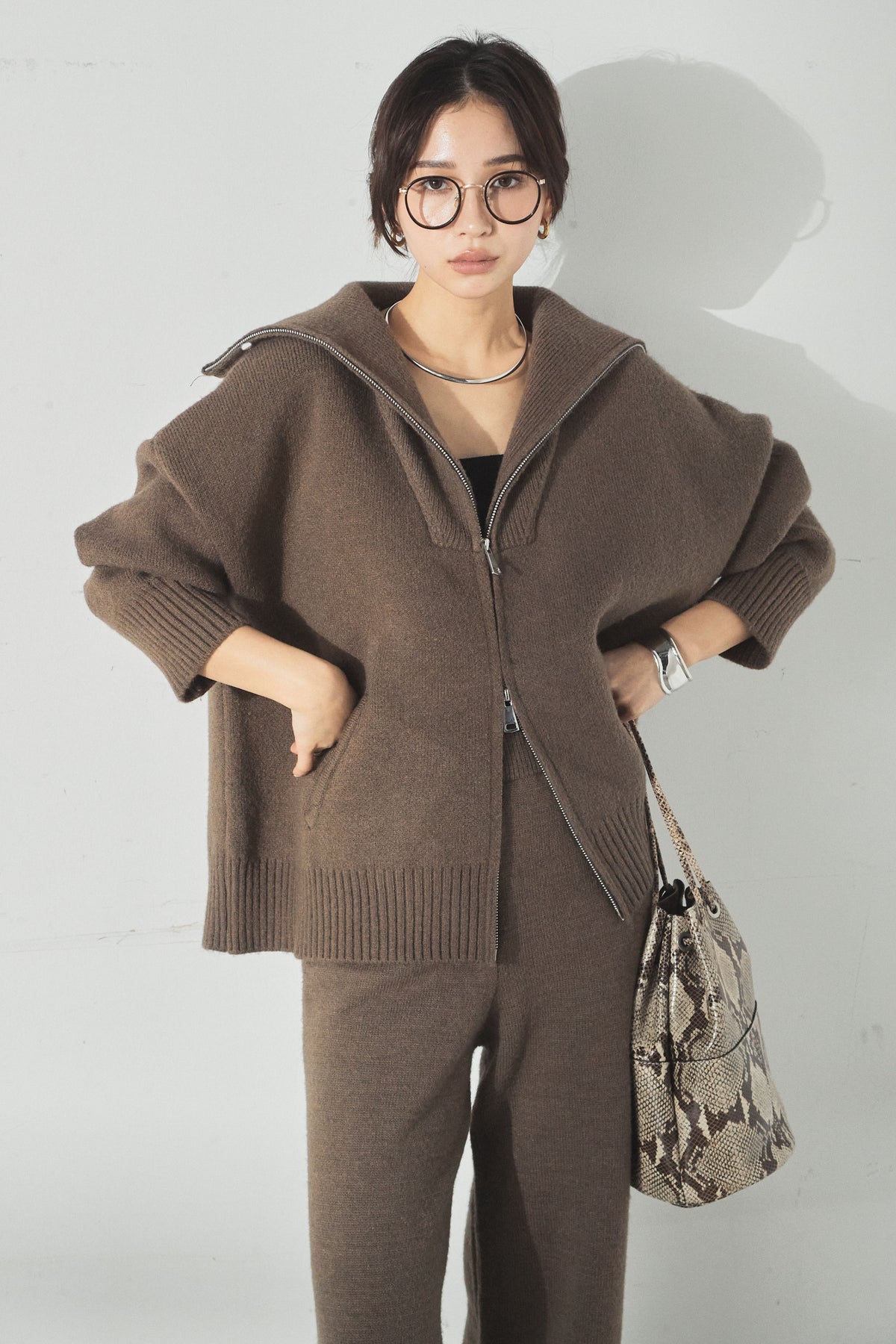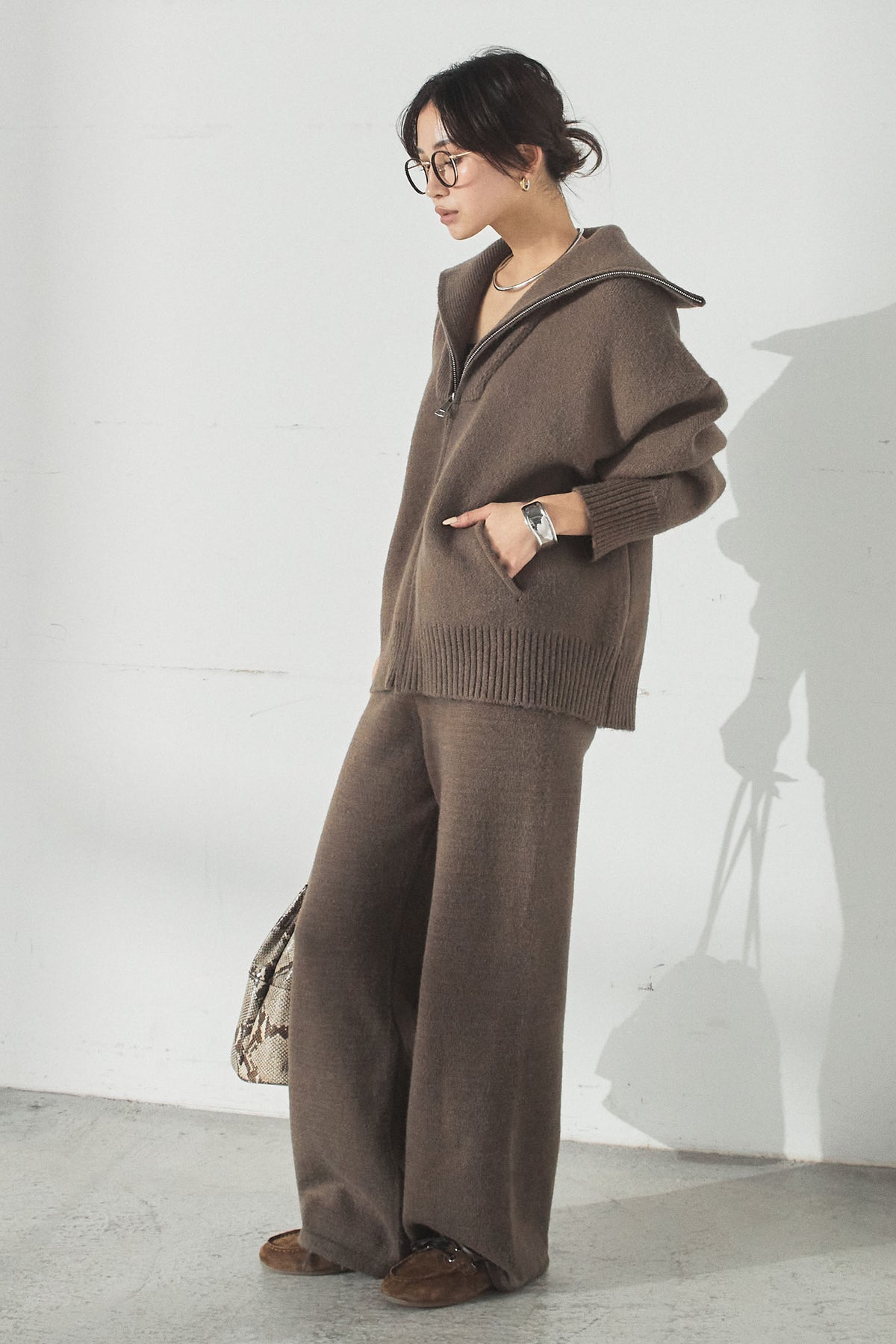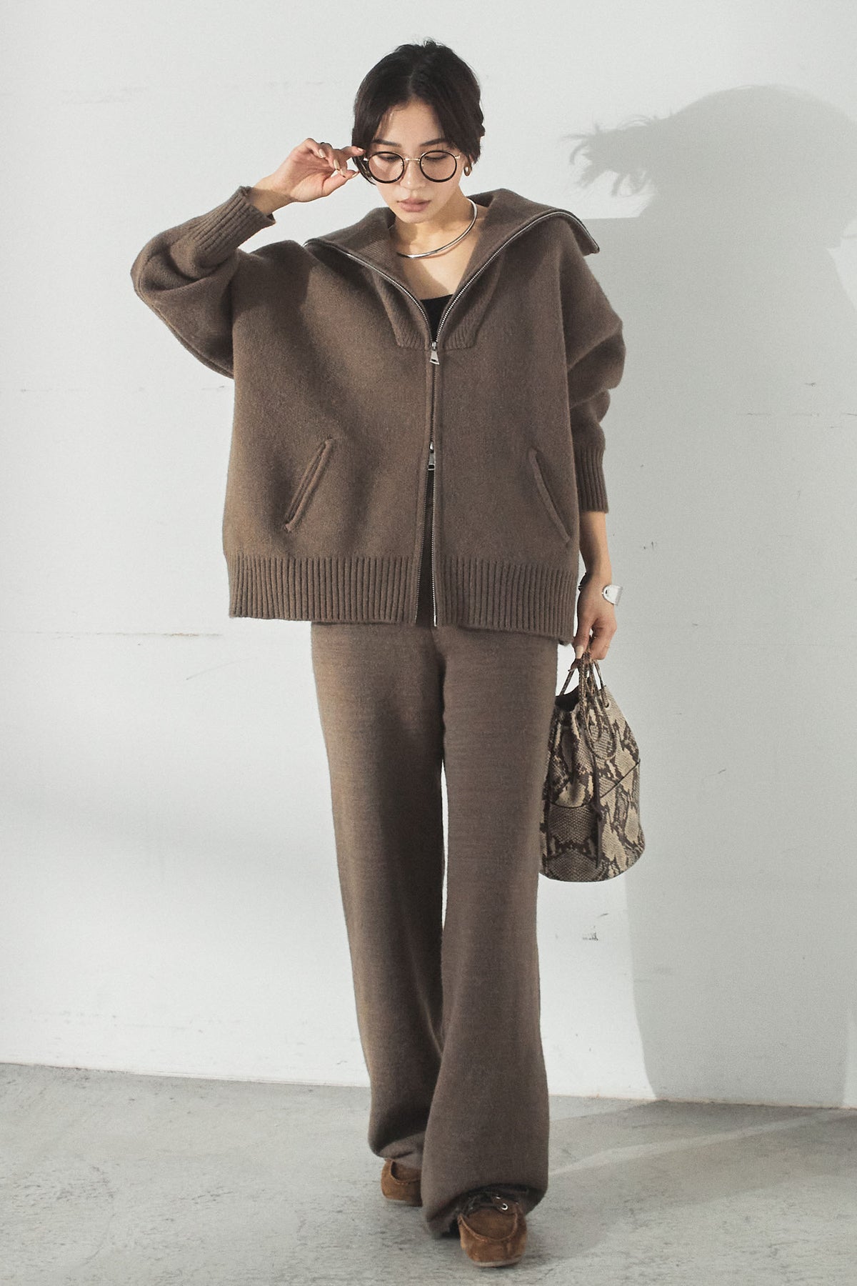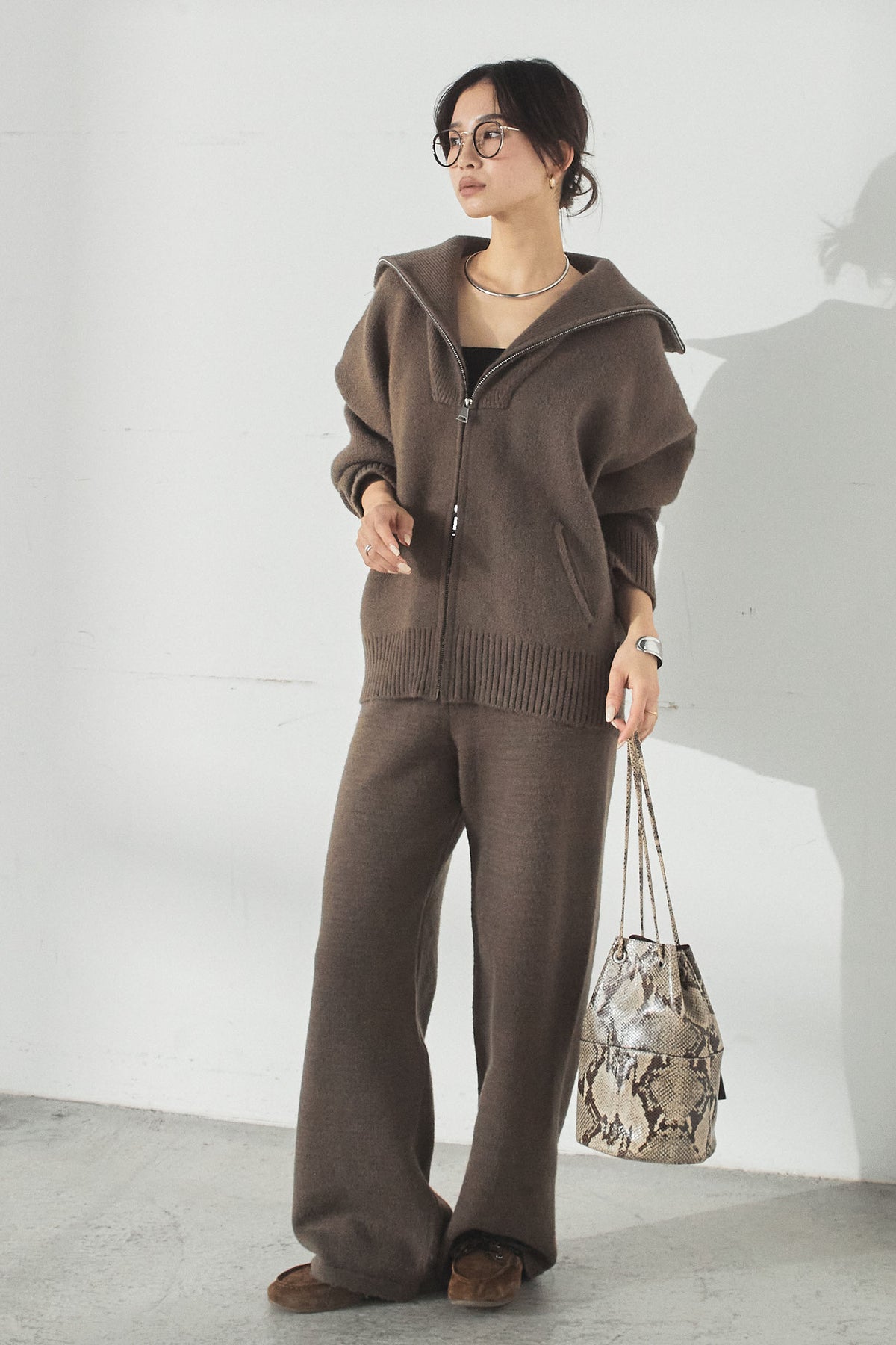 大きめのカラーが印象的な、ダブルジップ仕様のニットセットアップ。トップスはゆったりとしたシルエットで抜け感があり、ジップの開閉で表情の変化を楽しめます。パンツはすとんと落ちるラインで全体をすっきりとまとめ、リラックス感がありながらも上品な印象に。セットで着るだけでバランスよく決まり、単品使いでも幅広く活躍するアイテムです。