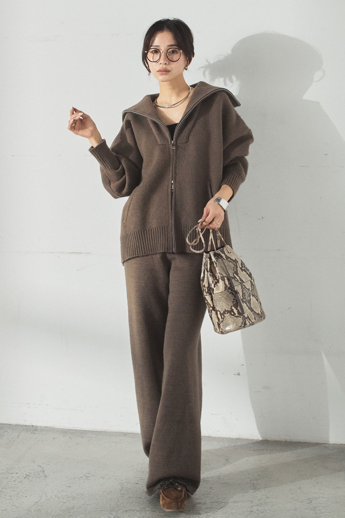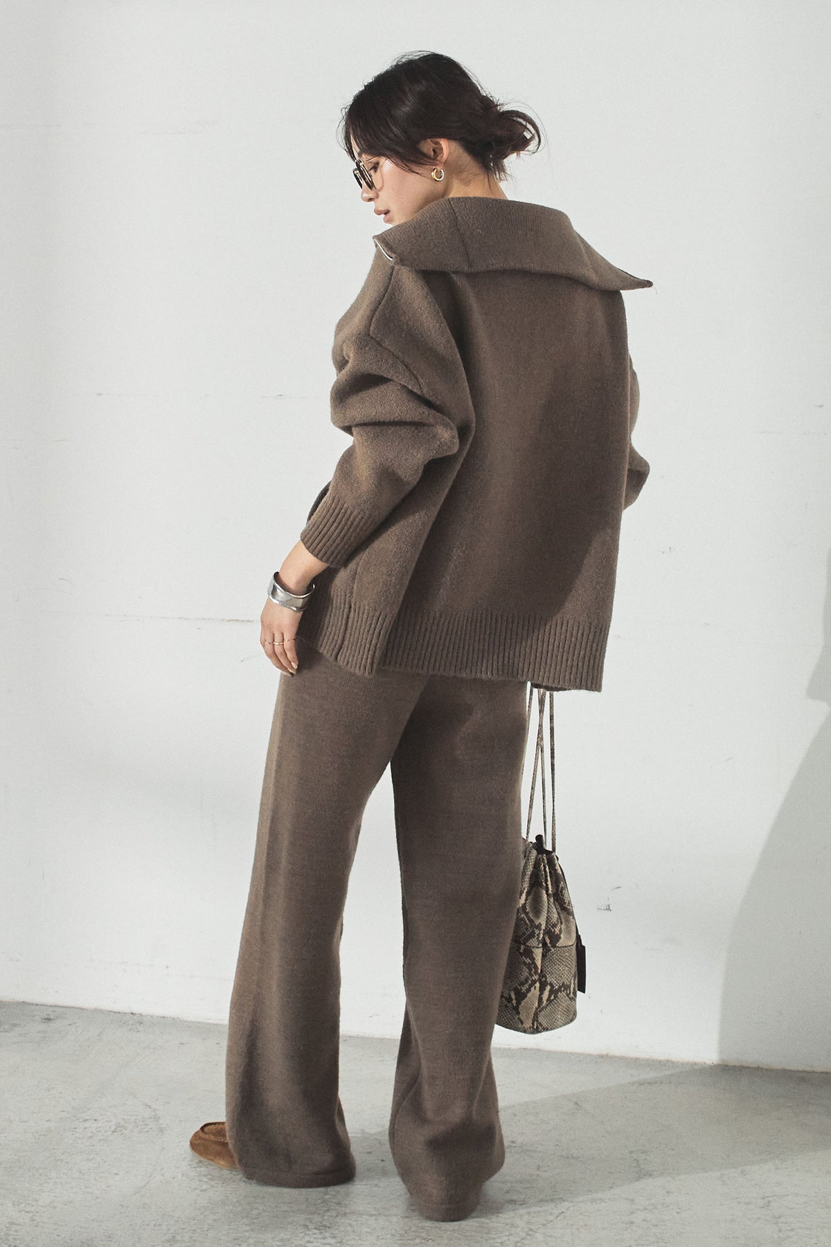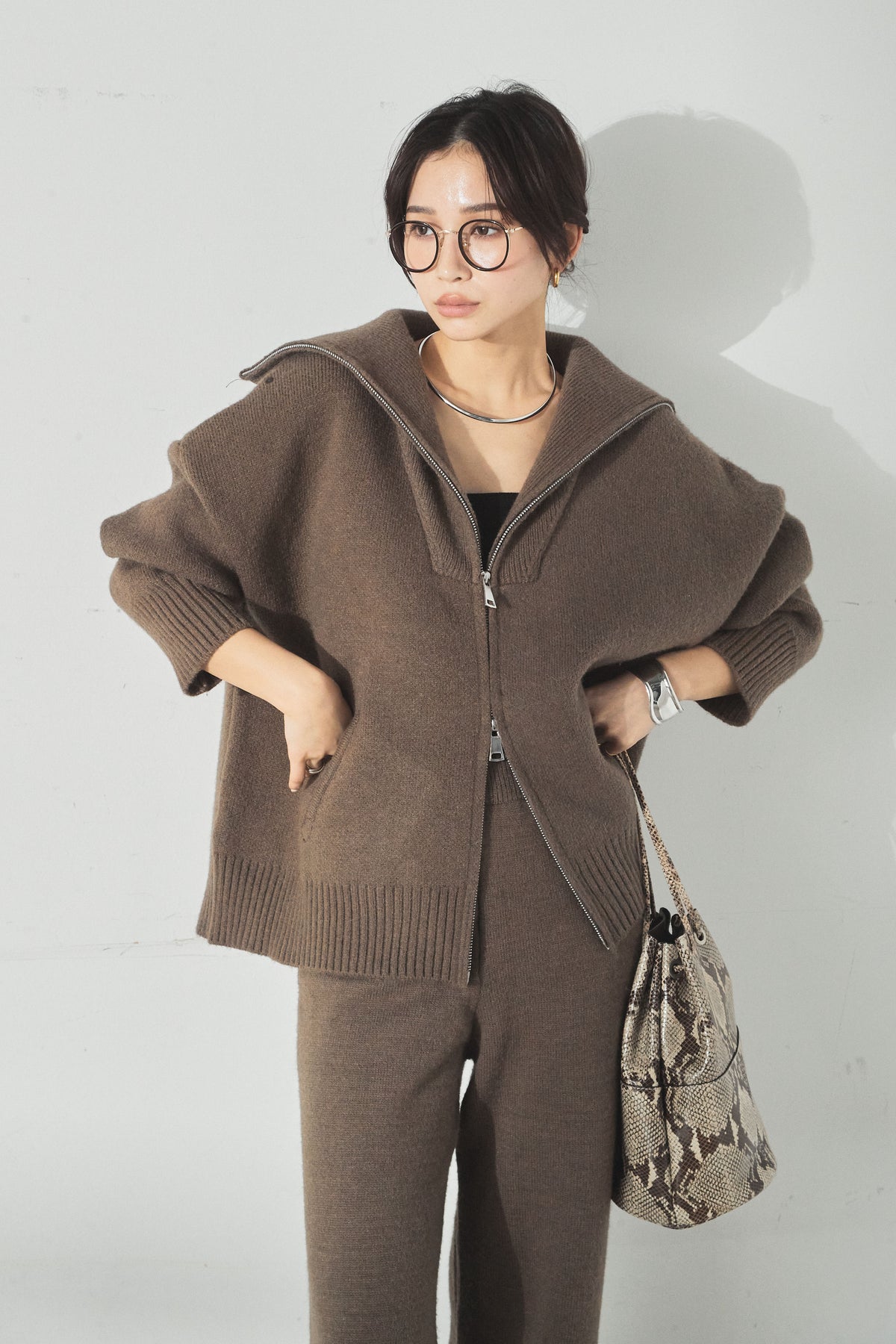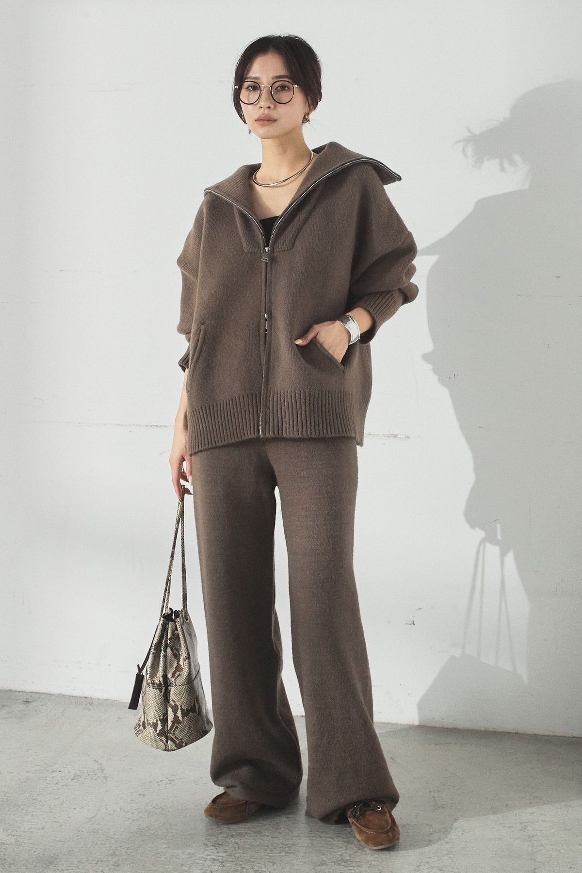 大きめのカラーが印象的な、ダブルジップ仕様のニットセットアップ。トップスはゆったりとしたシルエットで抜け感があり、ジップの開閉で表情の変化を楽しめます。パンツはすとんと落ちるラインで全体をすっきりとまとめ、リラックス感がありながらも上品な印象に。セットで着るだけでバランスよく決まり、単品使いでも幅広く活躍するアイテムです。