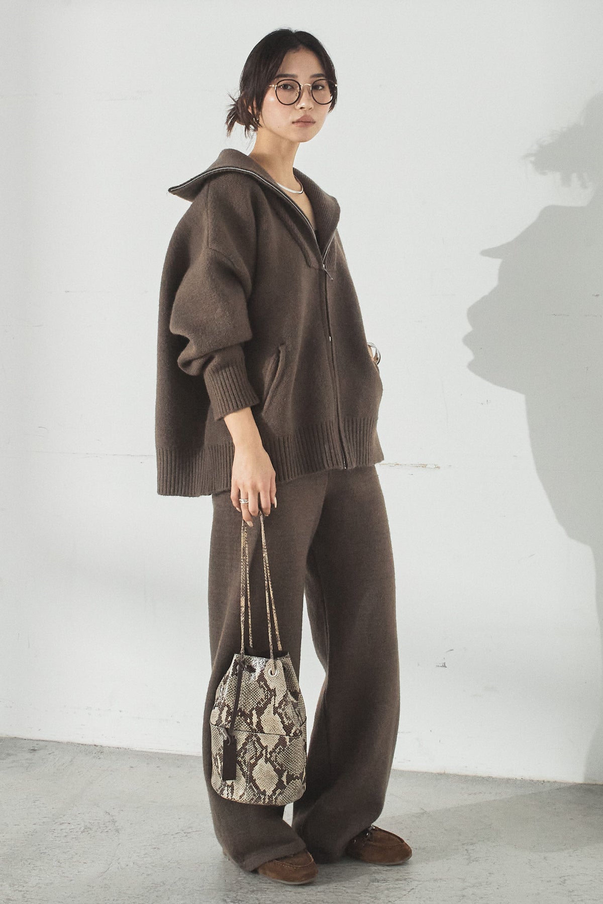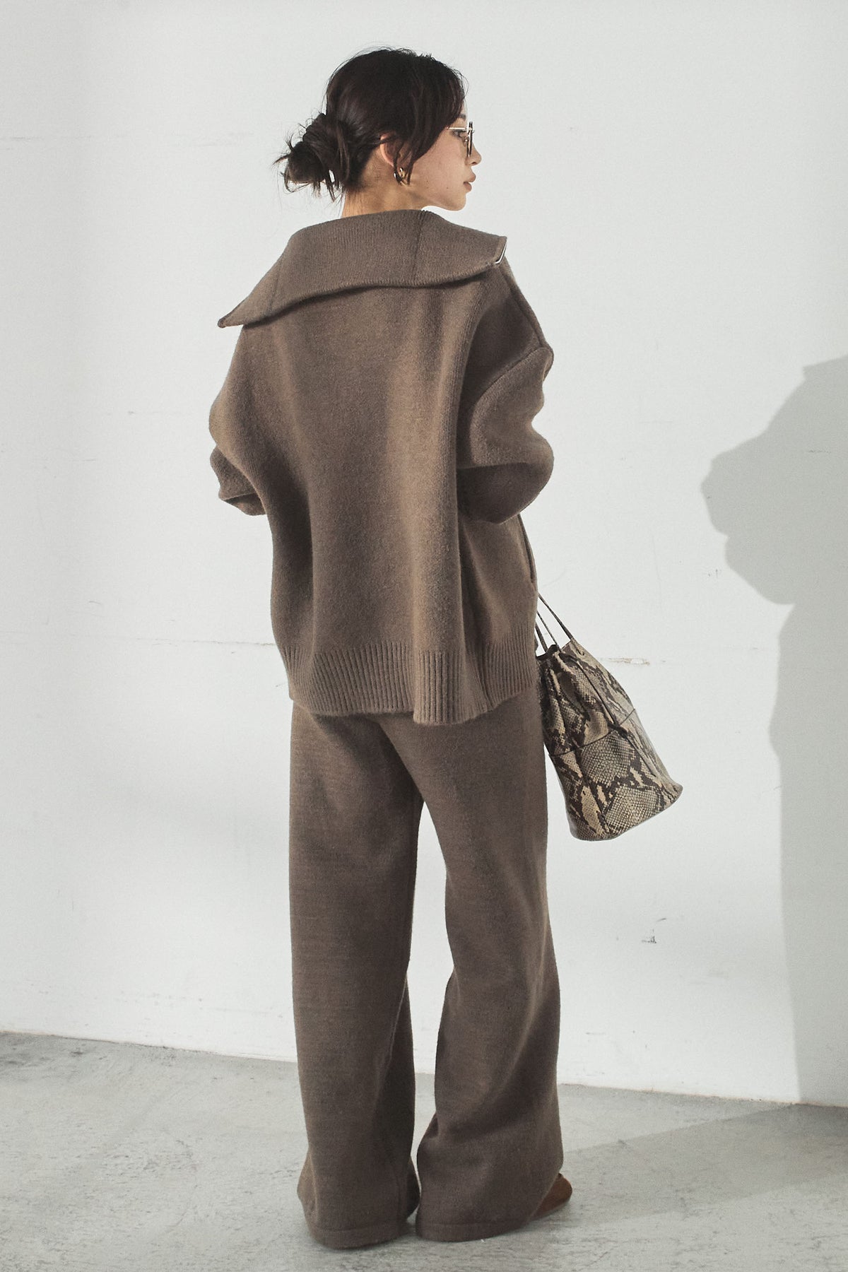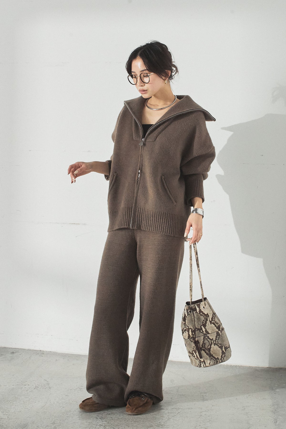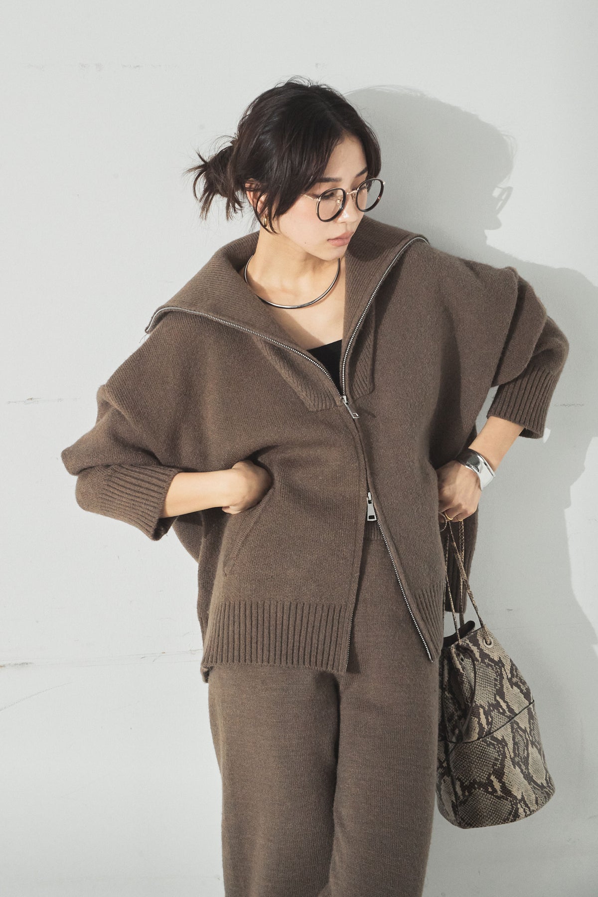 大きめのカラーが印象的な、ダブルジップ仕様のニットセットアップ。トップスはゆったりとしたシルエットで抜け感があり、ジップの開閉で表情の変化を楽しめます。パンツはすとんと落ちるラインで全体をすっきりとまとめ、リラックス感がありながらも上品な印象に。セットで着るだけでバランスよく決まり、単品使いでも幅広く活躍するアイテムです。