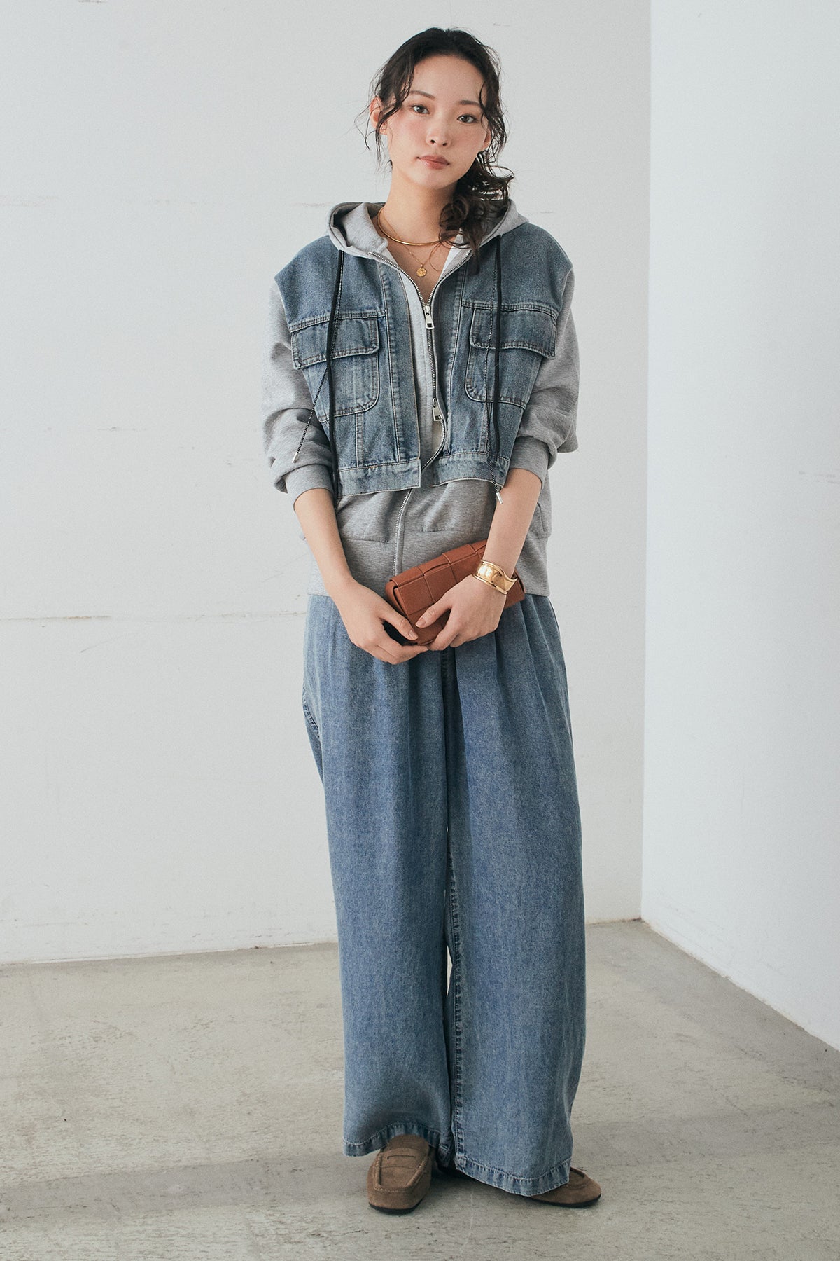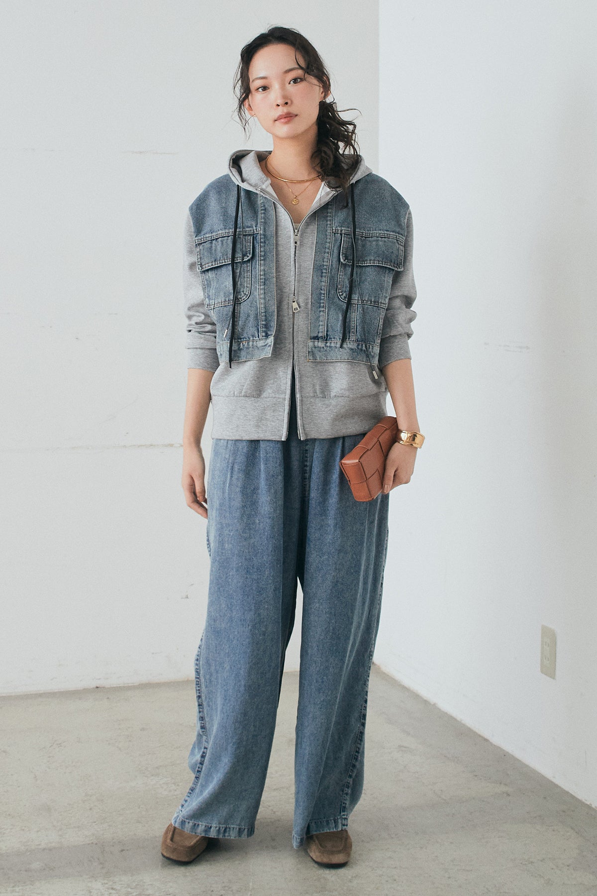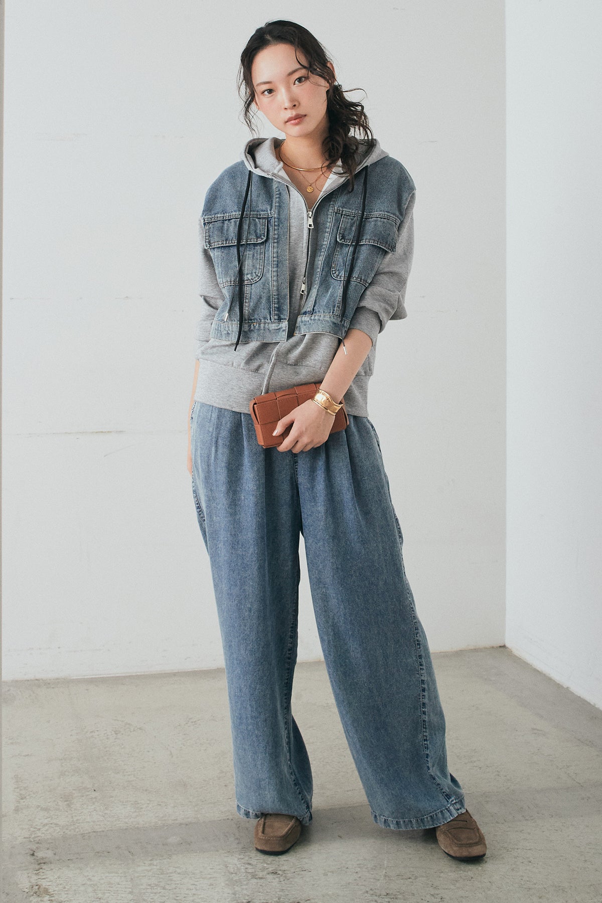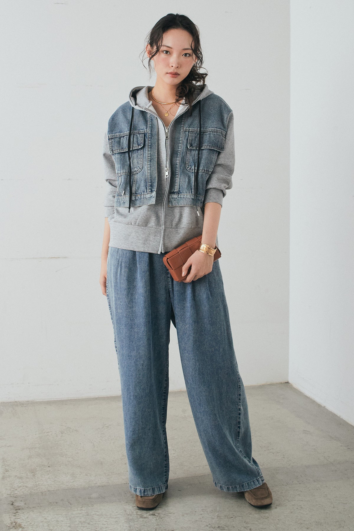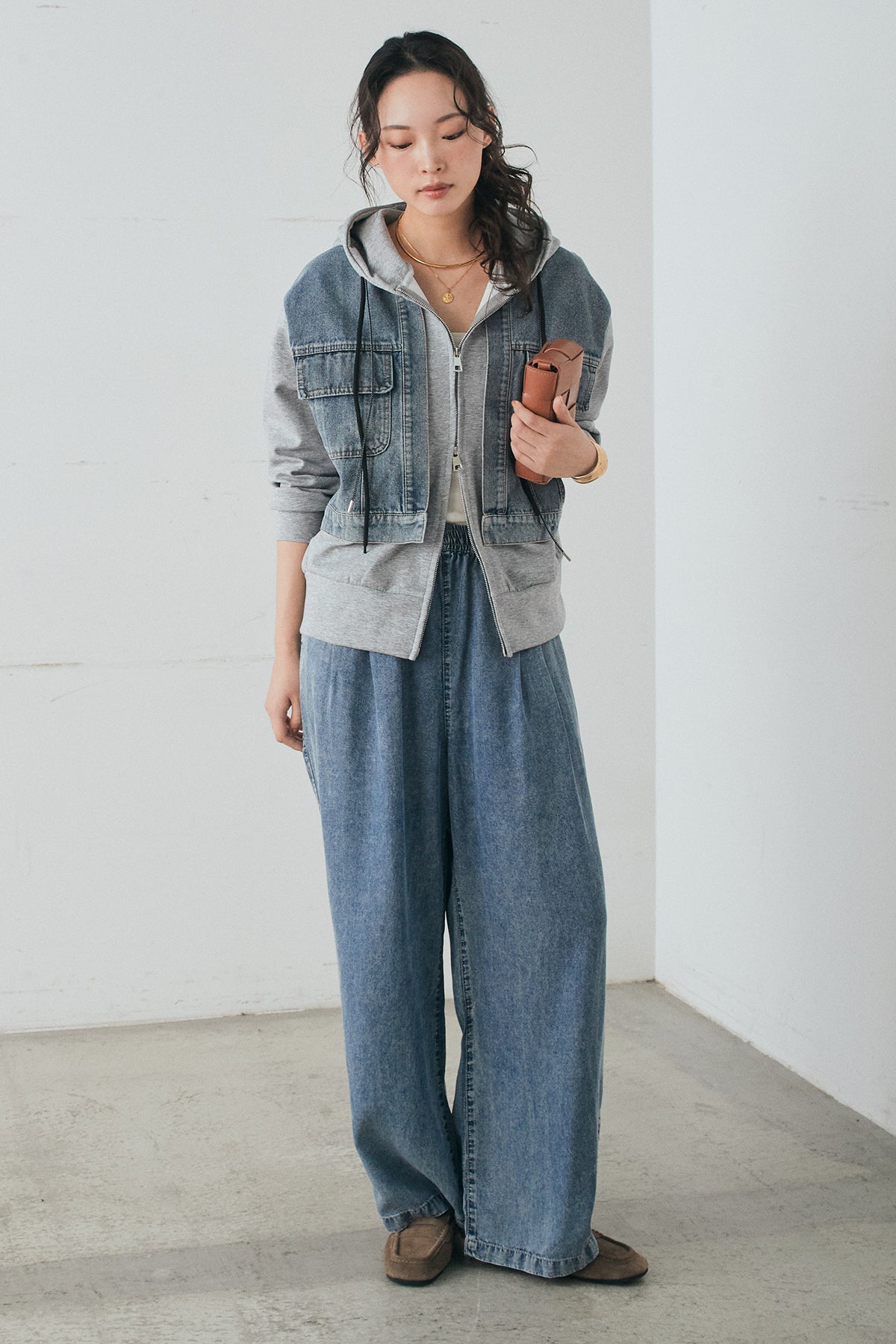 [SET]デニム切替ポンチダブルジップパーカー+テンセルデニムイージーワイドパンツ(2set)