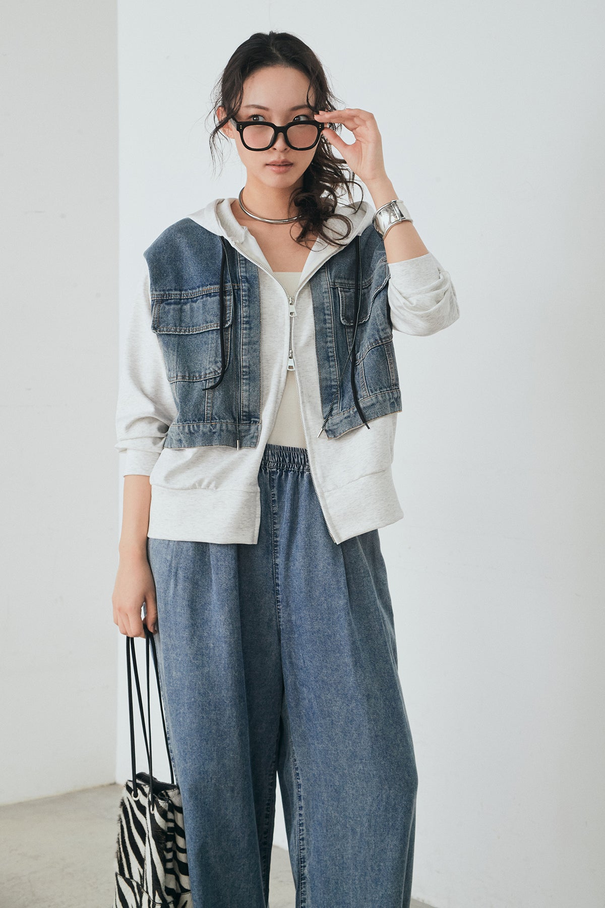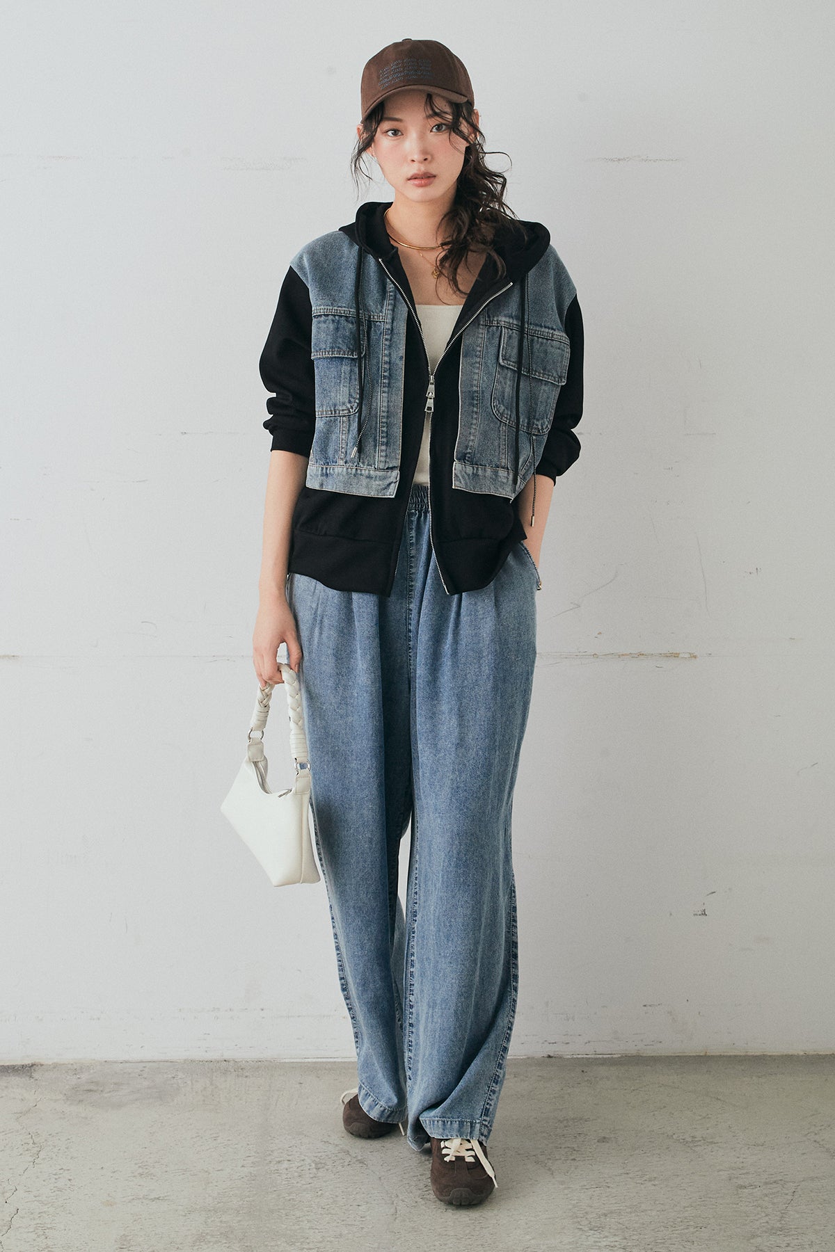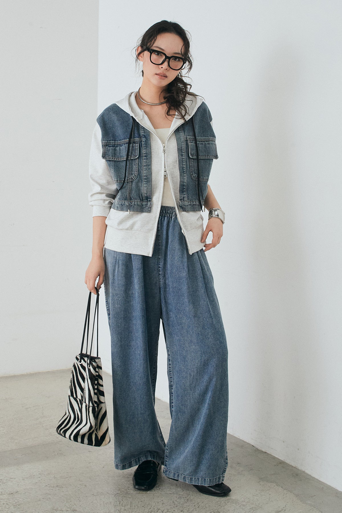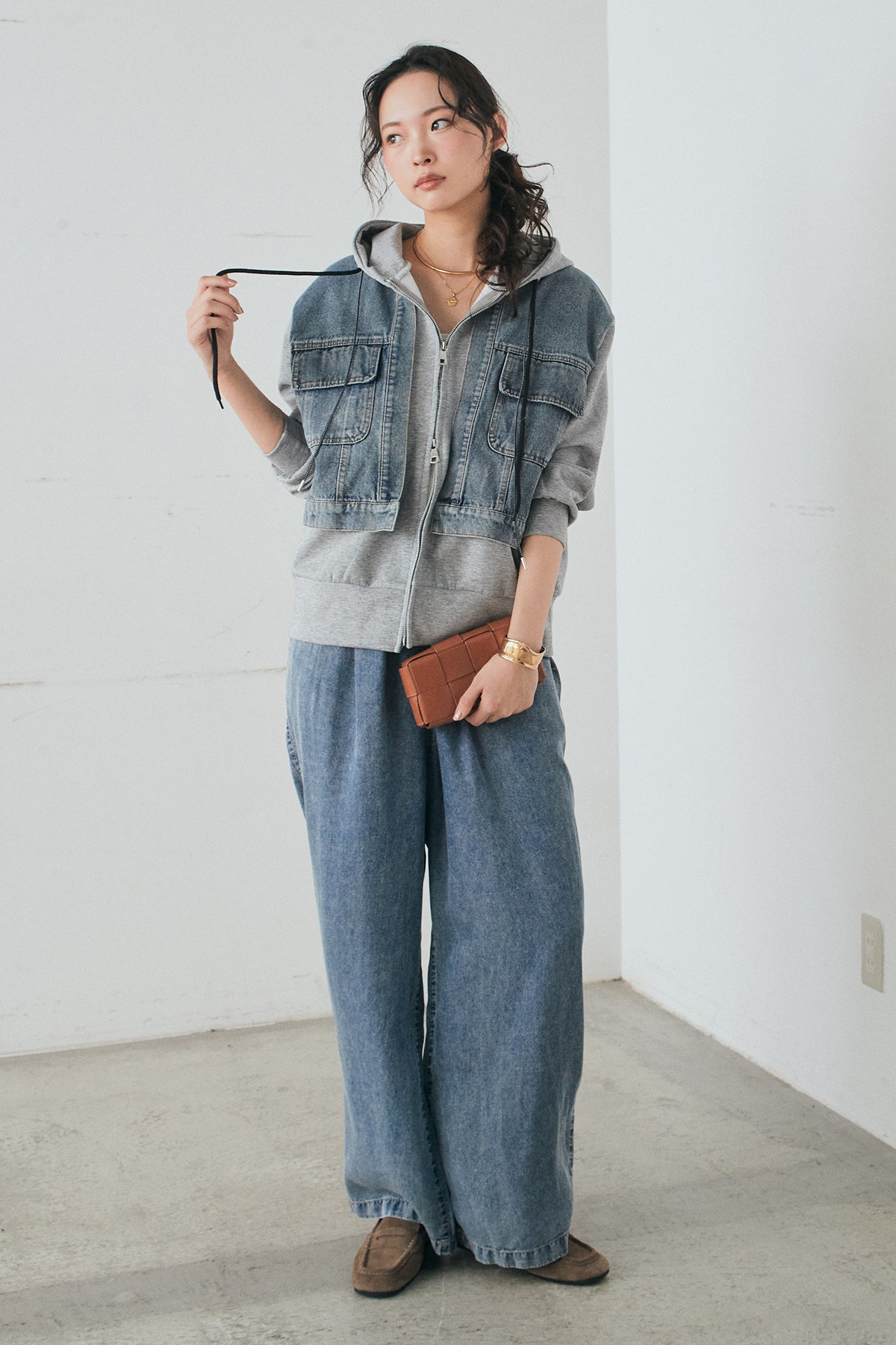 [SET]デニム切替ポンチダブルジップパーカー+テンセルデニムイージーワイドパンツ(2set)