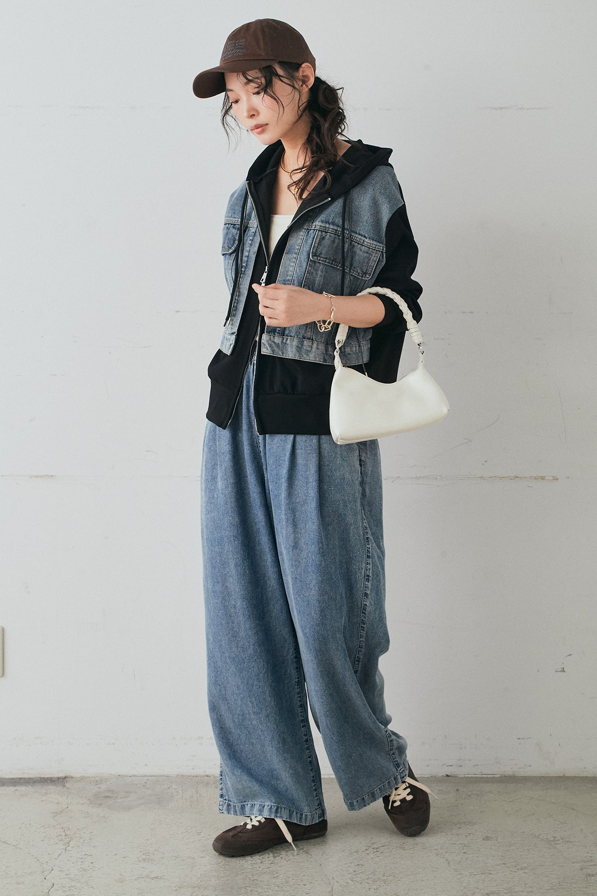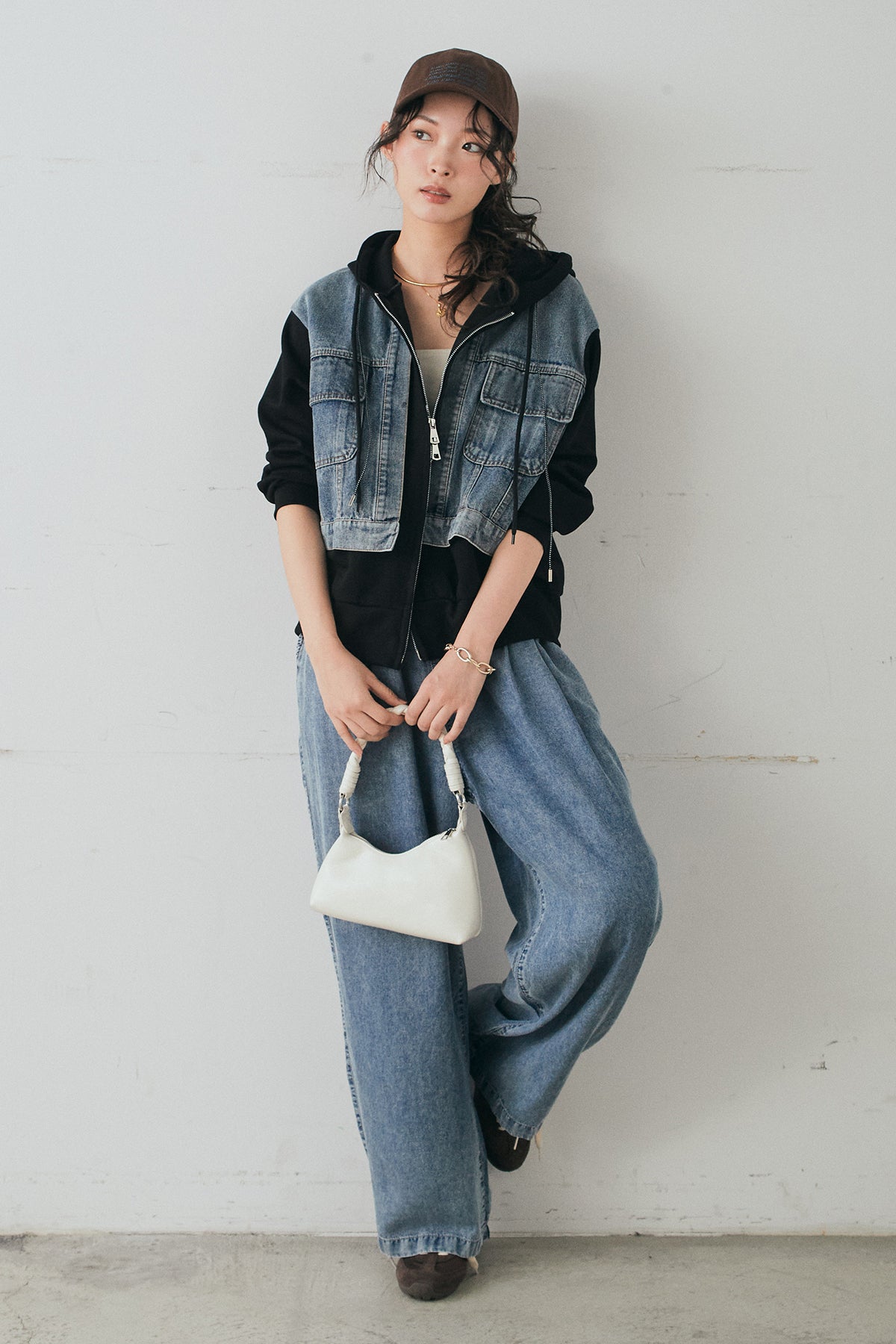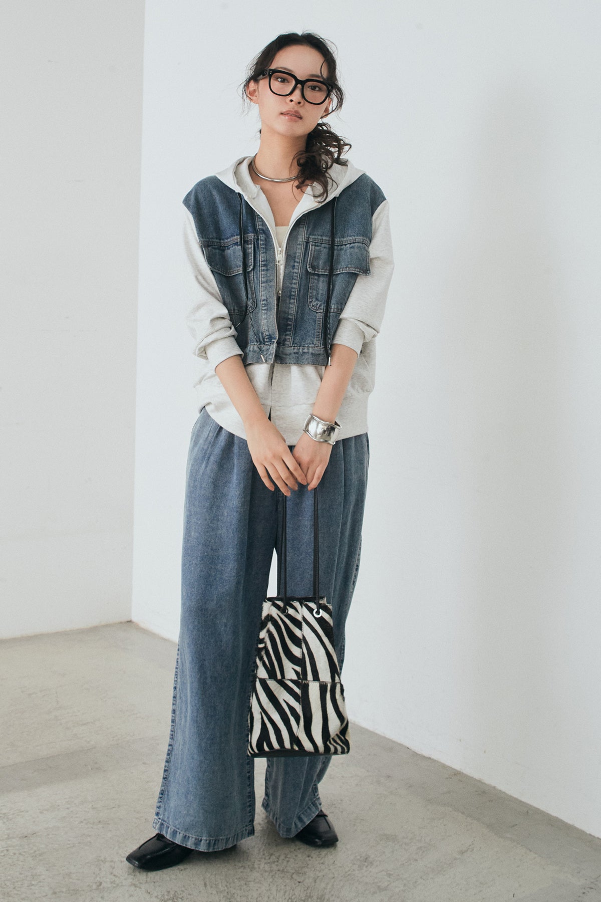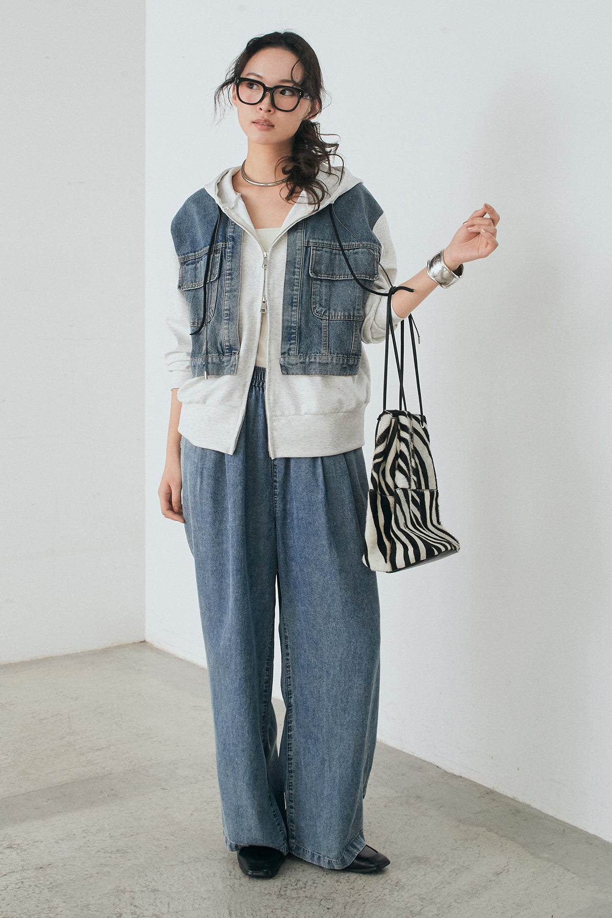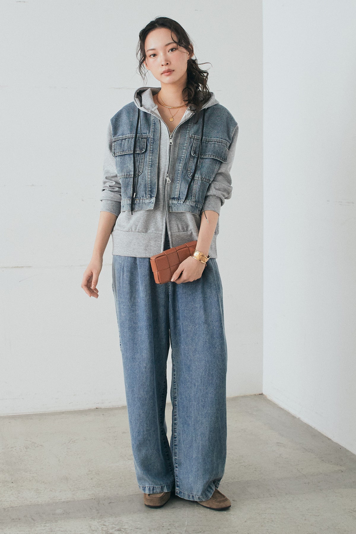 [SET]デニム切替ポンチダブルジップパーカー+テンセルデニムイージーワイドパンツ(2set)