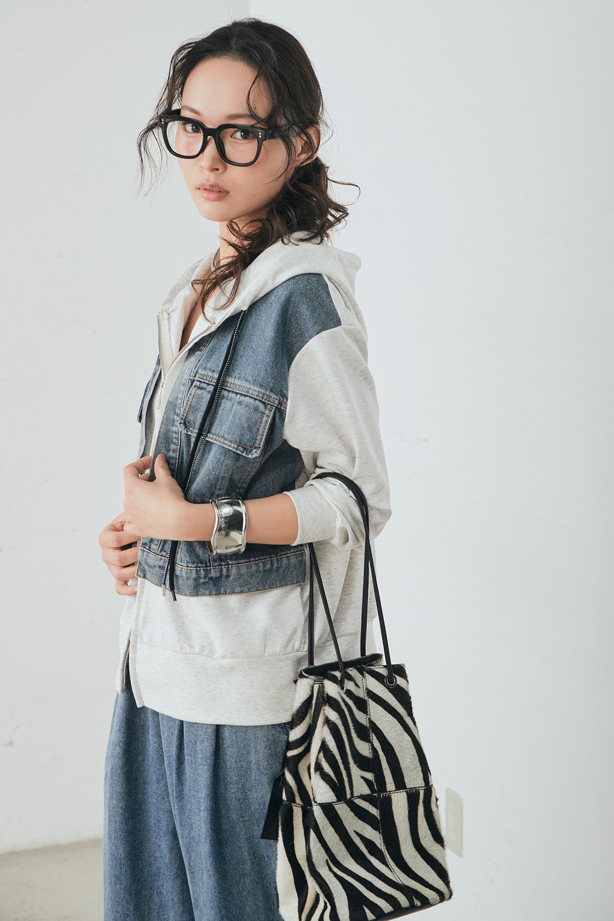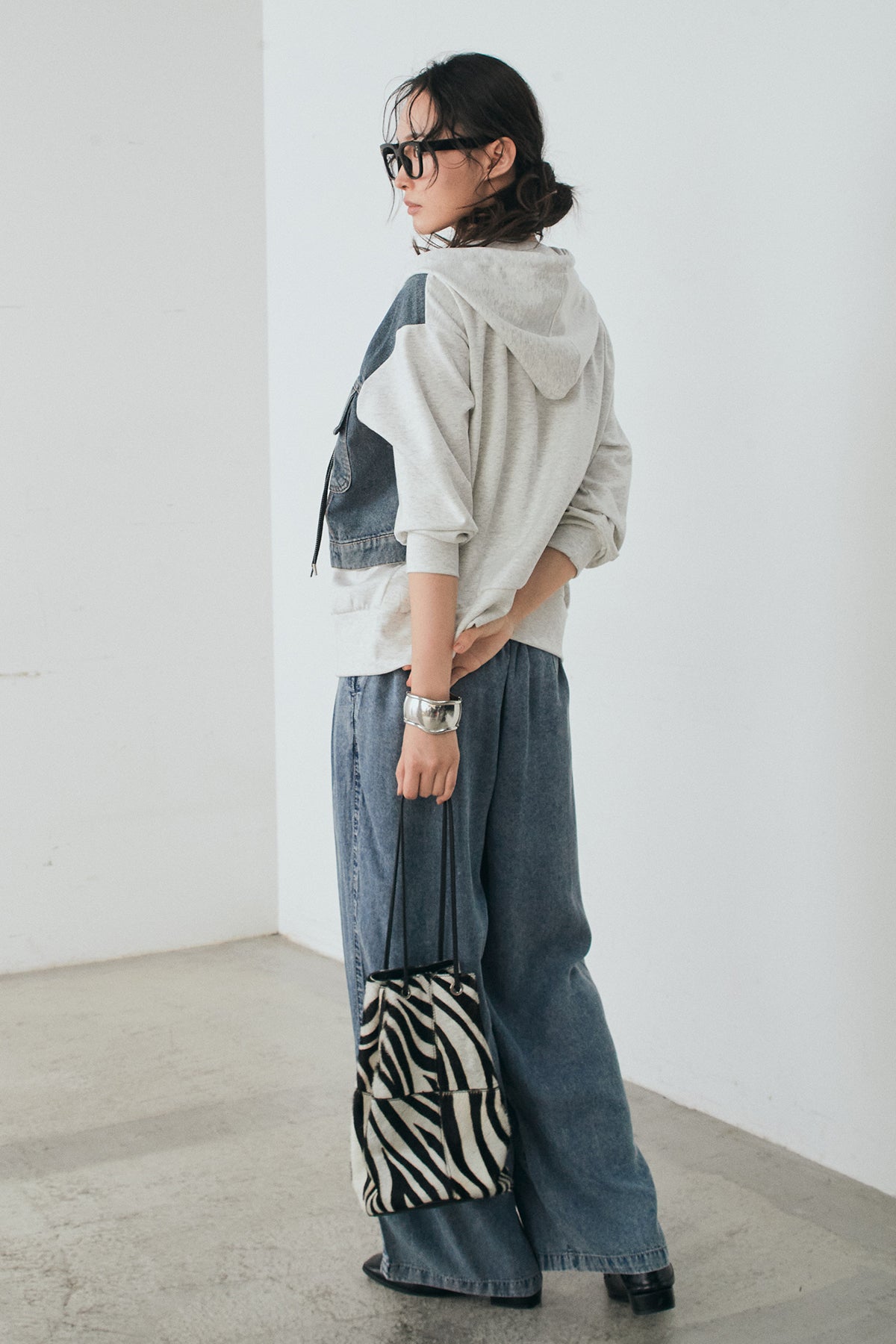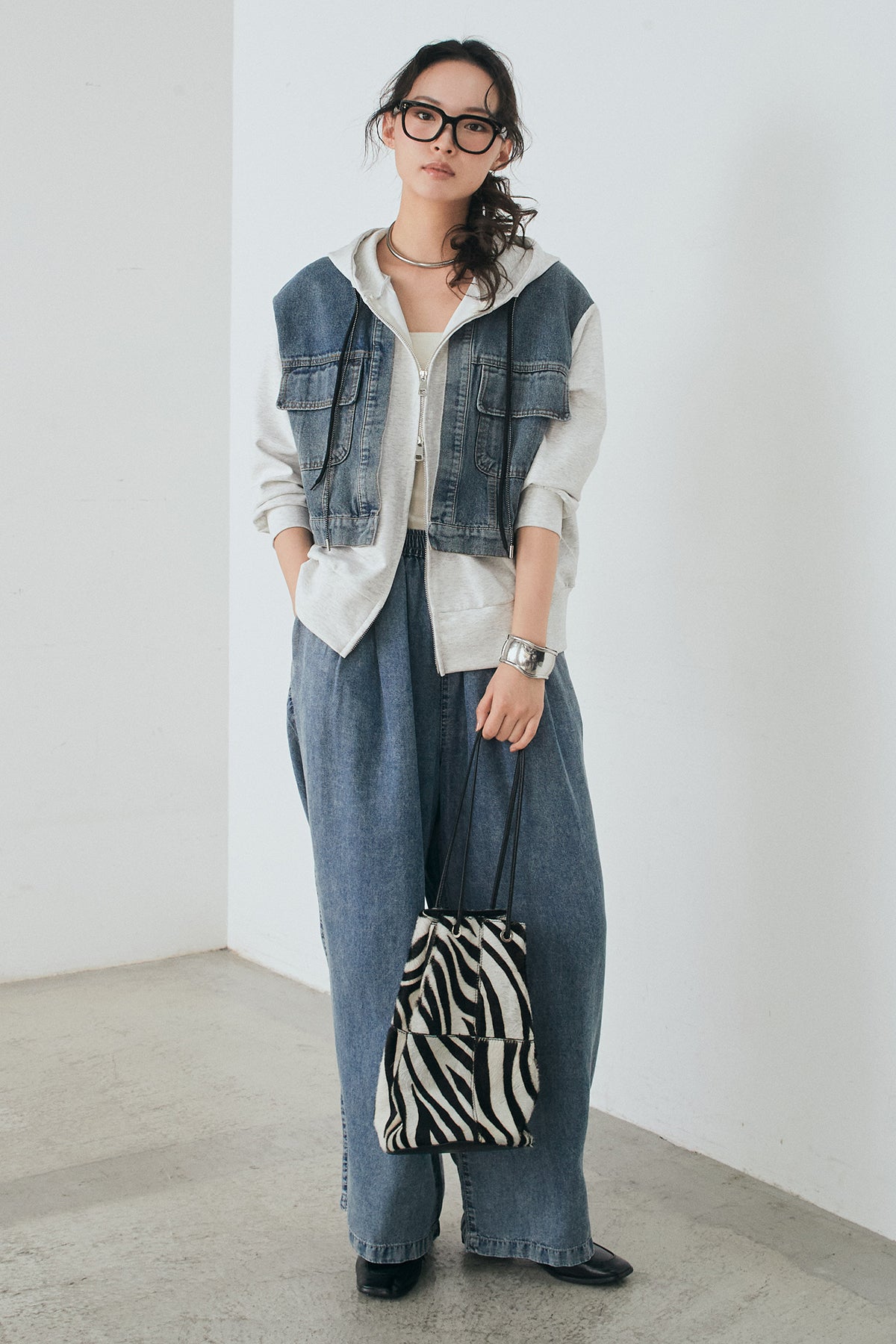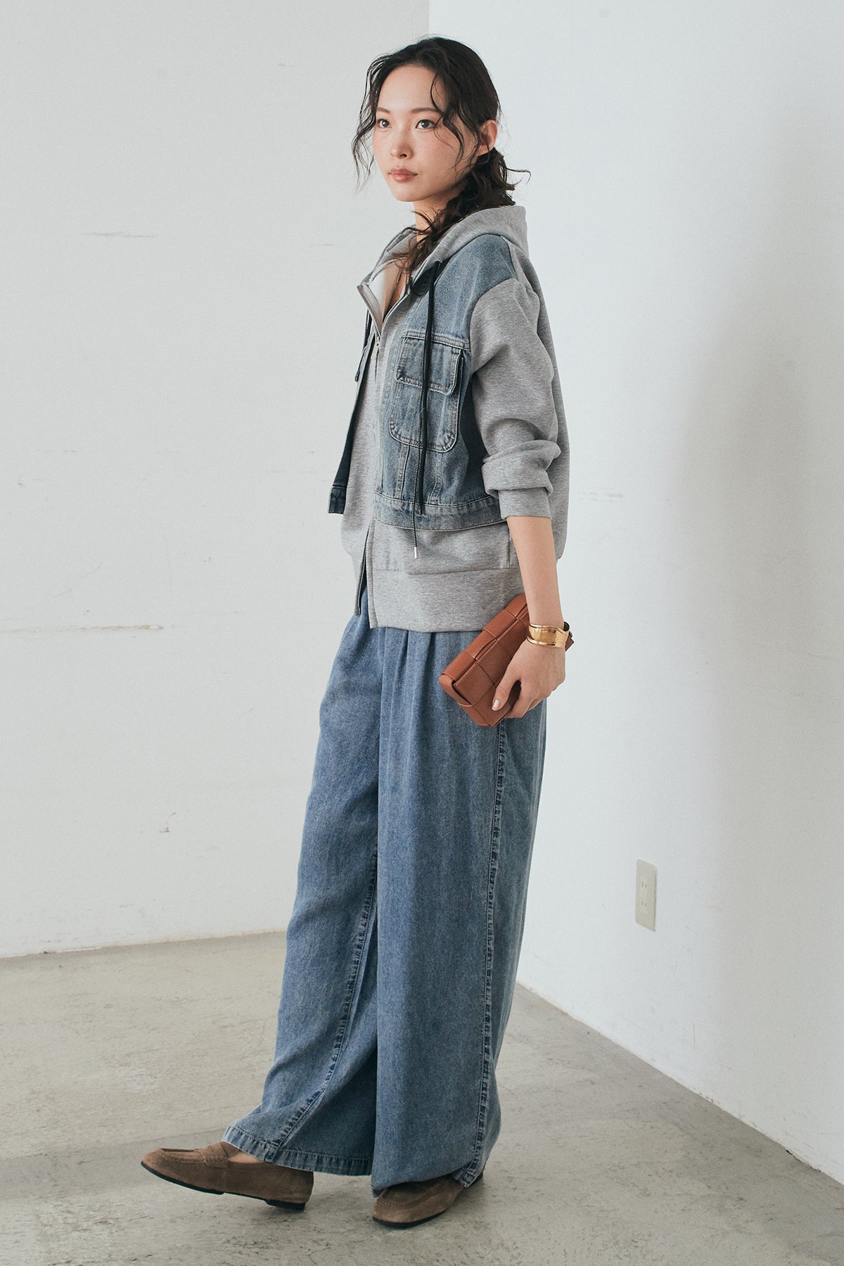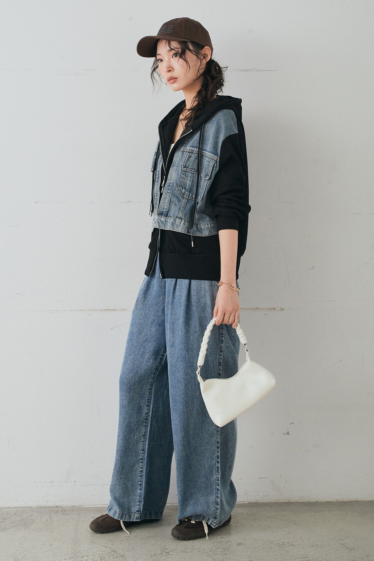 [SET]デニム切替ポンチダブルジップパーカー+テンセルデニムイージーワイドパンツ(2set)