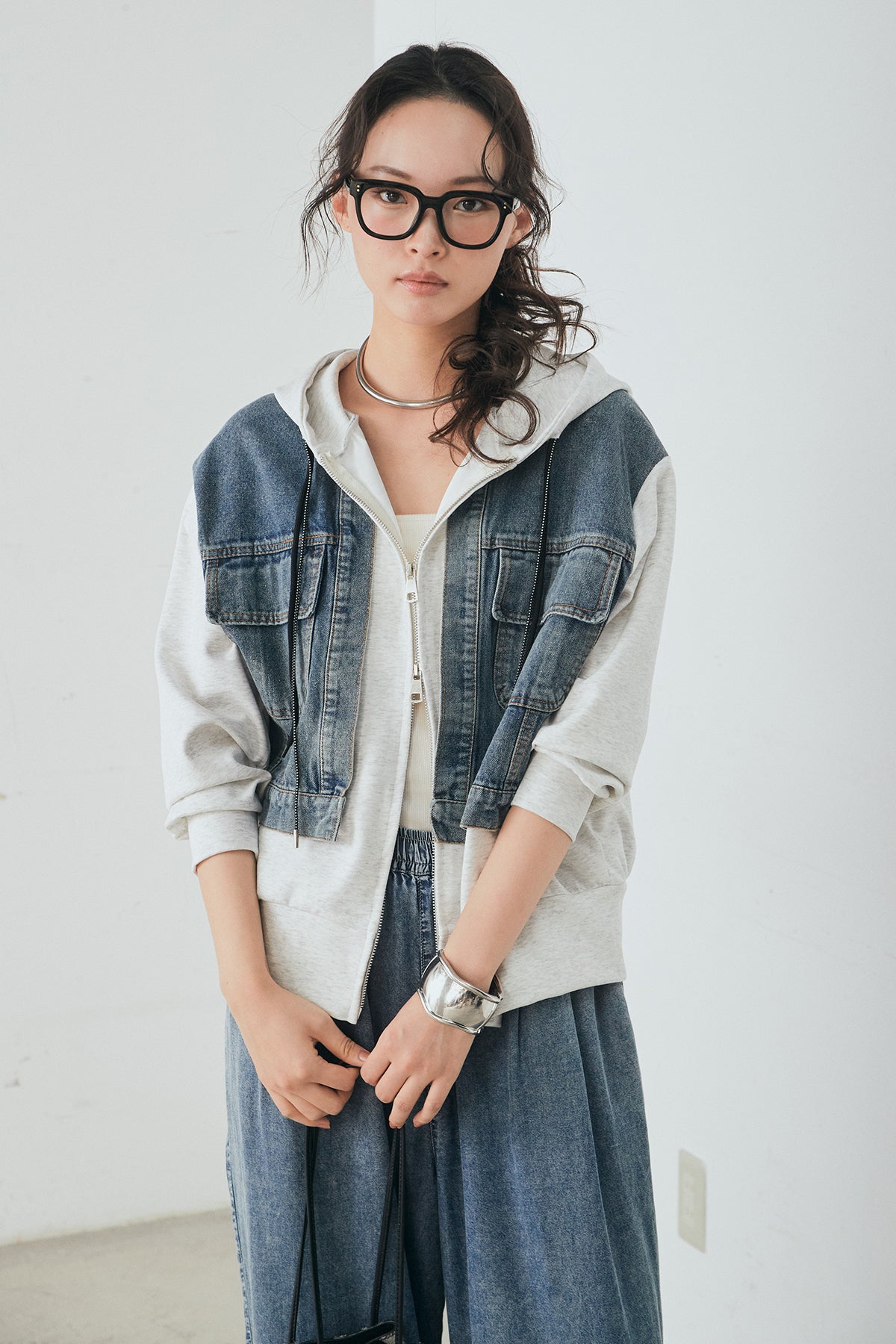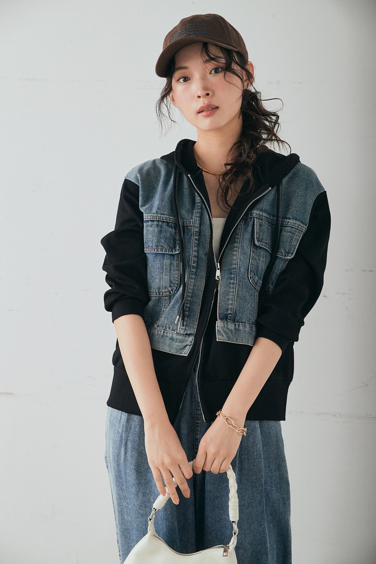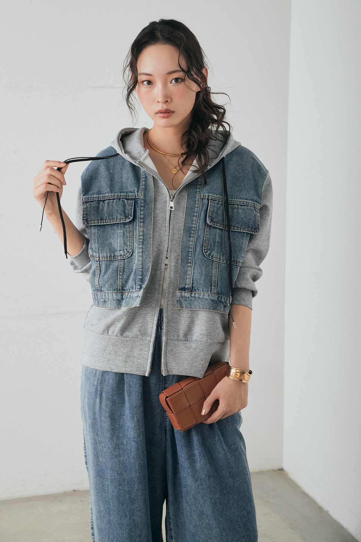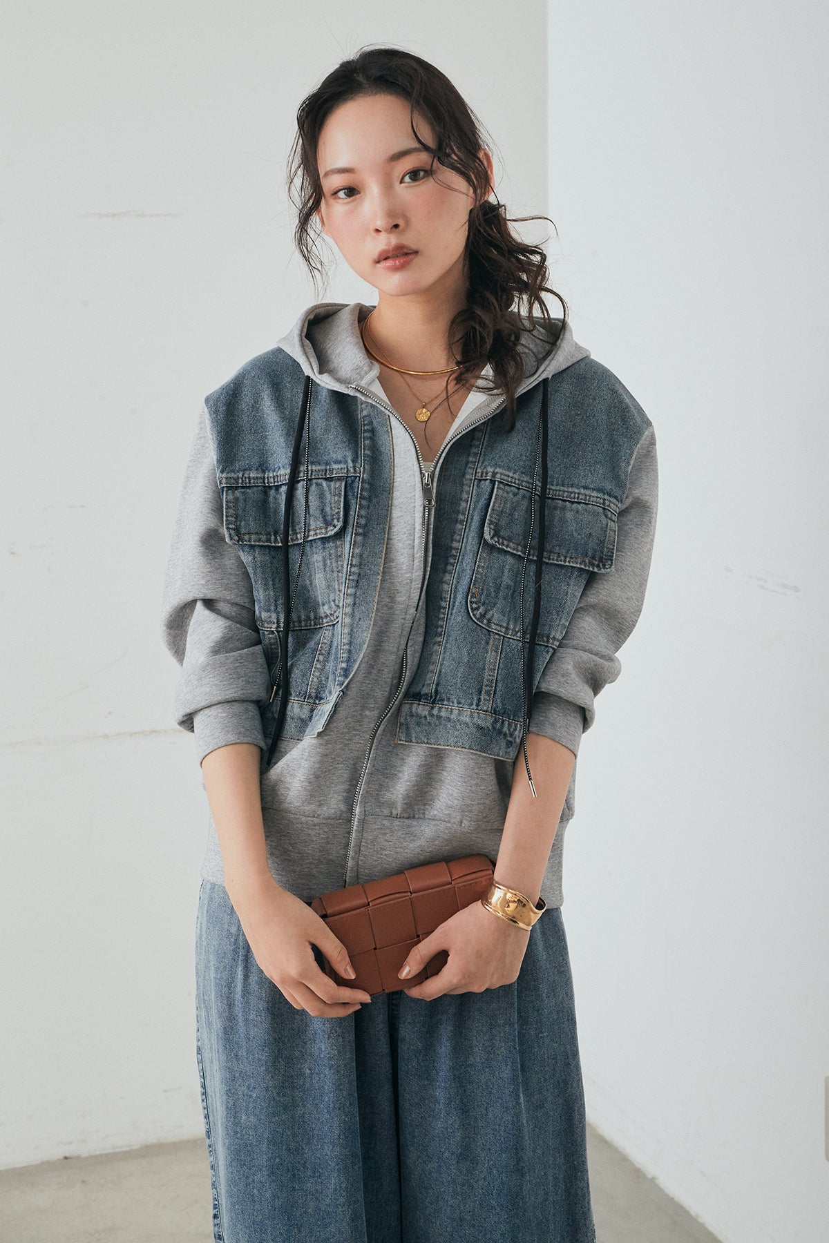 デニム素材を切り替えに取り入れた、ポンチ素材のダブルジップパーカー。異素材のコントラストがスタイリングに奥行きを与え、カジュアルながらも印象的な仕上がりに。程よくハリのあるポンチ生地とゆとりのあるシルエットで、リラックス感のある着心地を実現します。ダブルジップ仕様でバランスの調整もしやすく、パンツにもスカートにも合わせやすい一着です。