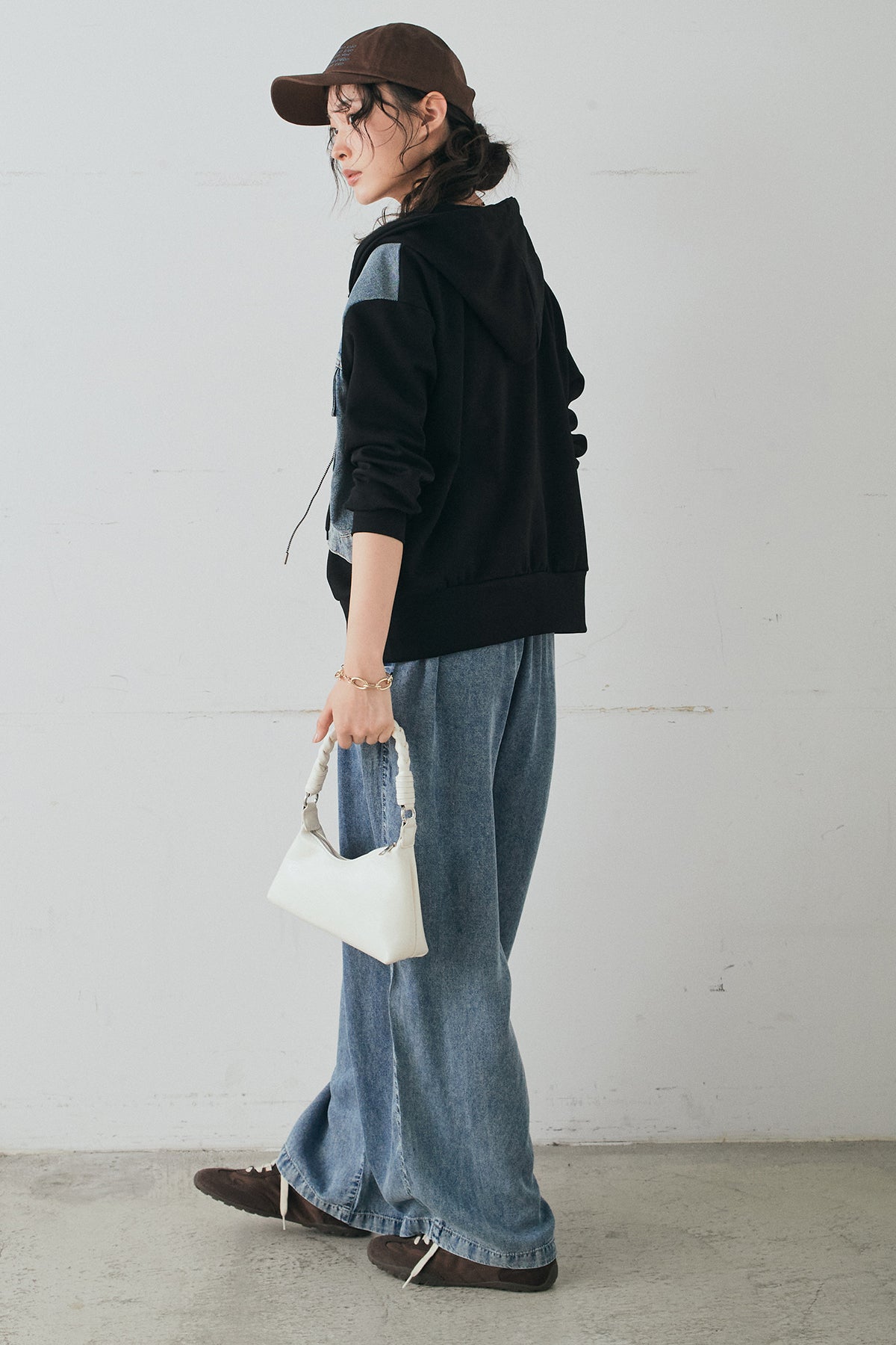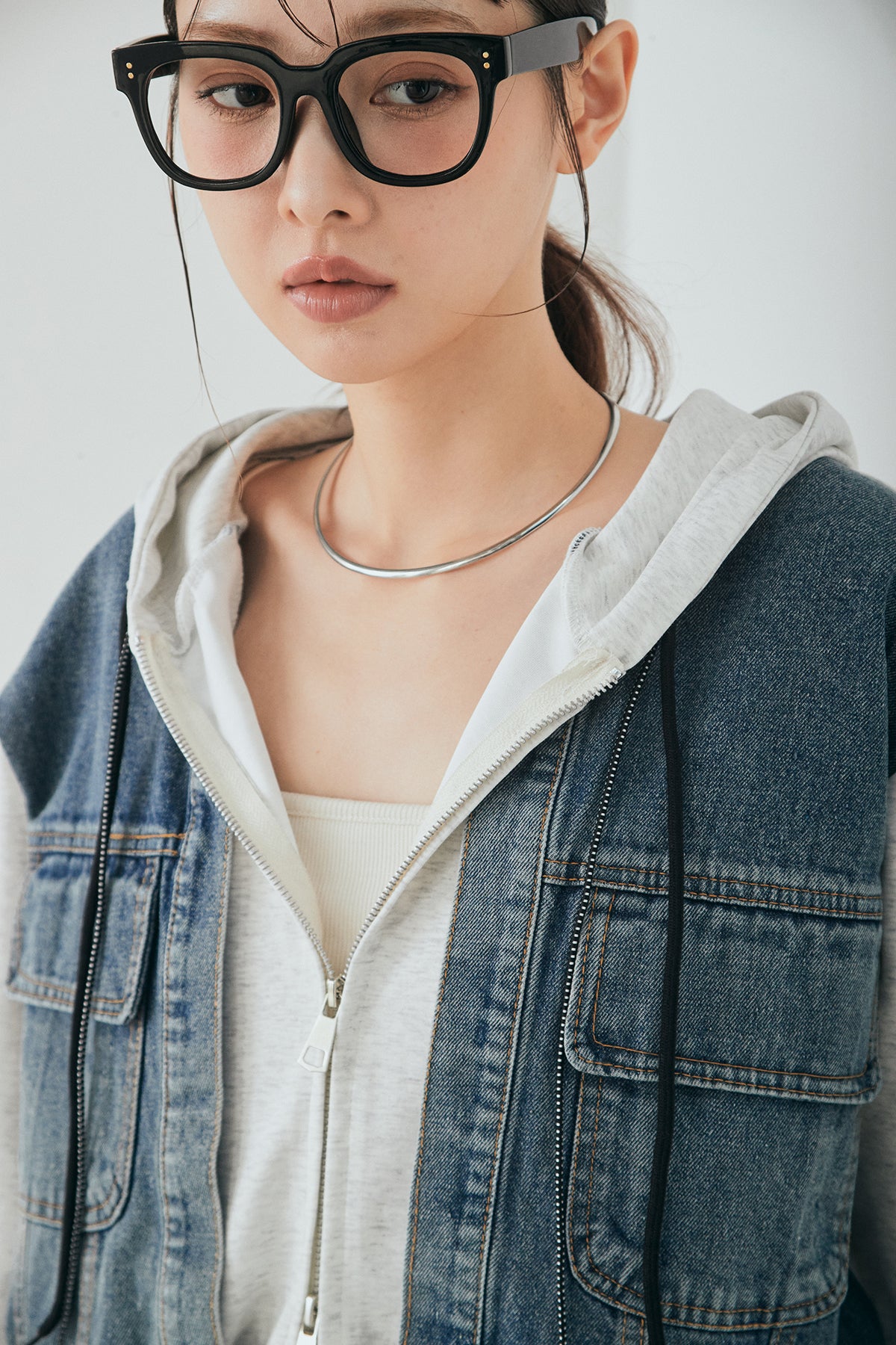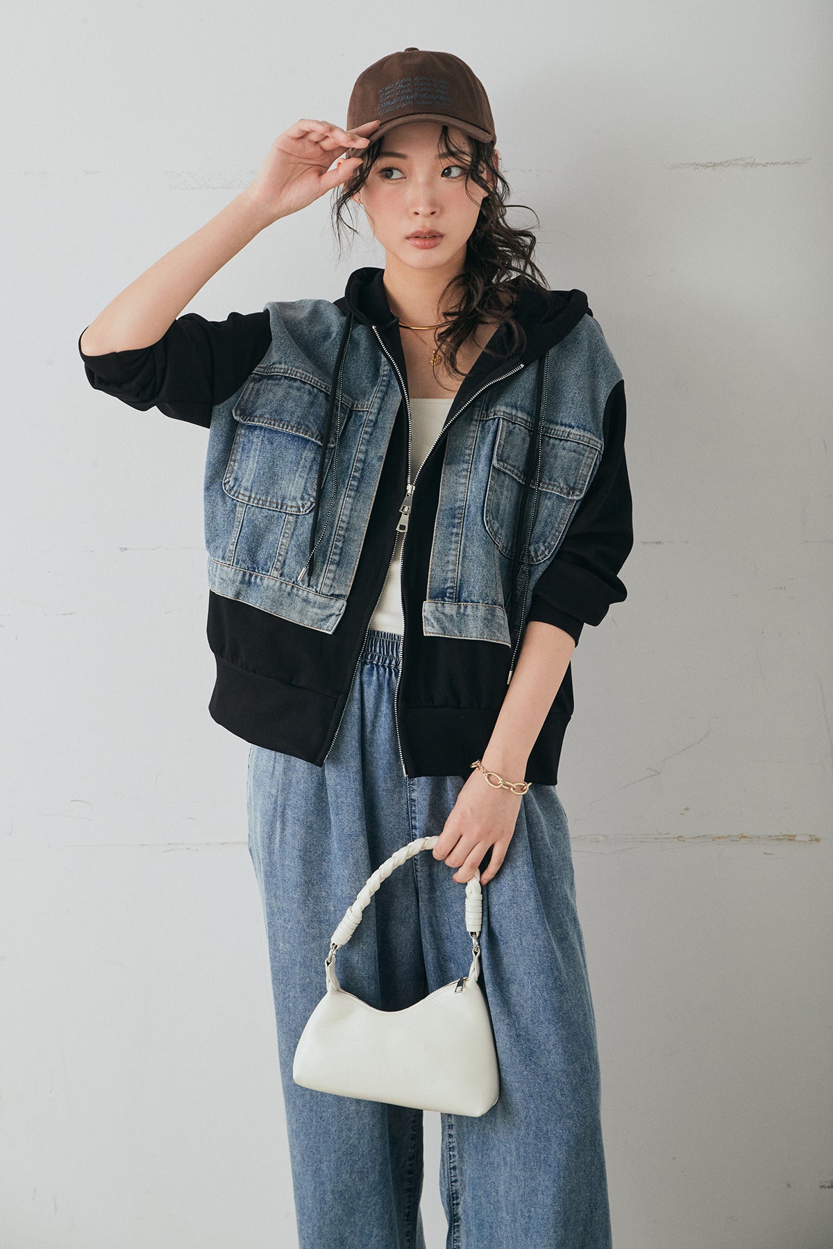 デニム素材を切り替えに取り入れた、ポンチ素材のダブルジップパーカー。異素材のコントラストがスタイリングに奥行きを与え、カジュアルながらも印象的な仕上がりに。程よくハリのあるポンチ生地とゆとりのあるシルエットで、リラックス感のある着心地を実現します。ダブルジップ仕様でバランスの調整もしやすく、パンツにもスカートにも合わせやすい一着です。