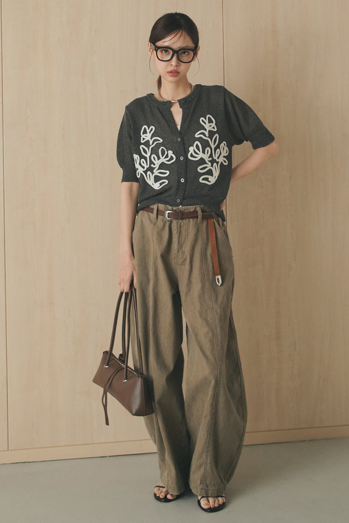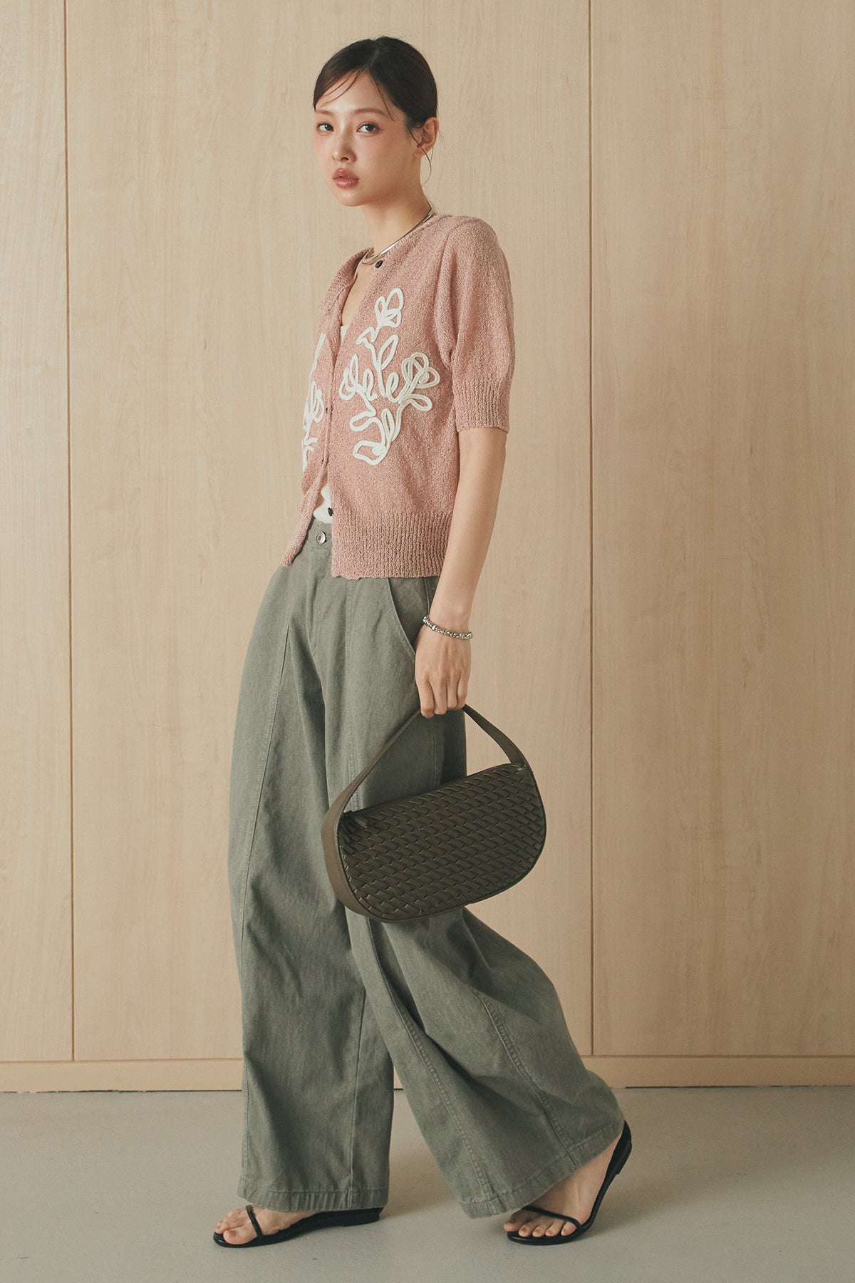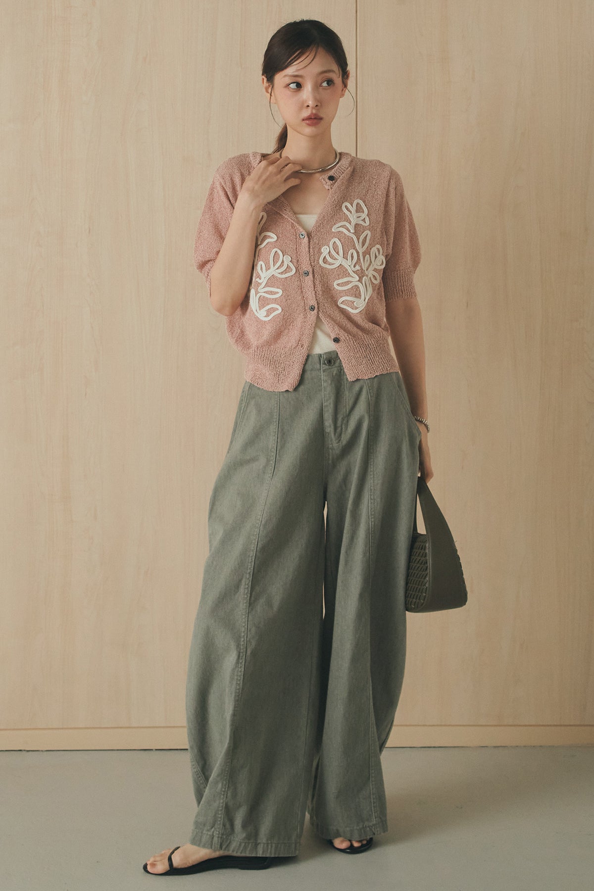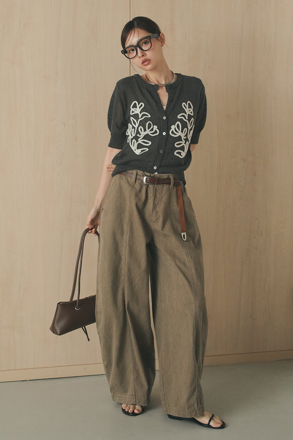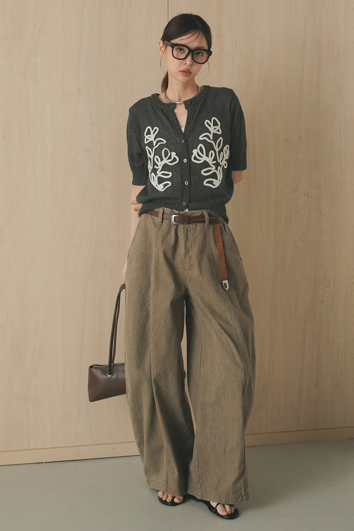 [SET]フロントテープデザイン半袖カーディガン+サイドベルトカーブワイドパンツ(2set)