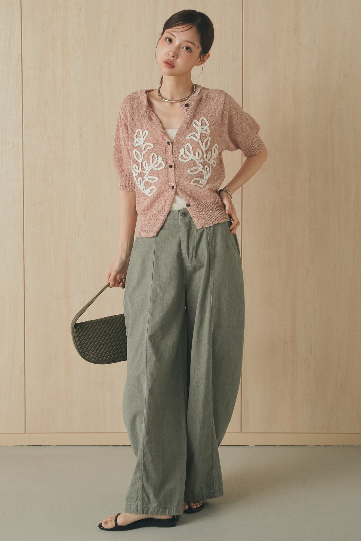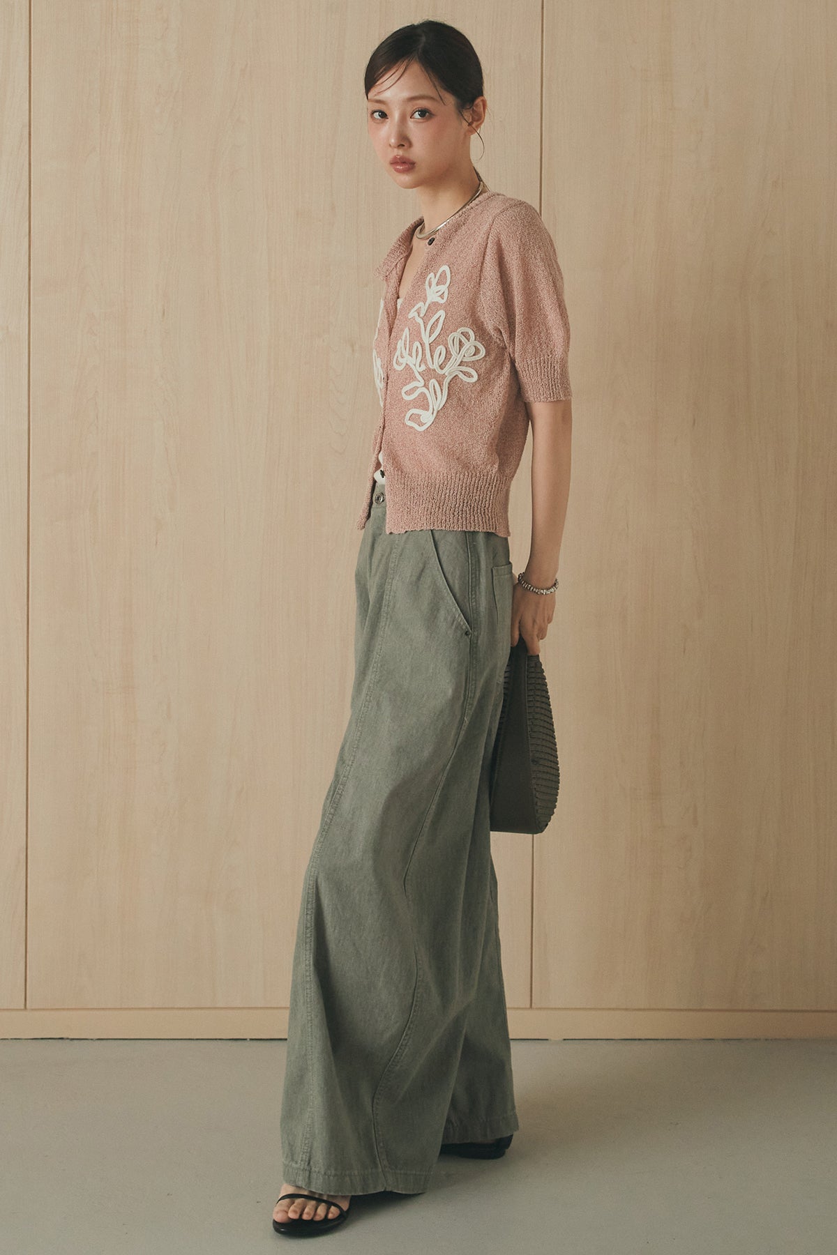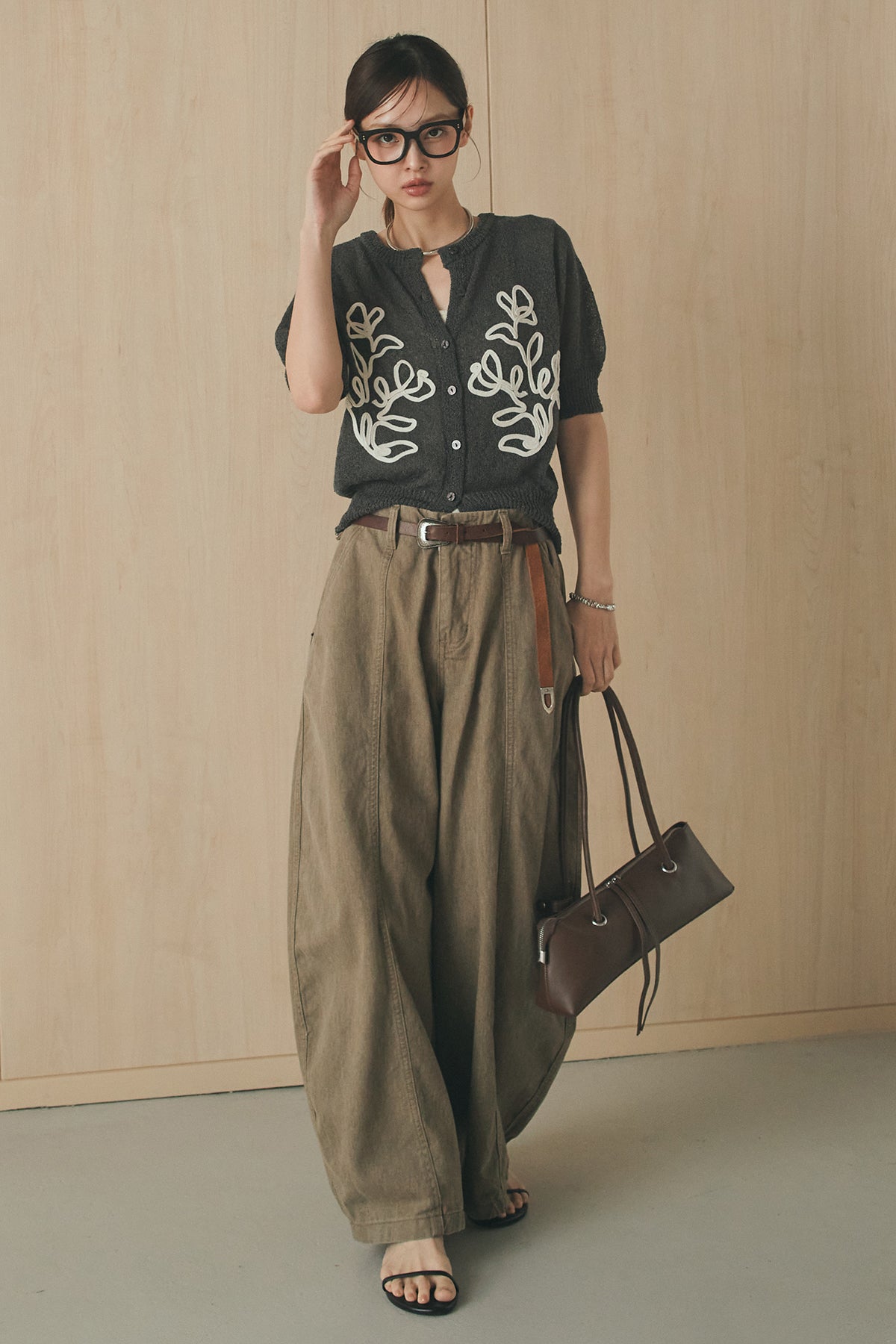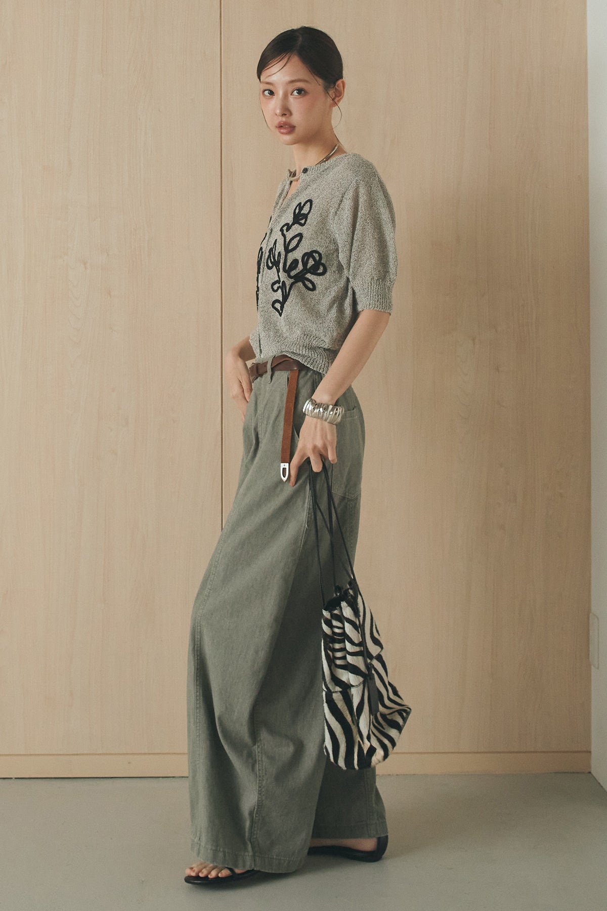 [SET]フロントテープデザイン半袖カーディガン+サイドベルトカーブワイドパンツ(2set)