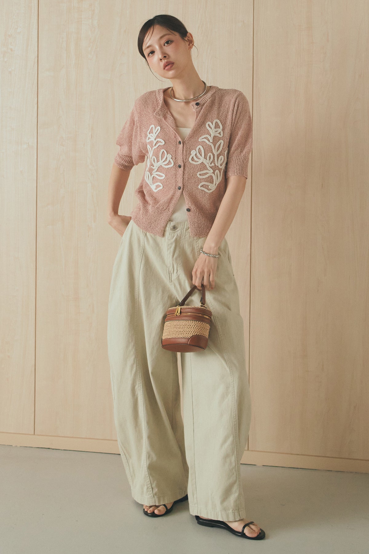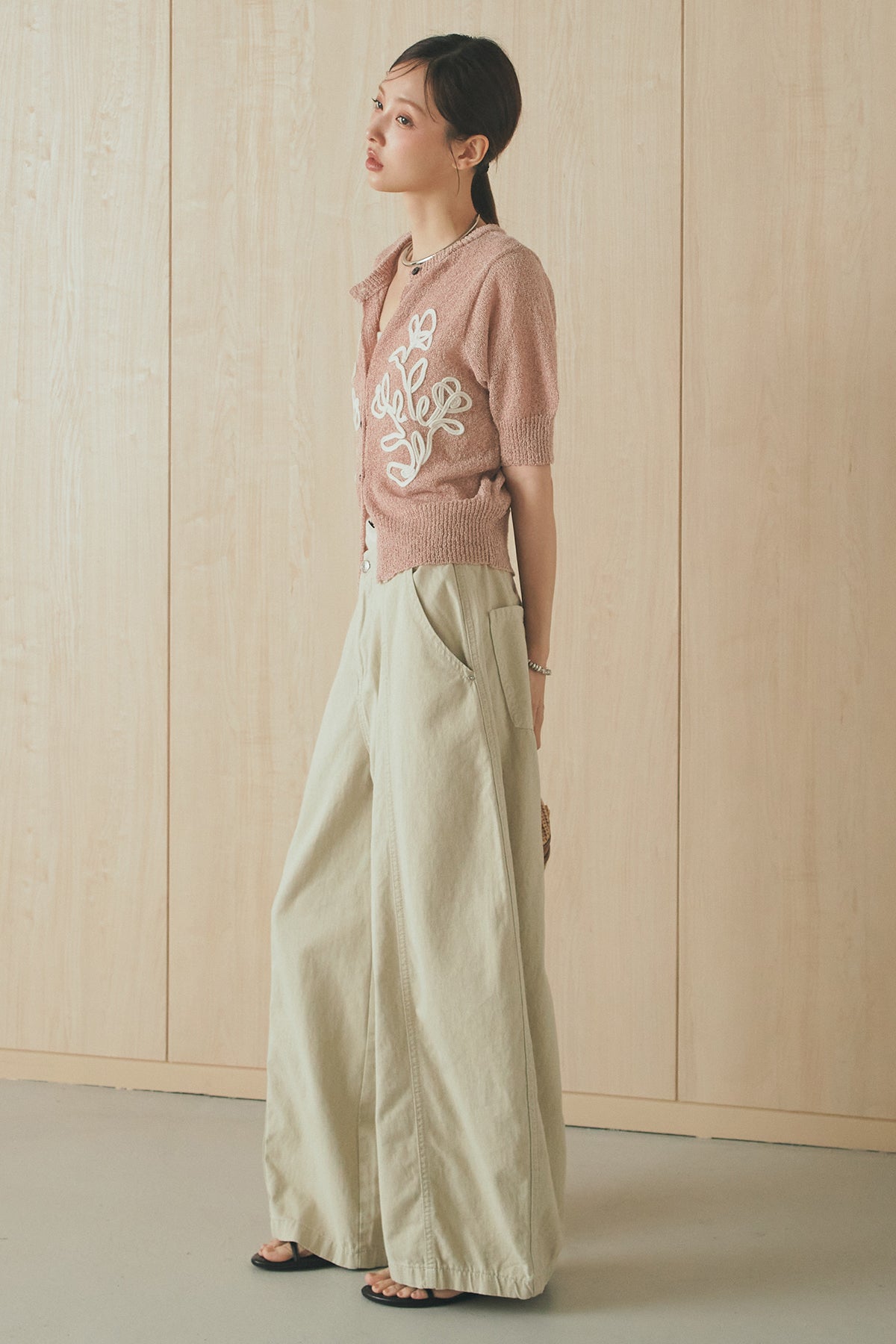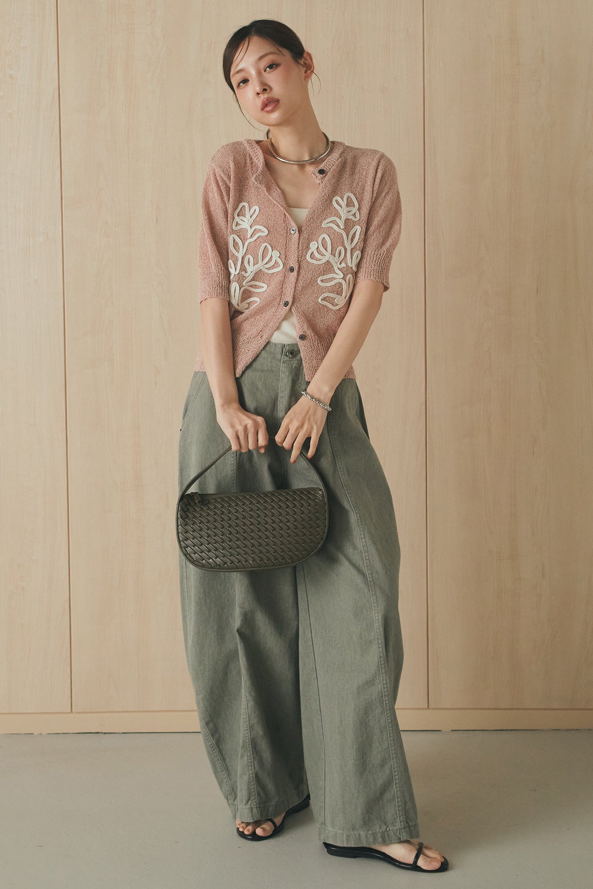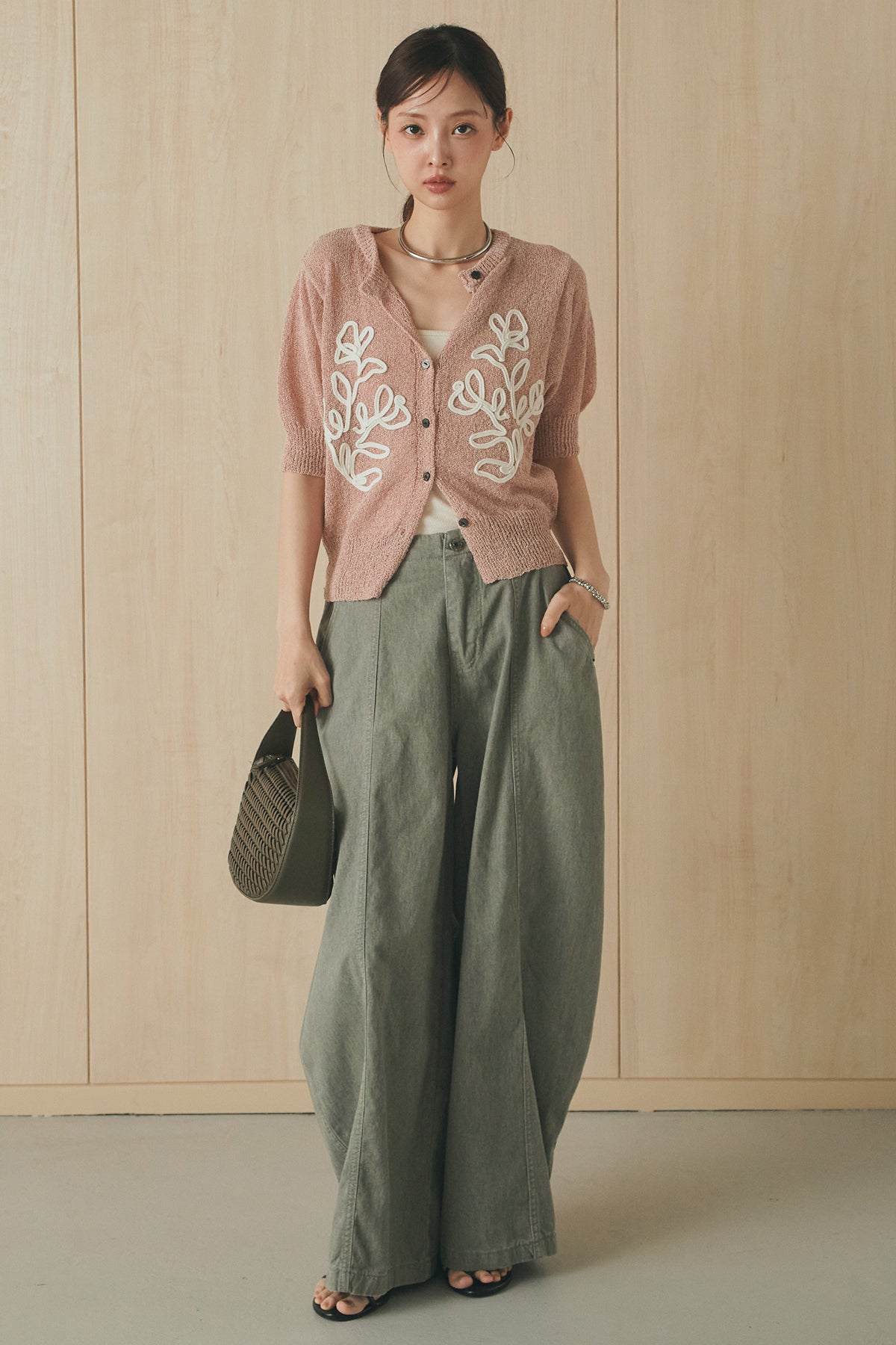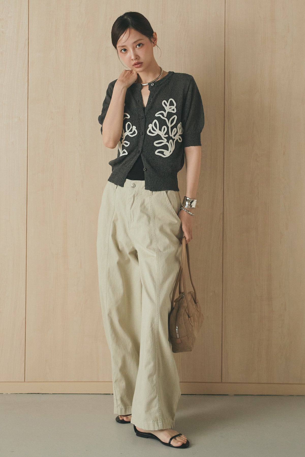 [SET]フロントテープデザイン半袖カーディガン+サイドベルトカーブワイドパンツ(2set)