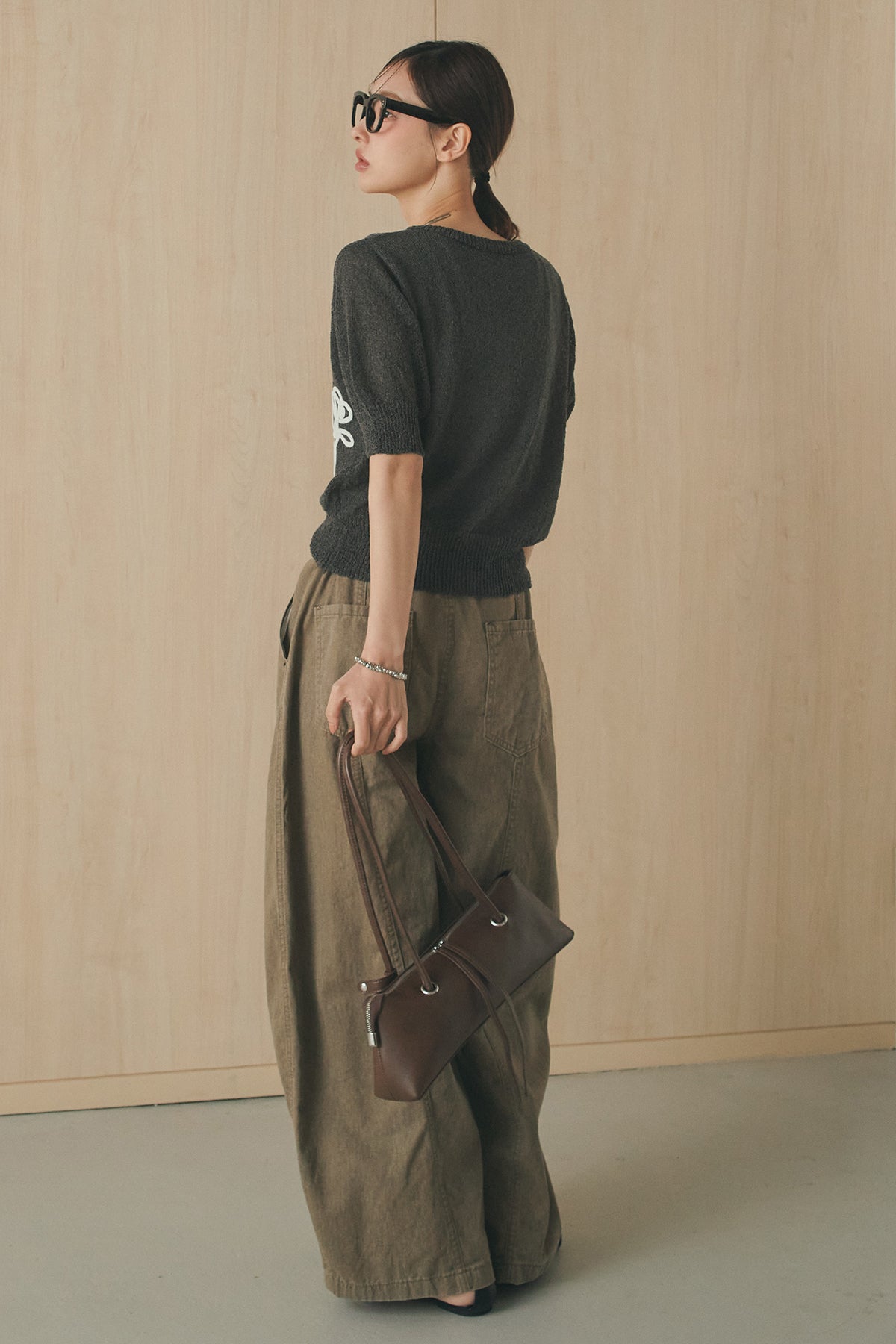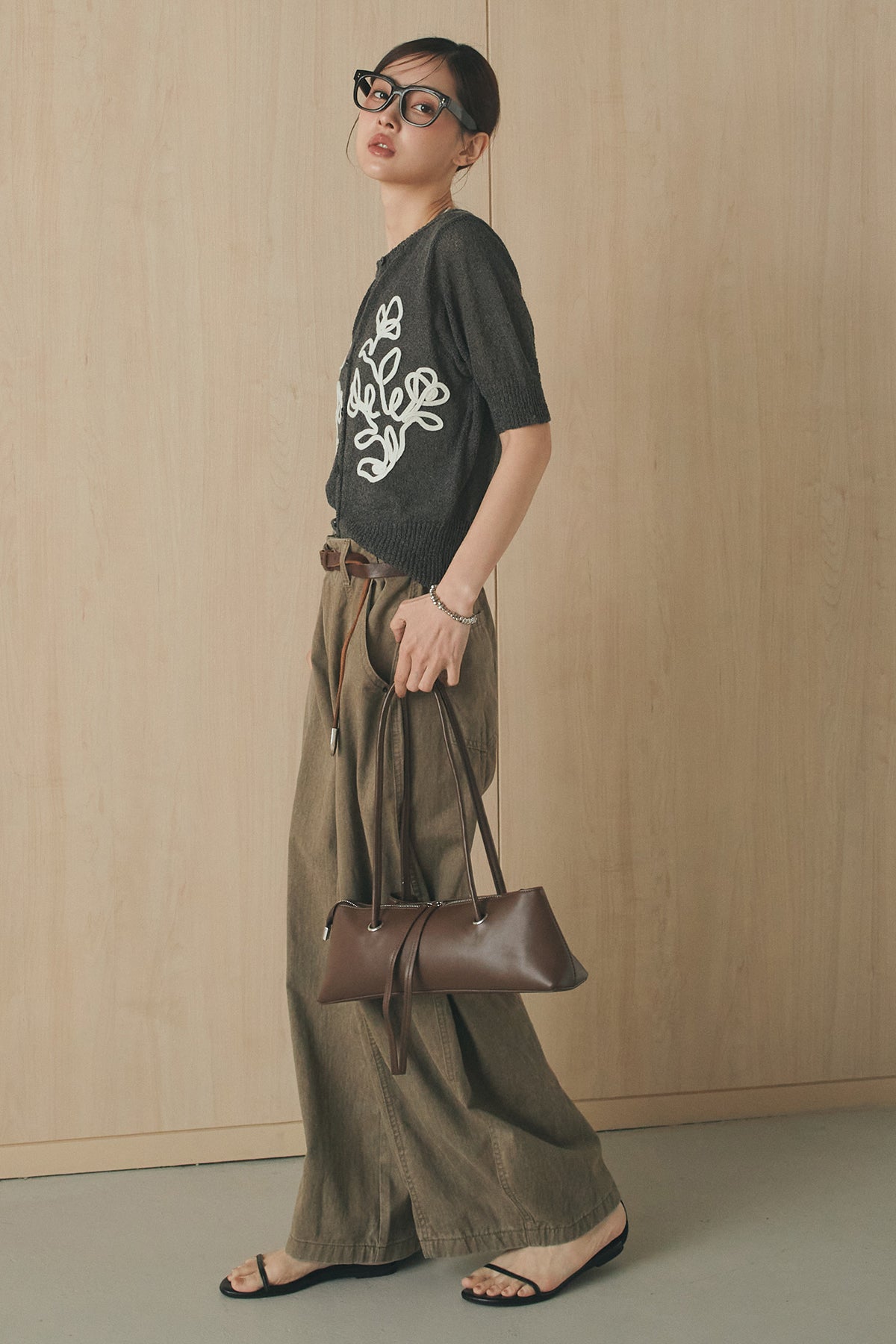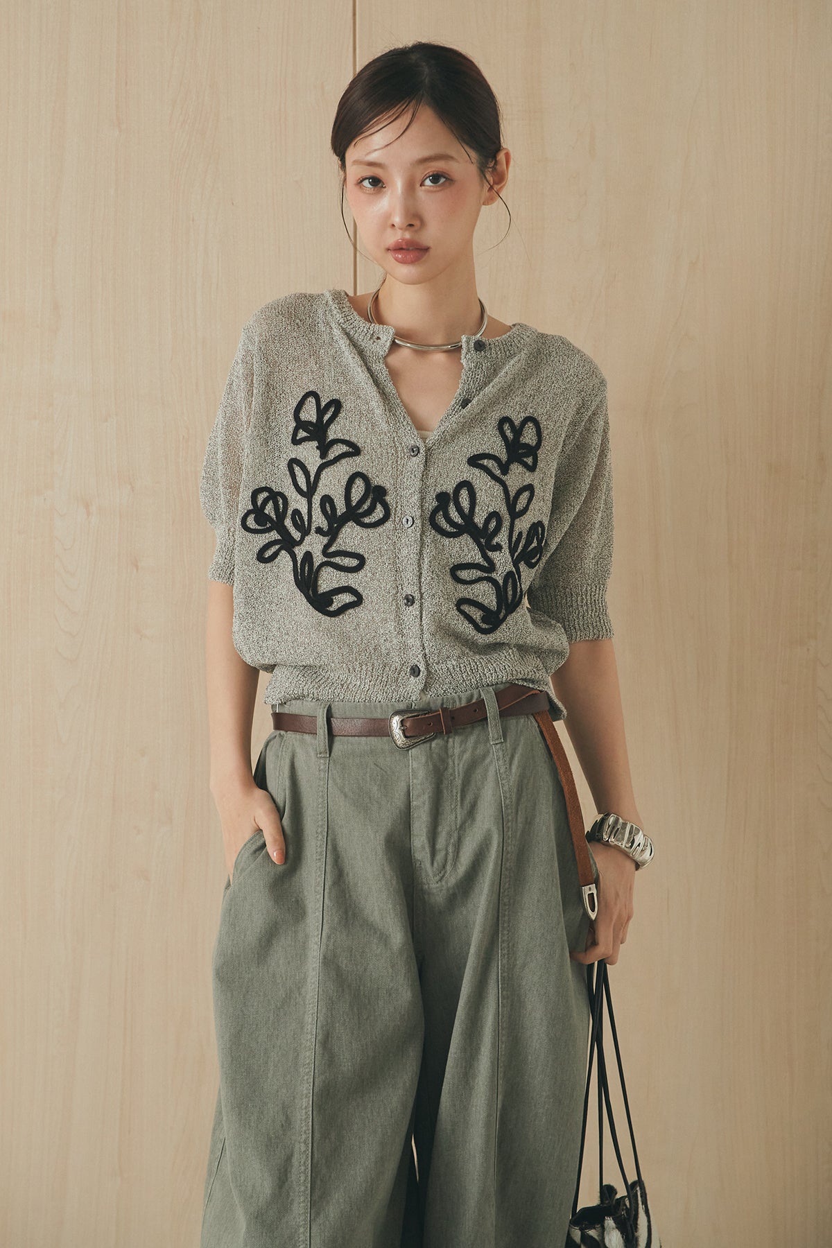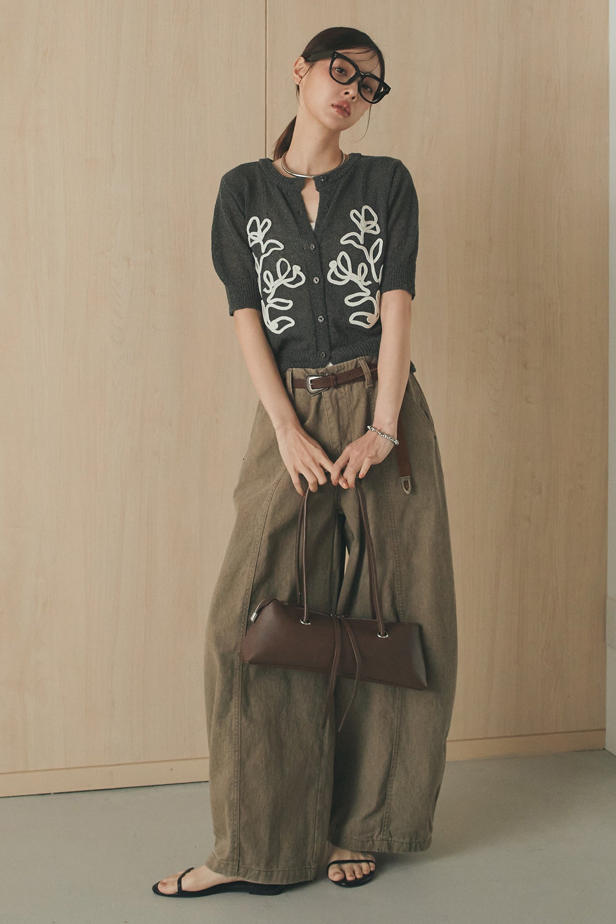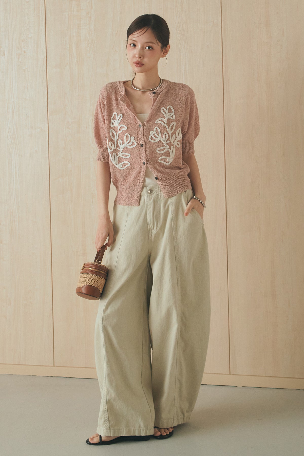 [SET]フロントテープデザイン半袖カーディガン+サイドベルトカーブワイドパンツ(2set)