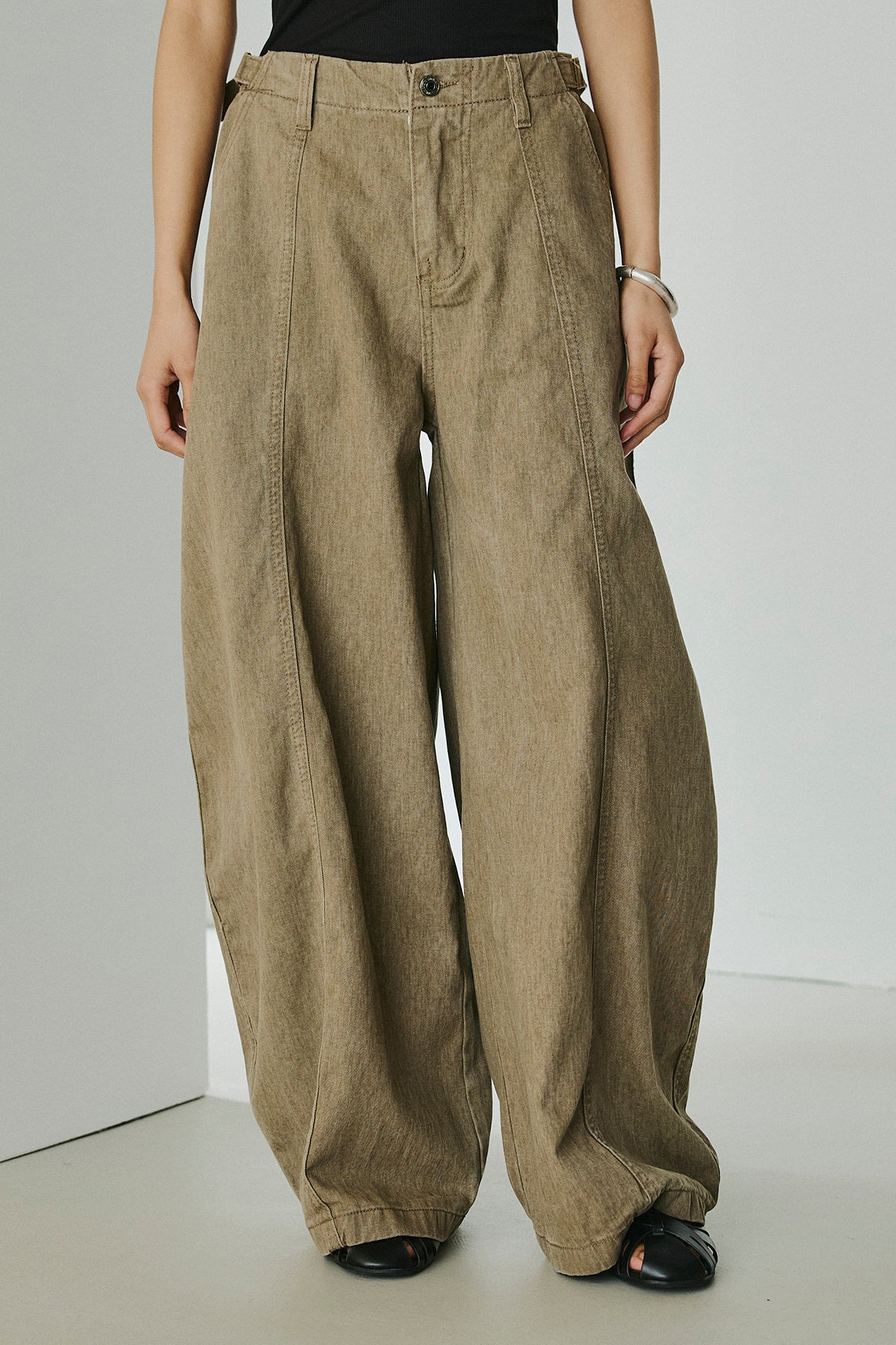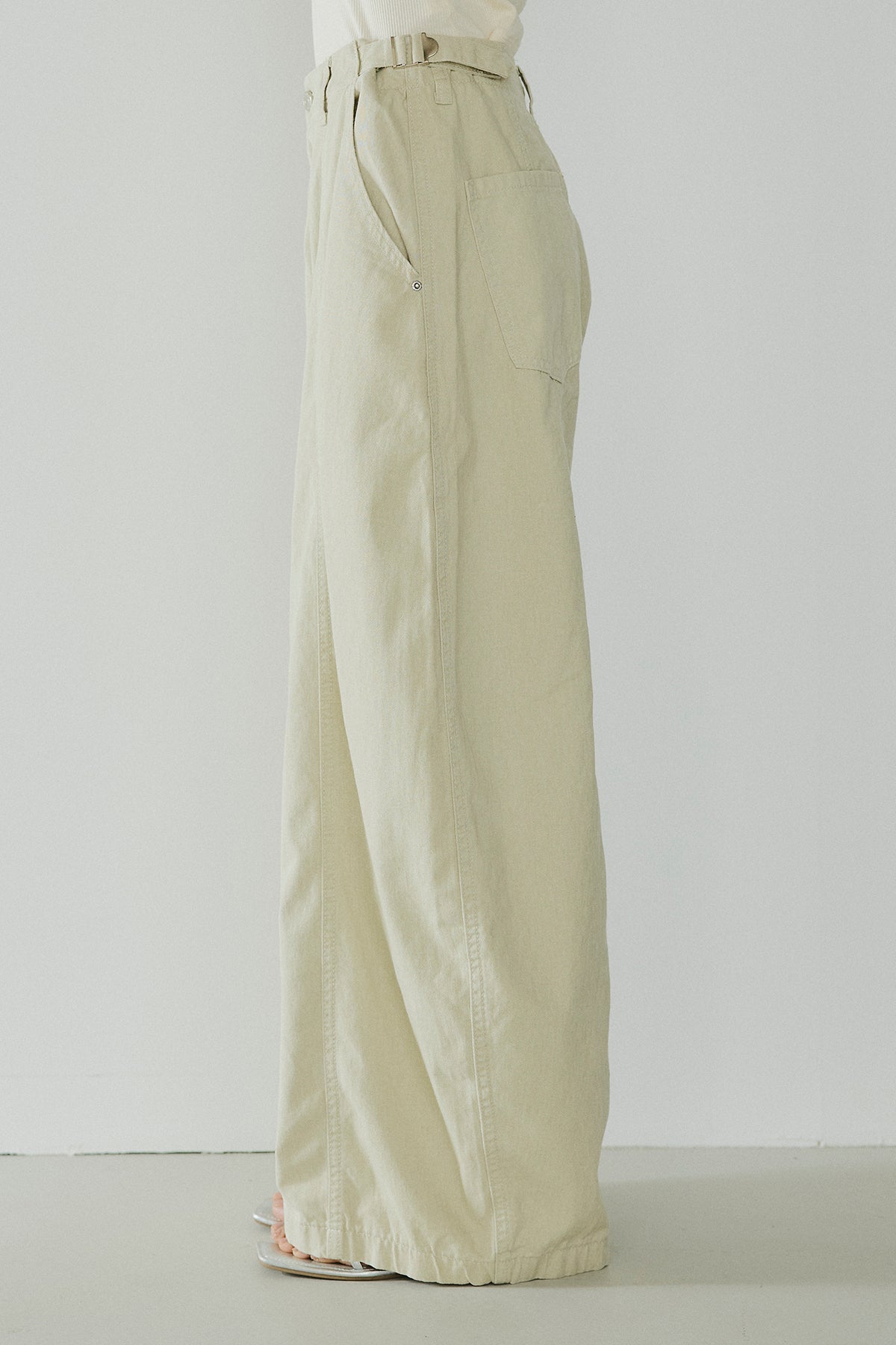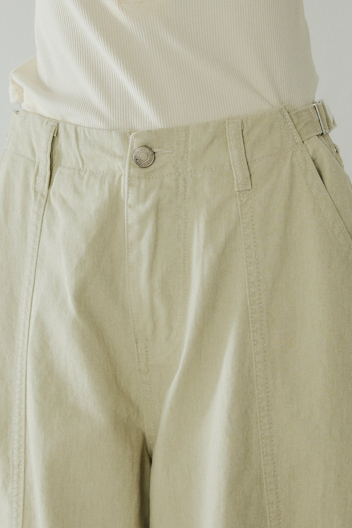 サイドに施されたベルトデザインが目を惹く、立体的なシルエットのカーブワイドパンツ。 さりげないディテールがアクセントとなり、シンプルなスタイリングにモードなニュアンスをプラスしてくれる一着です。 カーブを描くワイドシルエットが、動きのあるフォルムを演出。 ゆとりのある履き心地ながらも、計算されたラインですっきりとした印象に仕上げています。 ウエスト部分のサイドベルトでフィット感の調整が可能。 トップスをインすることでデザインが引き立ち、バランスの良いスタイリングが完成します。 カジュアルからきれいめまで幅広く対応し、デイリーに活躍。 シンプルなスタイリングに遊び心をプラスし、都会的でこなれたムードを演出してくれる主役級のアイテムです。