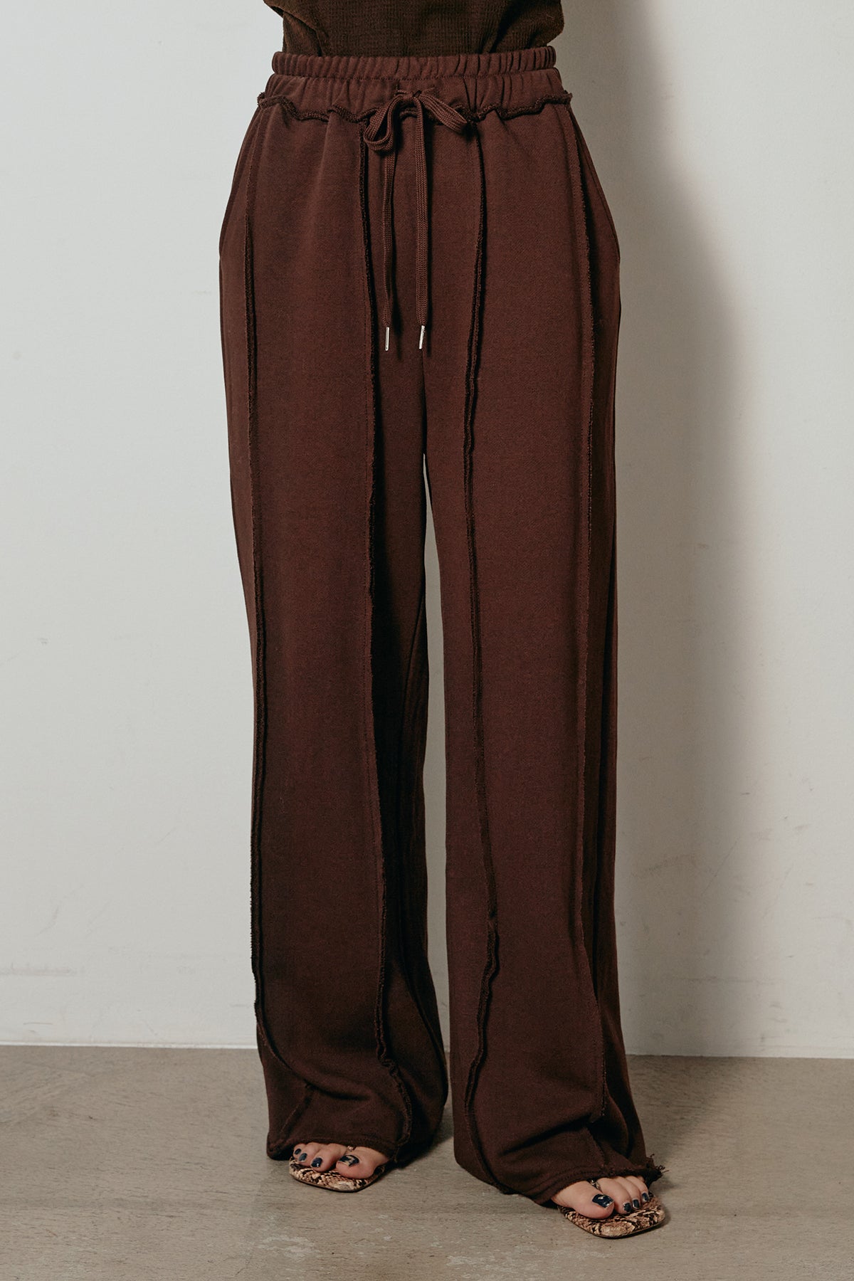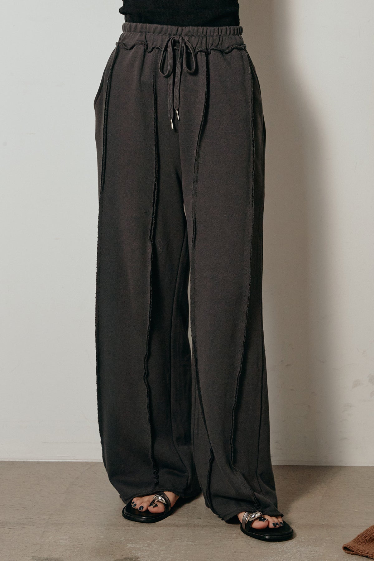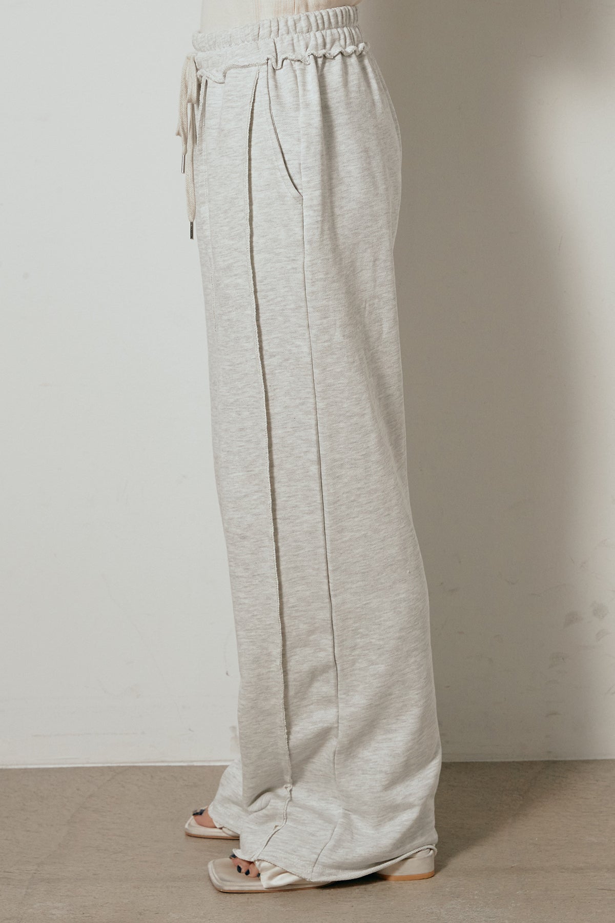 フロントに施されたステッチラインが特徴的なスウェットワイドパンツ。立体感のあるシームデザインが脚のラインをすっきりと見せ、ラフながらも洗練された印象に。ウエストはドローストリング仕様で快適な穿き心地を実現。柔らかく落ち感のある素材で、動きやすさとシルエットの美しさを両立。スウェットながらも大人っぽく着こなせる万能ボトムです。