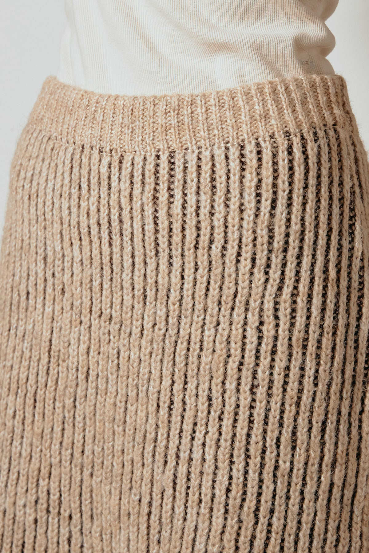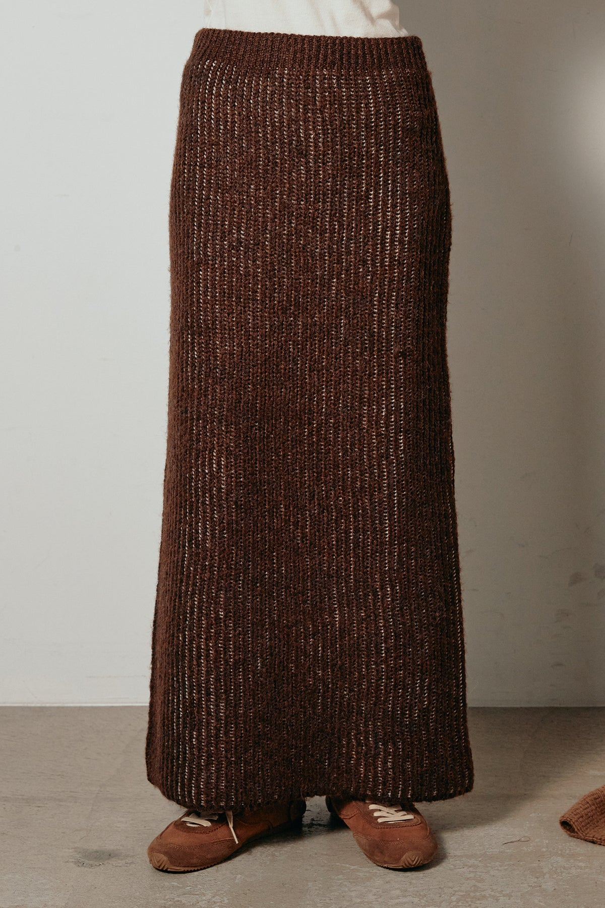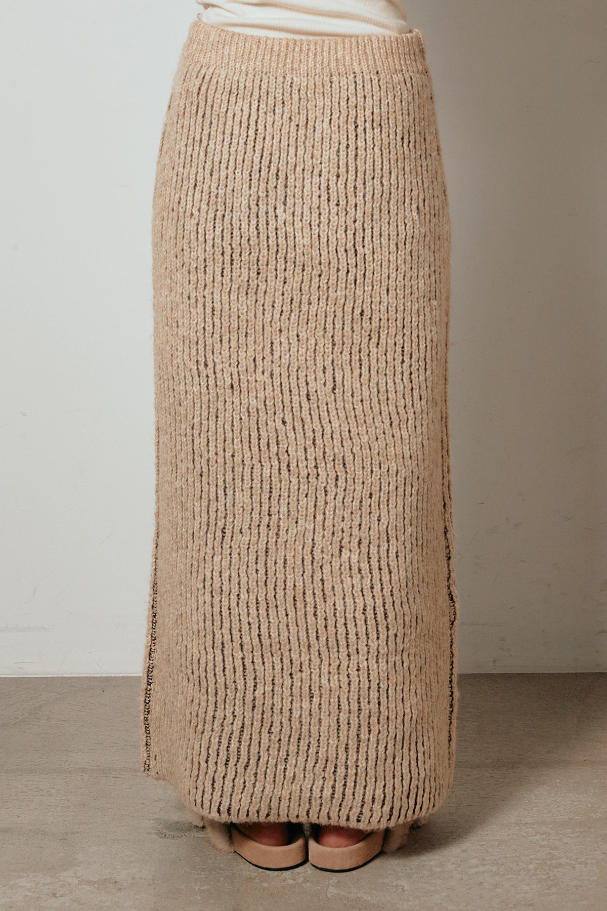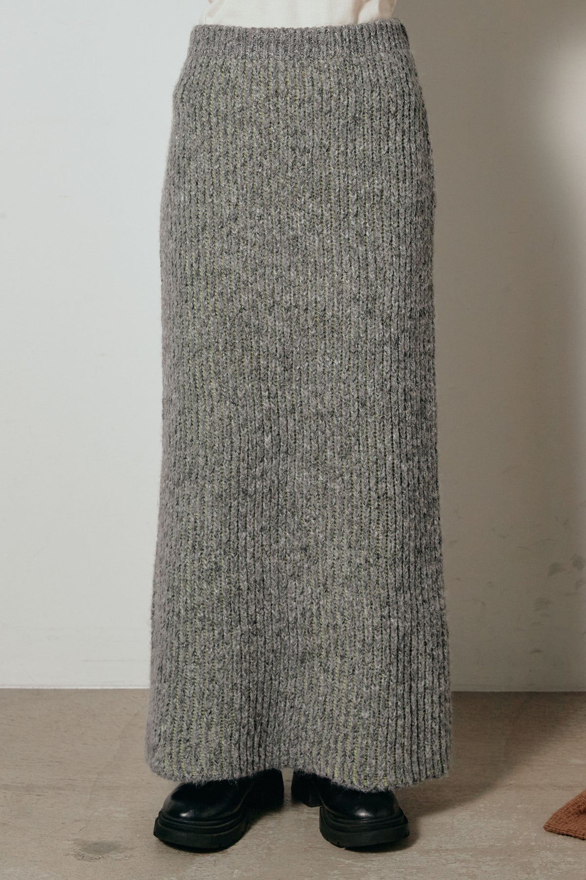 ふんわりとしたアルパカタッチの糸で編み立てたニットタイトスカート。程よい厚みと柔らかな風合いが季節感を引き立て、優しく包み込むような穿き心地です。縦のラインを強調するリブ編みがスタイルアップ効果を発揮し、シンプルながらも上品な印象に。同素材のトップスと合わせたセットアップスタイルはもちろん、ボリュームニットとのバランスコーデもおすすめ。秋冬のデイリースタイルにぴったりな一枚です。