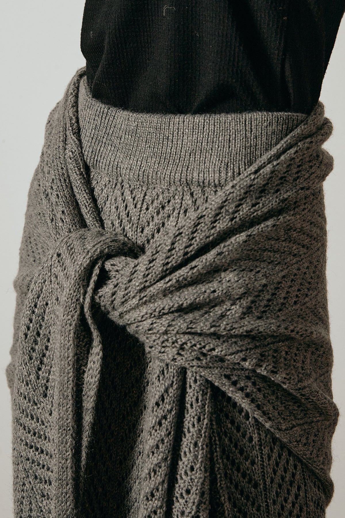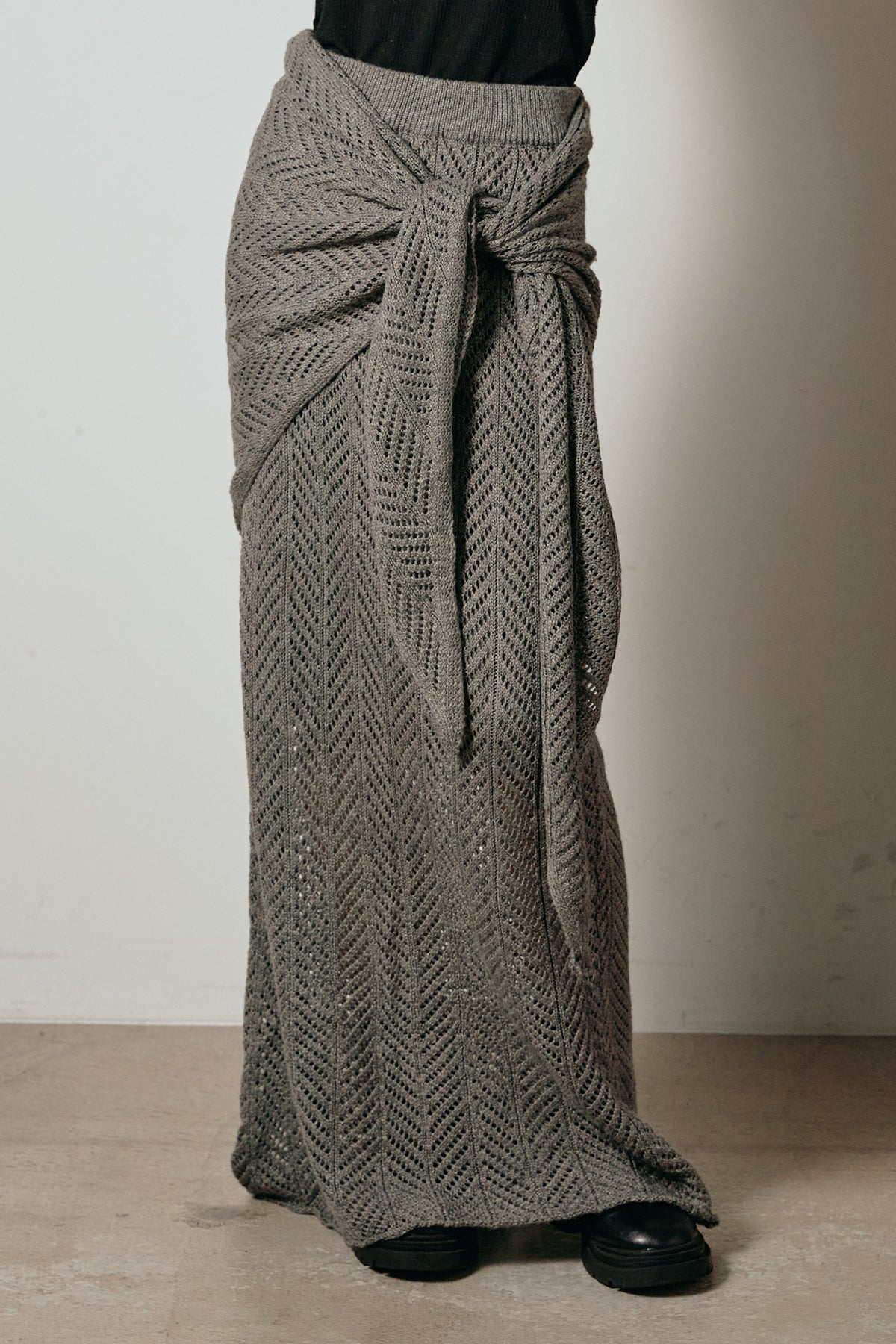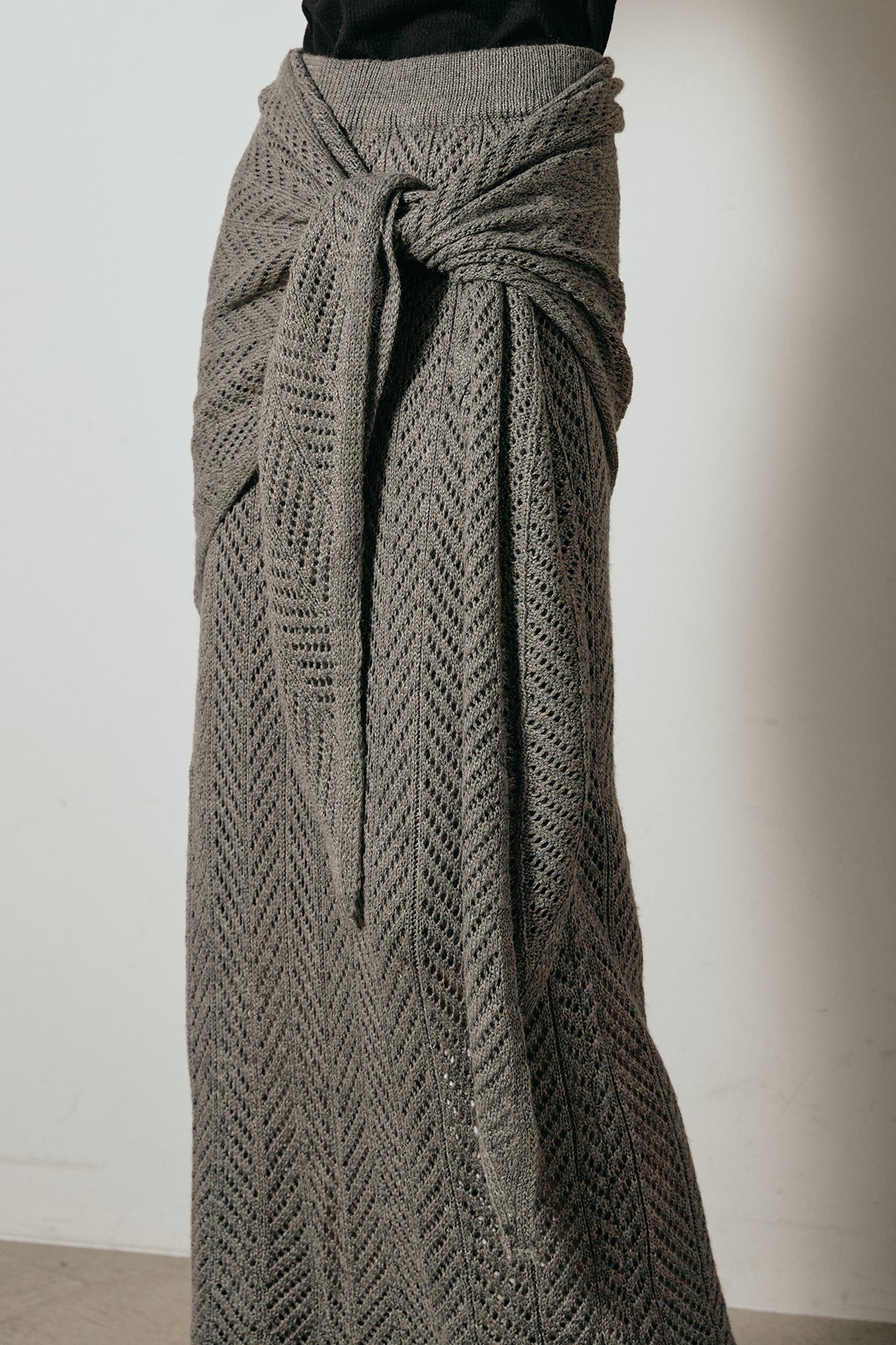 立体的な透かし編みが魅力のニットスカート。ラップ風のレイヤードデザインとフロントの結びディテールがポイントで、動くたびに優雅なドレープを描きます。ストレッチ性のある素材で快適な穿き心地ながら、縦のラインを強調したシルエットがスタイルアップ効果を発揮。同素材のトップスとセットアップで着こなせば、統一感のある洗練スタイルに仕上がります。