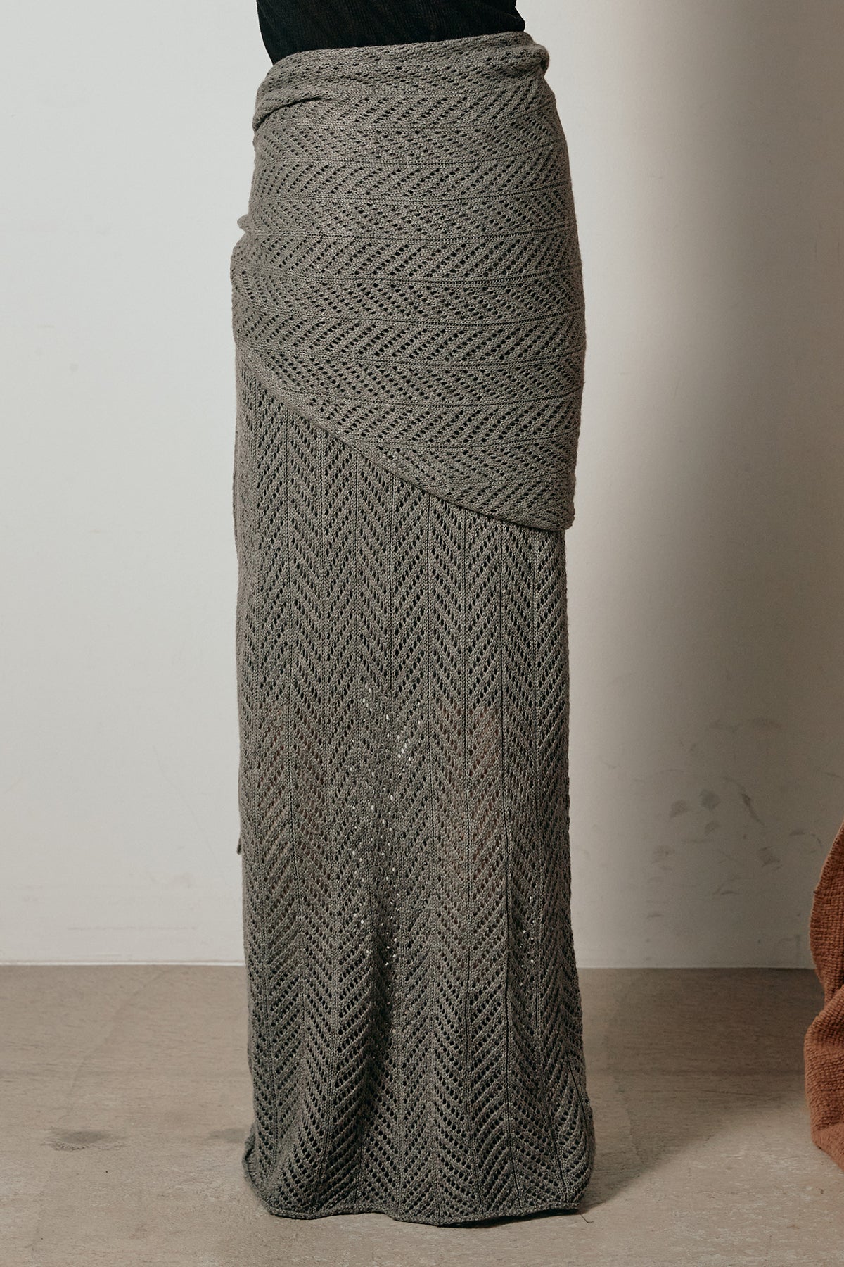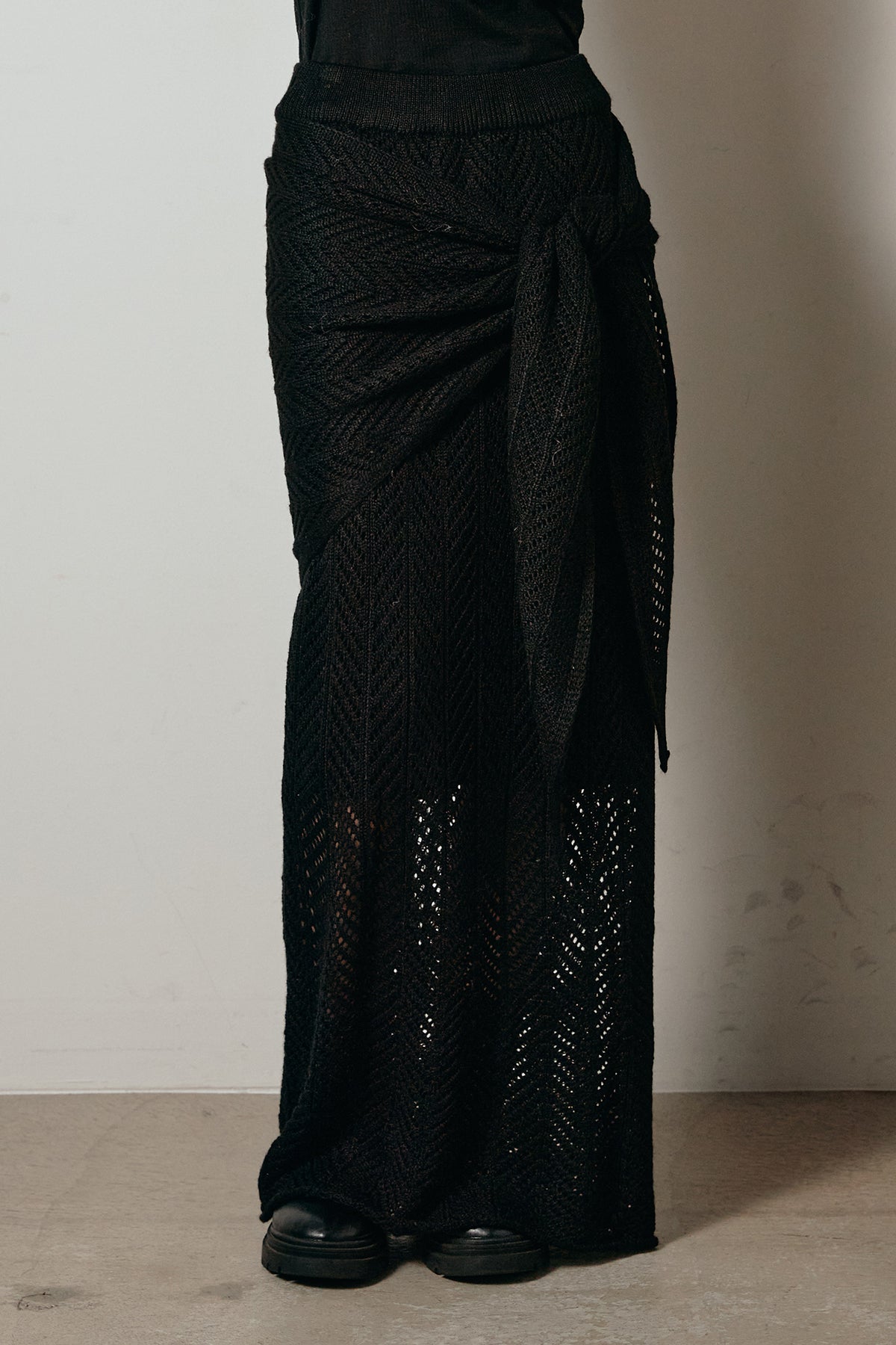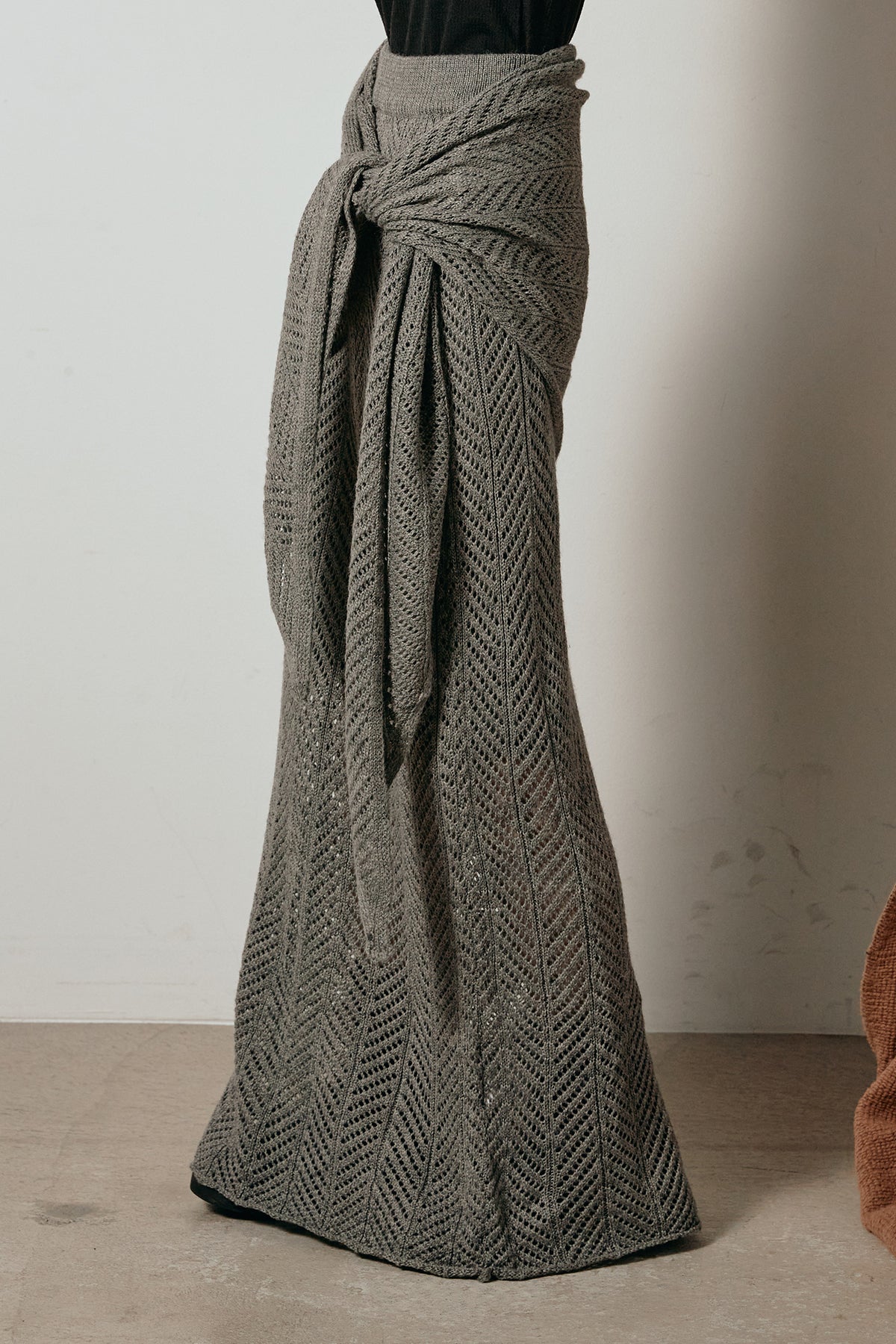 立体的な透かし編みが魅力のニットスカート。ラップ風のレイヤードデザインとフロントの結びディテールがポイントで、動くたびに優雅なドレープを描きます。ストレッチ性のある素材で快適な穿き心地ながら、縦のラインを強調したシルエットがスタイルアップ効果を発揮。同素材のトップスとセットアップで着こなせば、統一感のある洗練スタイルに仕上がります。