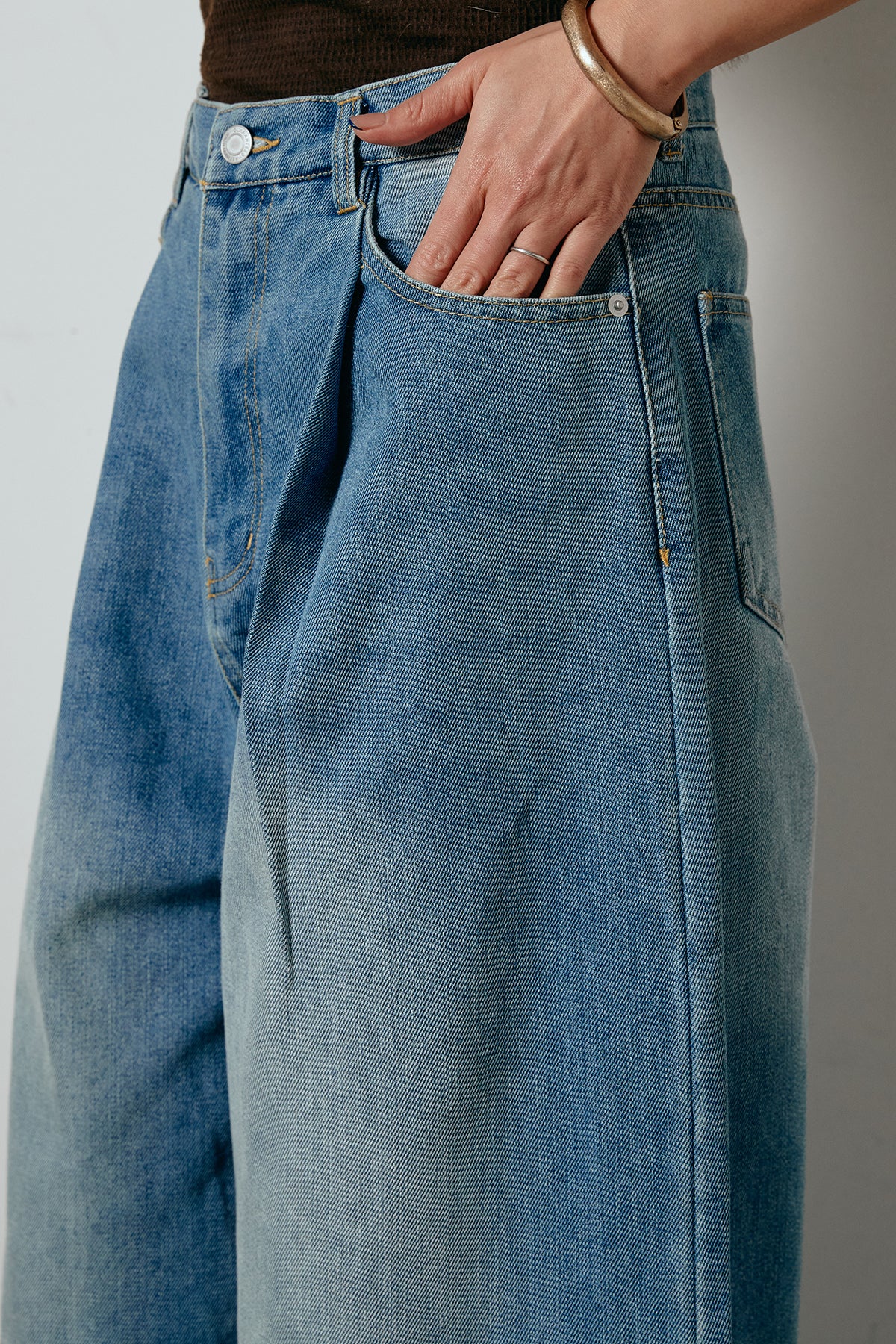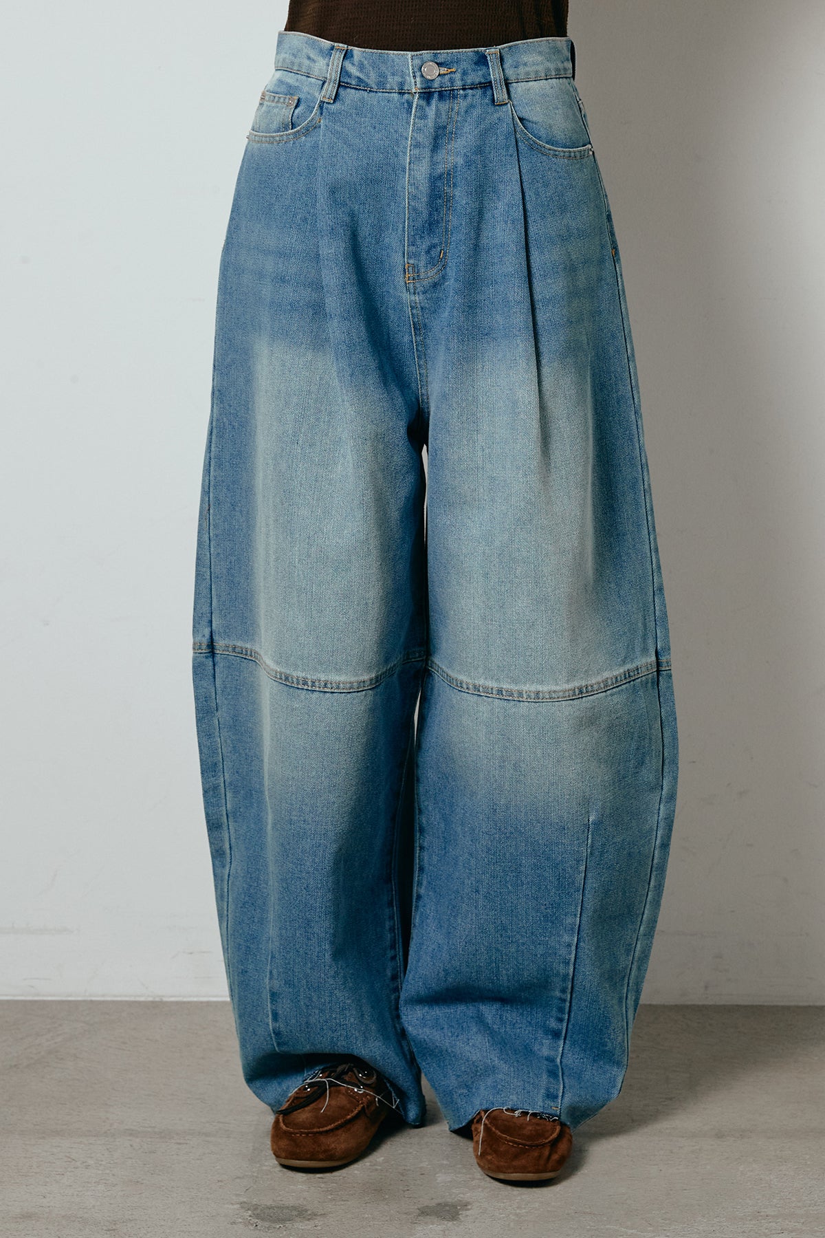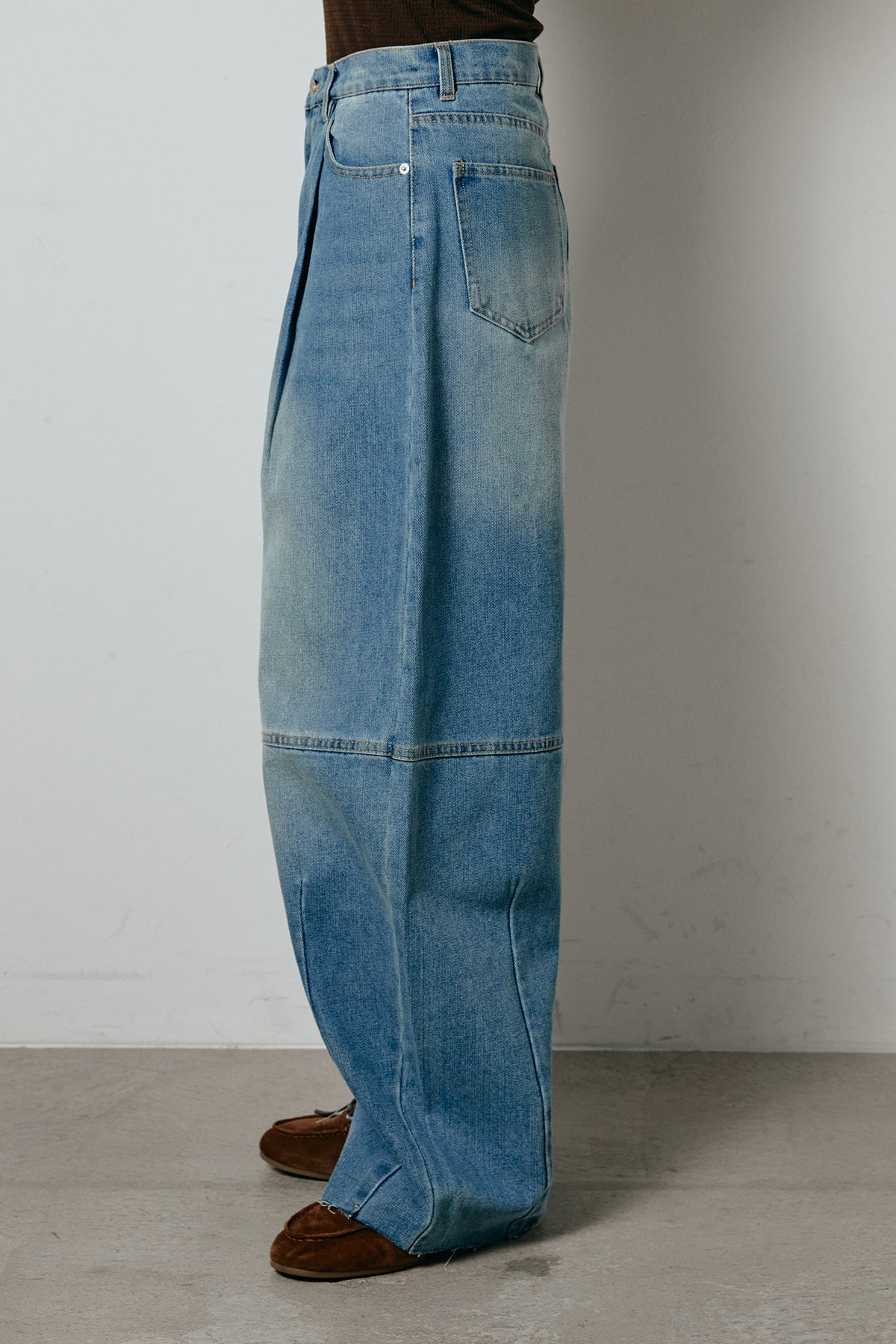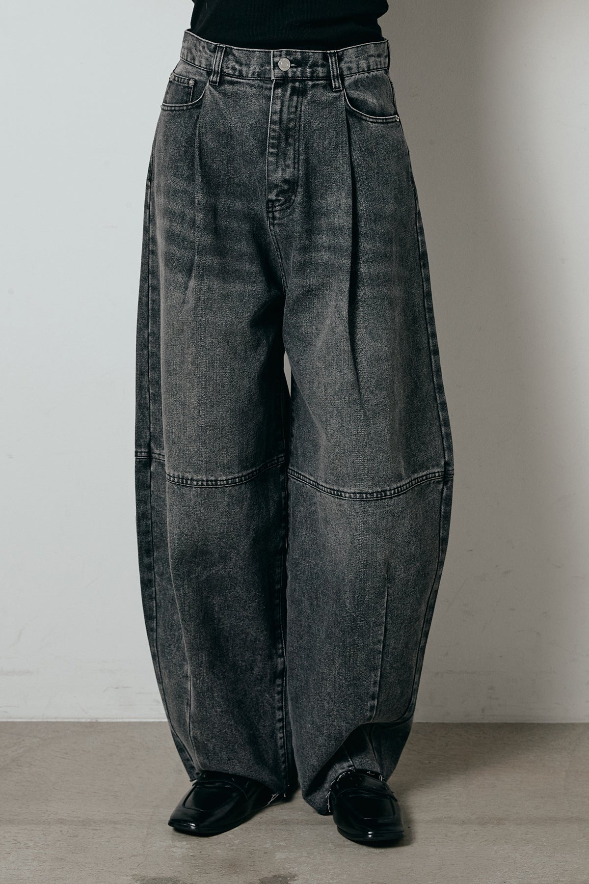 表情のある加工デニムを使用し、タックで立体感をもたせたコクーンシルエットのワイドパンツ。丸みのあるフォルムが存在感を引き立てつつ、太さの中にもすっきり見えるバランスに仕上げています。腰まわりはゆったりしながらも、縦に落ちるラインがスタイルをきれいに見せ、ラフなトップスを合わせるだけでこなれたムードに。カジュアルスタイルの主役になる一本です。
