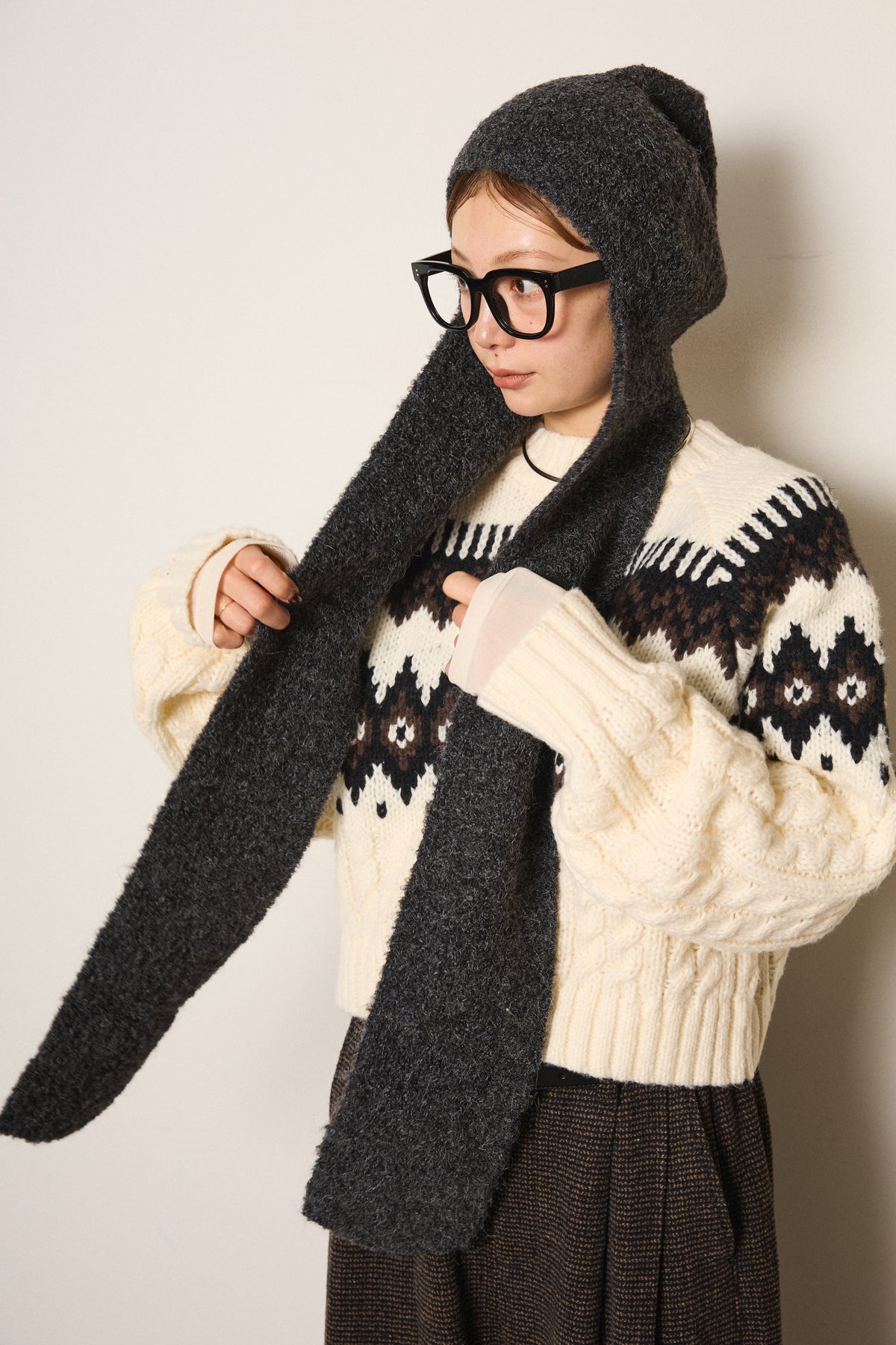 耳まで包み込むブークレー素材のイヤーフラップビーニー。ふっくらとした編地が軽やかで、柔らかな被り心地が魅力です。長めのフラップは垂らしても結んでも形が決まり、スタイリングのアクセントとして存在感を発揮。防寒性とデザイン性を兼ね備えたアイテムで、コーデに遊び心を添えたい日におすすめです。
