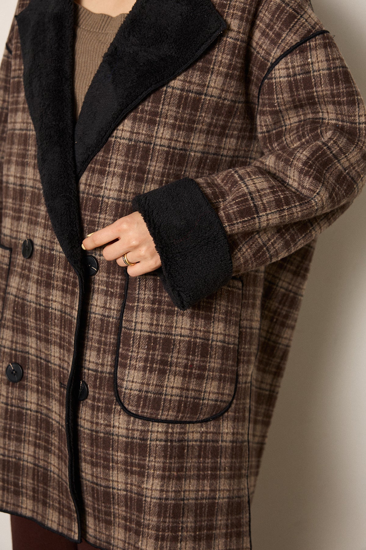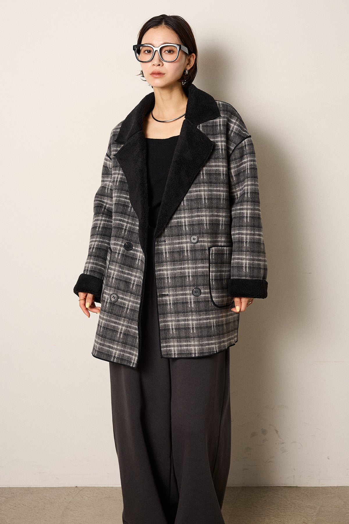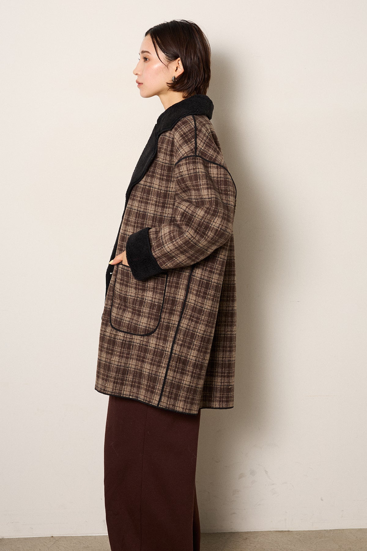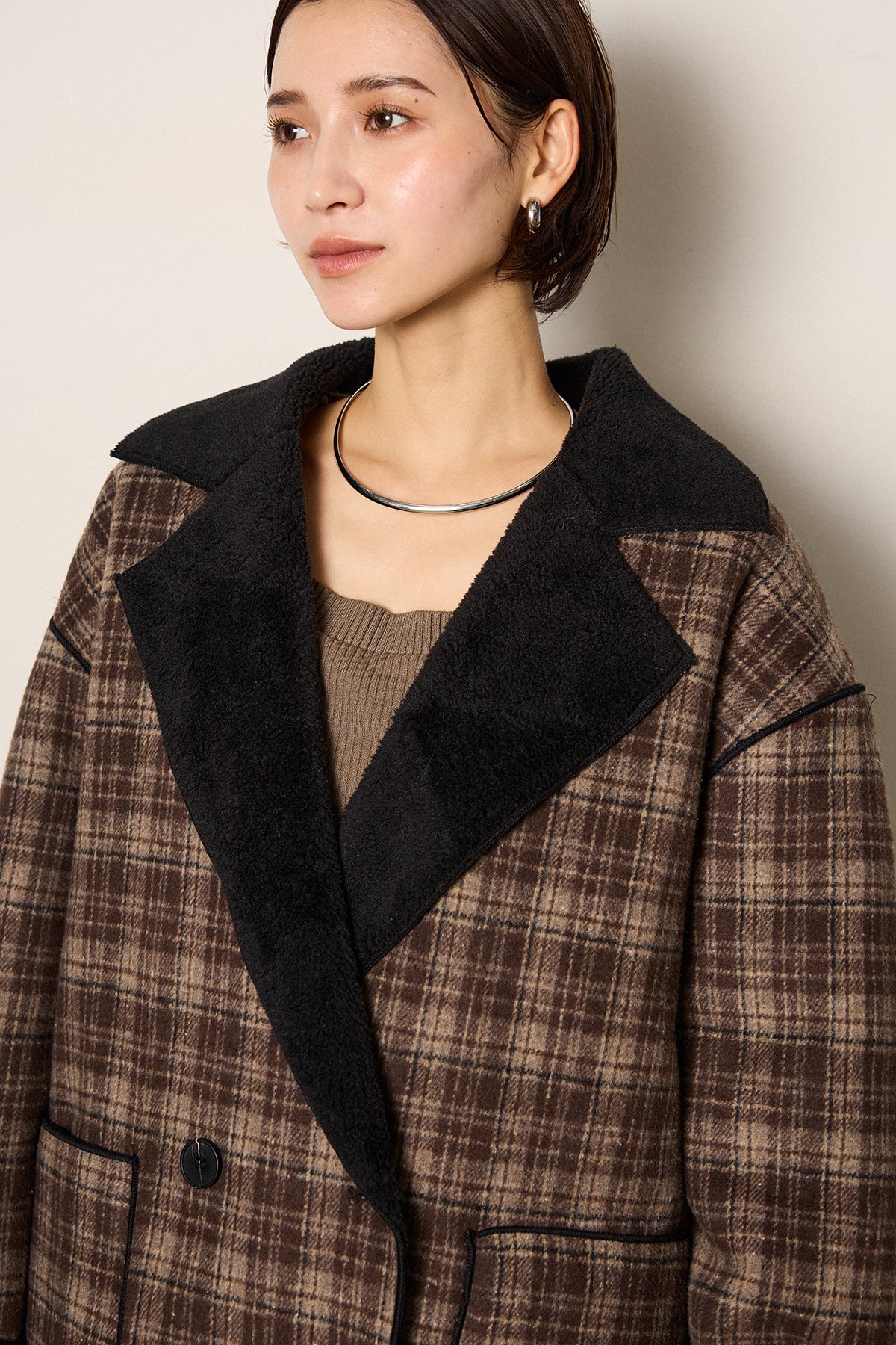 裏地にボアを配したタータンチェックのミディアムコート。ふっくらとした襟元と袖口の切り替えが程よいアクセントになり、羽織るだけで季節感のあるスタイルに仕上がります。ゆとりのあるシルエットで厚手のトップスにも重ねやすく、デイリーに使いやすい丈感。落ち着いた柄にボアの質感が映える、暖かみのある一枚です。