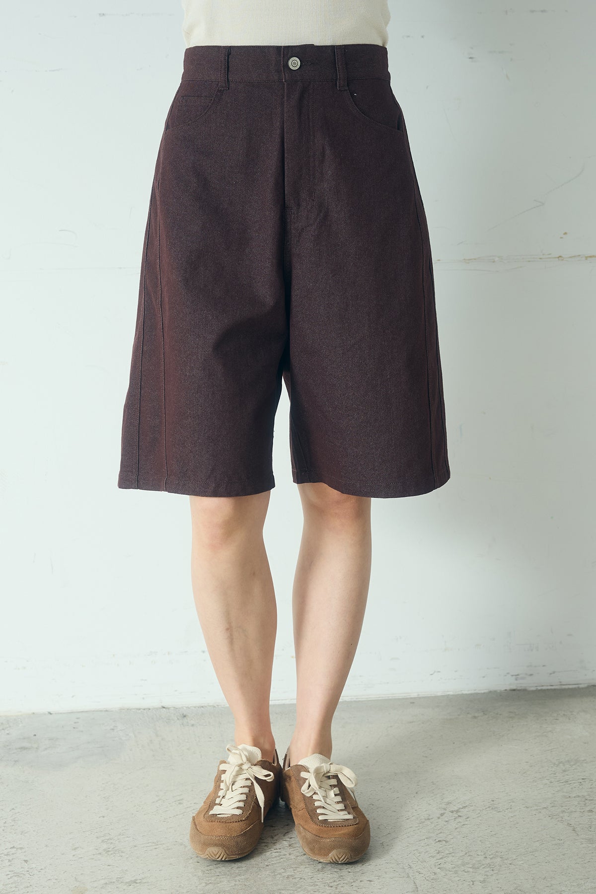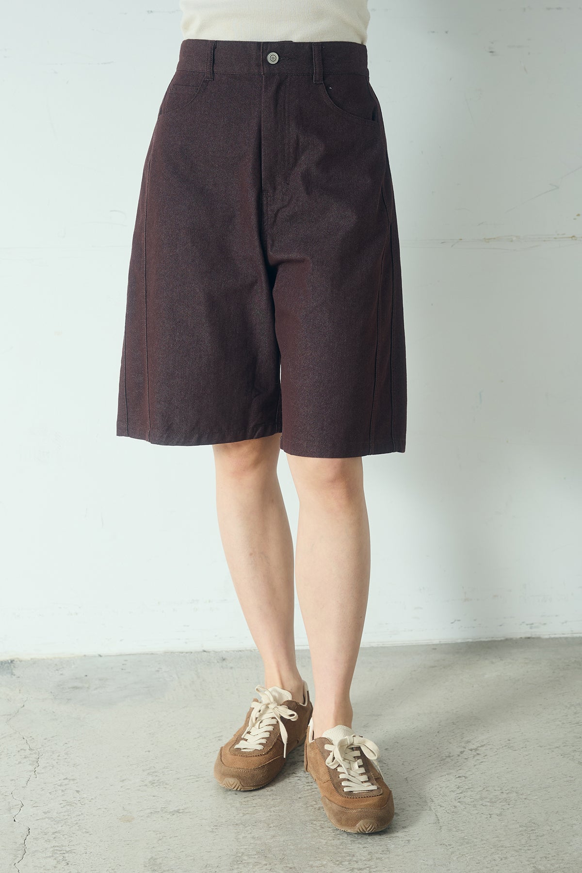 程よいラフさが魅力の、デニムハーフパンツ。 カジュアルながらも大人っぽく着こなせる絶妙な丈感で、バランスの取りやすい一枚に仕上げました。 やわらかさのあるデニム素材が快適なはき心地を実現。ゆとりのあるシルエットが脚のラインを拾いにくく、すっきりとした印象を演出します。ウエストまわりはすっきりと設計し、トップスインもきれいに決まるデザインに。 Tシャツやタンクトップと合わせたヘルシーなカジュアルスタイルはもちろん、ジャケットやシャツを羽織ったきれいめミックスコーデにもおすすめ。シーズンムードを高めてくれる、着回し力抜群のアイテムです。