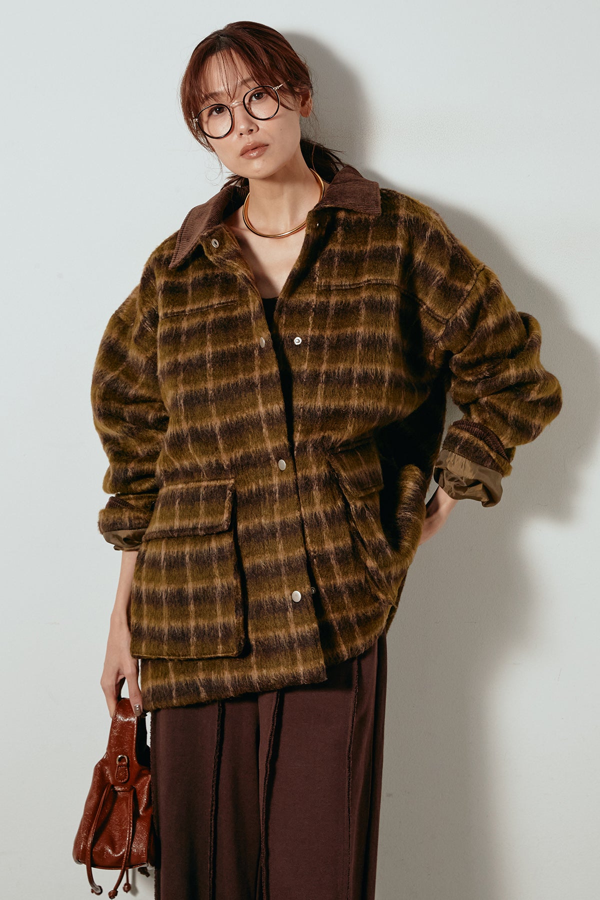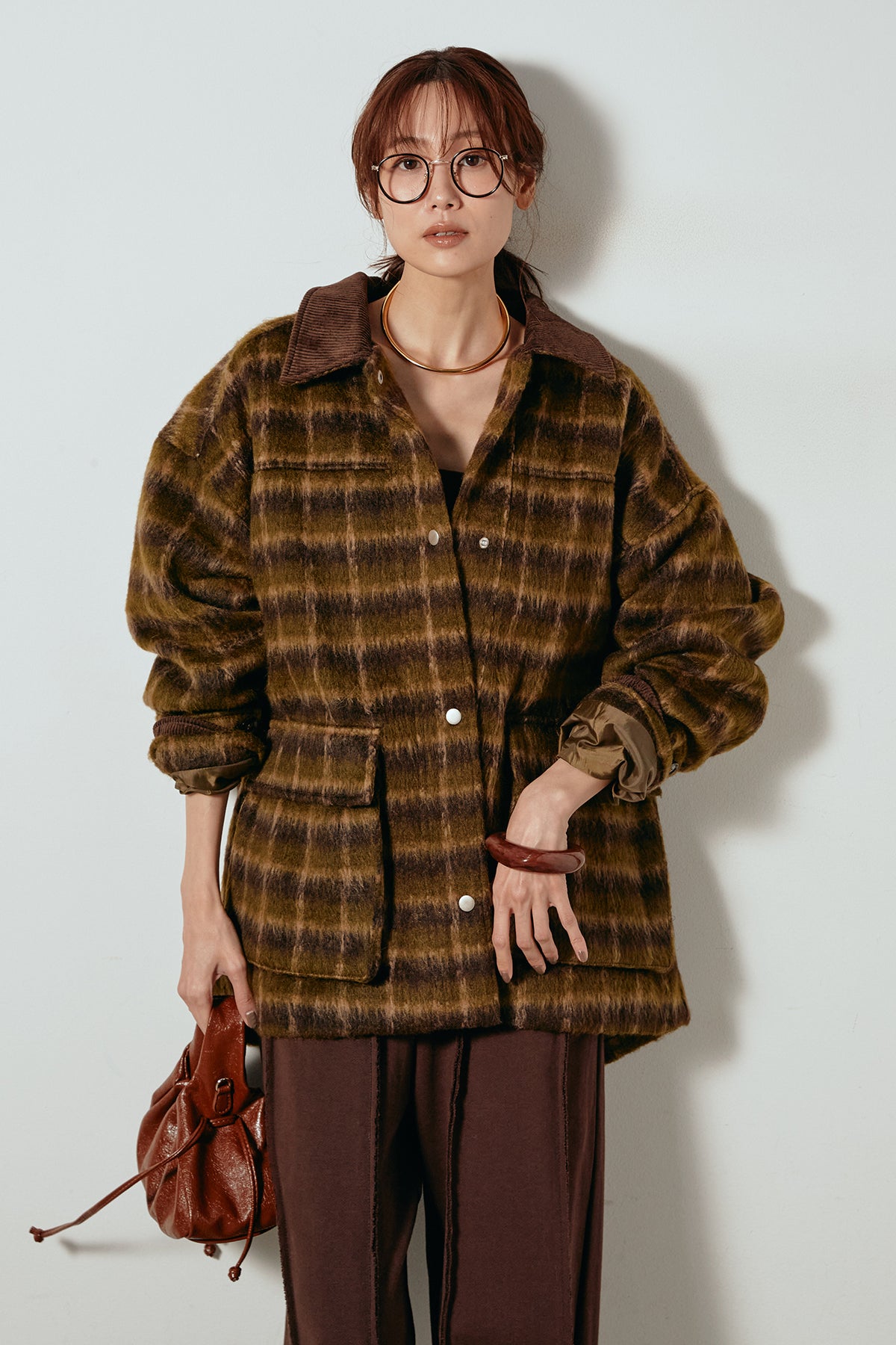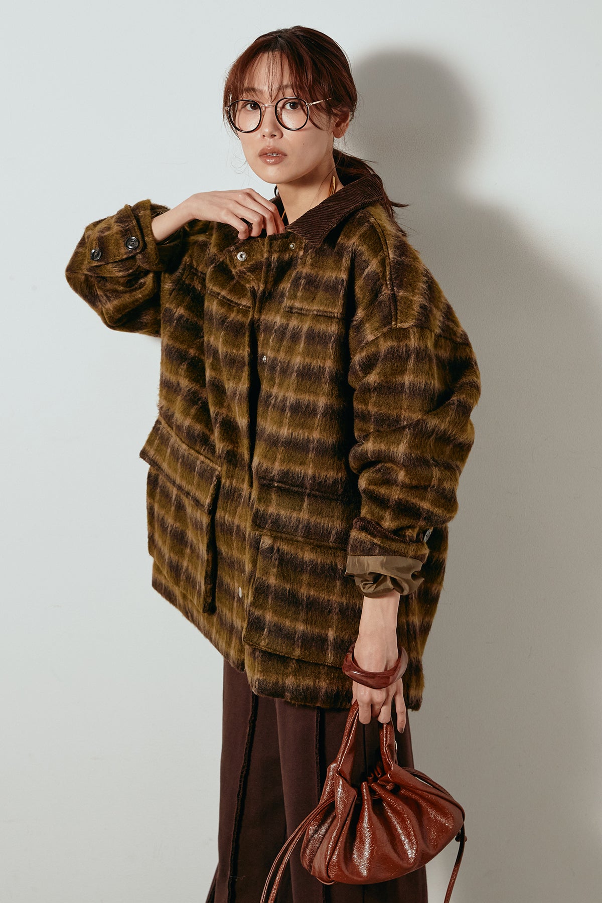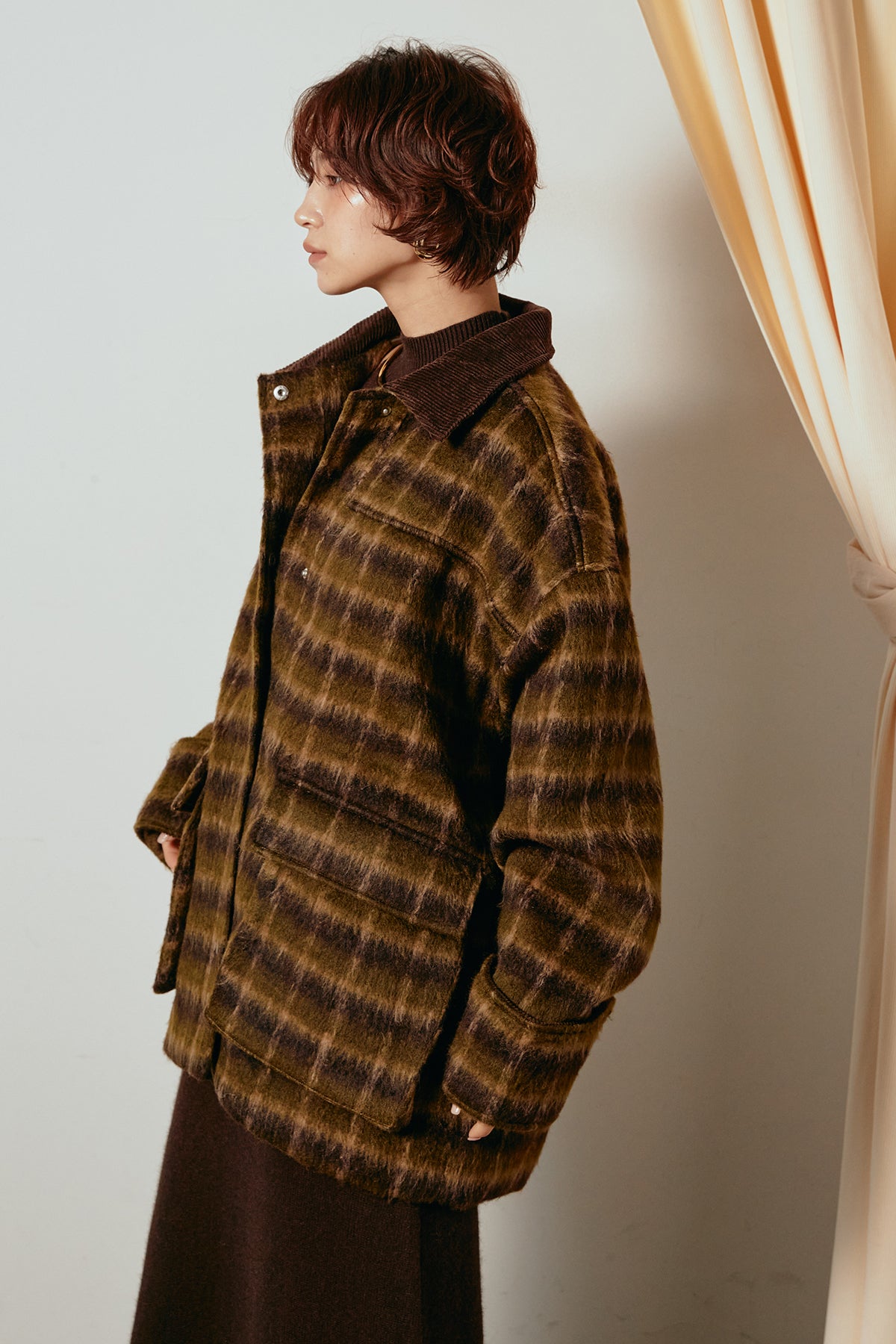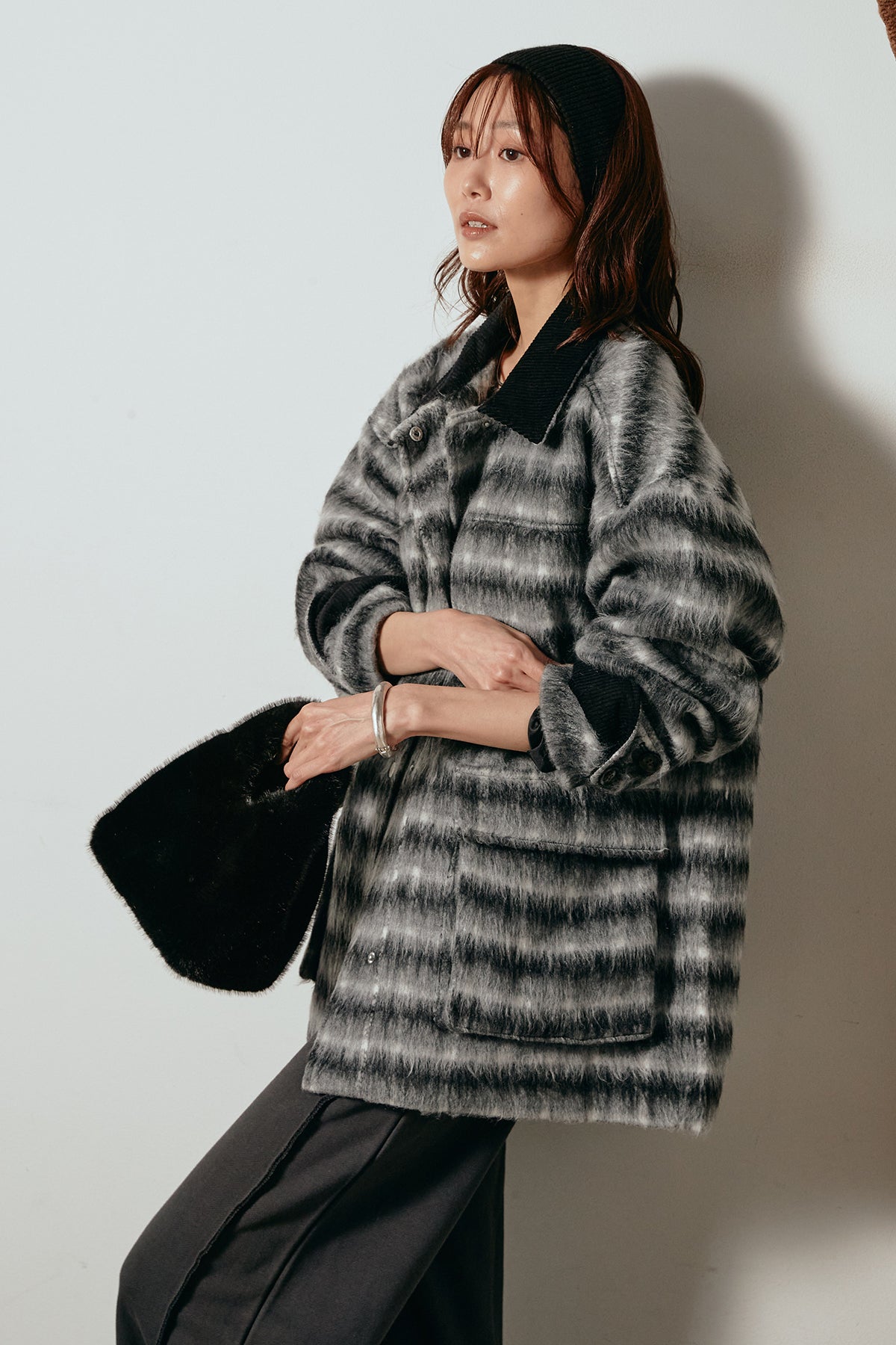 柔らかなシャギー素材で仕立てたチェック柄のミドルカバーオール。温かみのある風合いと程よいボリューム感が魅力です。ゆったりとしたシルエットで中に厚手のニットも重ねやすく、季節の変わり目にも活躍。ヒップが隠れるミドル丈でバランスが取りやすく、デイリーにもお出かけにもぴったりな一着です。