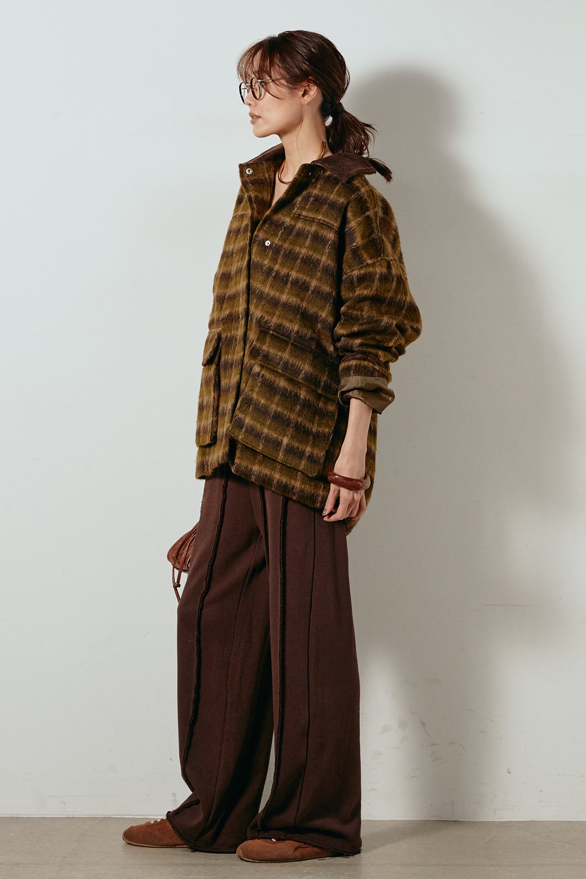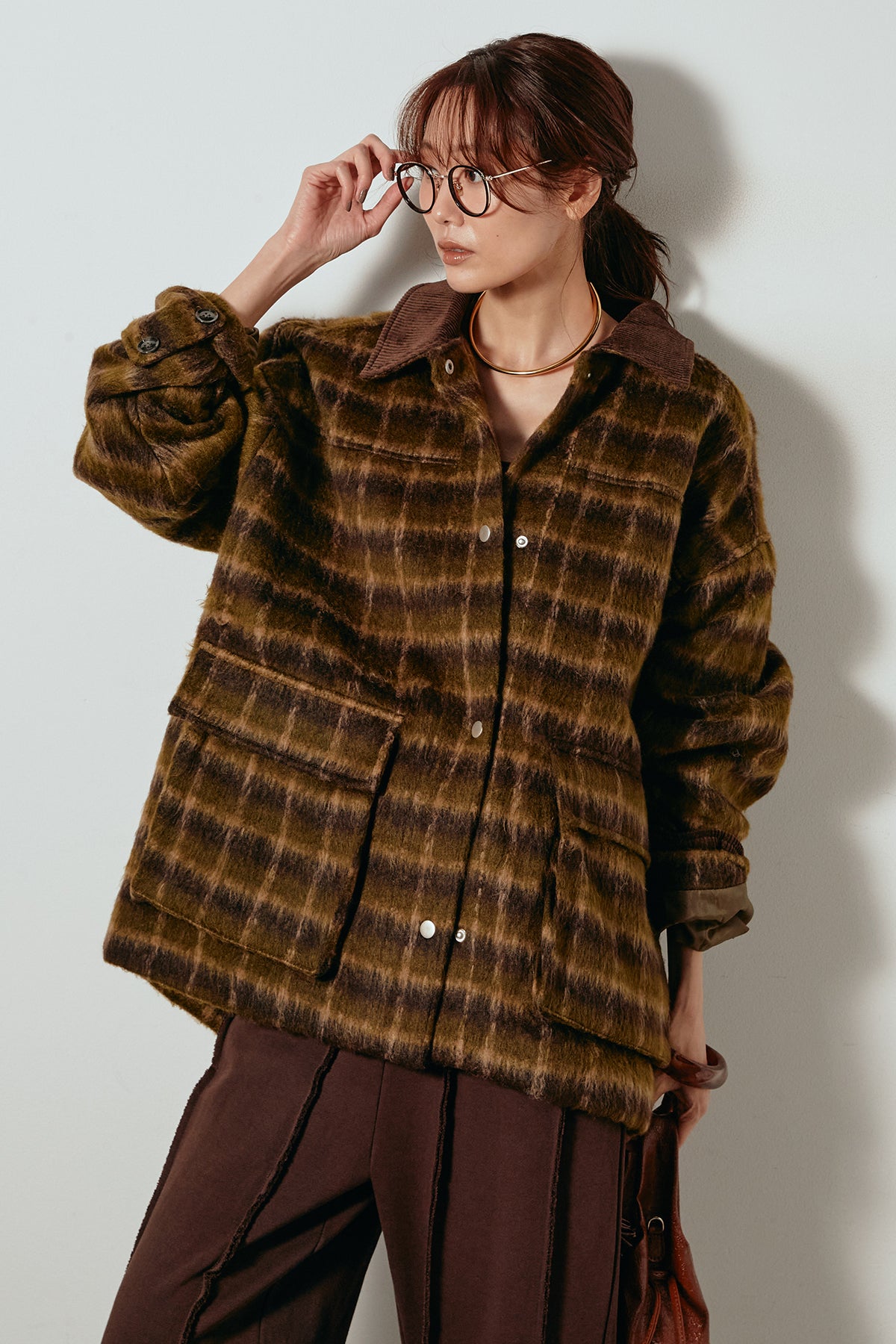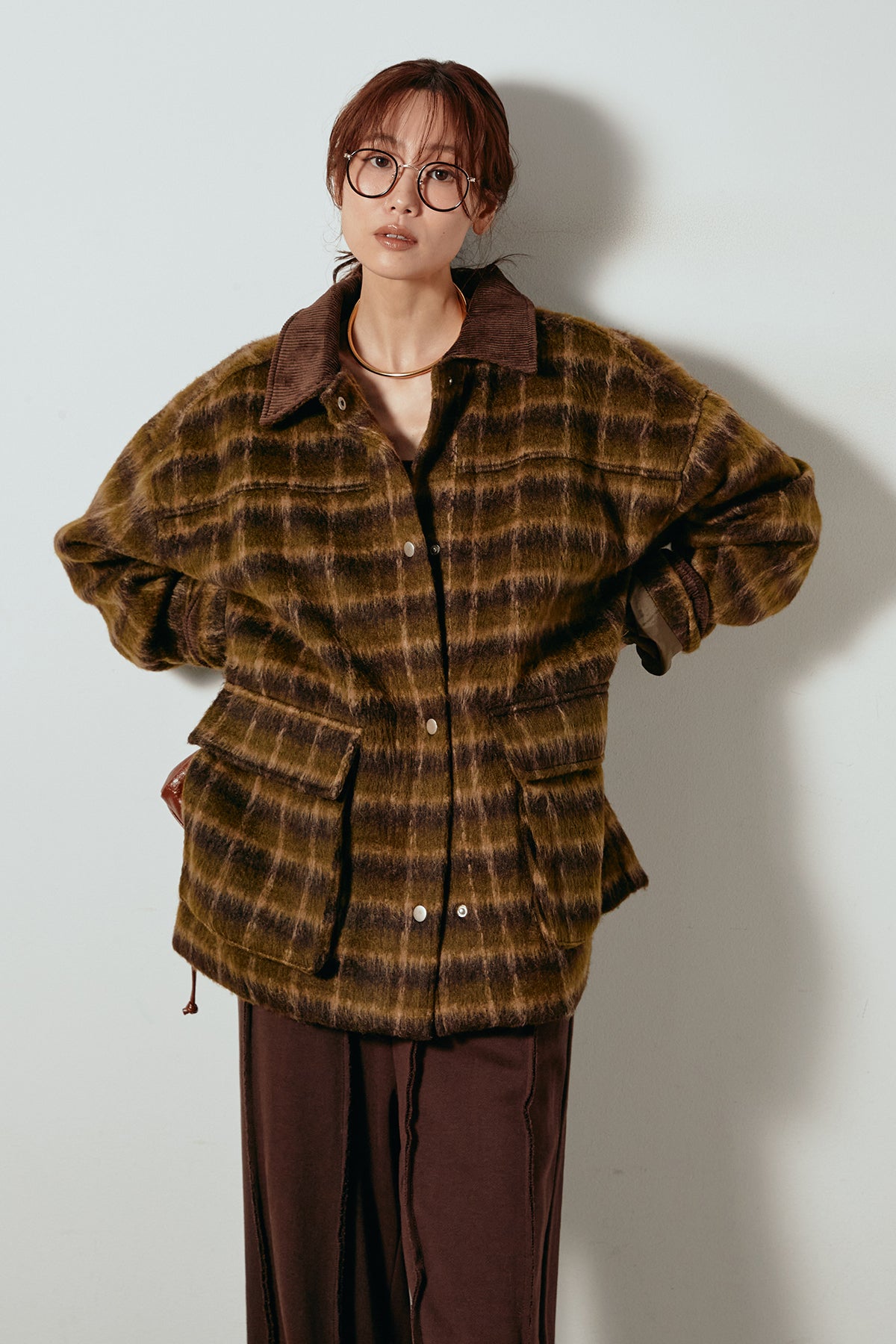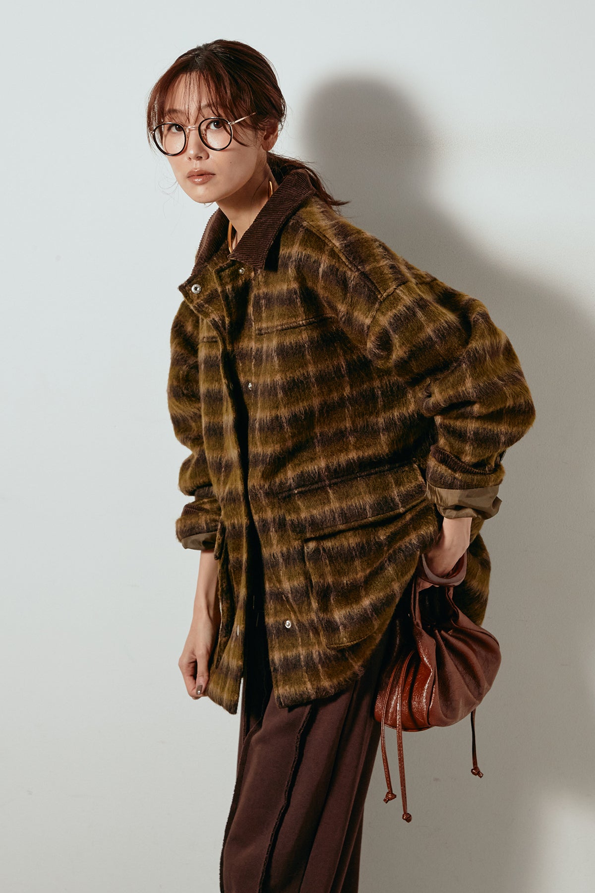 柔らかなシャギー素材で仕立てたチェック柄のミドルカバーオール。温かみのある風合いと程よいボリューム感が魅力です。ゆったりとしたシルエットで中に厚手のニットも重ねやすく、季節の変わり目にも活躍。ヒップが隠れるミドル丈でバランスが取りやすく、デイリーにもお出かけにもぴったりな一着です。