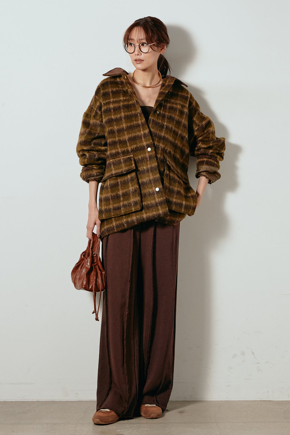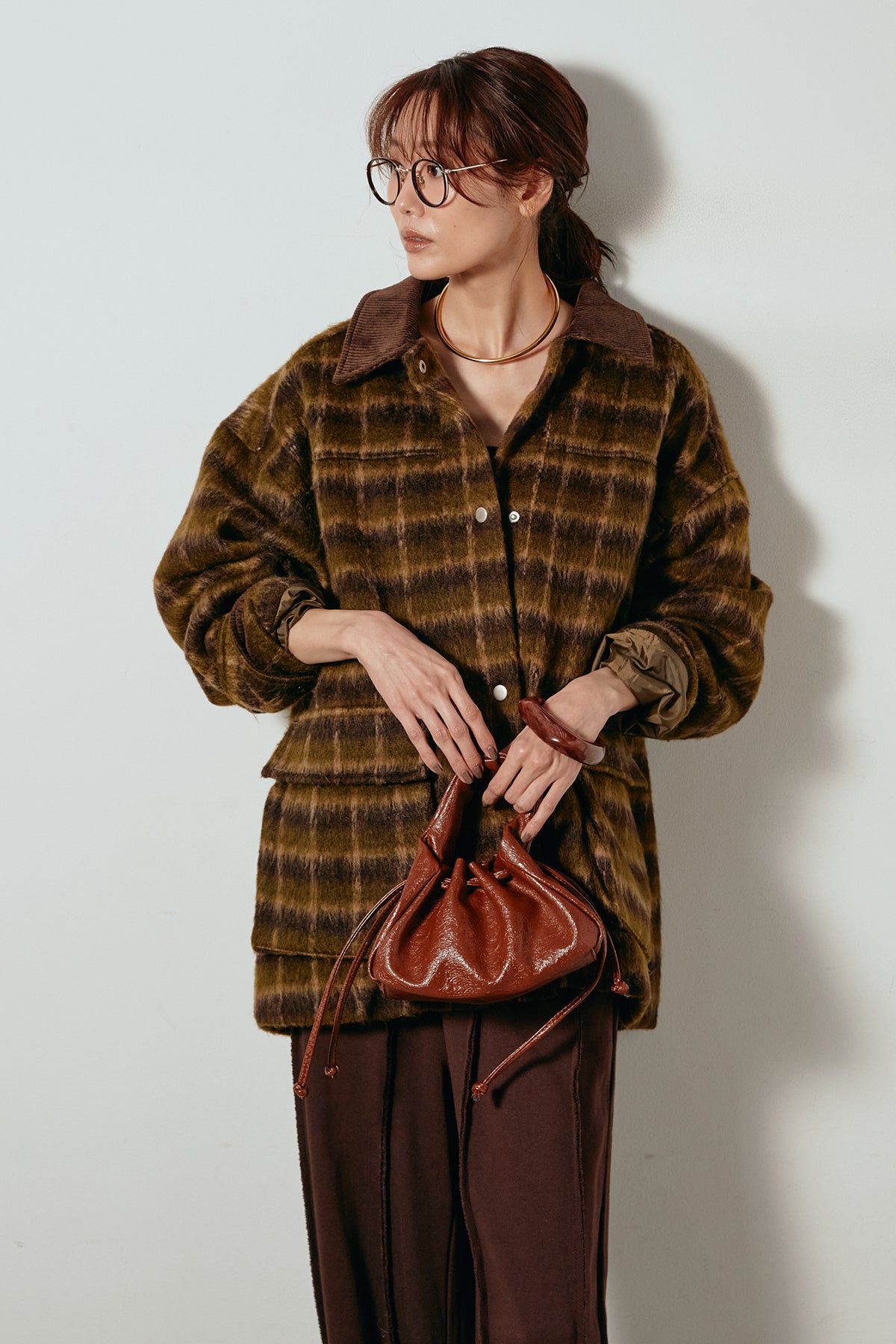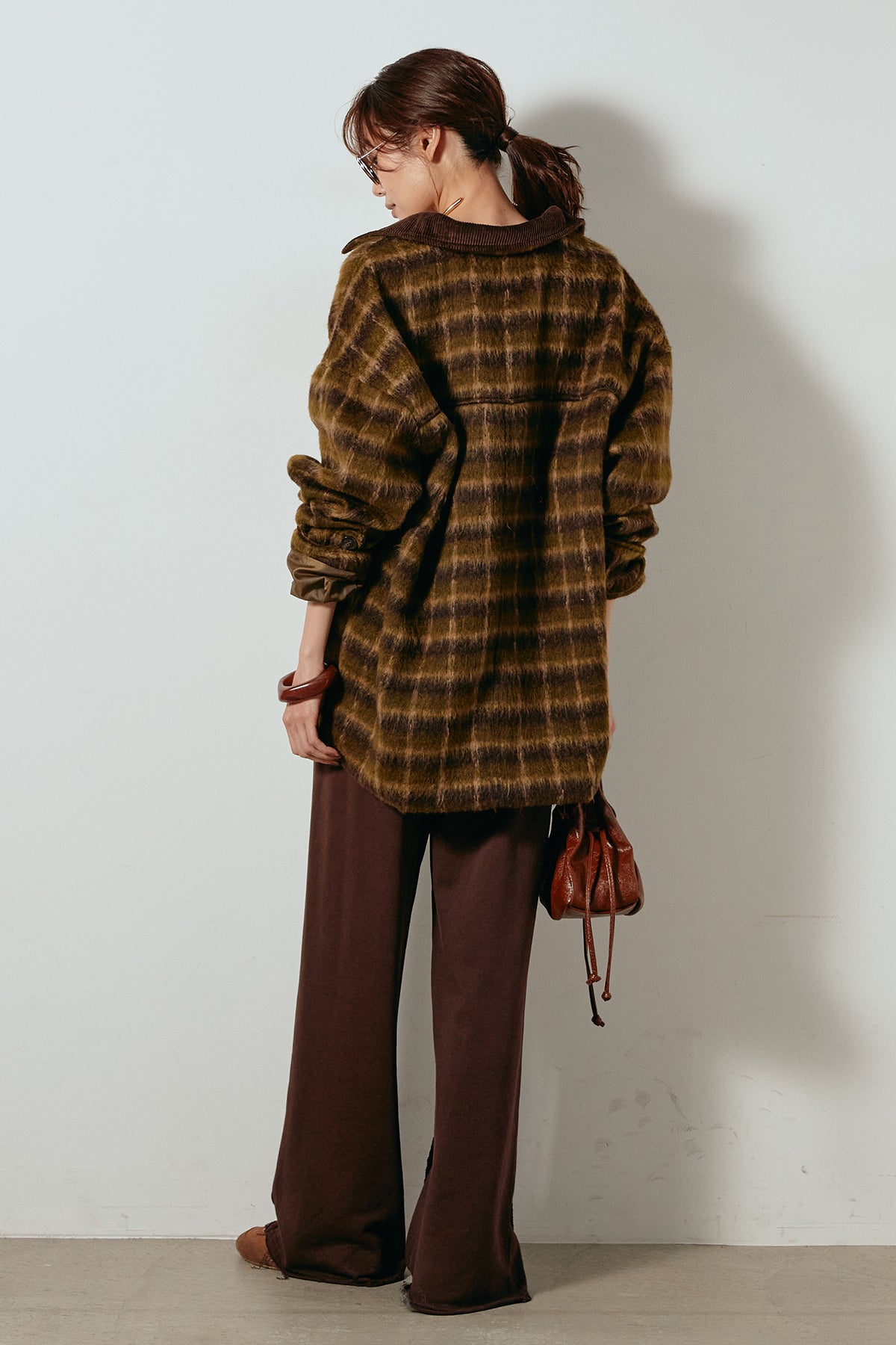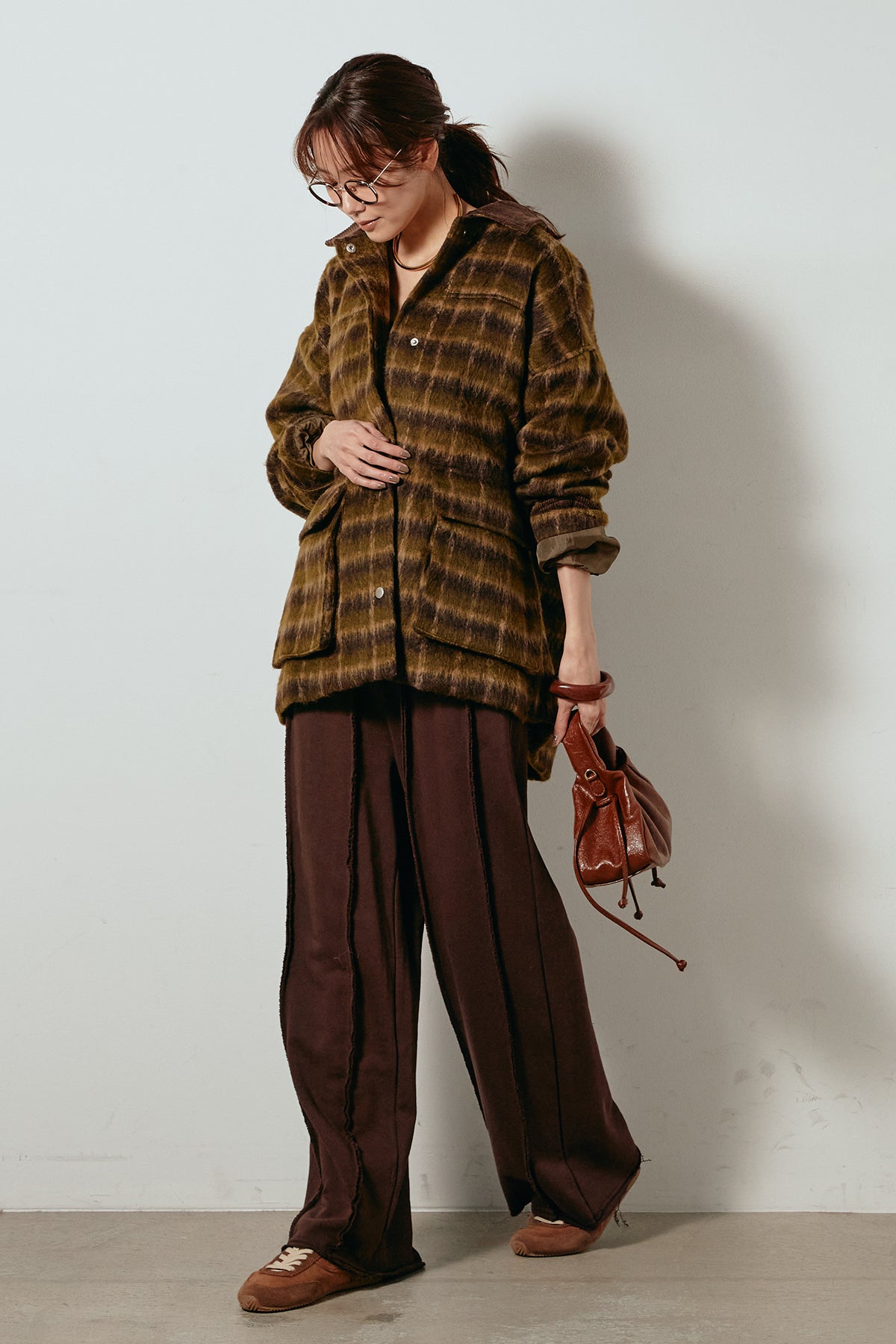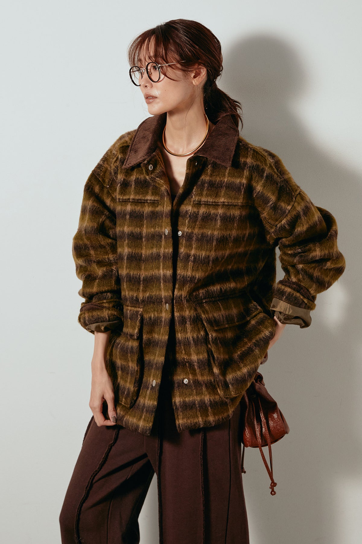 柔らかなシャギー素材で仕立てたチェック柄のミドルカバーオール。温かみのある風合いと程よいボリューム感が魅力です。ゆったりとしたシルエットで中に厚手のニットも重ねやすく、季節の変わり目にも活躍。ヒップが隠れるミドル丈でバランスが取りやすく、デイリーにもお出かけにもぴったりな一着です。