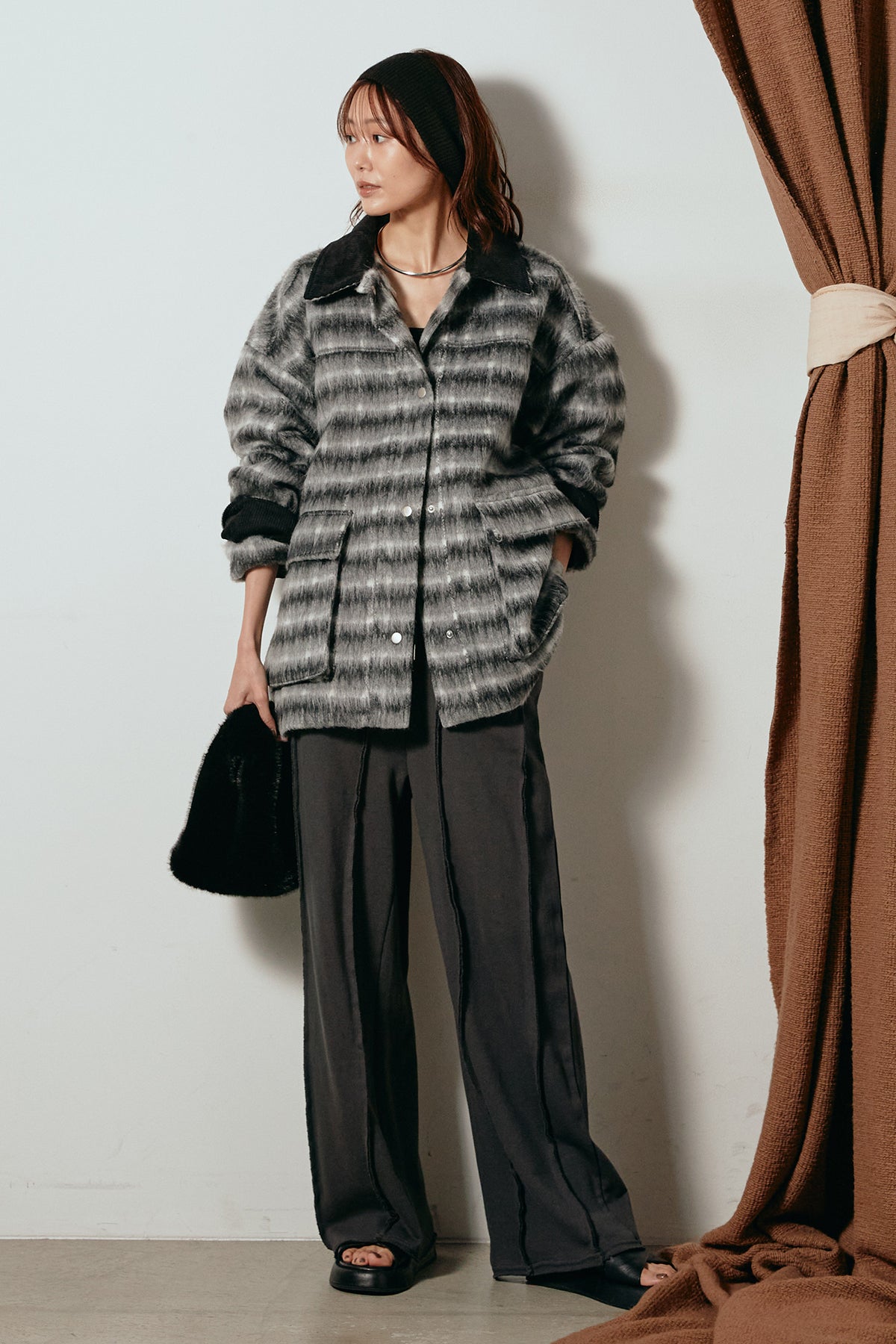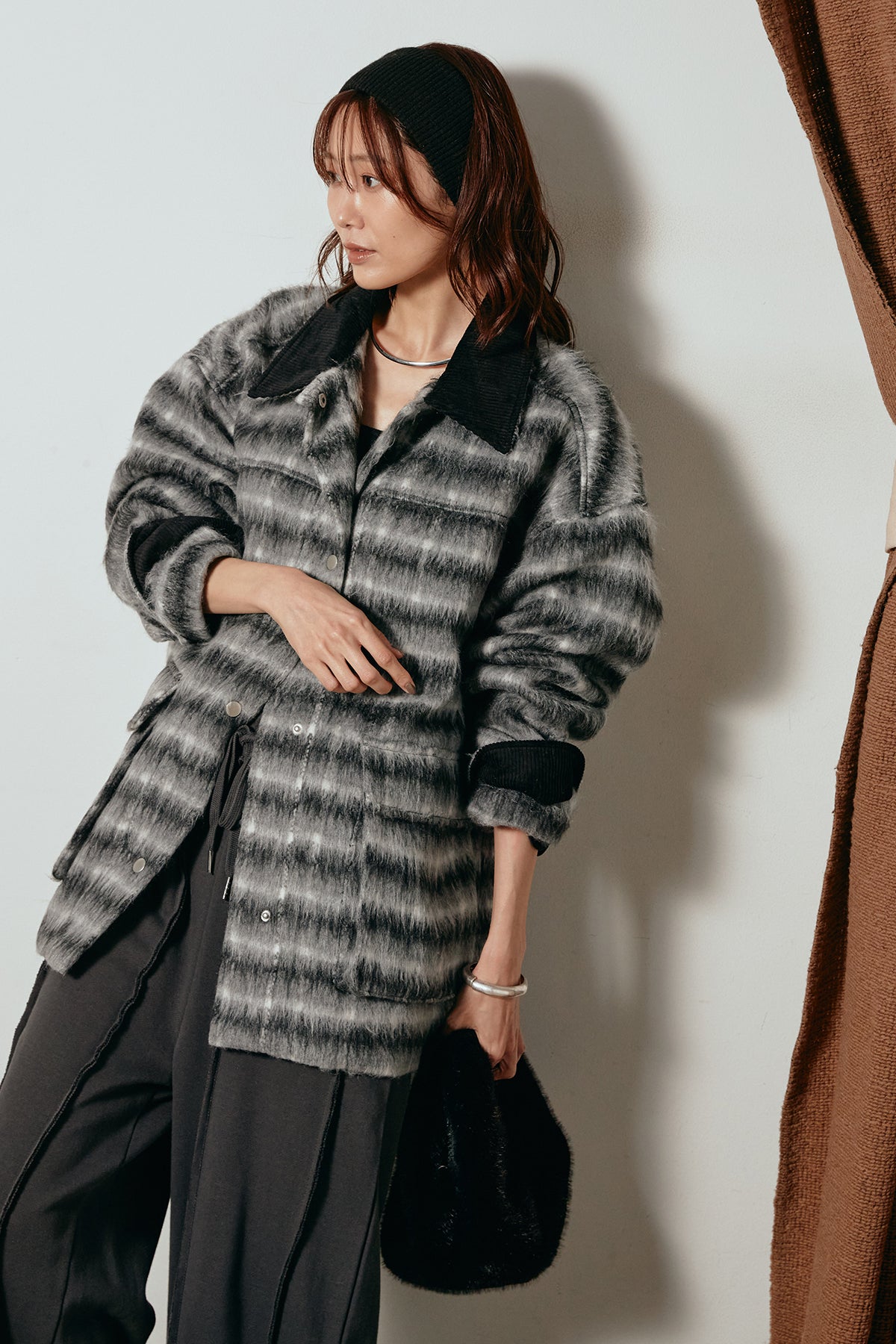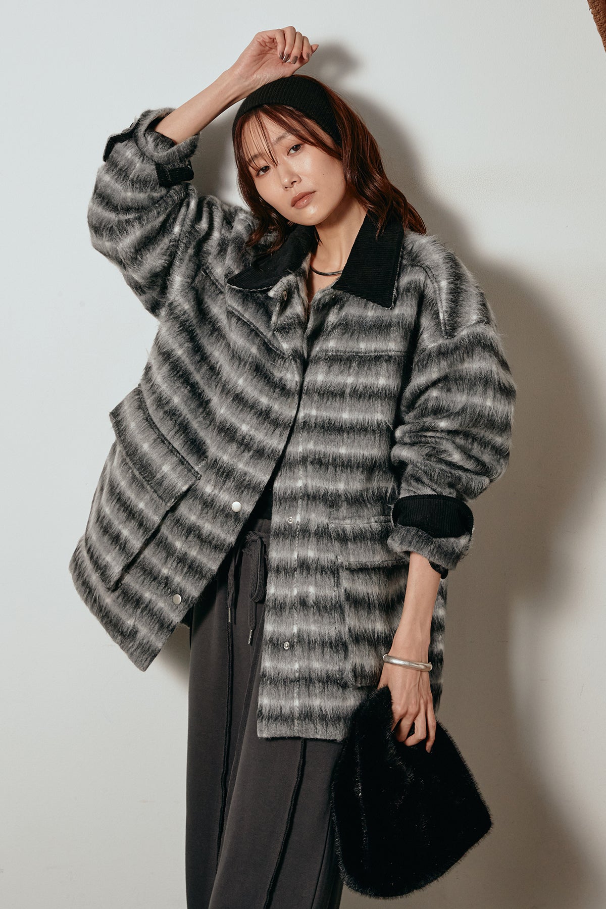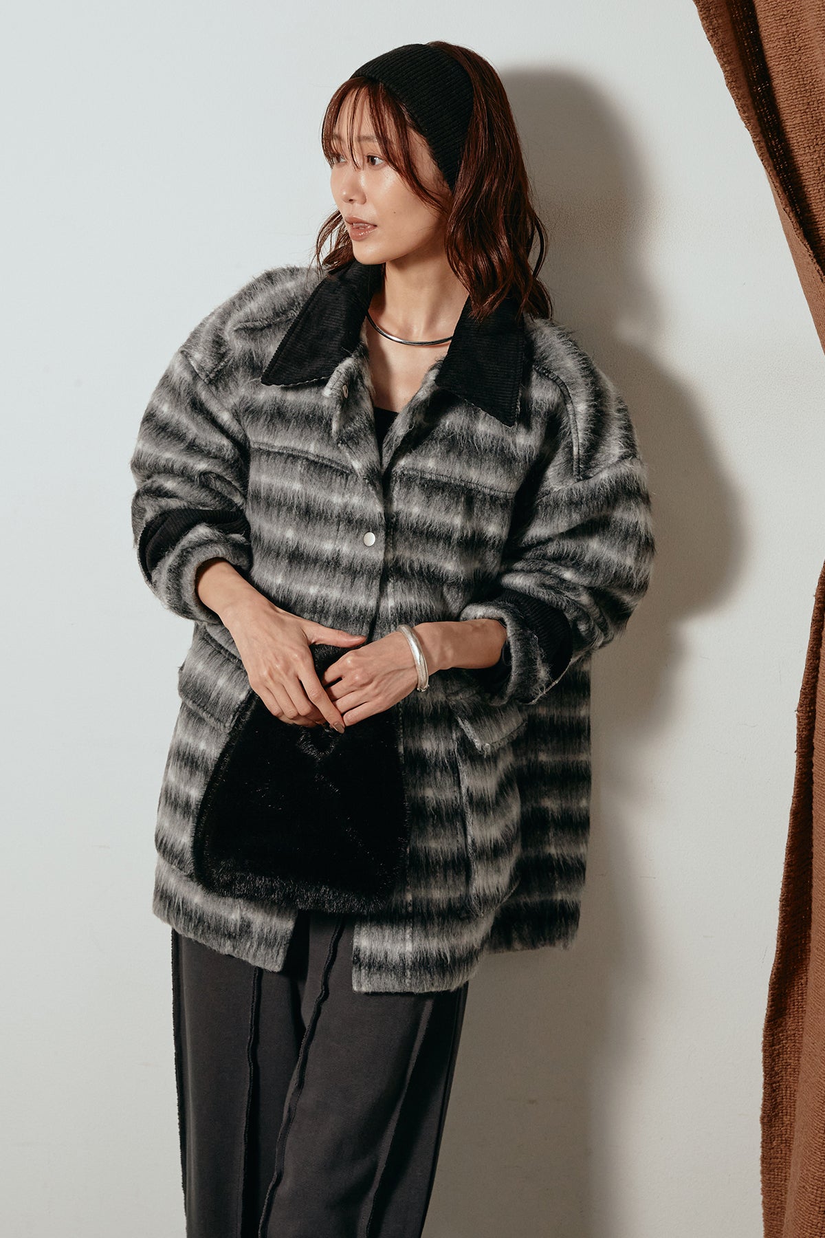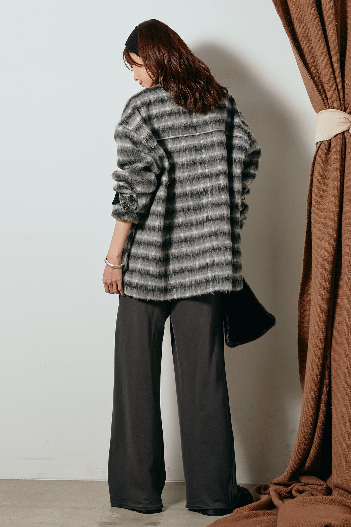 柔らかなシャギー素材で仕立てたチェック柄のミドルカバーオール。温かみのある風合いと程よいボリューム感が魅力です。ゆったりとしたシルエットで中に厚手のニットも重ねやすく、季節の変わり目にも活躍。ヒップが隠れるミドル丈でバランスが取りやすく、デイリーにもお出かけにもぴったりな一着です。