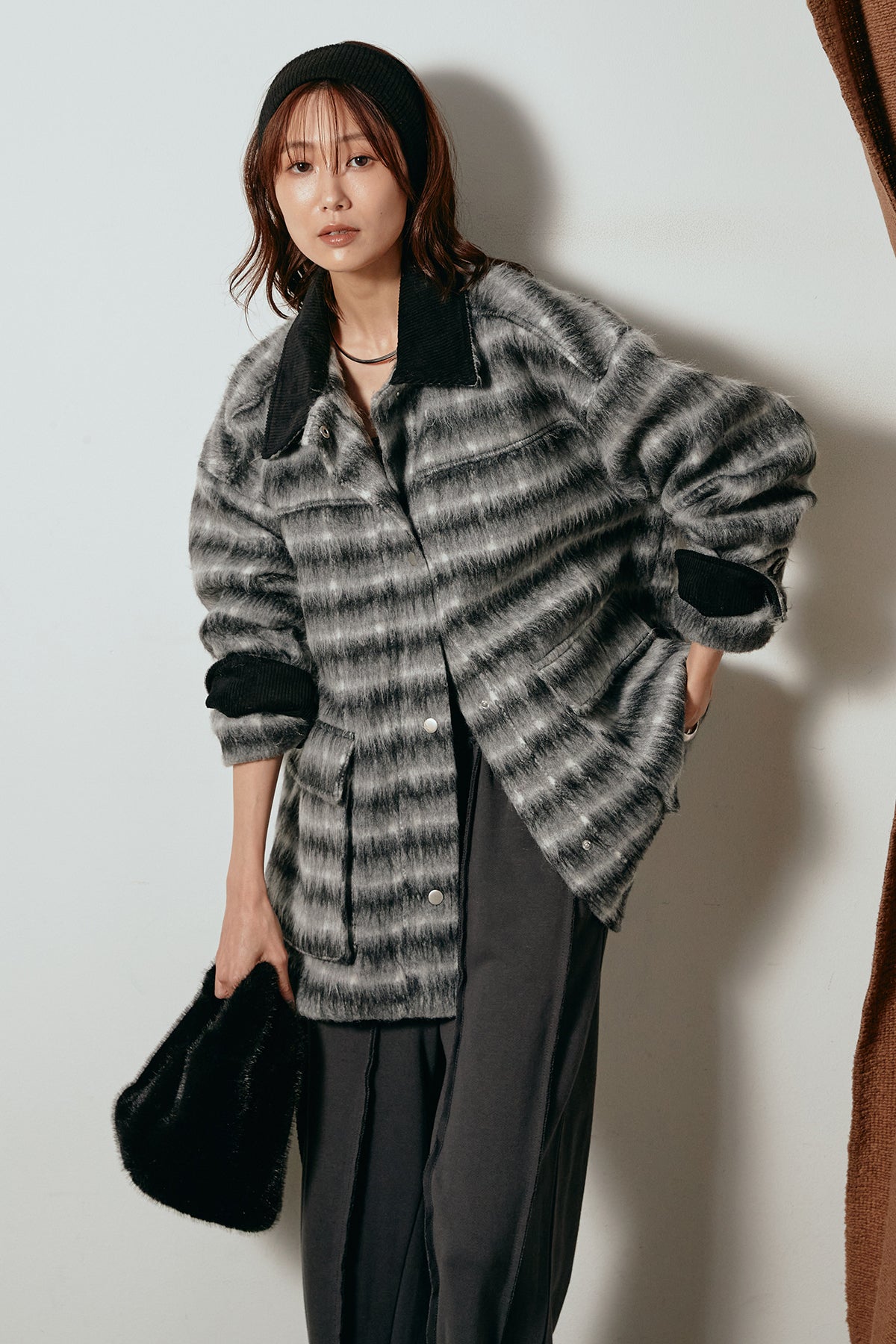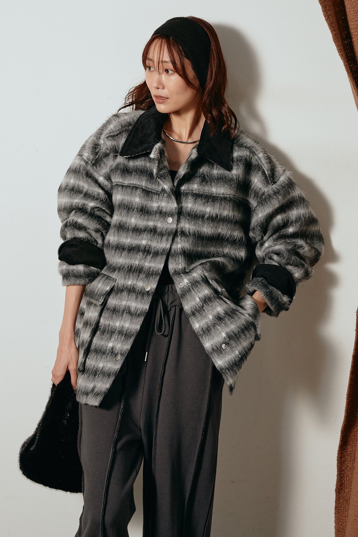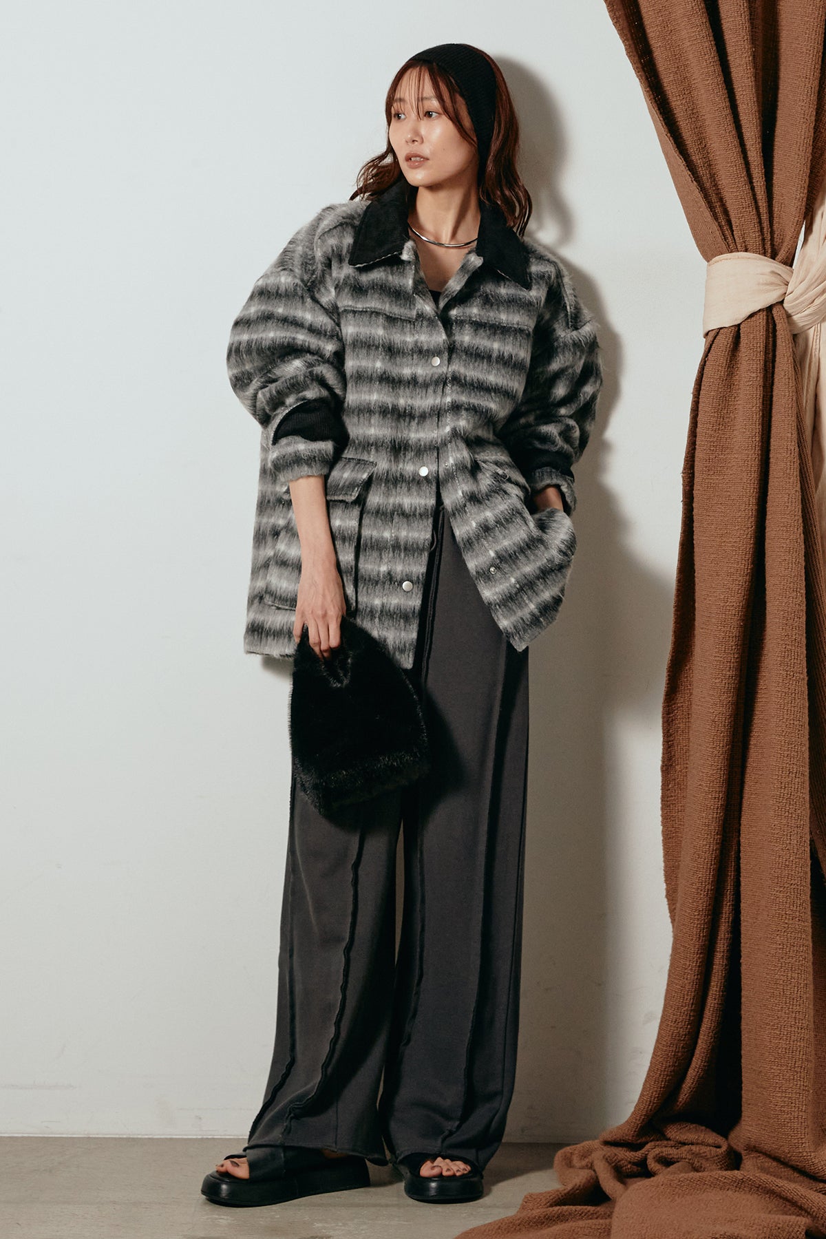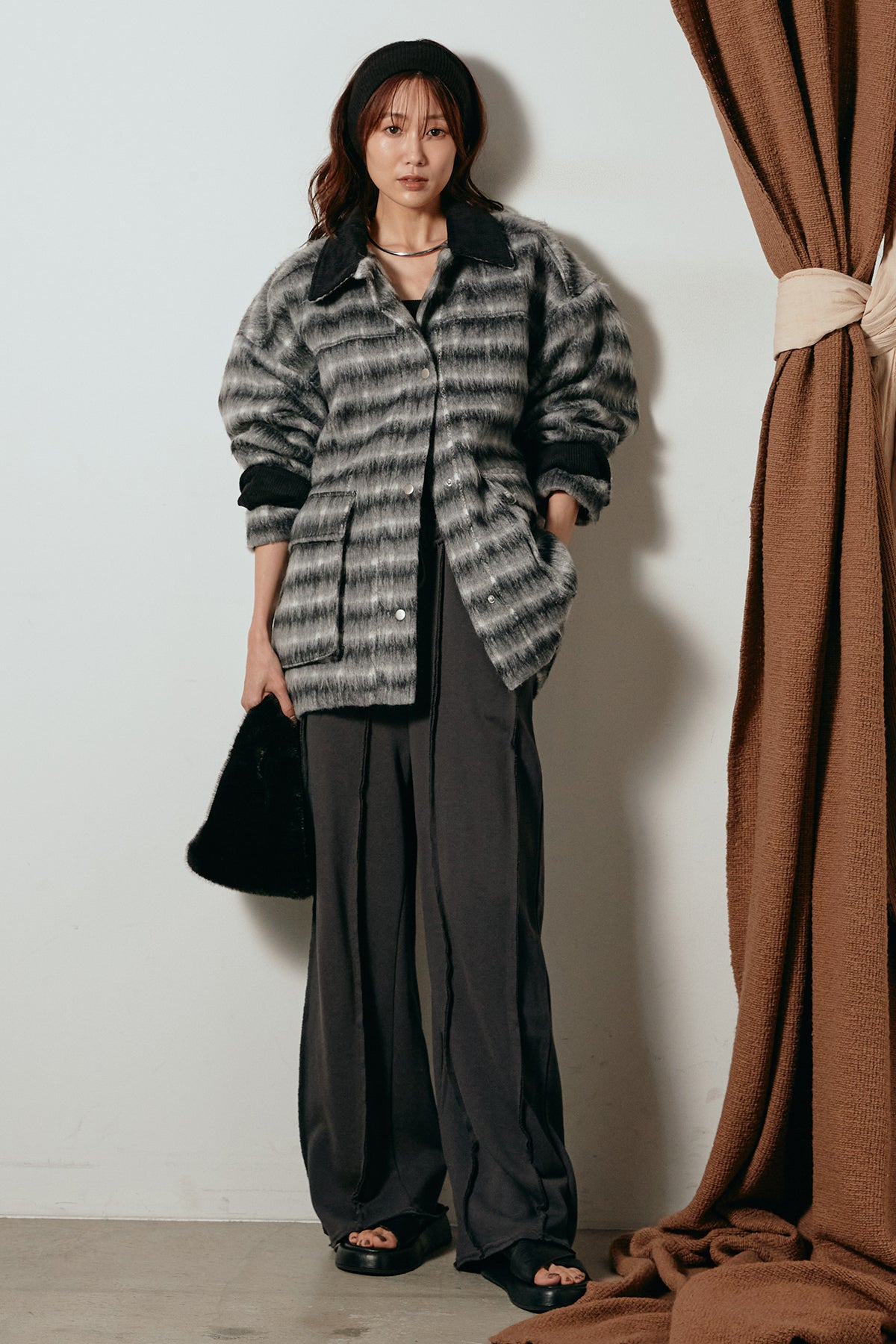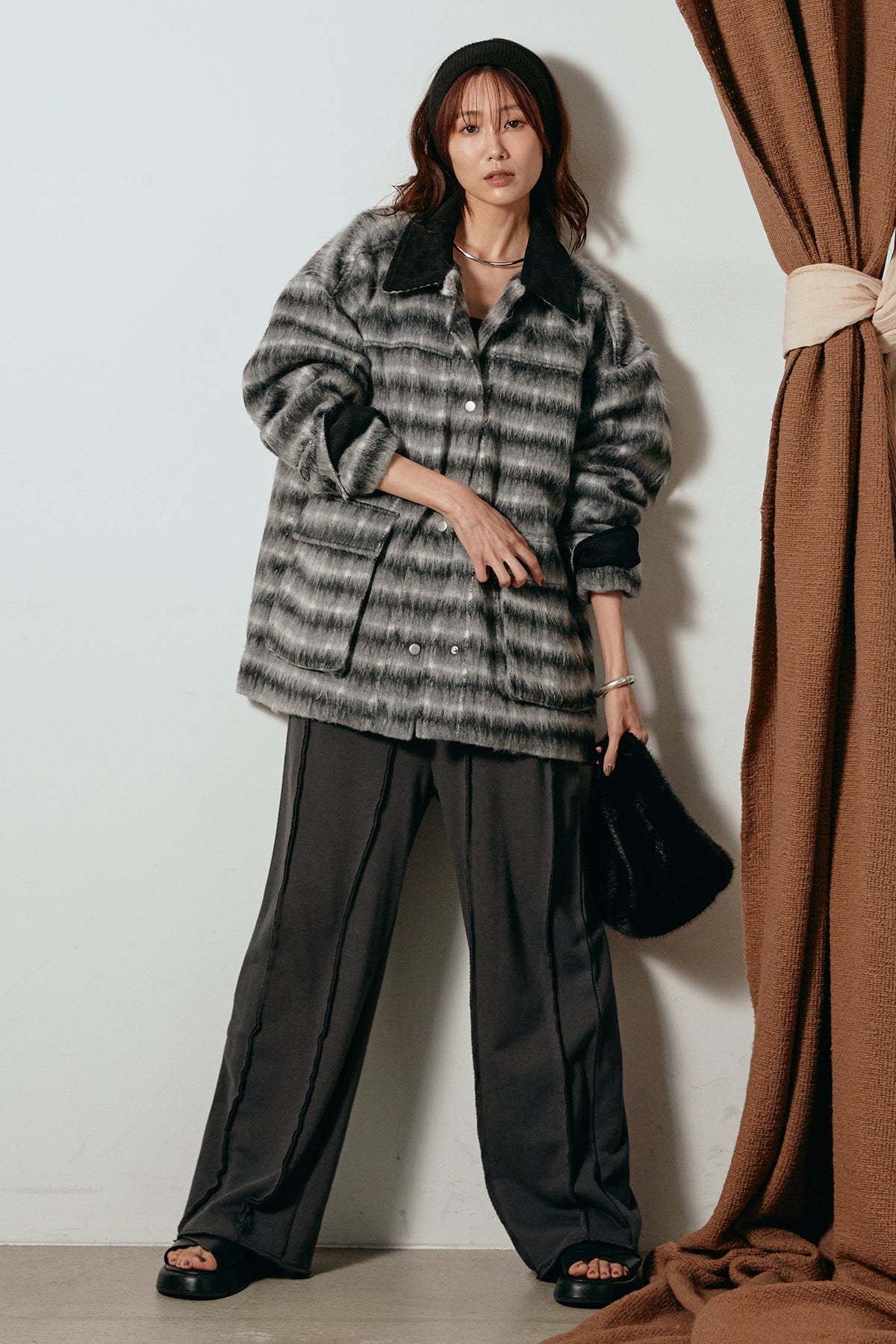 柔らかなシャギー素材で仕立てたチェック柄のミドルカバーオール。温かみのある風合いと程よいボリューム感が魅力です。ゆったりとしたシルエットで中に厚手のニットも重ねやすく、季節の変わり目にも活躍。ヒップが隠れるミドル丈でバランスが取りやすく、デイリーにもお出かけにもぴったりな一着です。