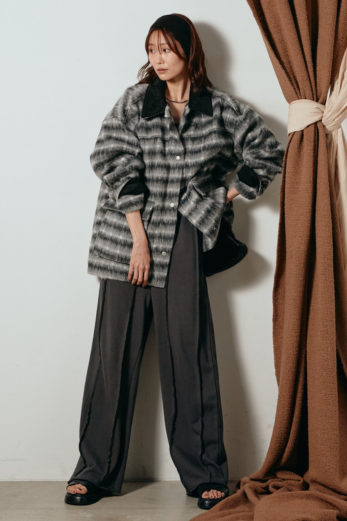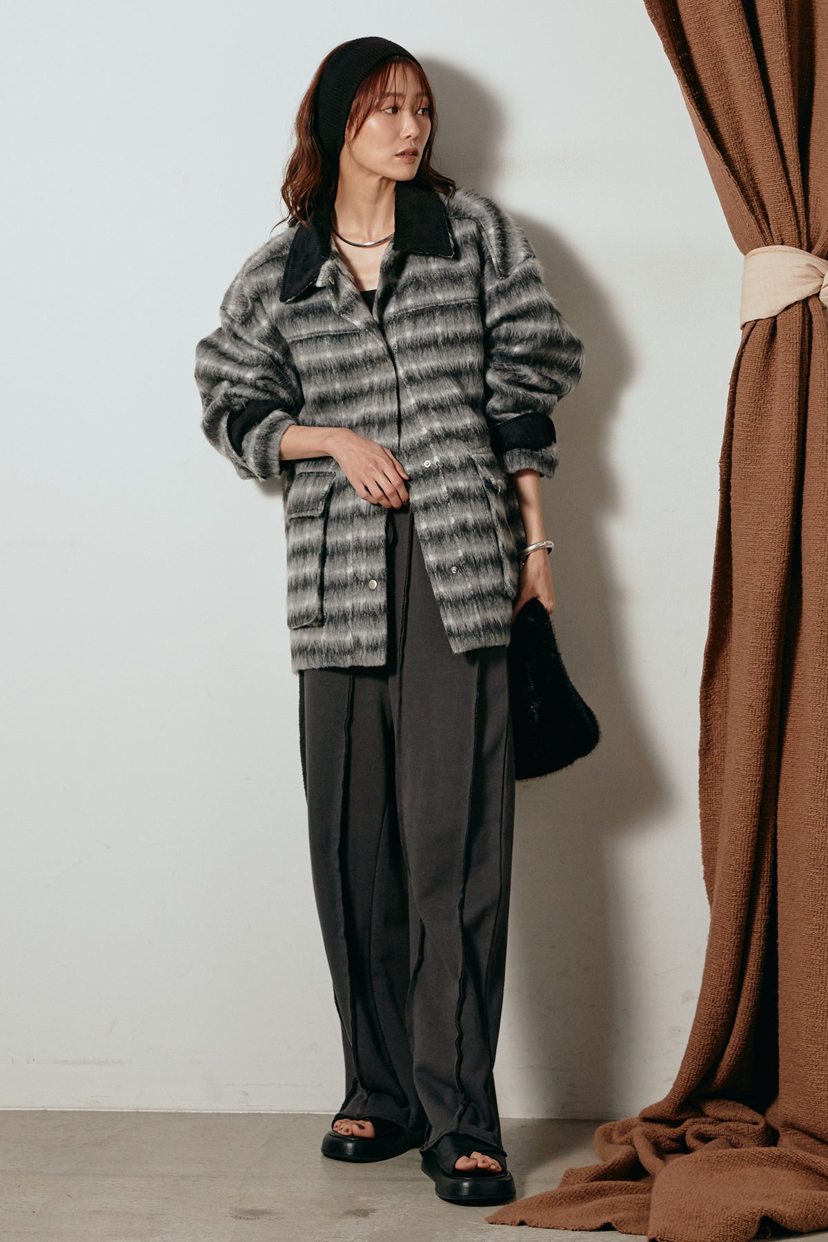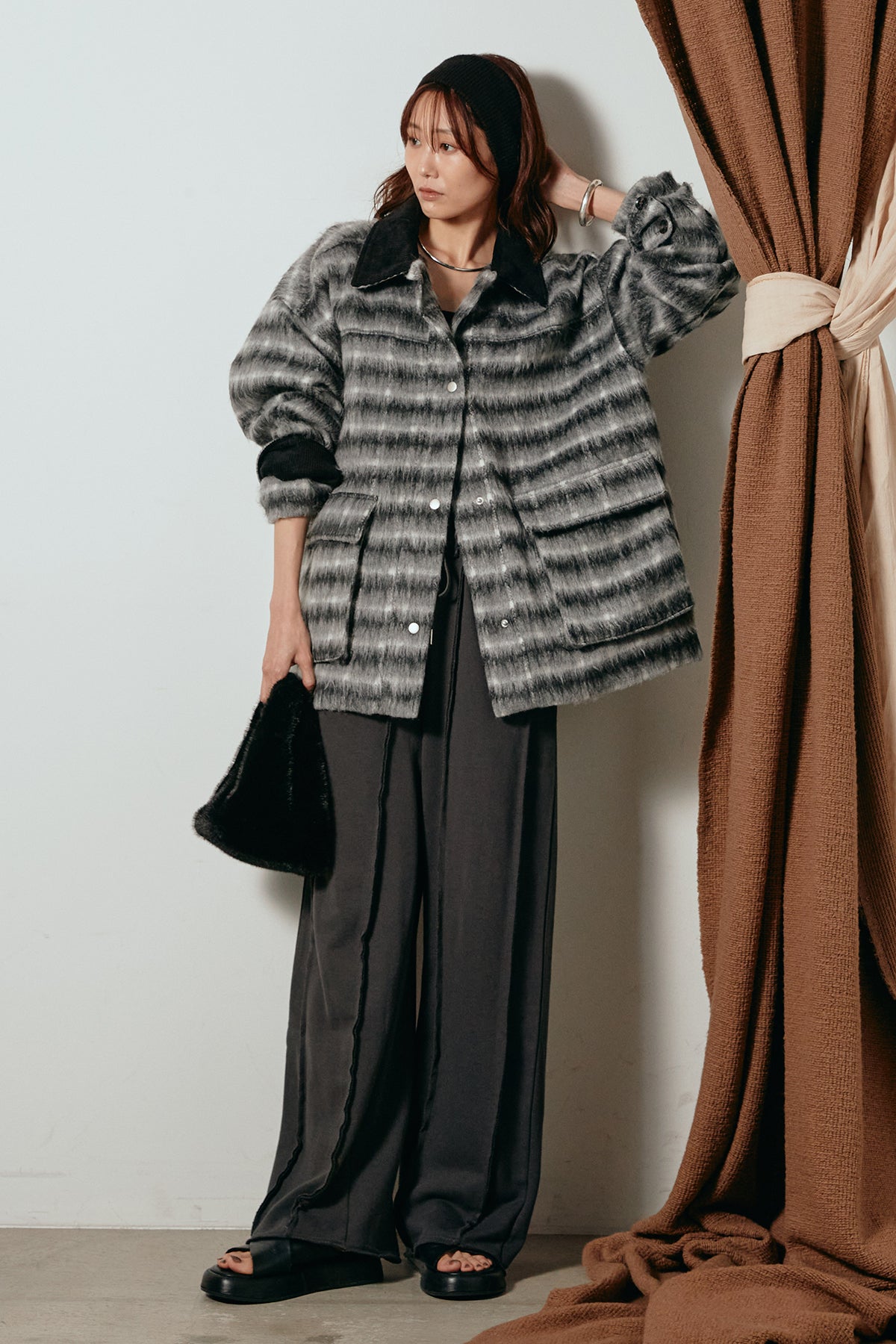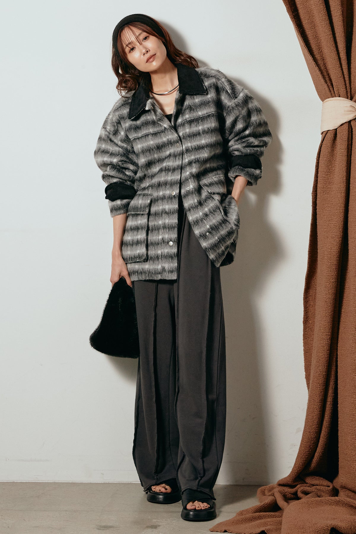 柔らかなシャギー素材で仕立てたチェック柄のミドルカバーオール。温かみのある風合いと程よいボリューム感が魅力です。ゆったりとしたシルエットで中に厚手のニットも重ねやすく、季節の変わり目にも活躍。ヒップが隠れるミドル丈でバランスが取りやすく、デイリーにもお出かけにもぴったりな一着です。