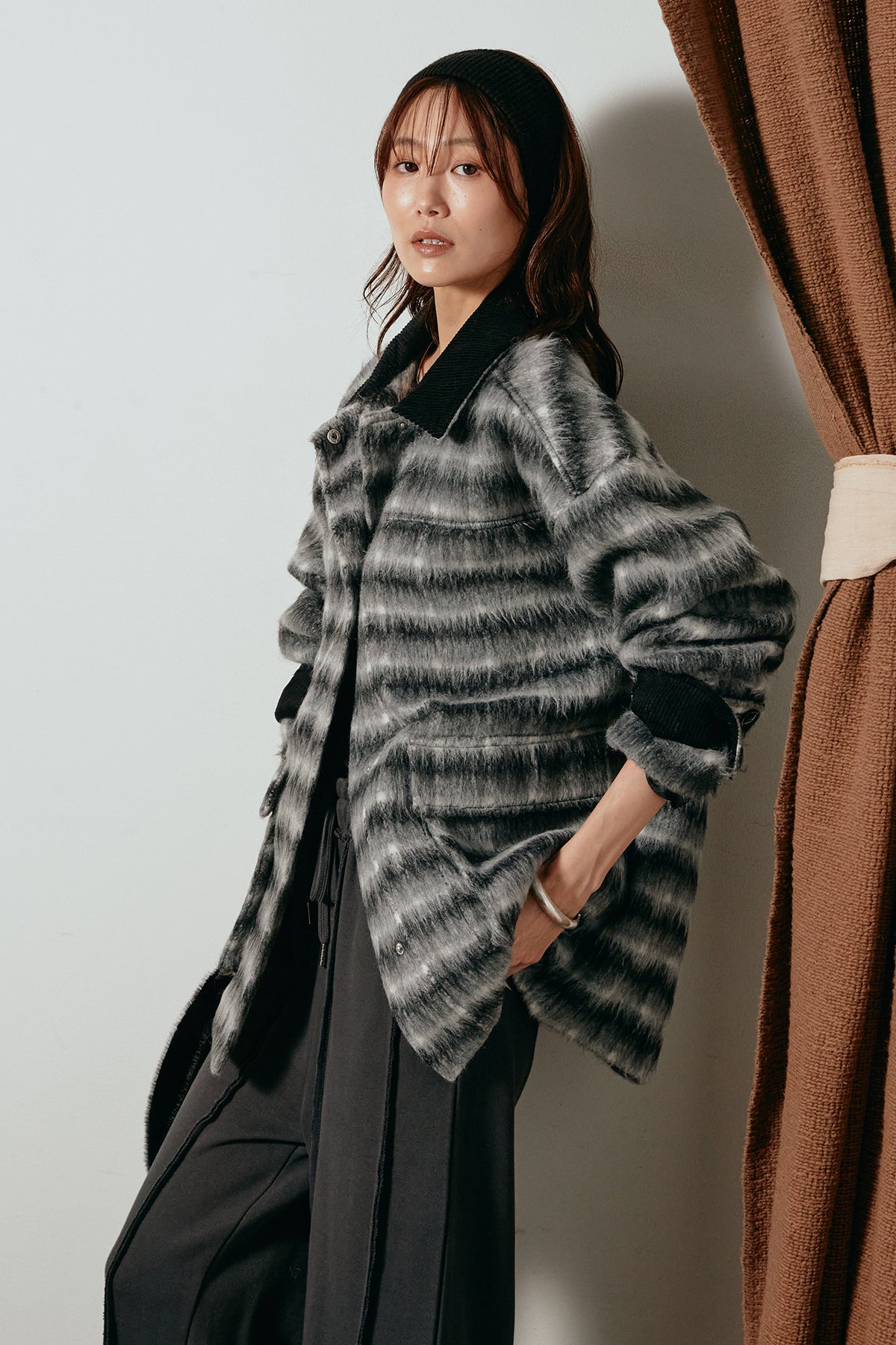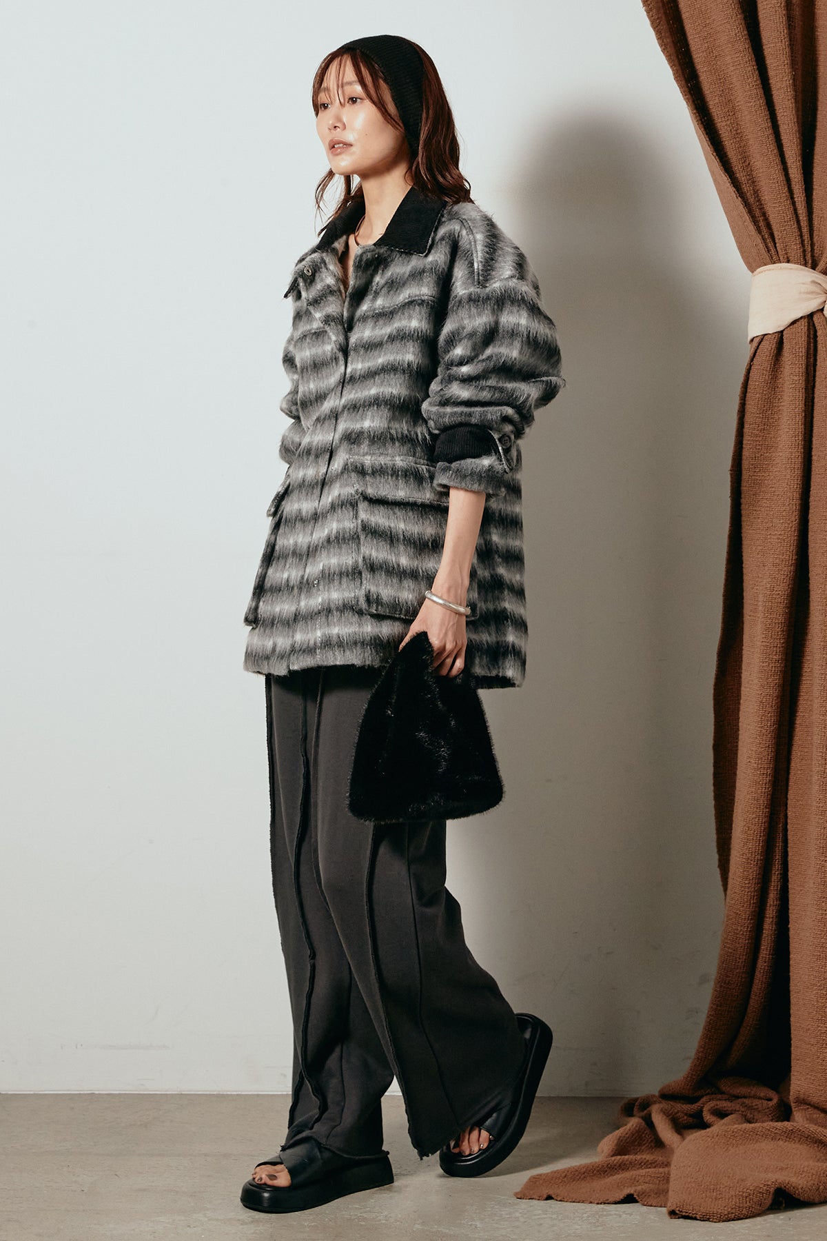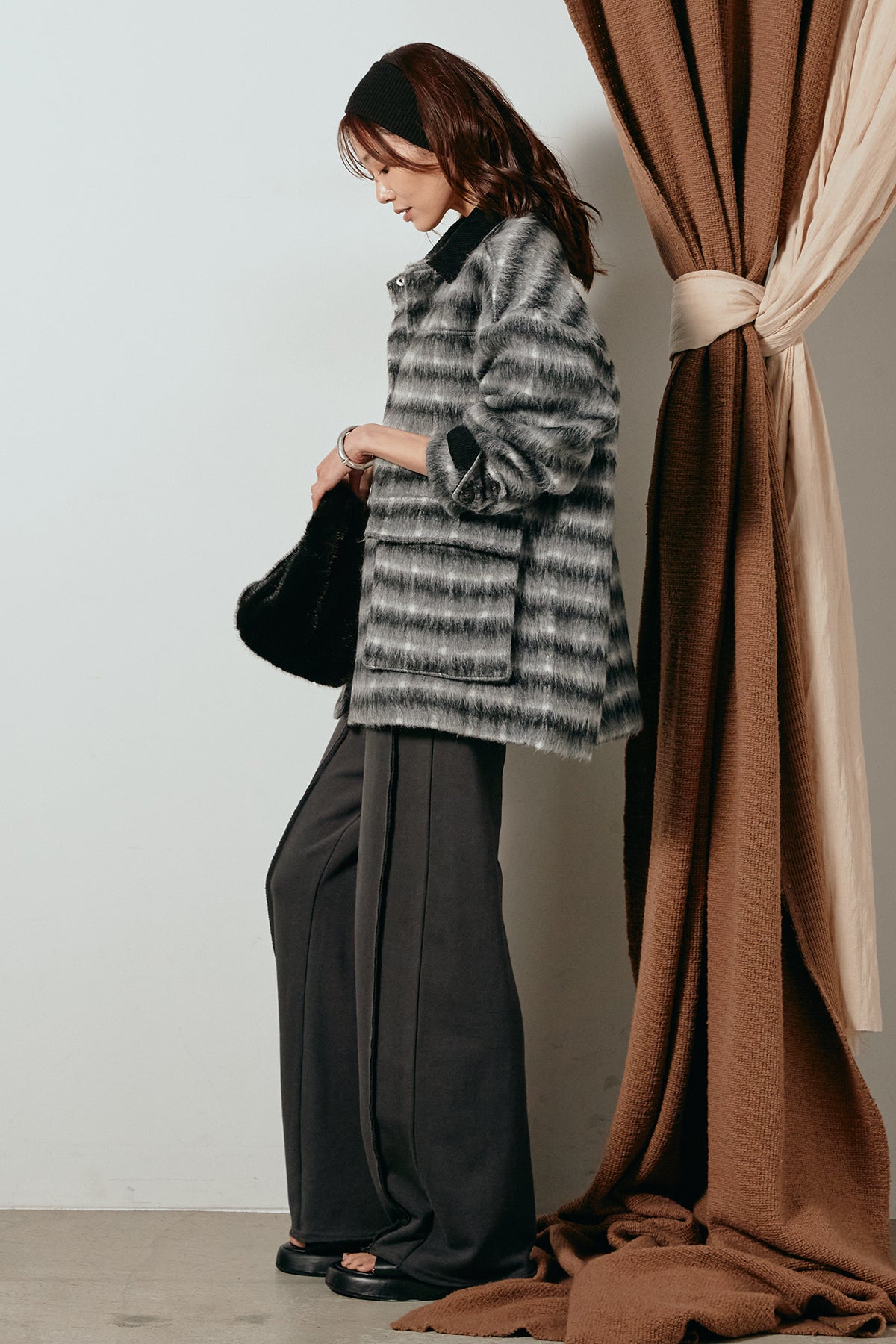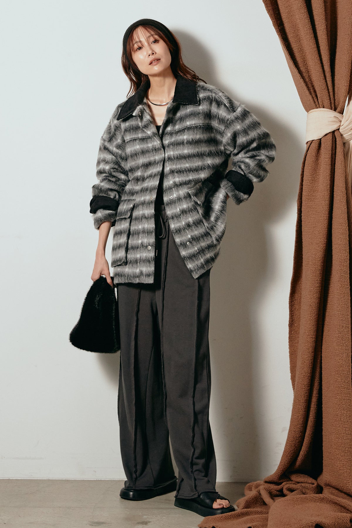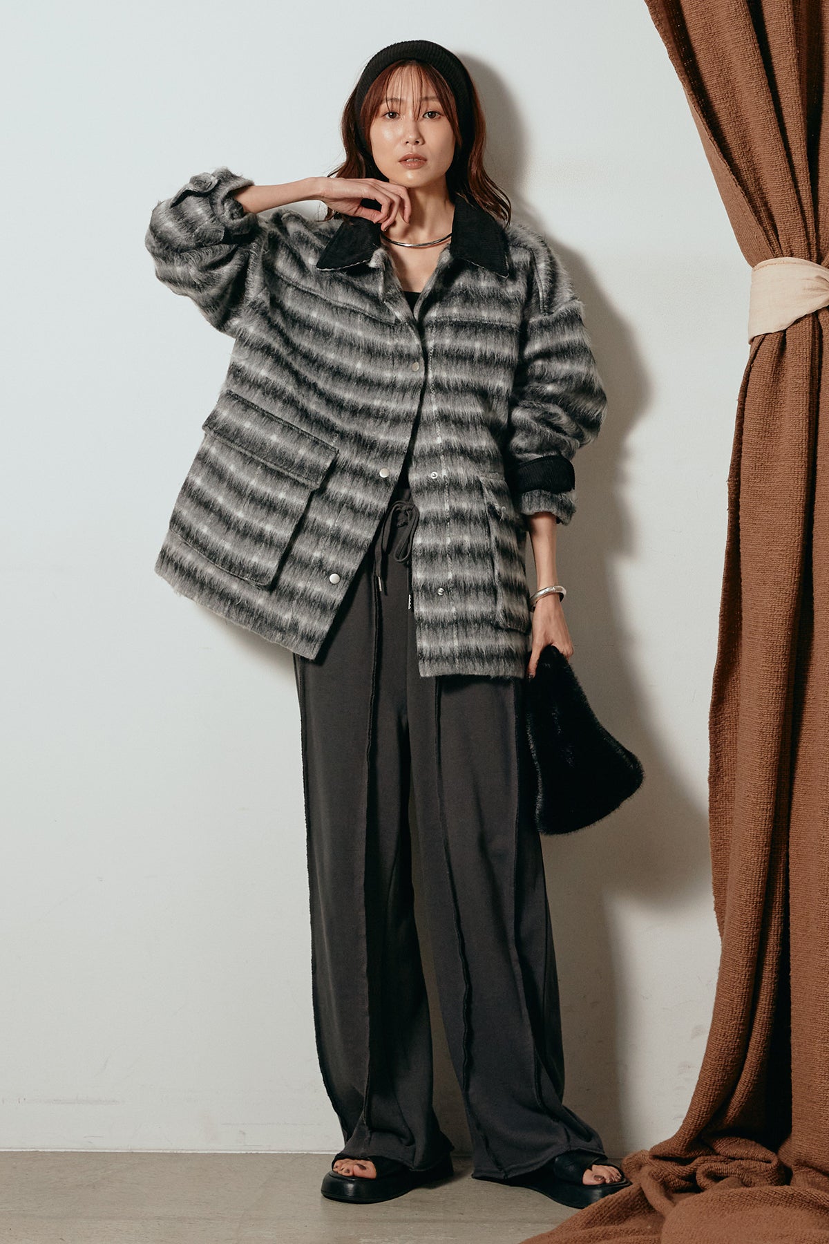 柔らかなシャギー素材で仕立てたチェック柄のミドルカバーオール。温かみのある風合いと程よいボリューム感が魅力です。ゆったりとしたシルエットで中に厚手のニットも重ねやすく、季節の変わり目にも活躍。ヒップが隠れるミドル丈でバランスが取りやすく、デイリーにもお出かけにもぴったりな一着です。