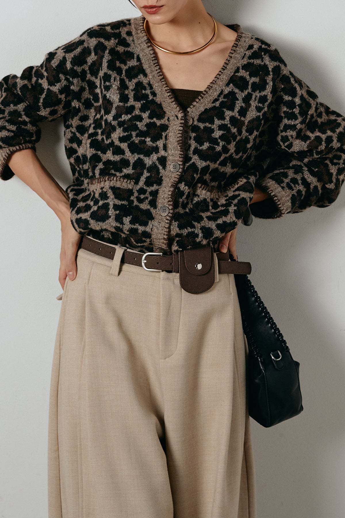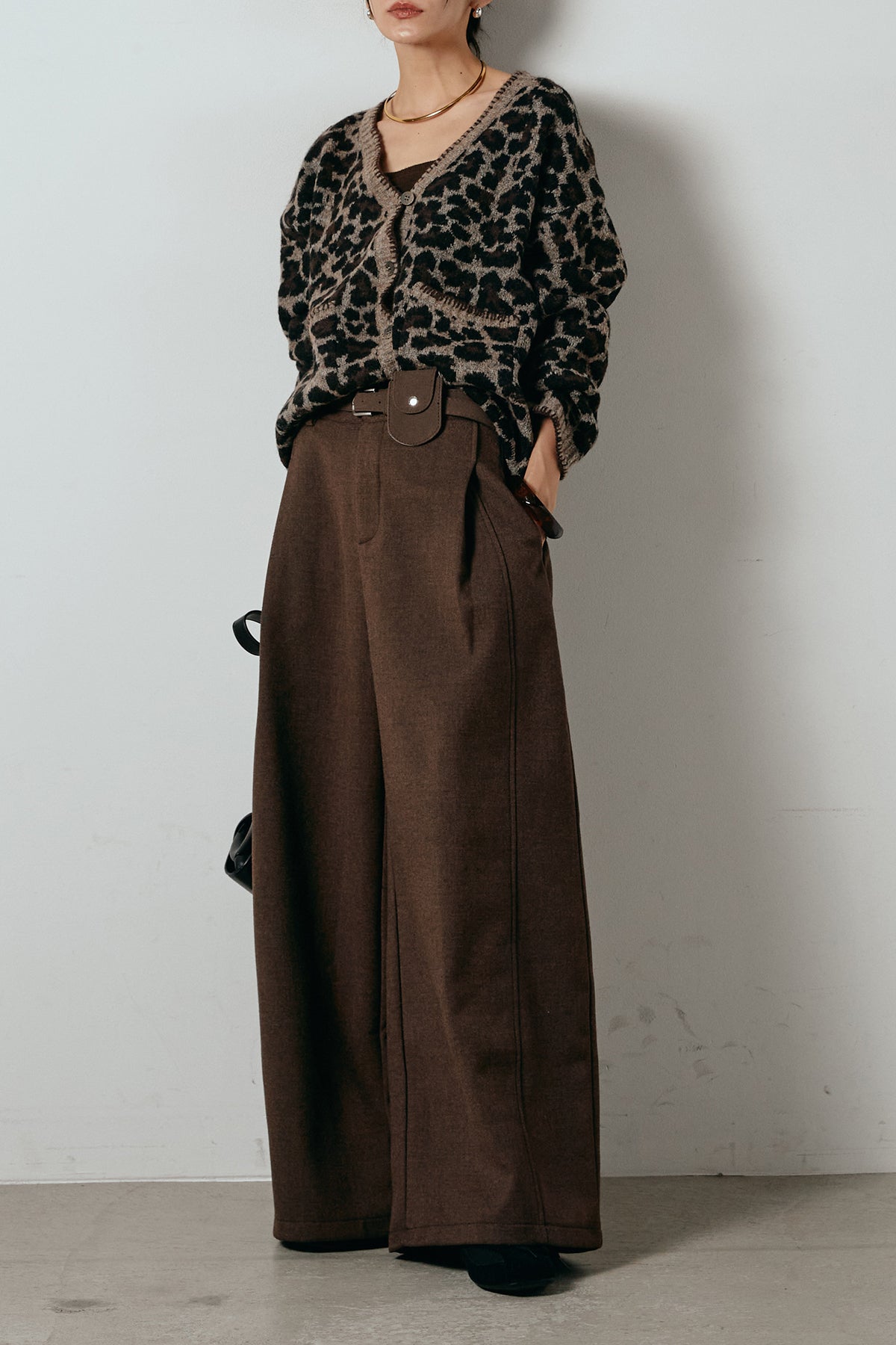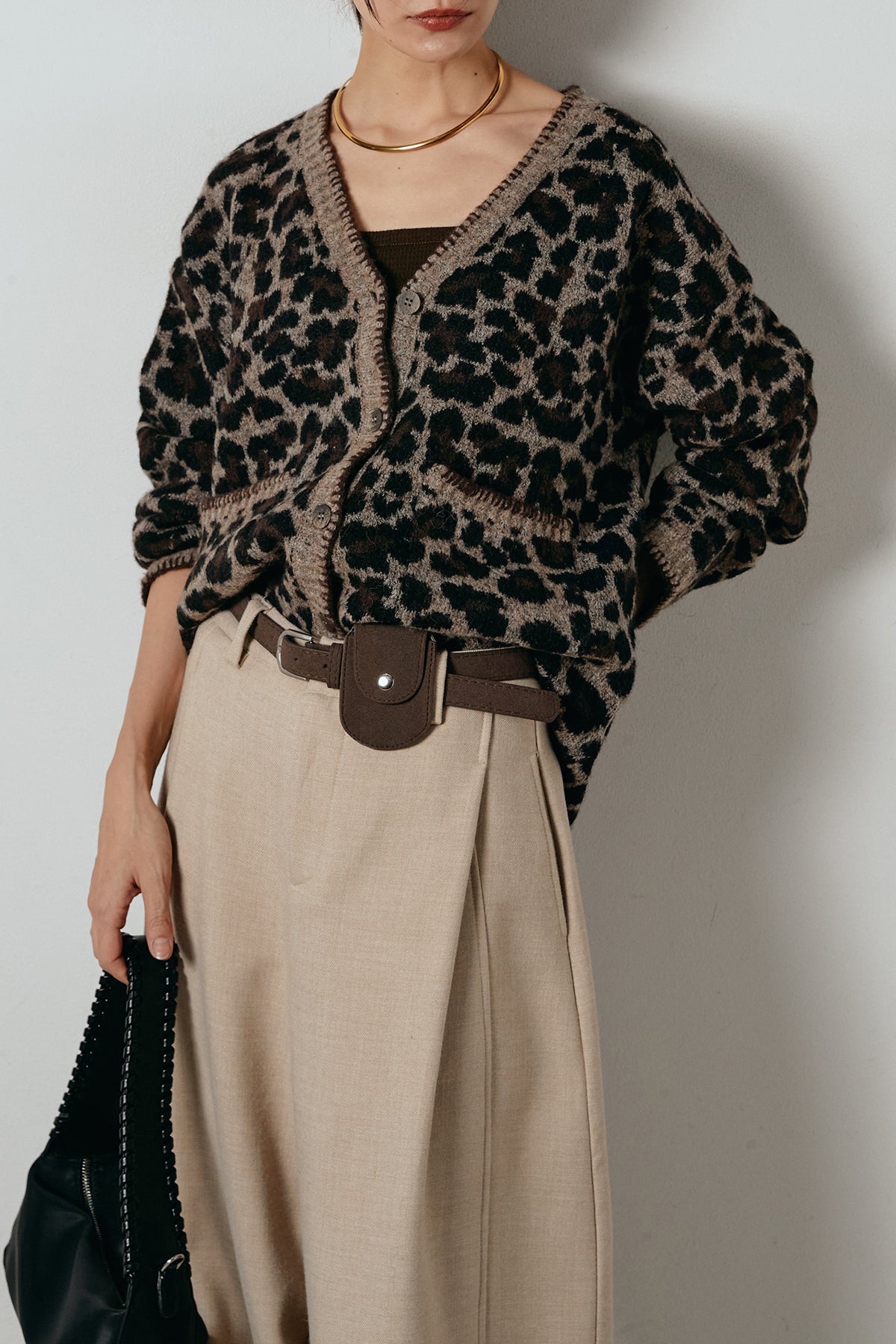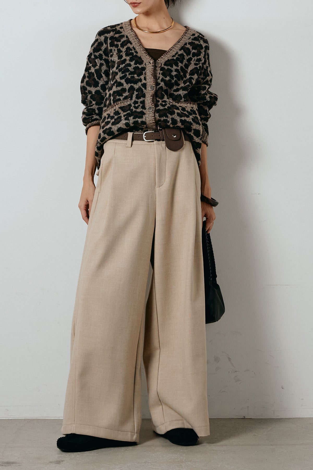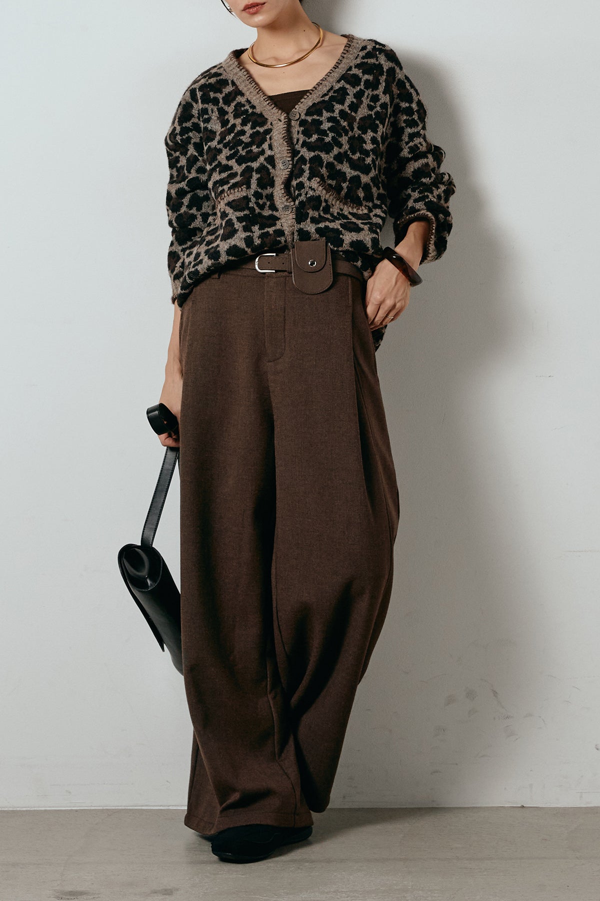 [SET]ステッチデザインレオパードニットカーディガン+ポーチベルト付きカーブパンツ(2set)