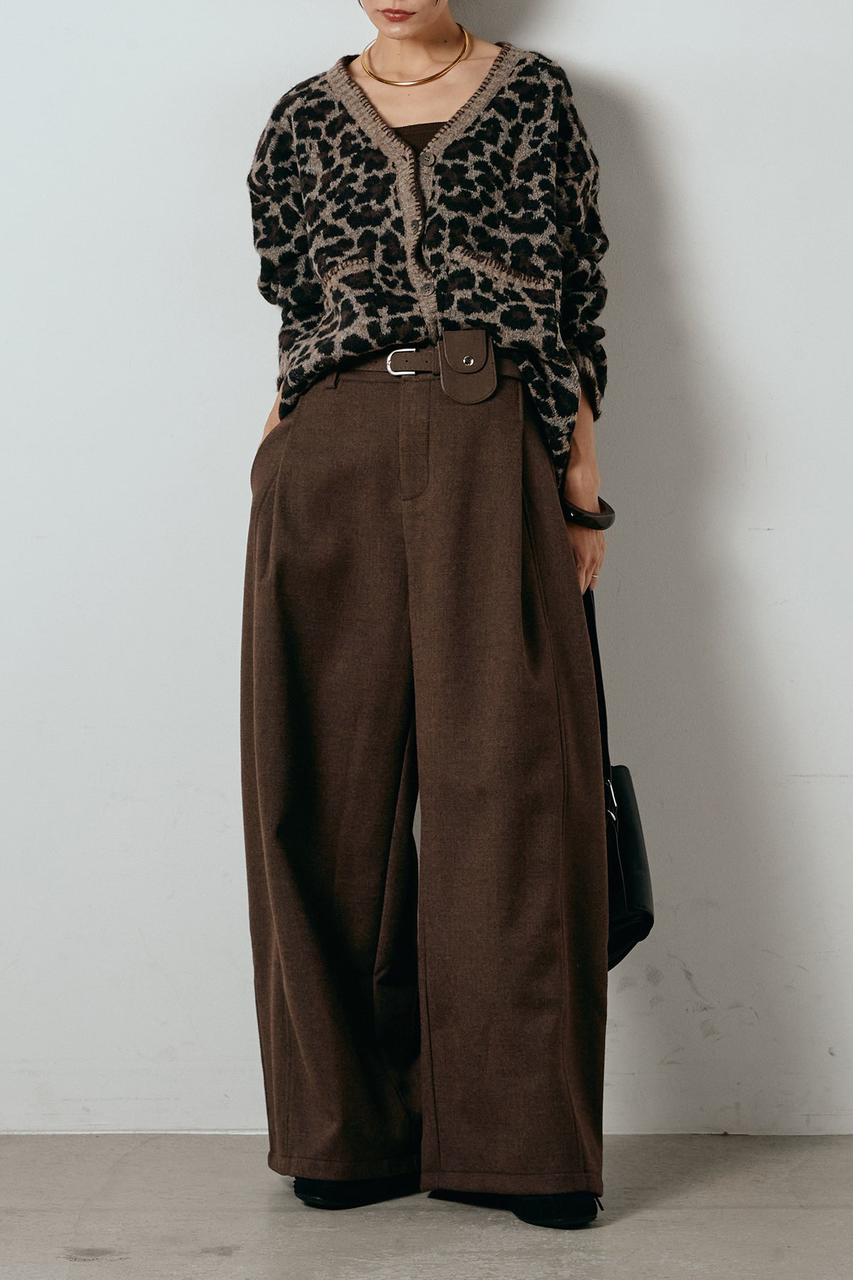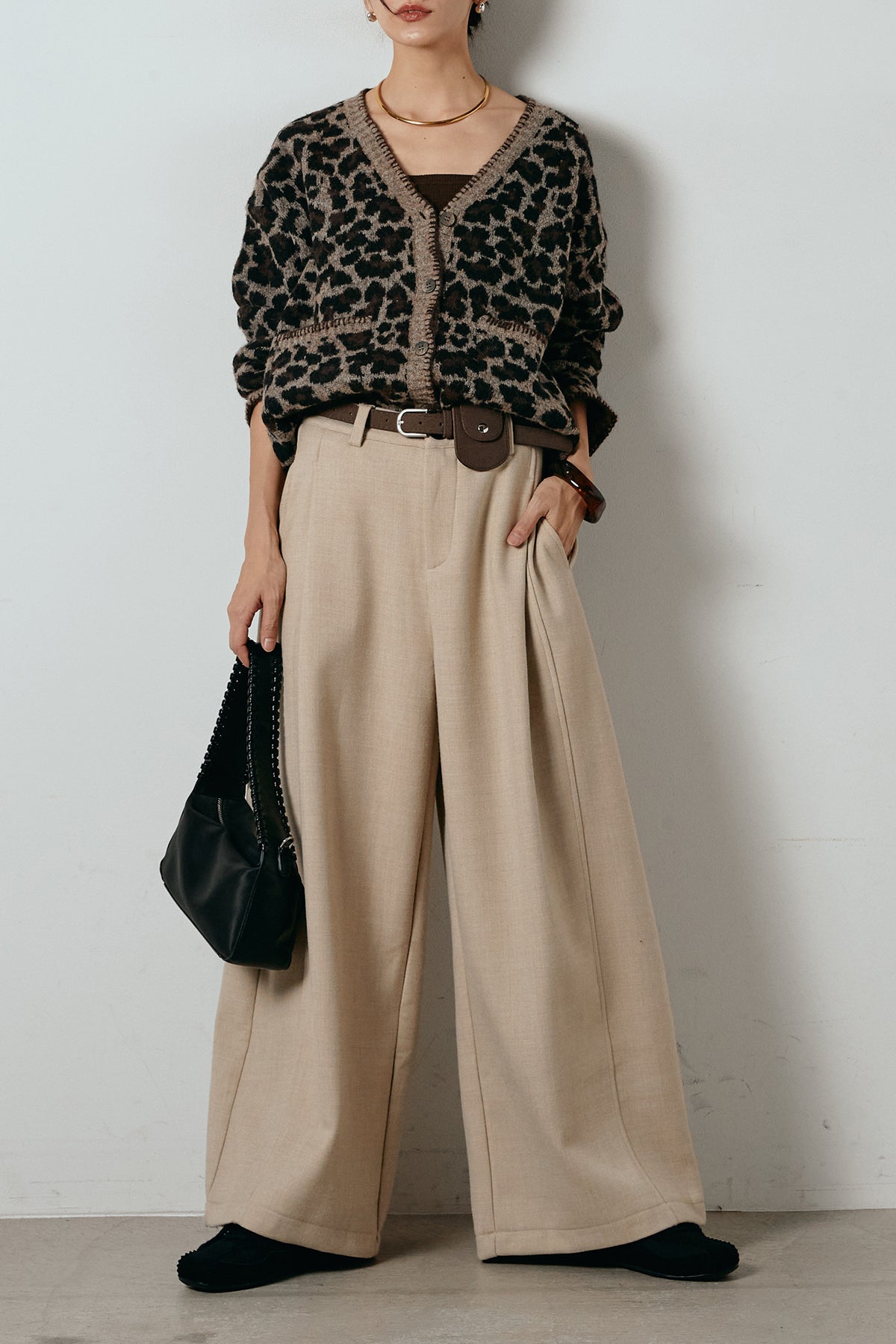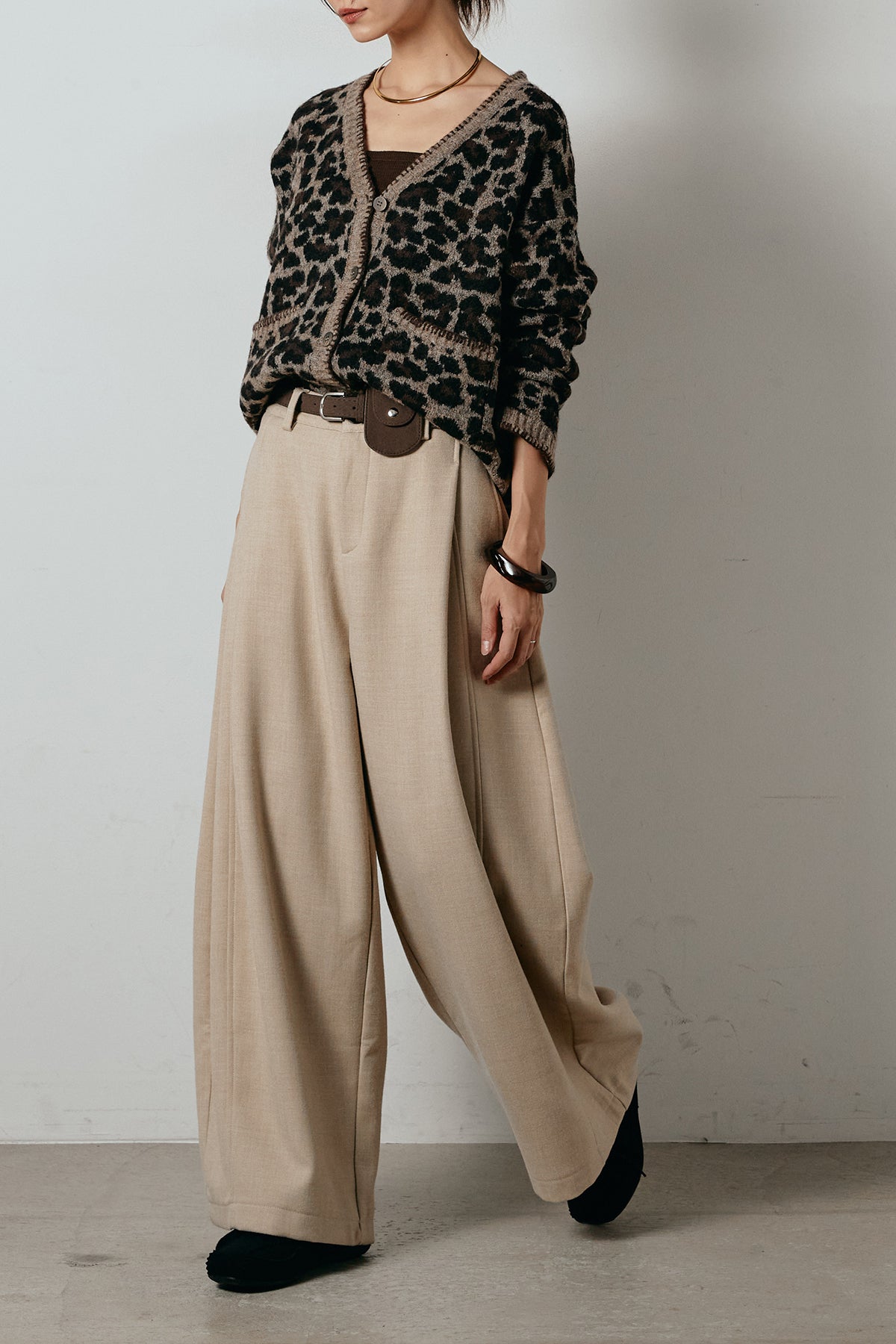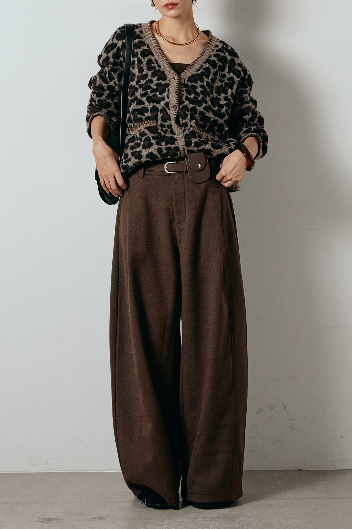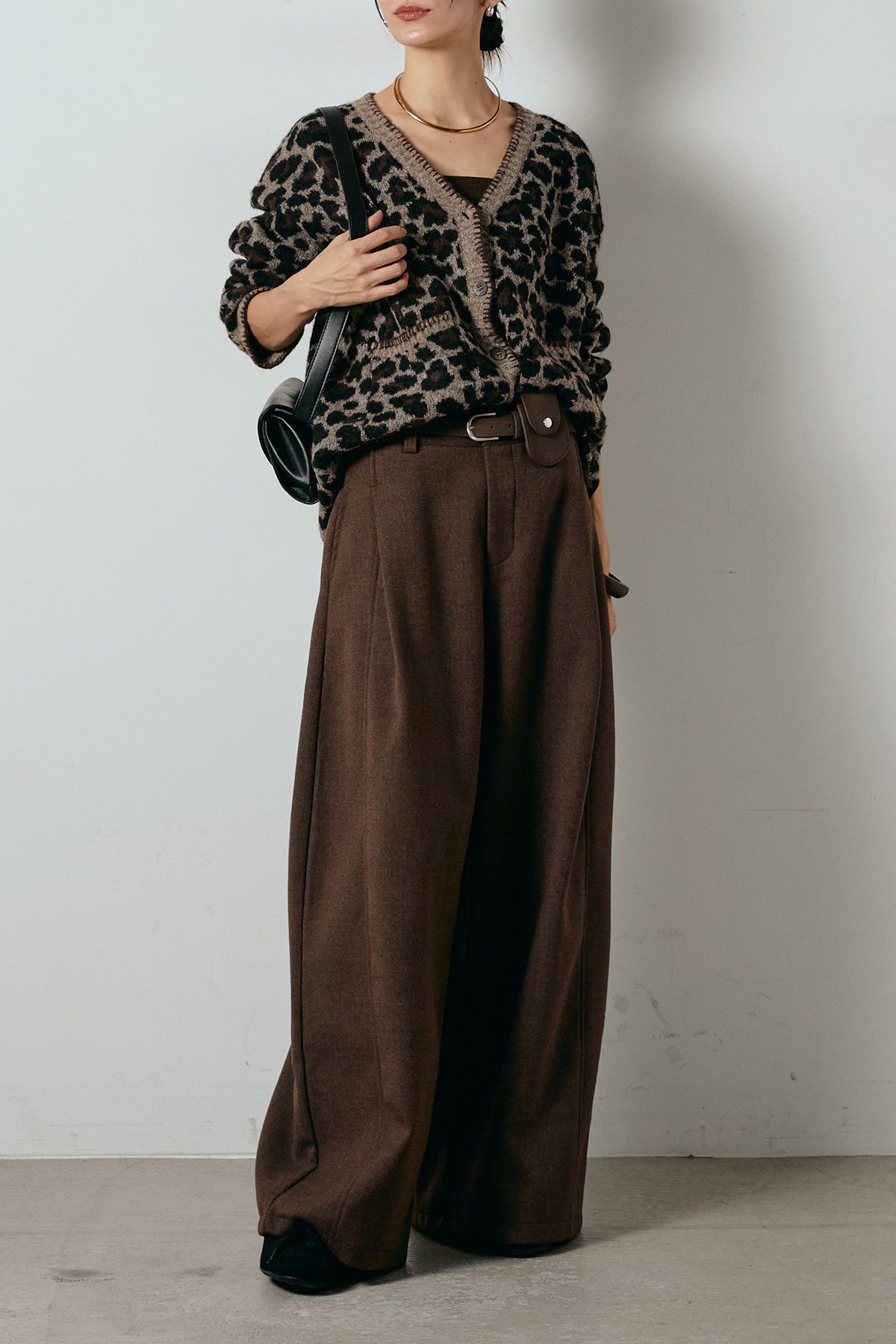 [SET]ステッチデザインレオパードニットカーディガン+ポーチベルト付きカーブパンツ(2set)