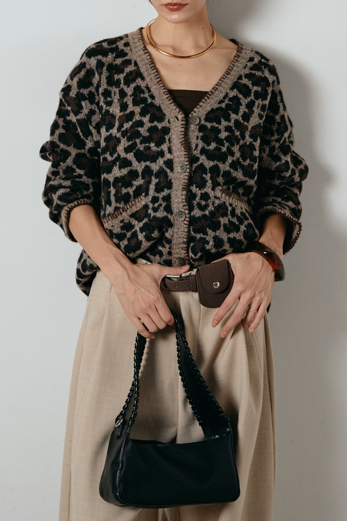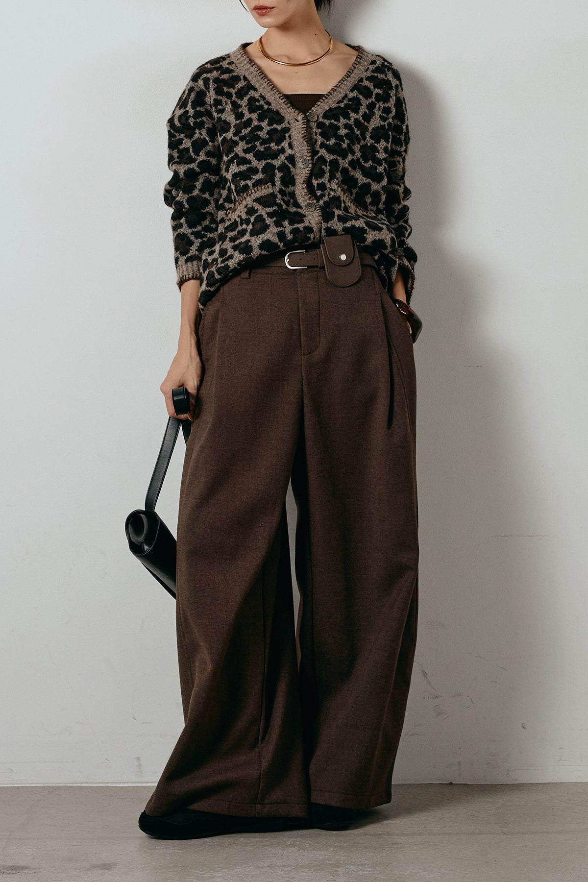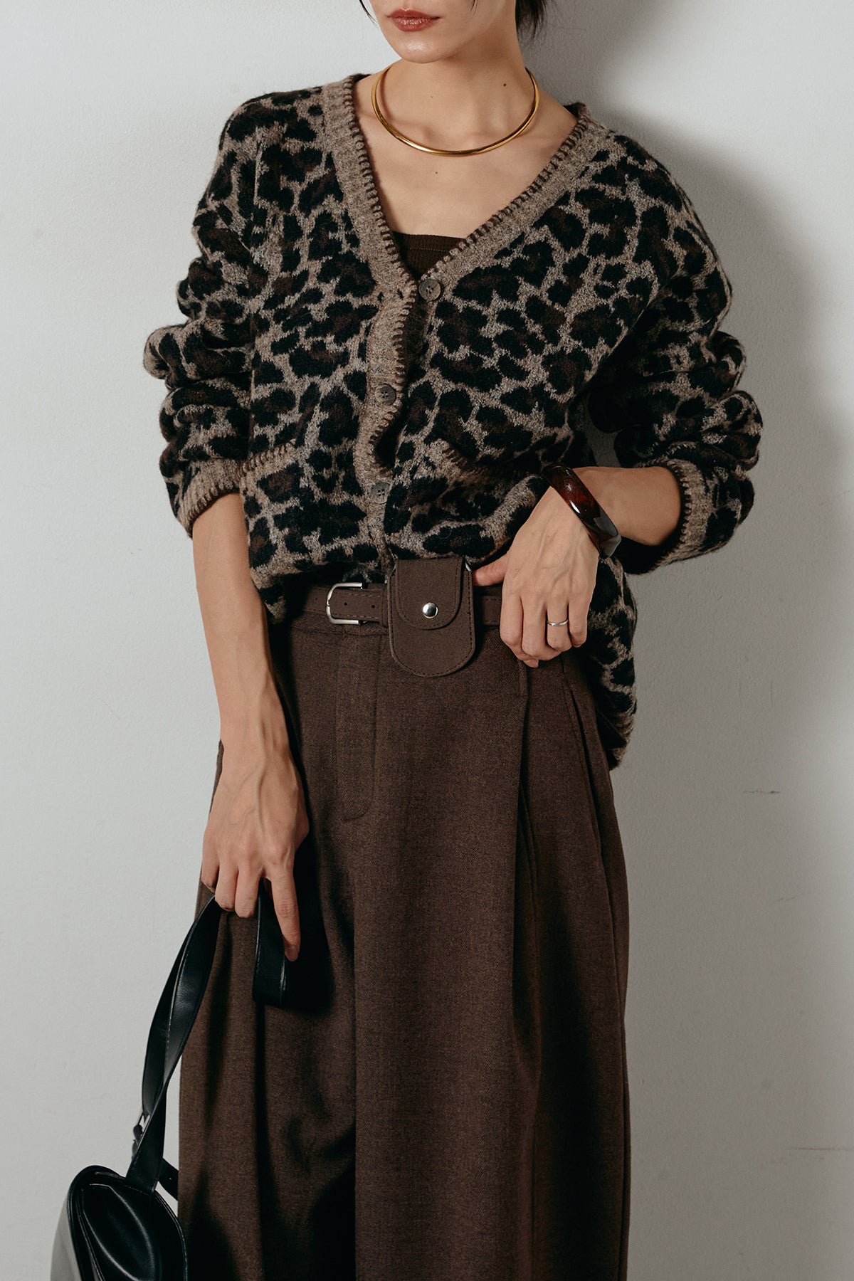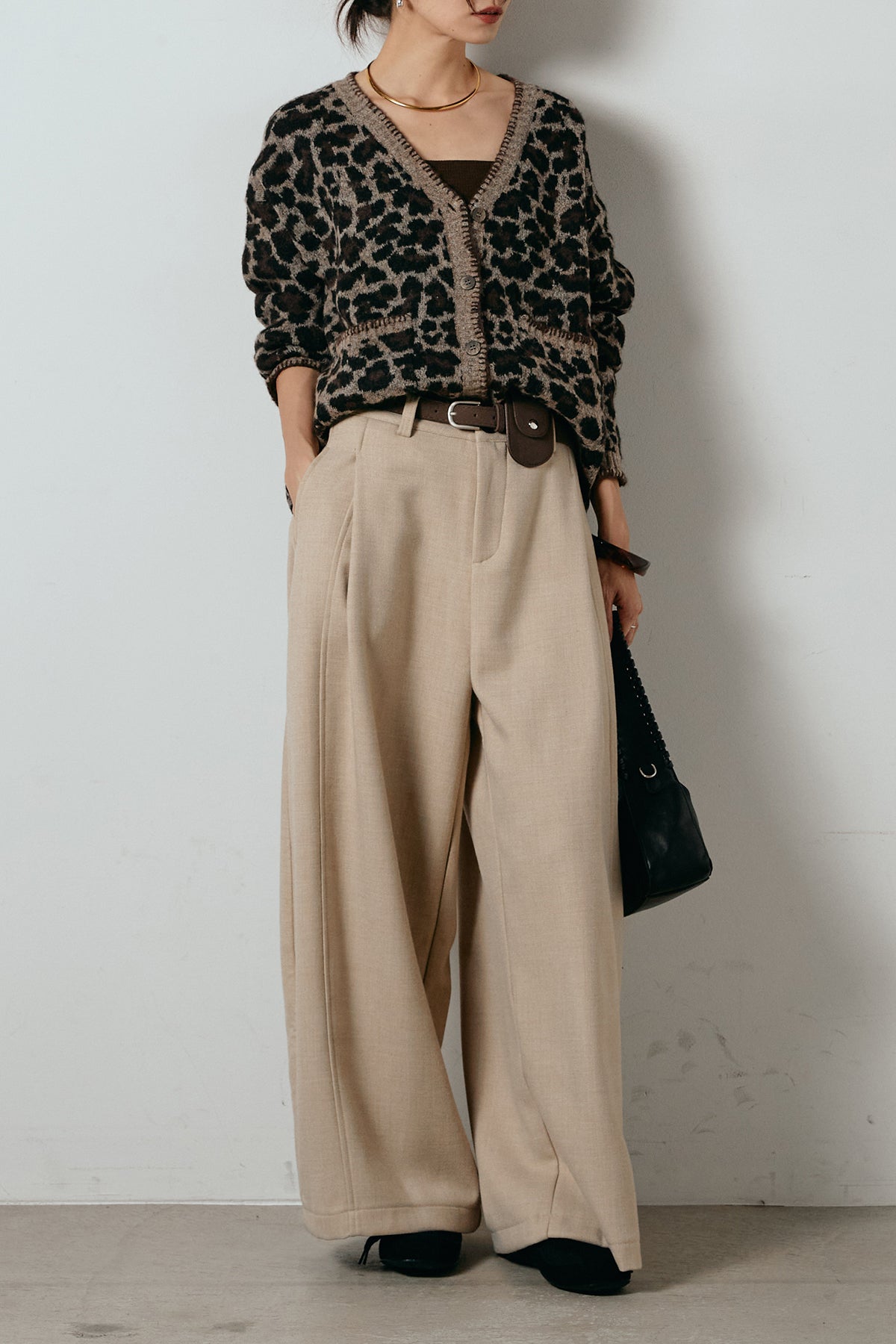 [SET]ステッチデザインレオパードニットカーディガン+ポーチベルト付きカーブパンツ(2set)