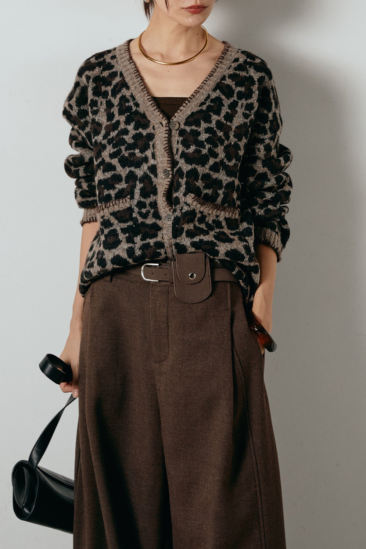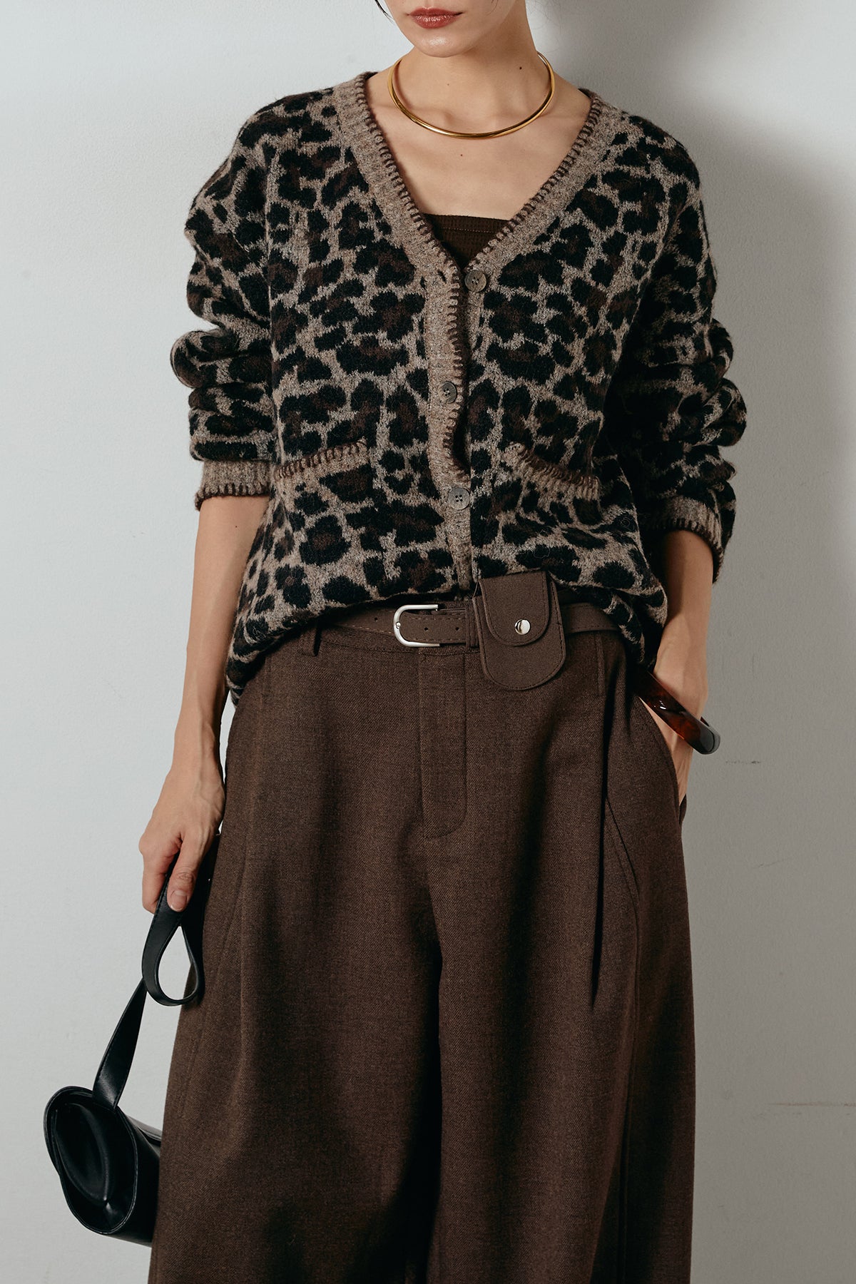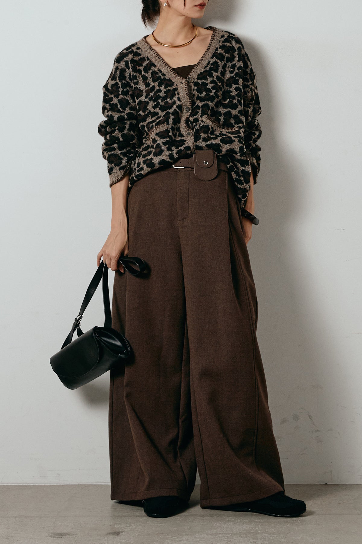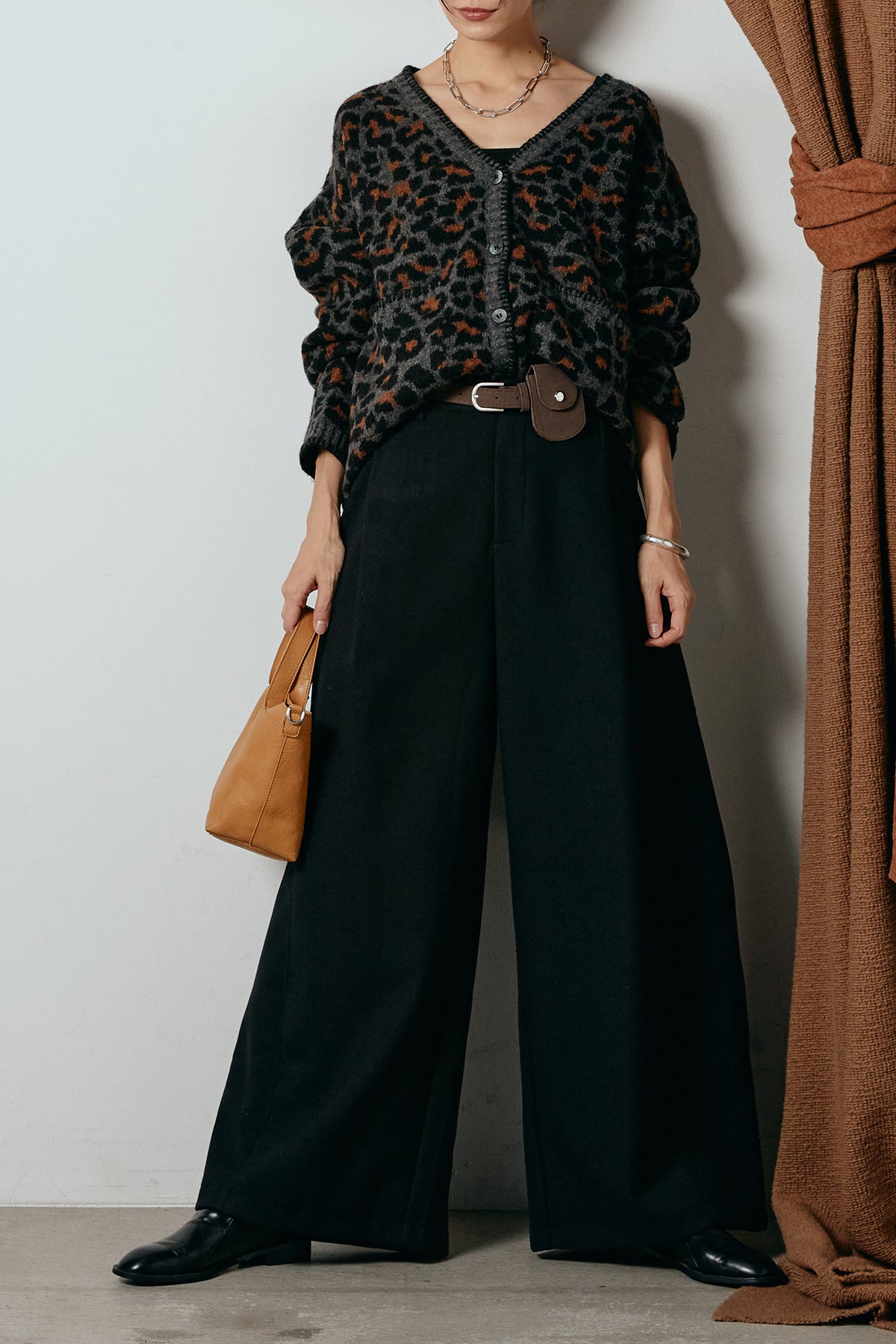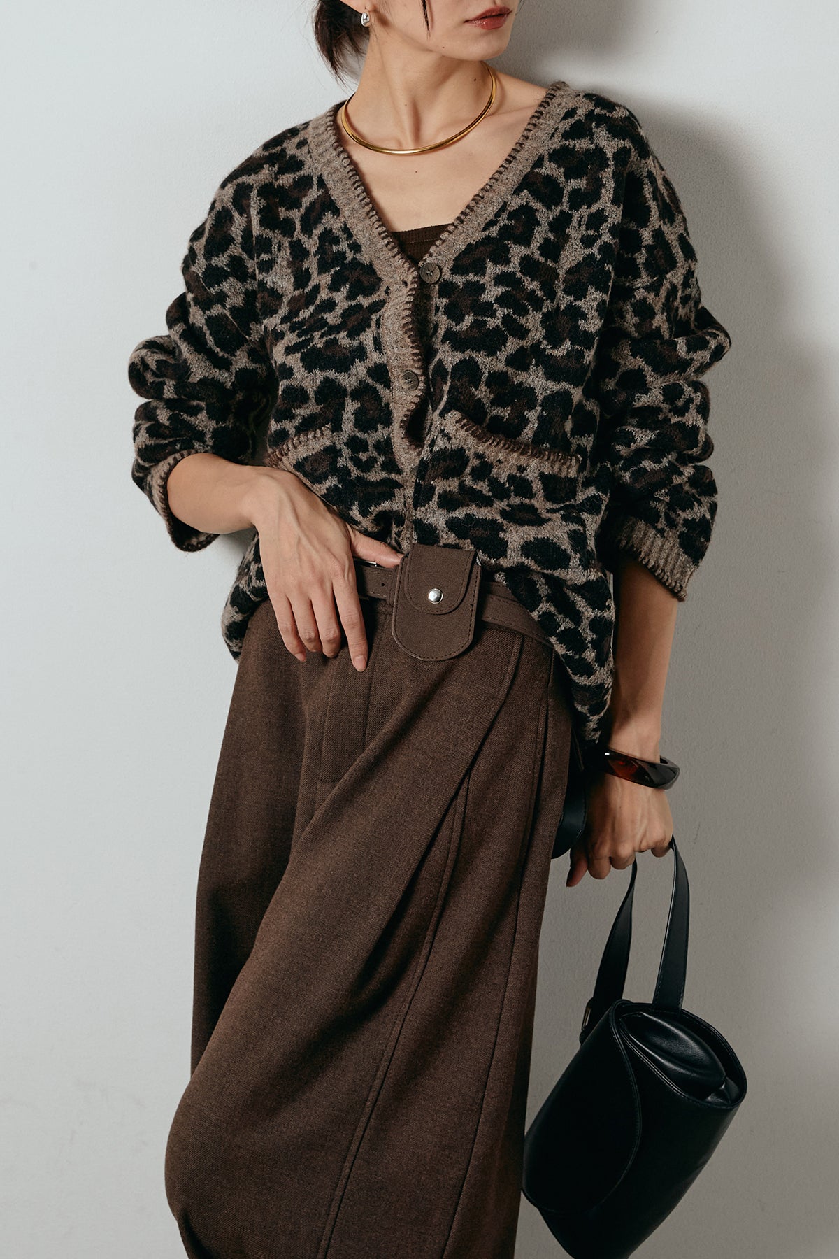 [SET]ステッチデザインレオパードニットカーディガン+ポーチベルト付きカーブパンツ(2set)