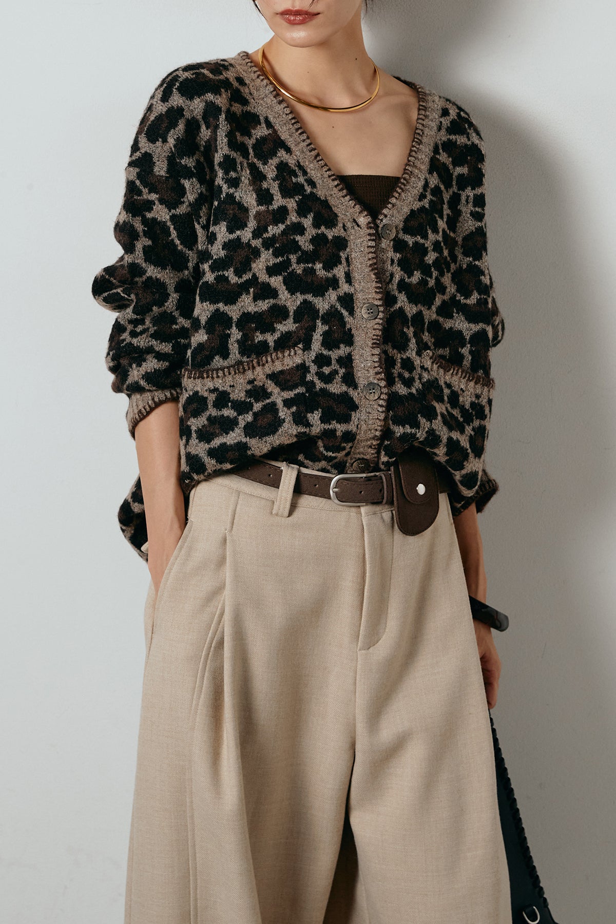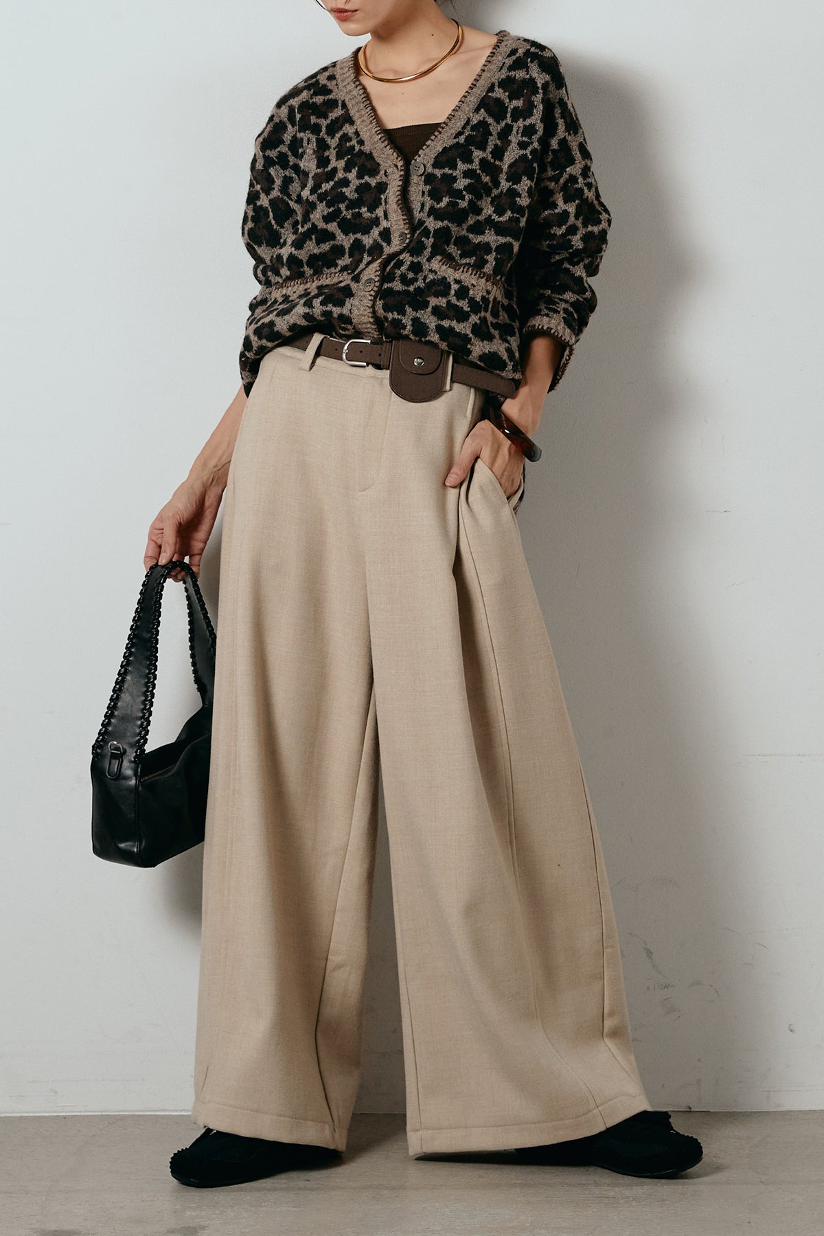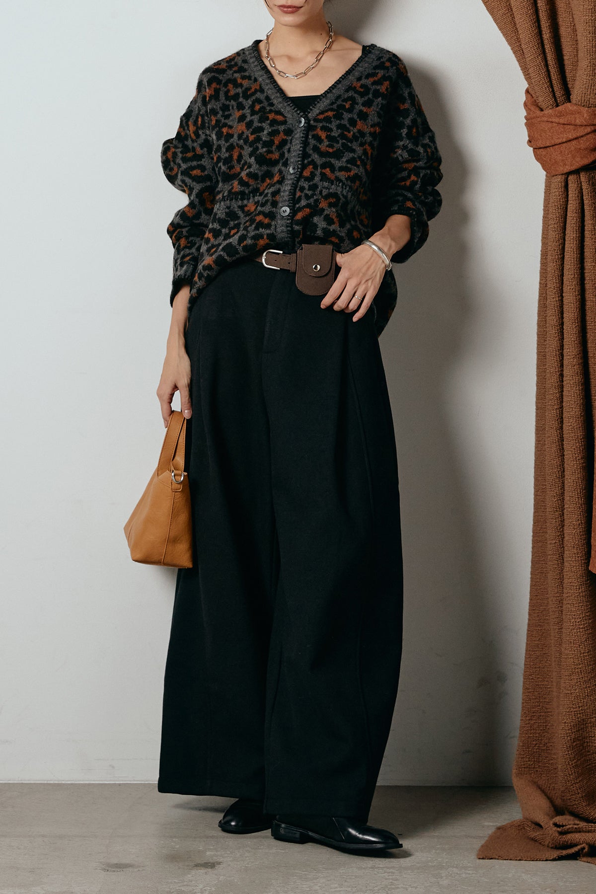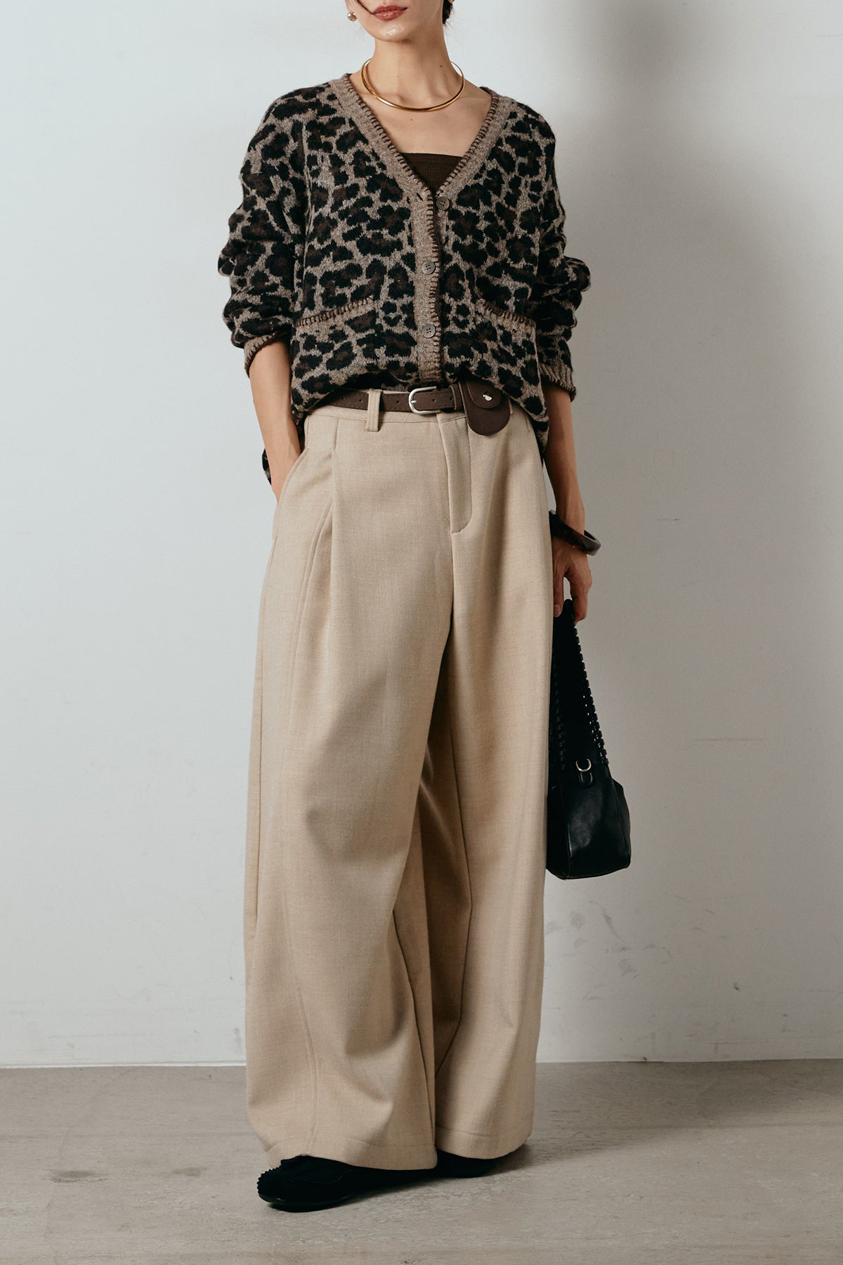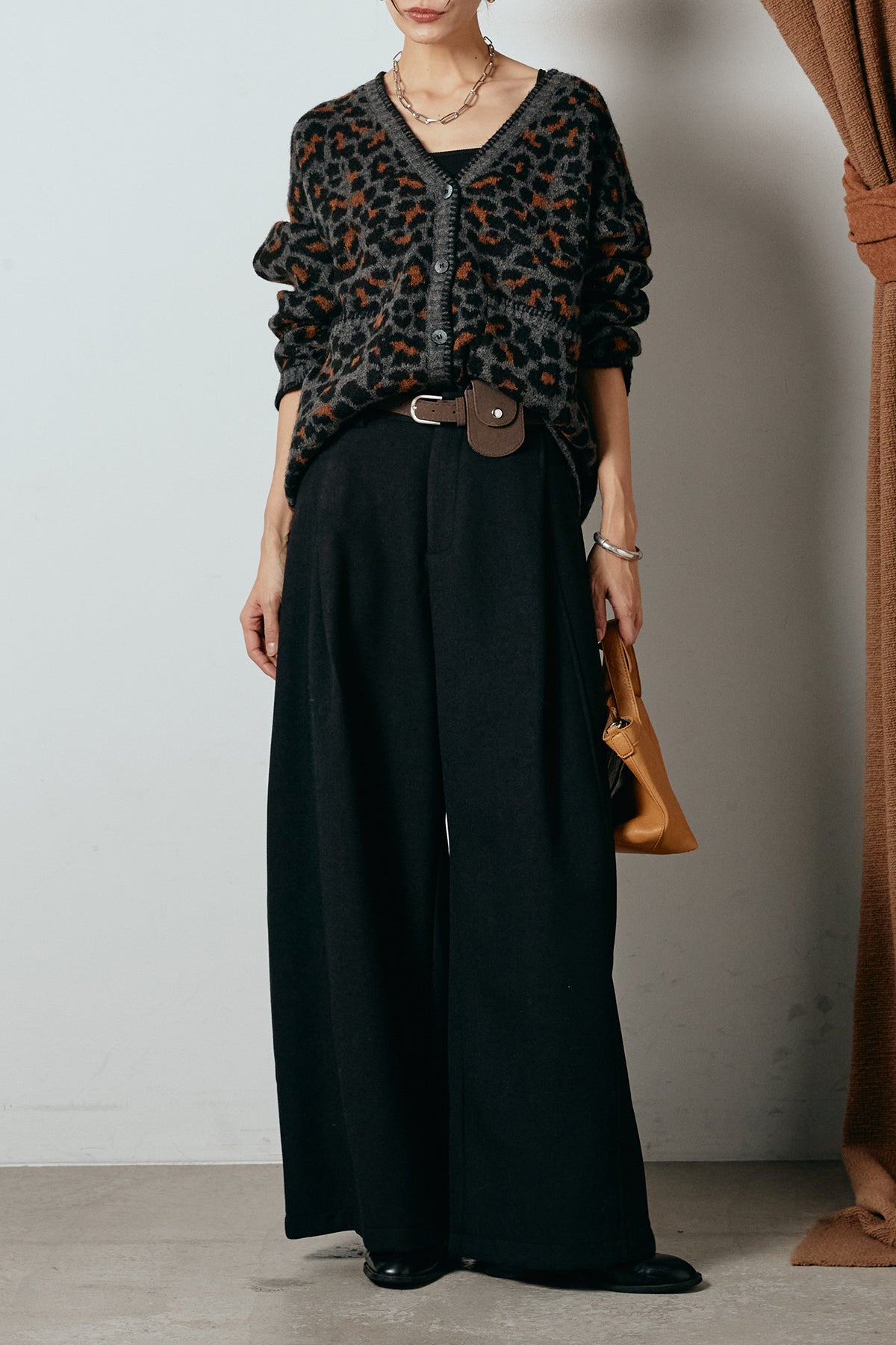 [SET]ステッチデザインレオパードニットカーディガン+ポーチベルト付きカーブパンツ(2set)