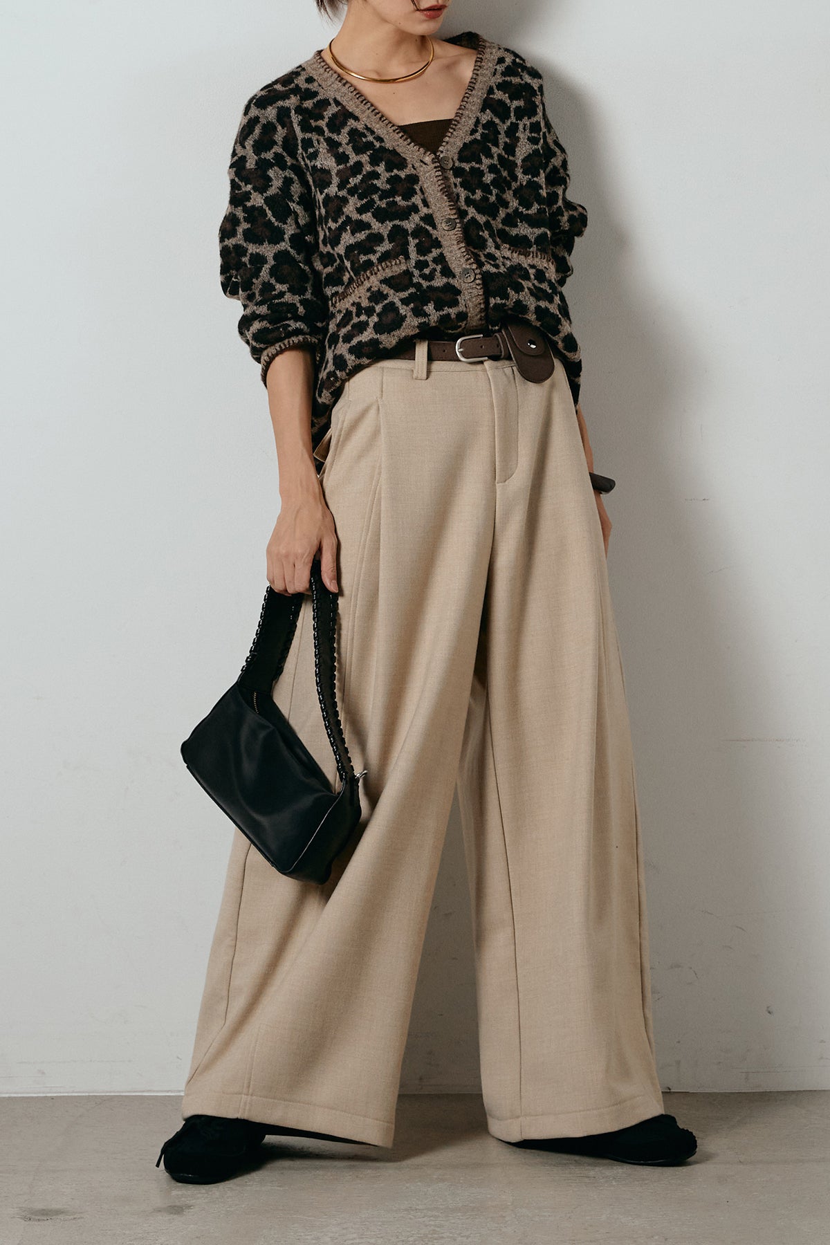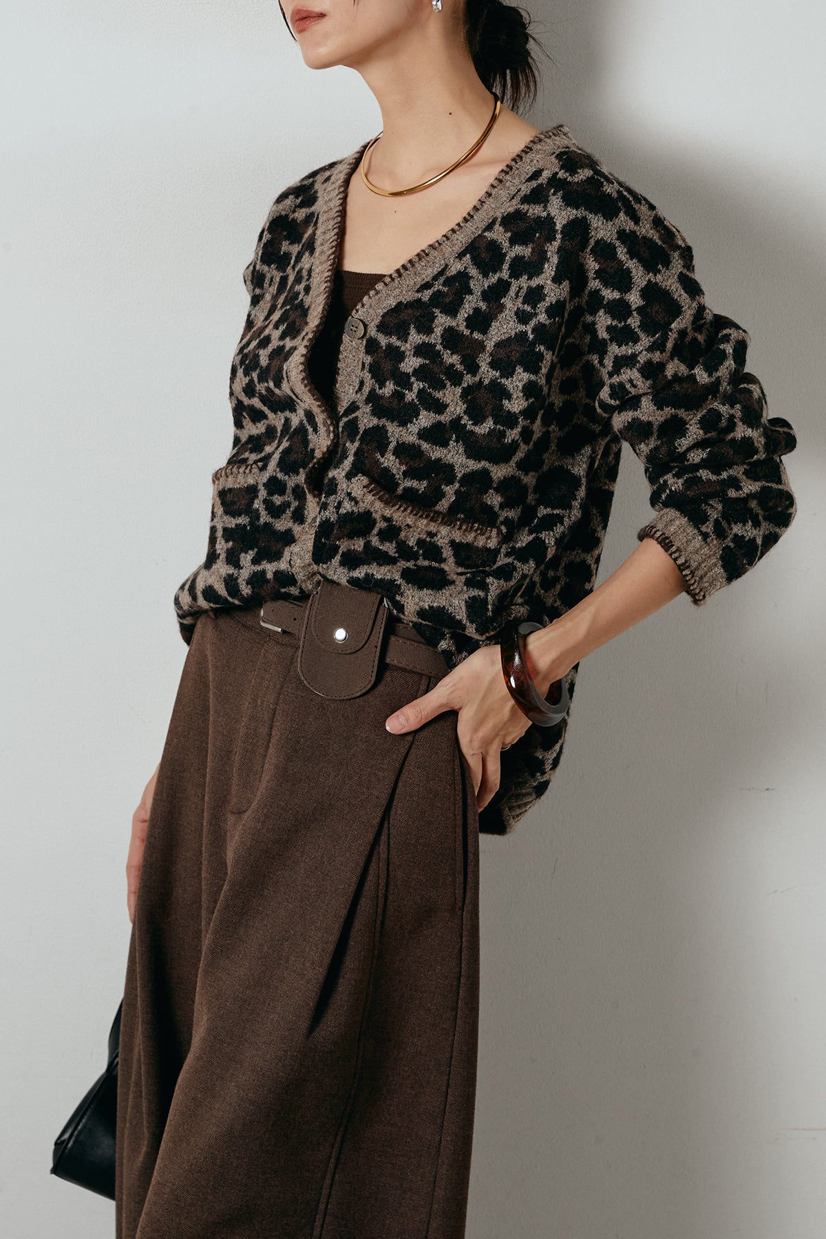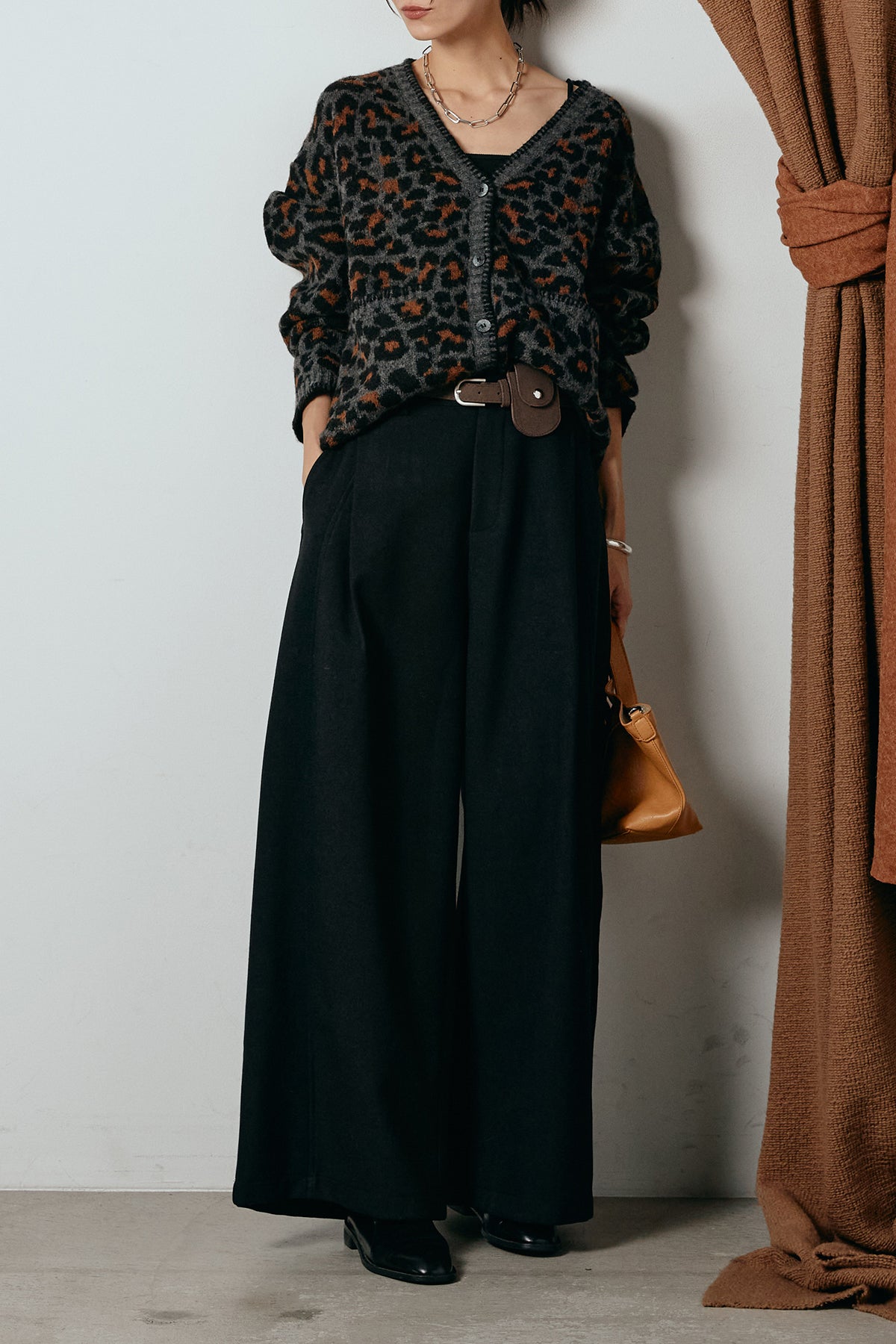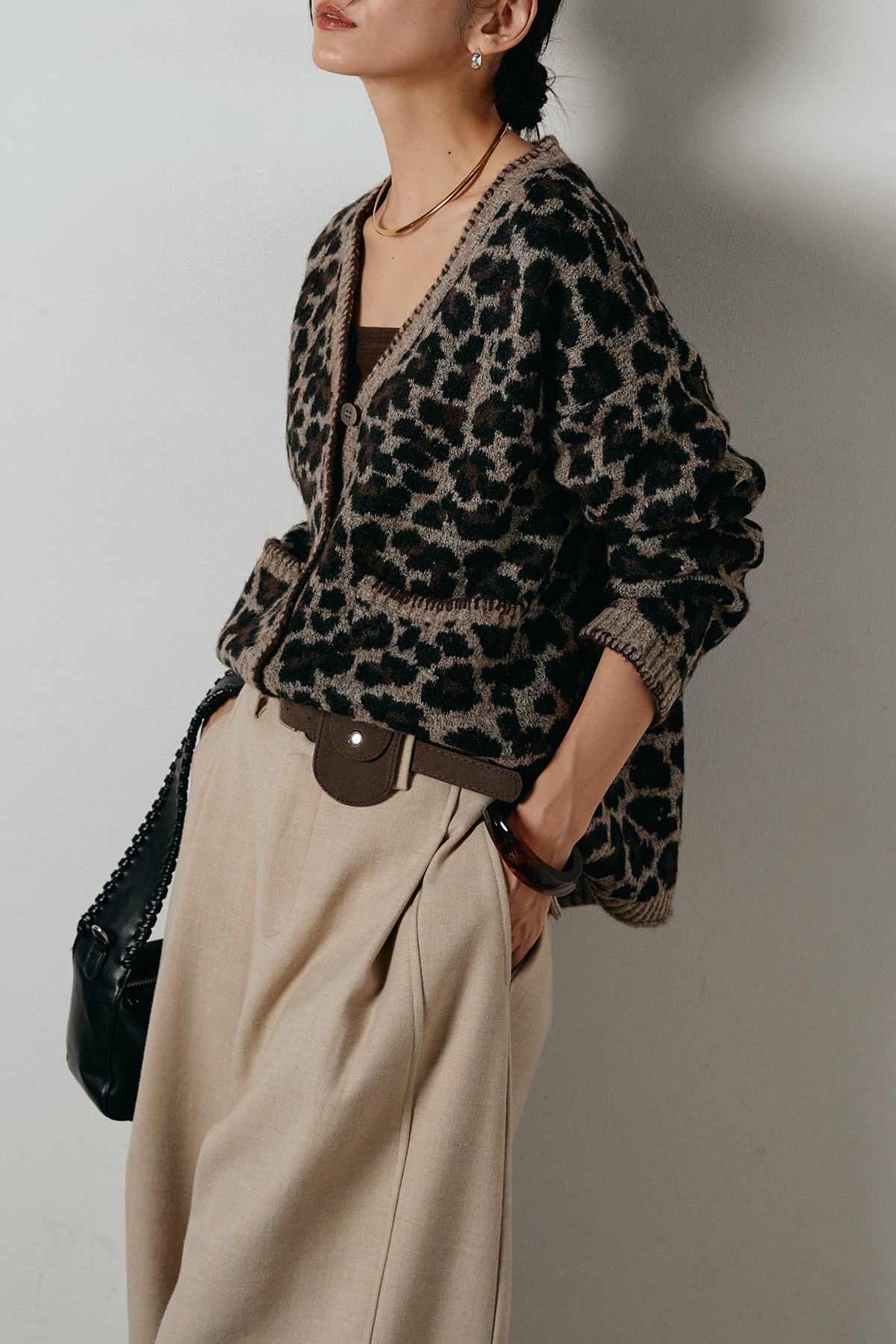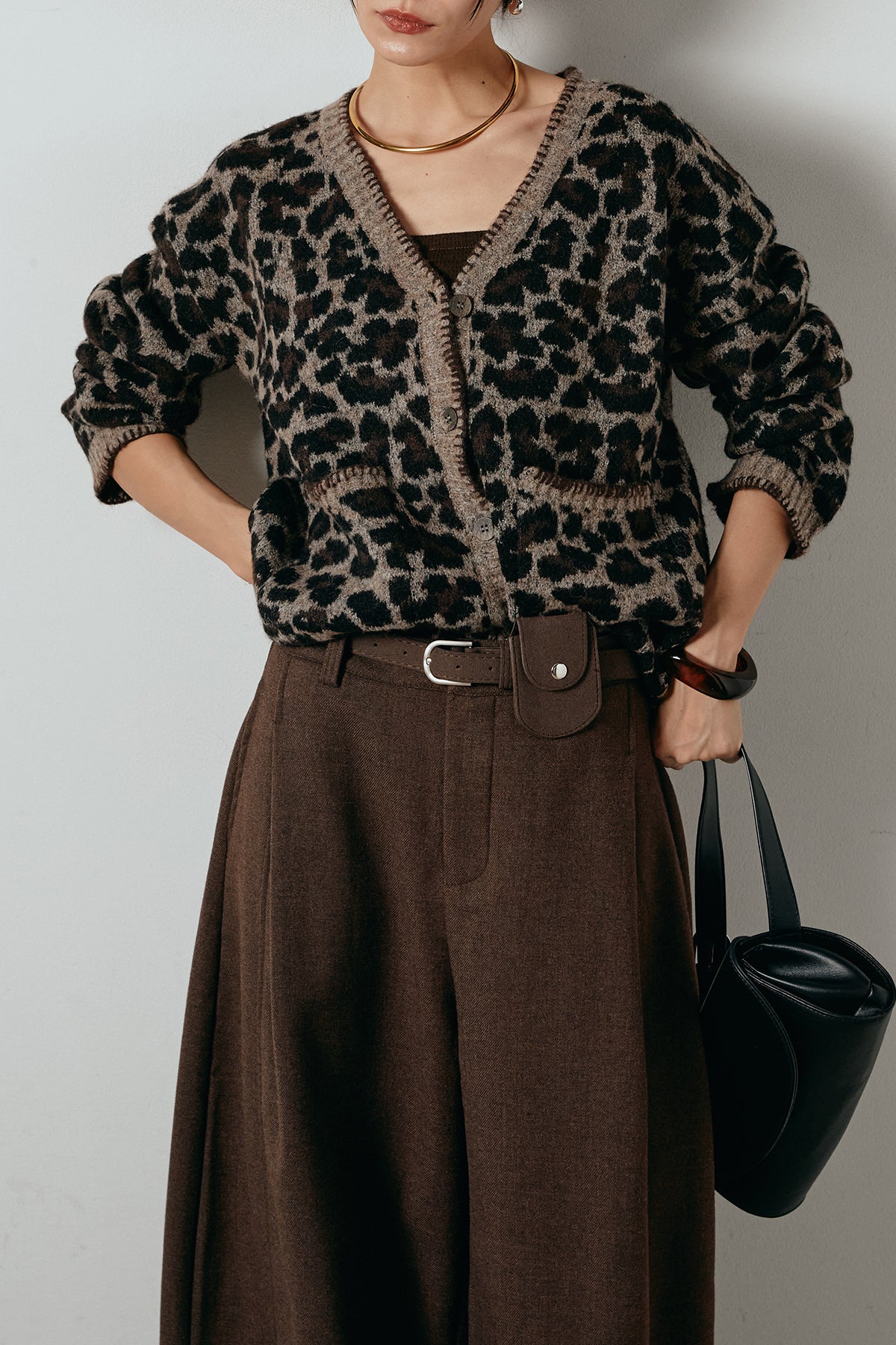 [SET]ステッチデザインレオパードニットカーディガン+ポーチベルト付きカーブパンツ(2set)