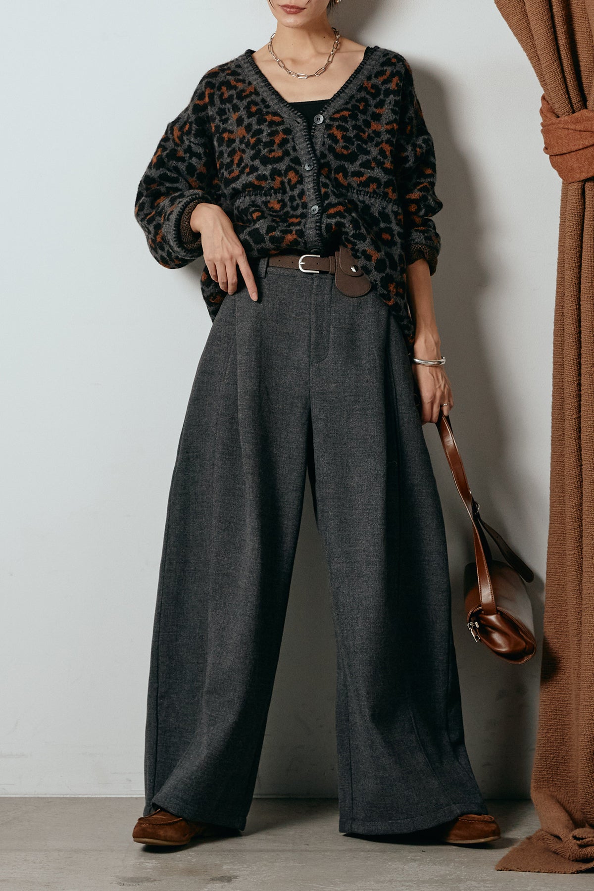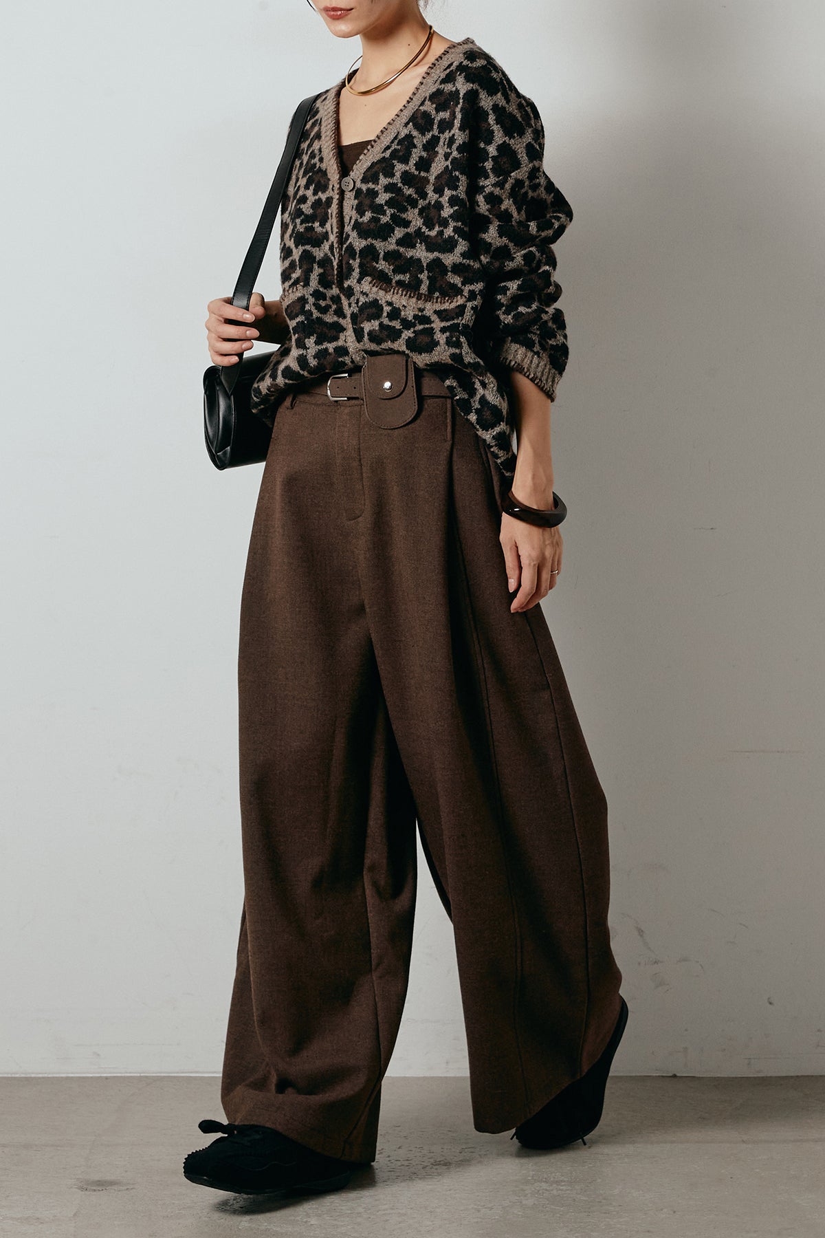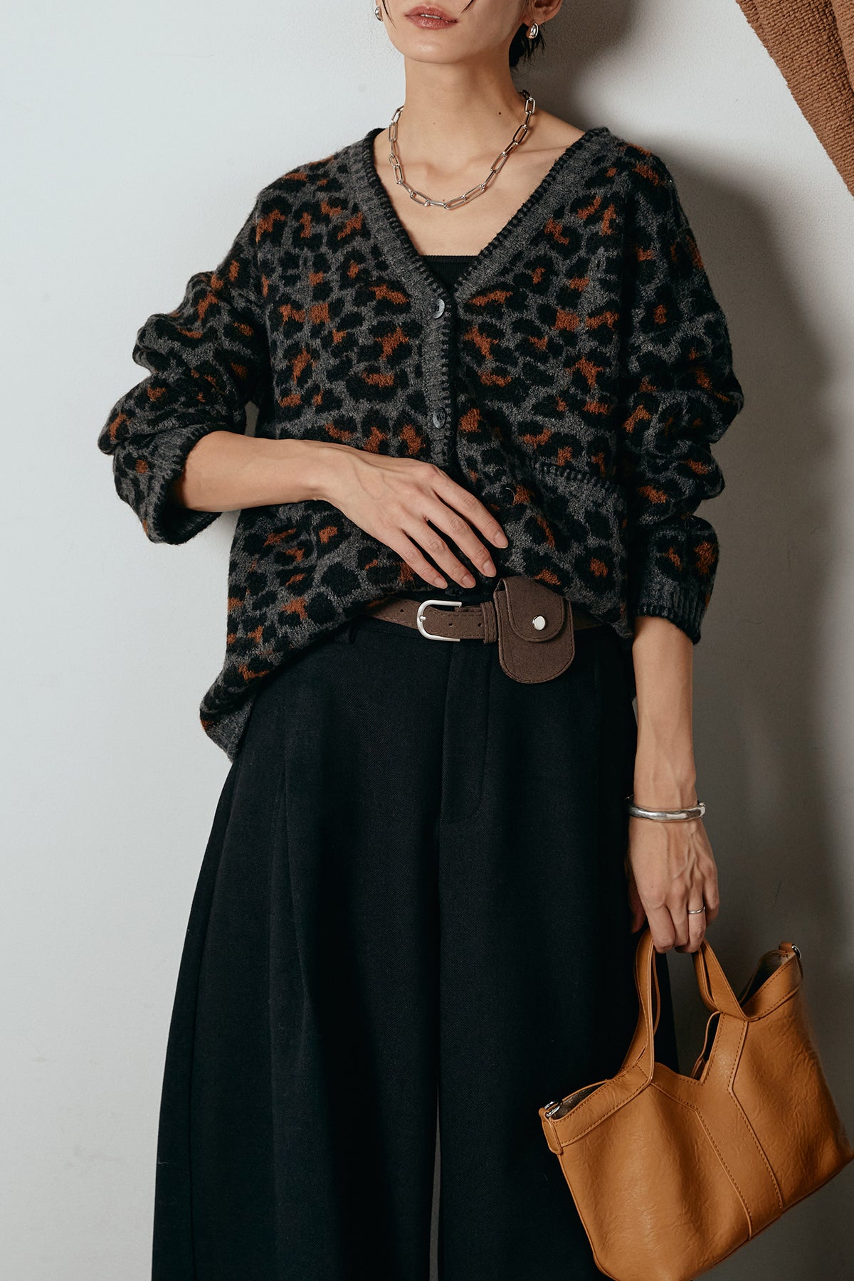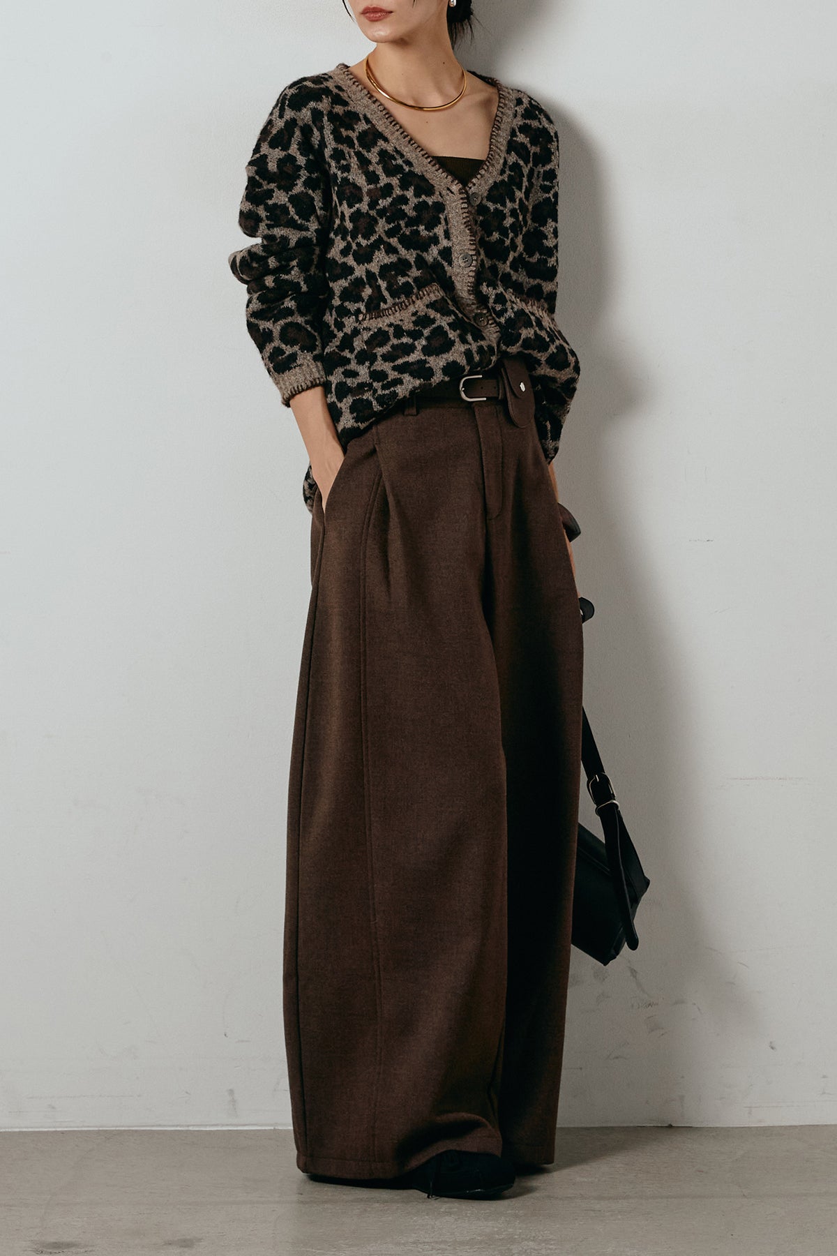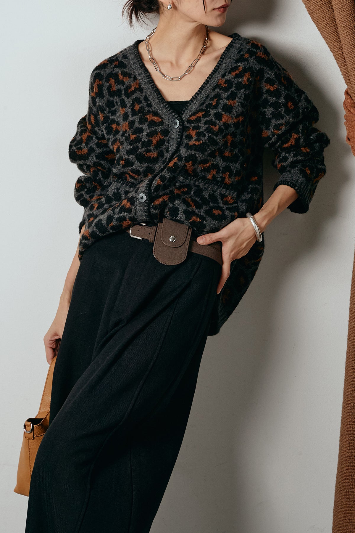 [SET]ステッチデザインレオパードニットカーディガン+ポーチベルト付きカーブパンツ(2set)
