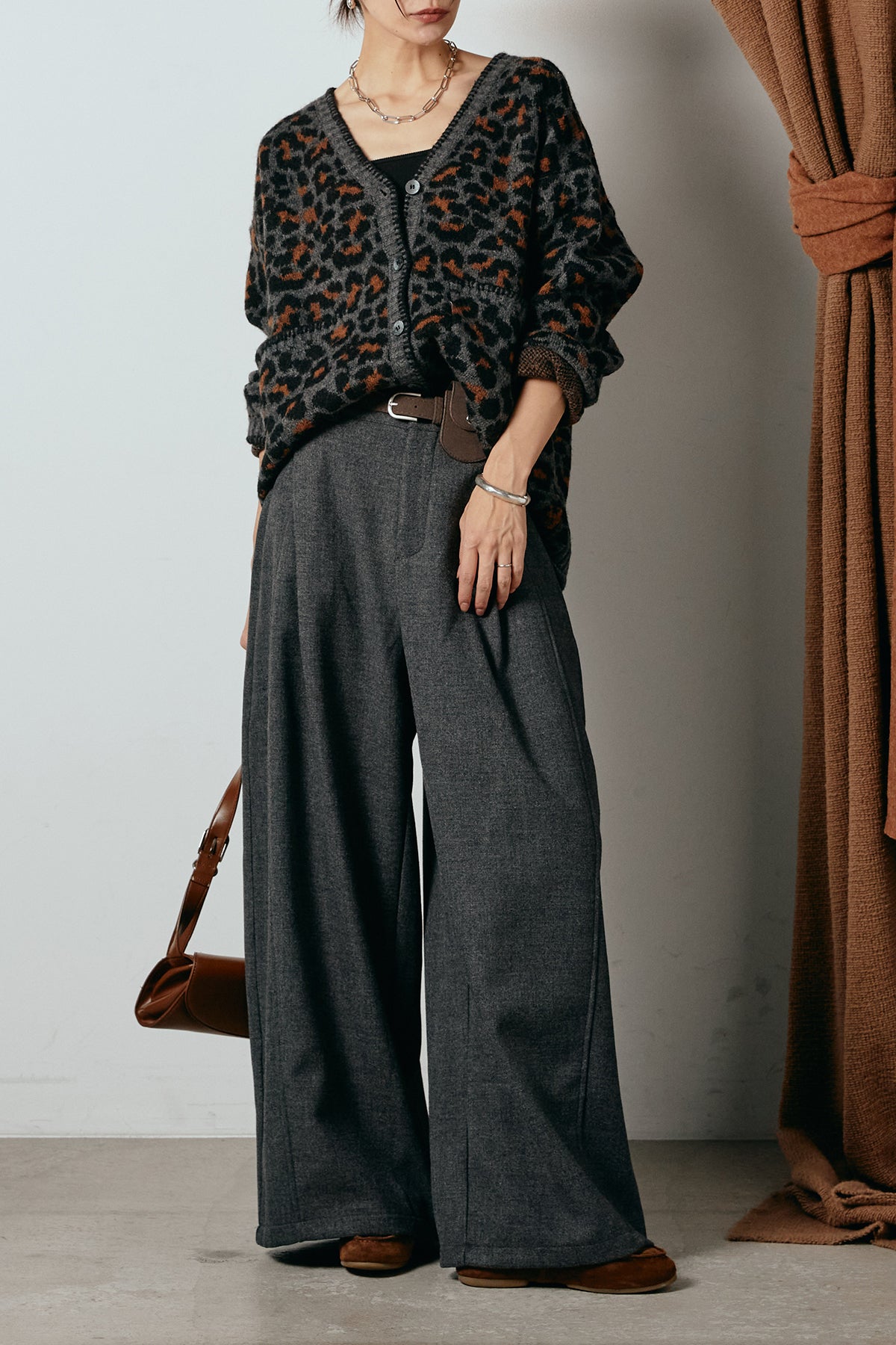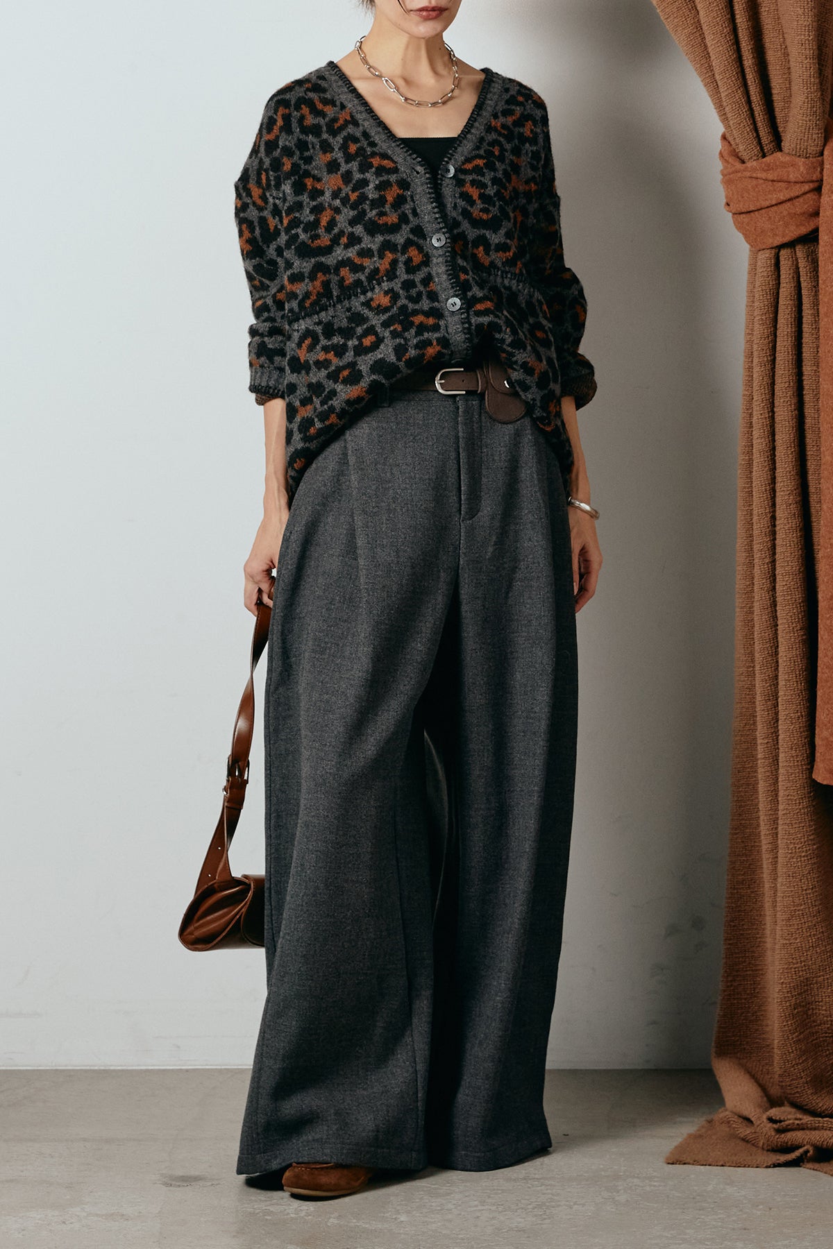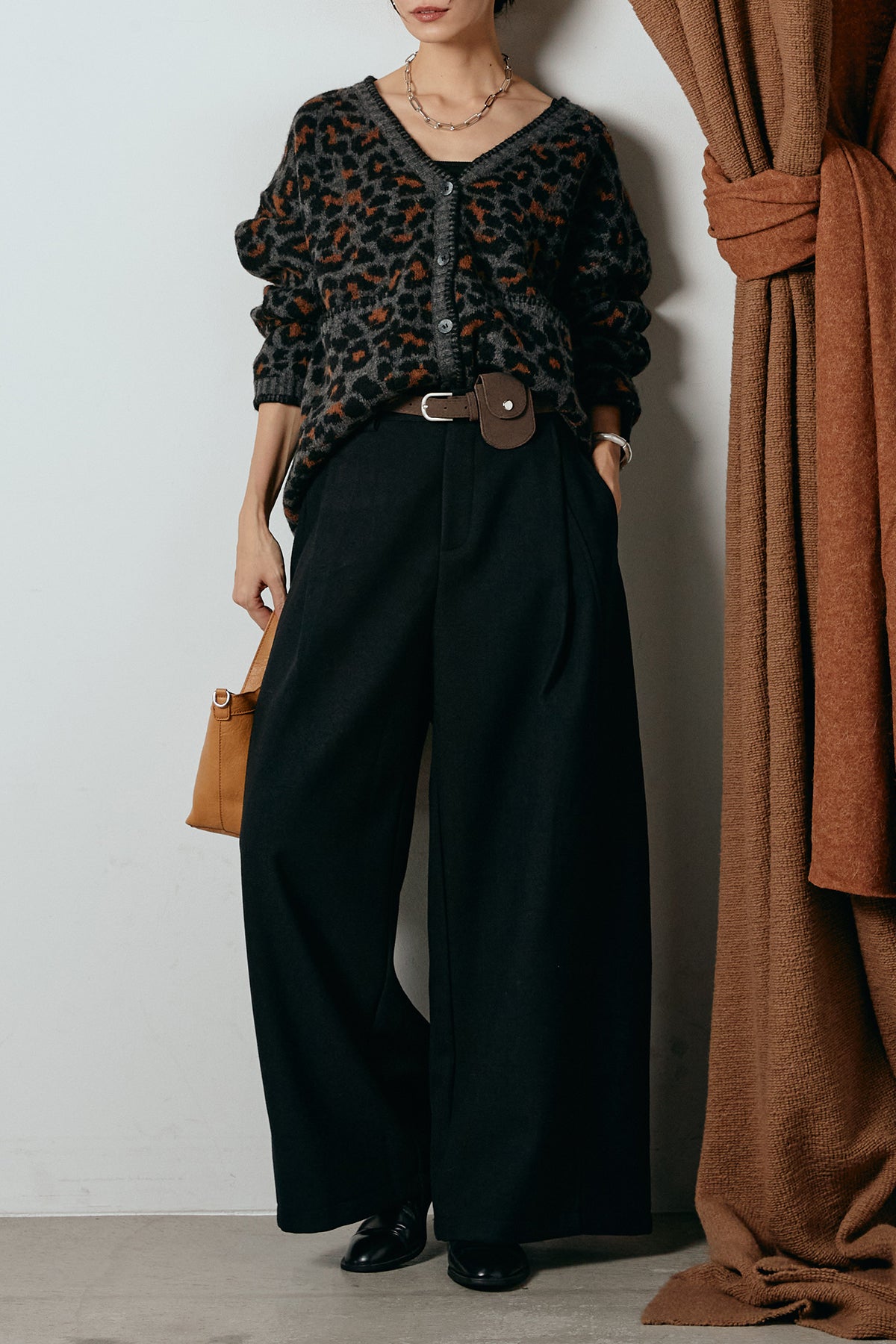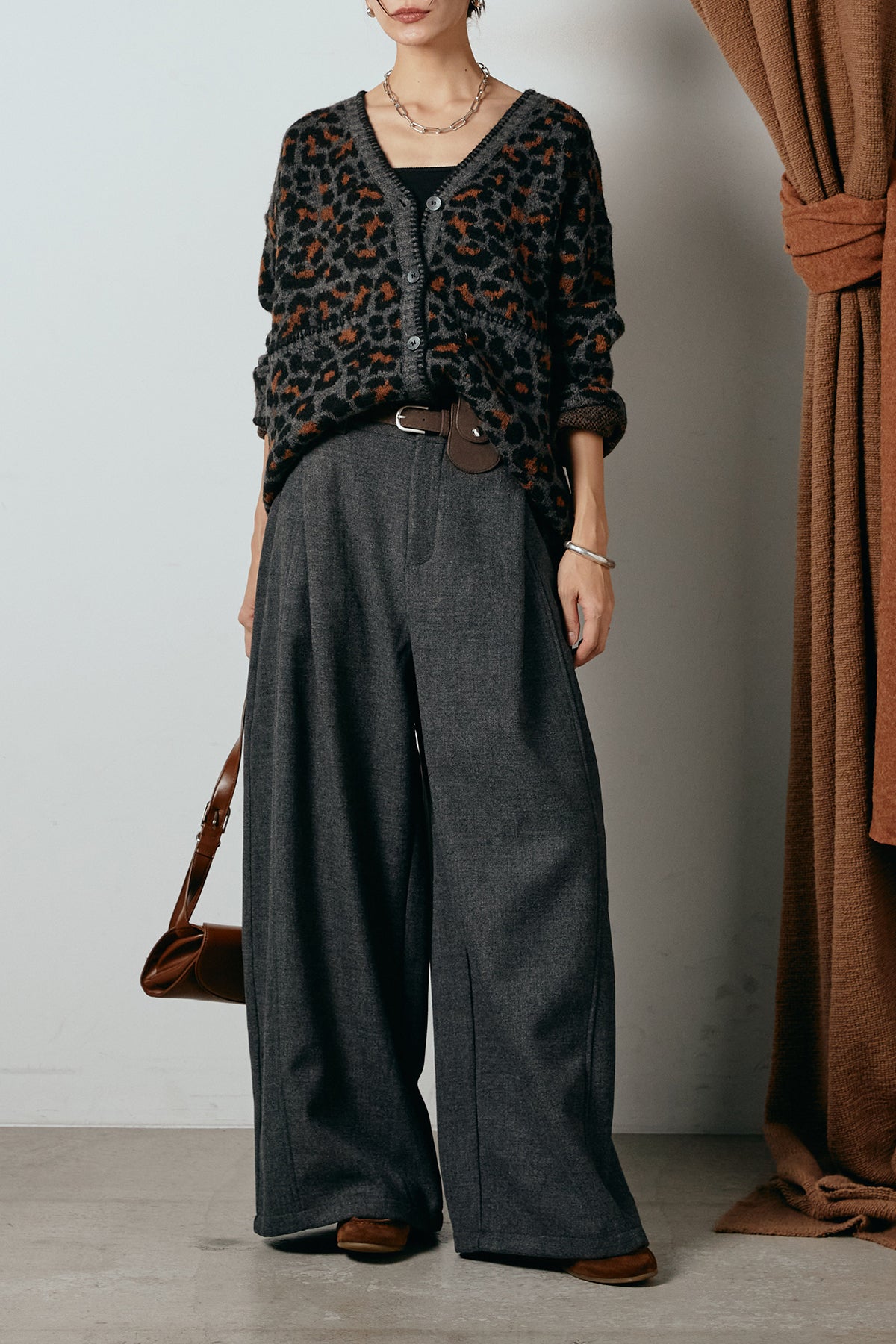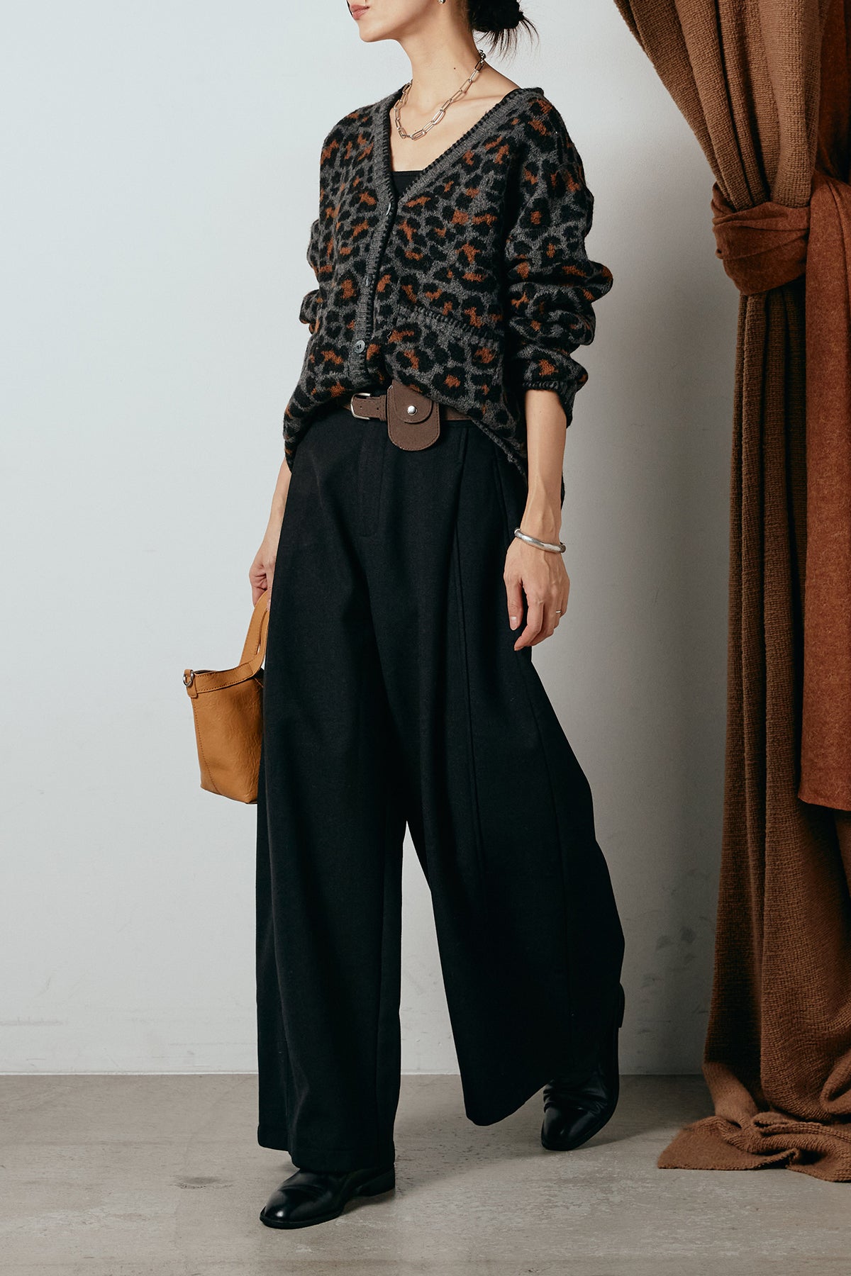 [SET]ステッチデザインレオパードニットカーディガン+ポーチベルト付きカーブパンツ(2set)