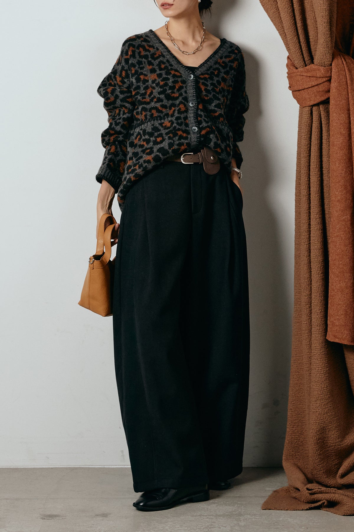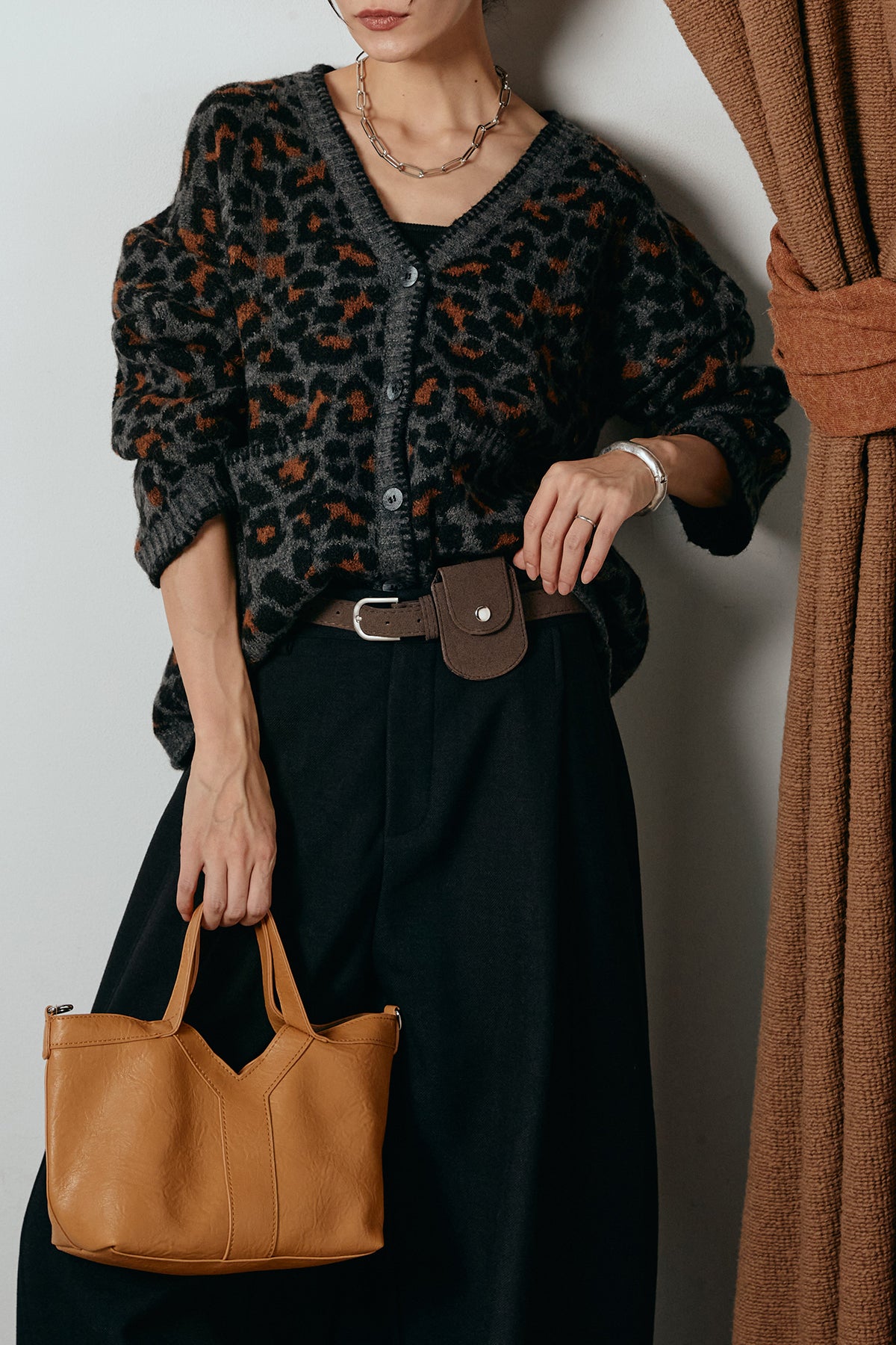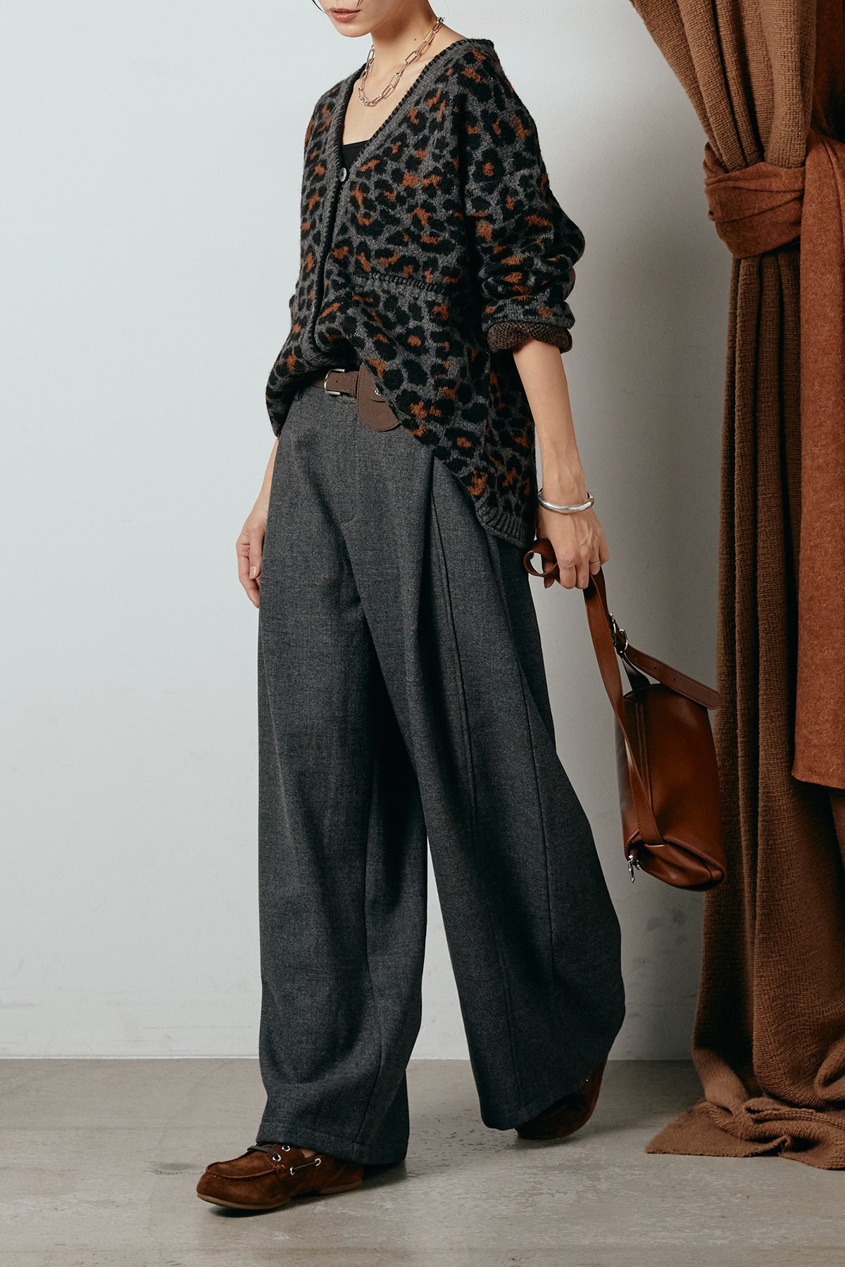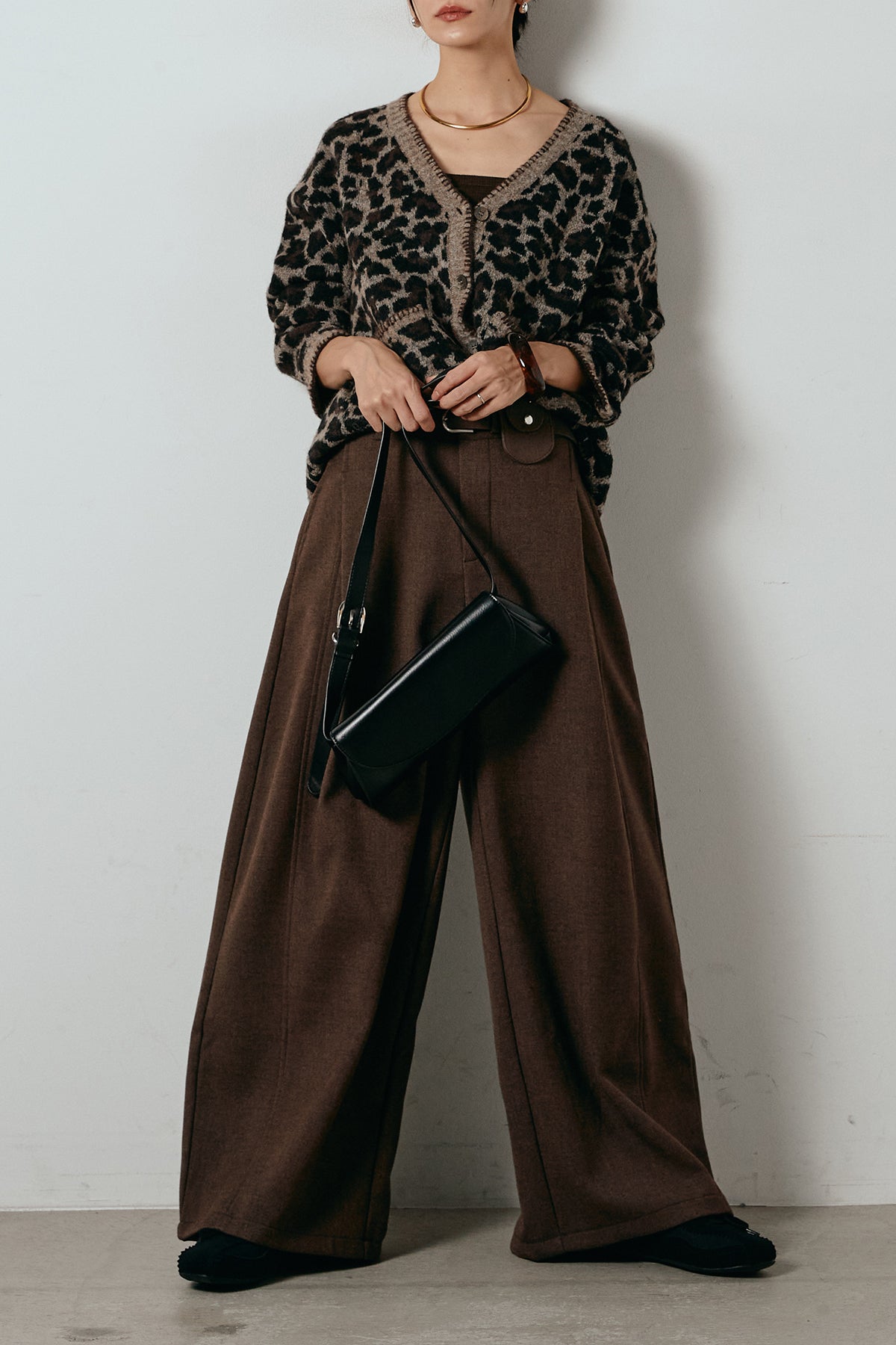 [SET]ステッチデザインレオパードニットカーディガン+ポーチベルト付きカーブパンツ(2set)