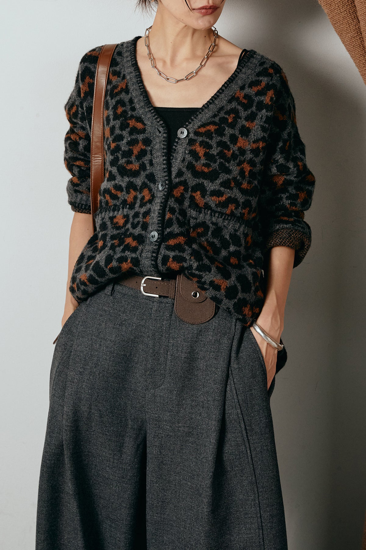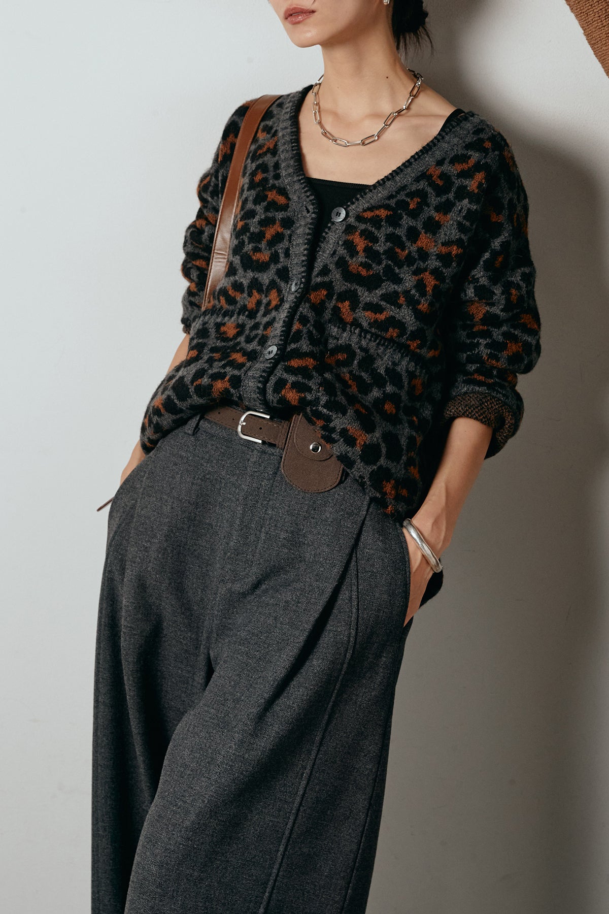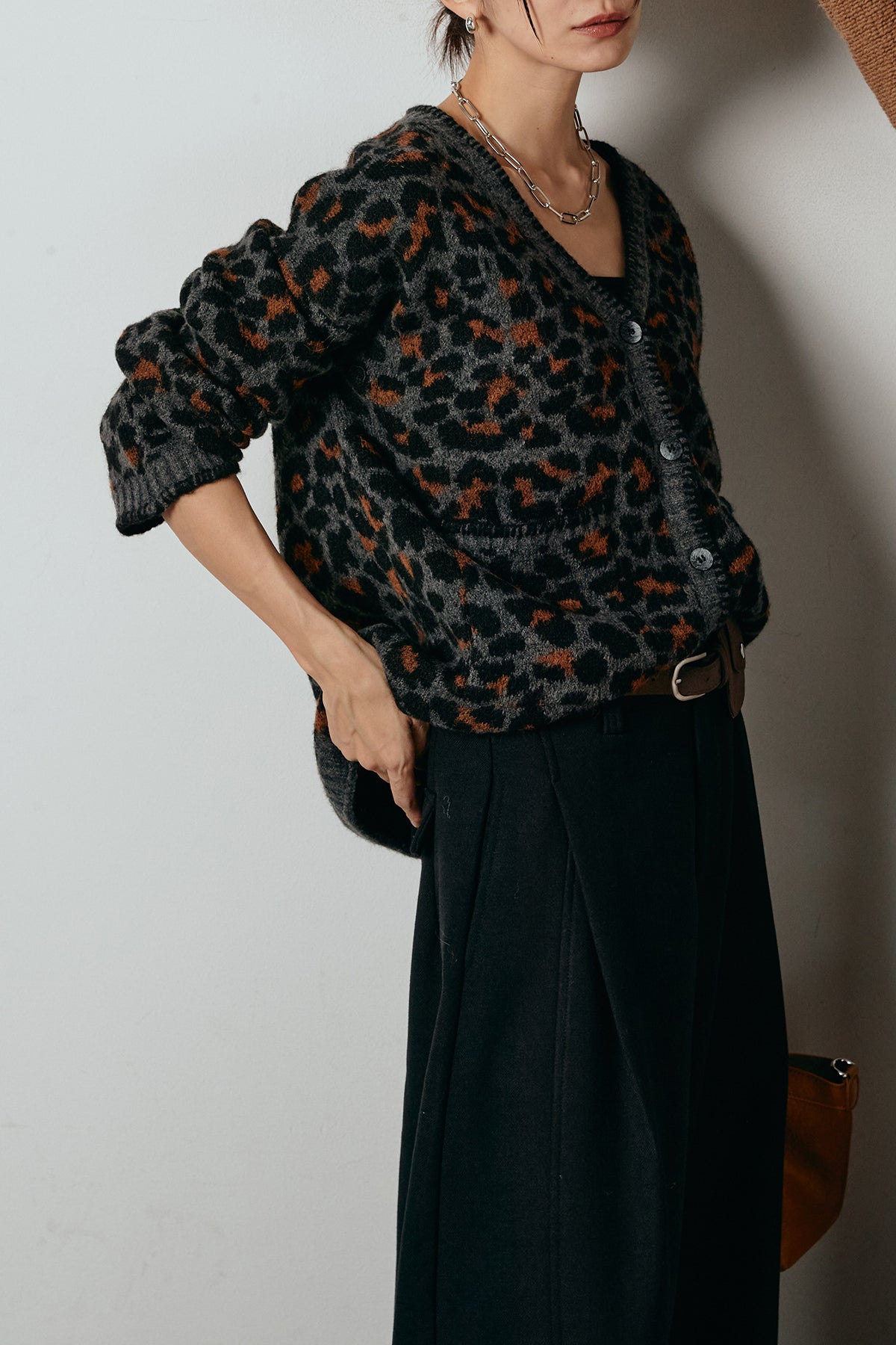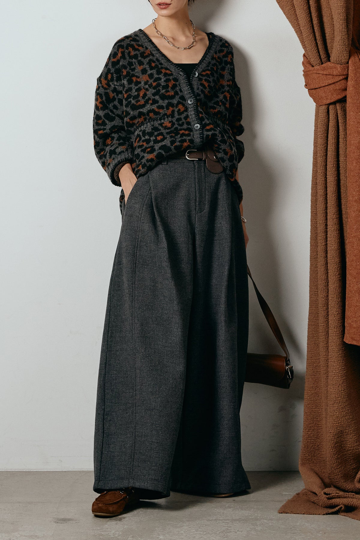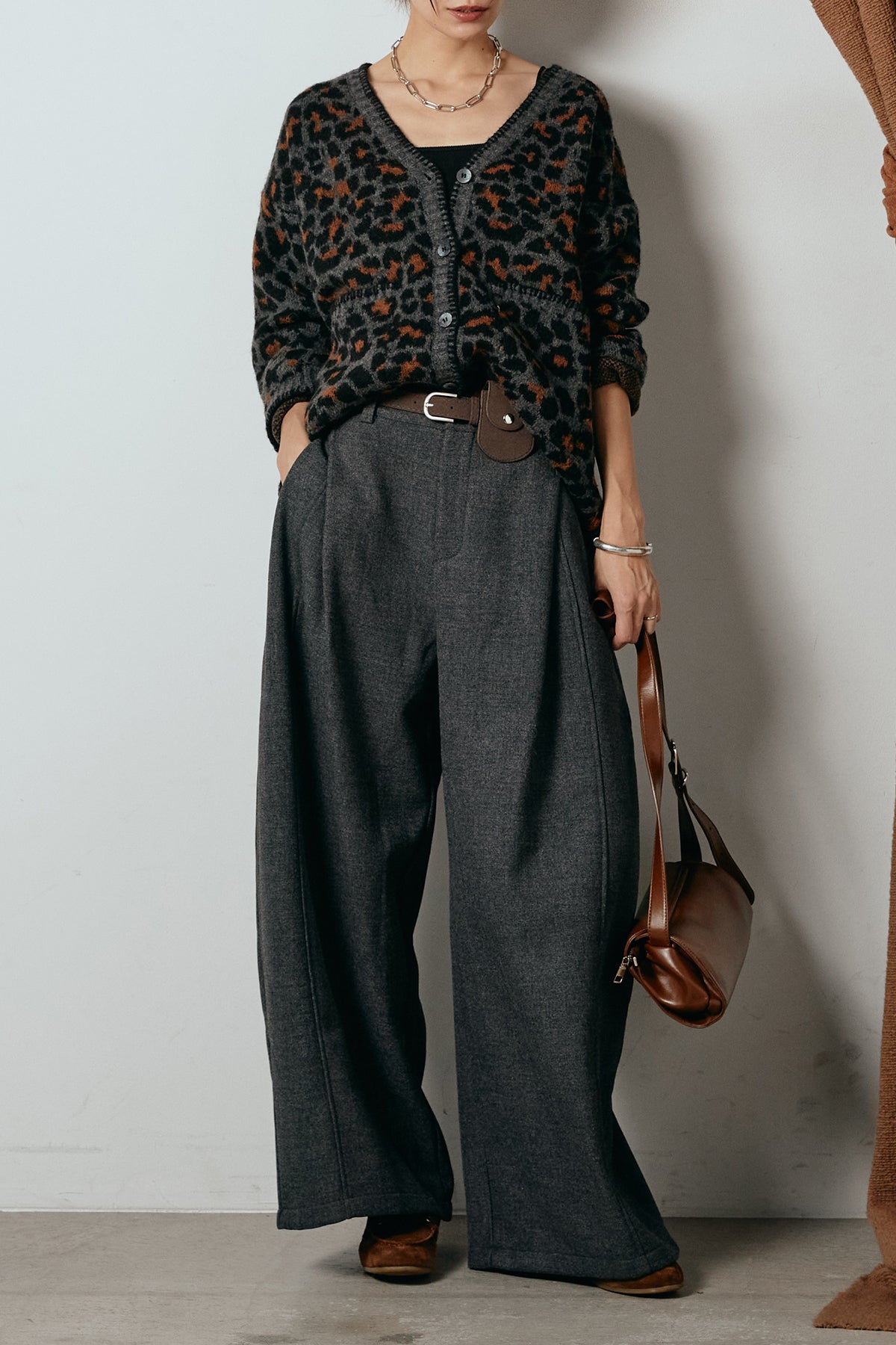 [SET]ステッチデザインレオパードニットカーディガン+ポーチベルト付きカーブパンツ(2set)