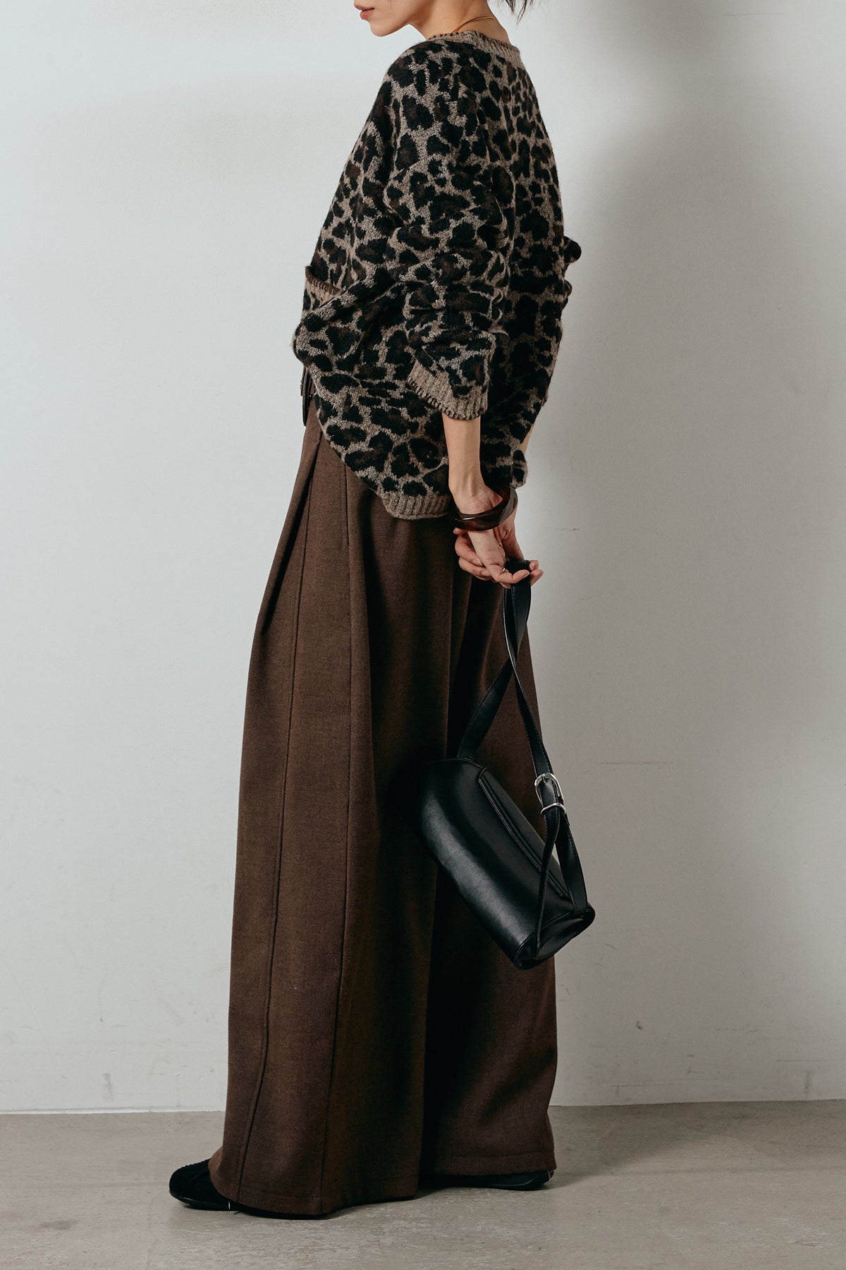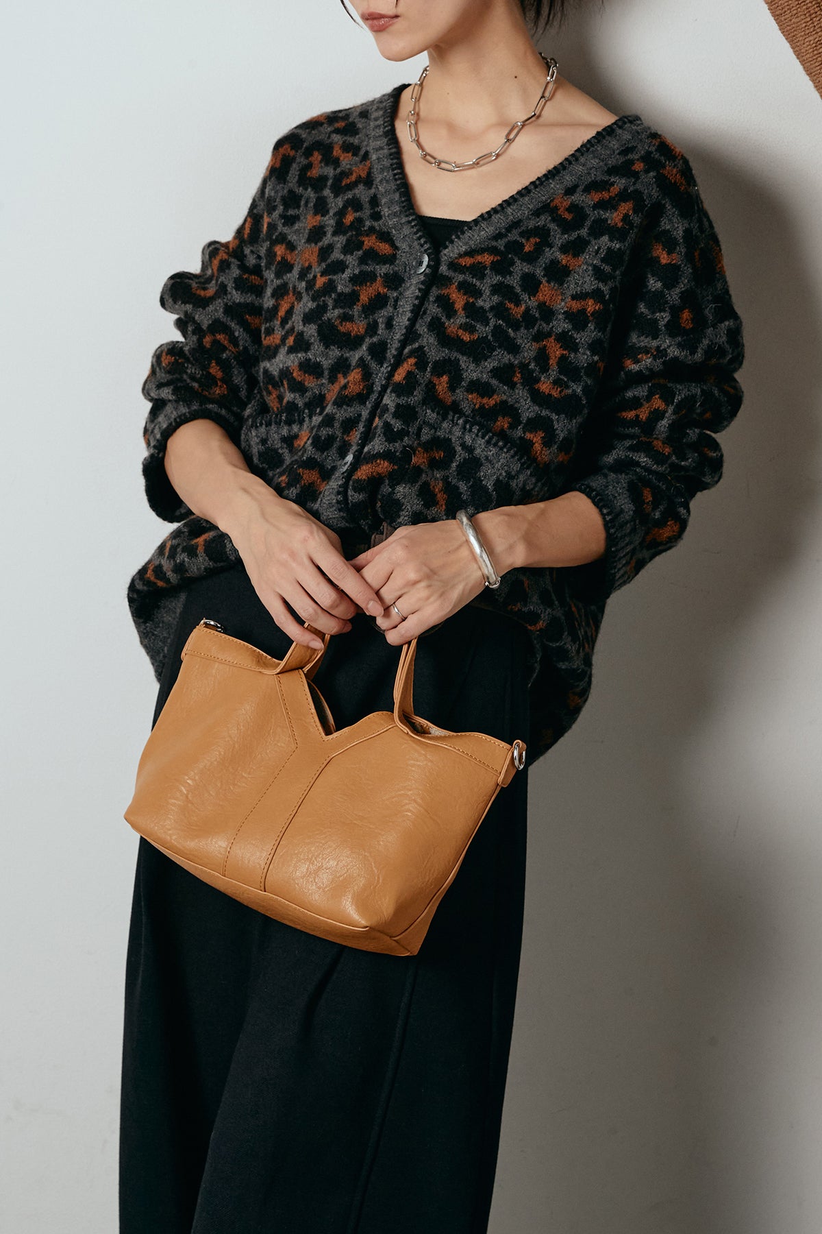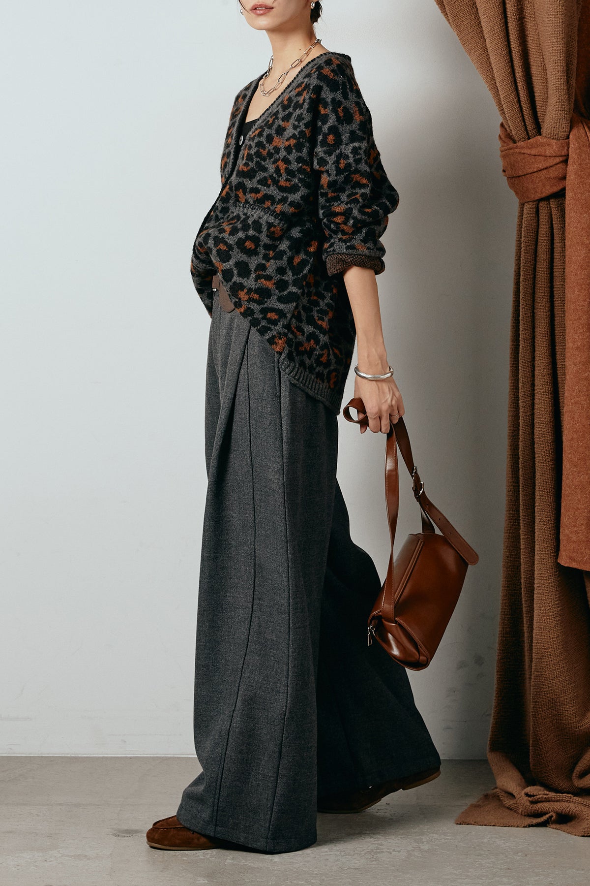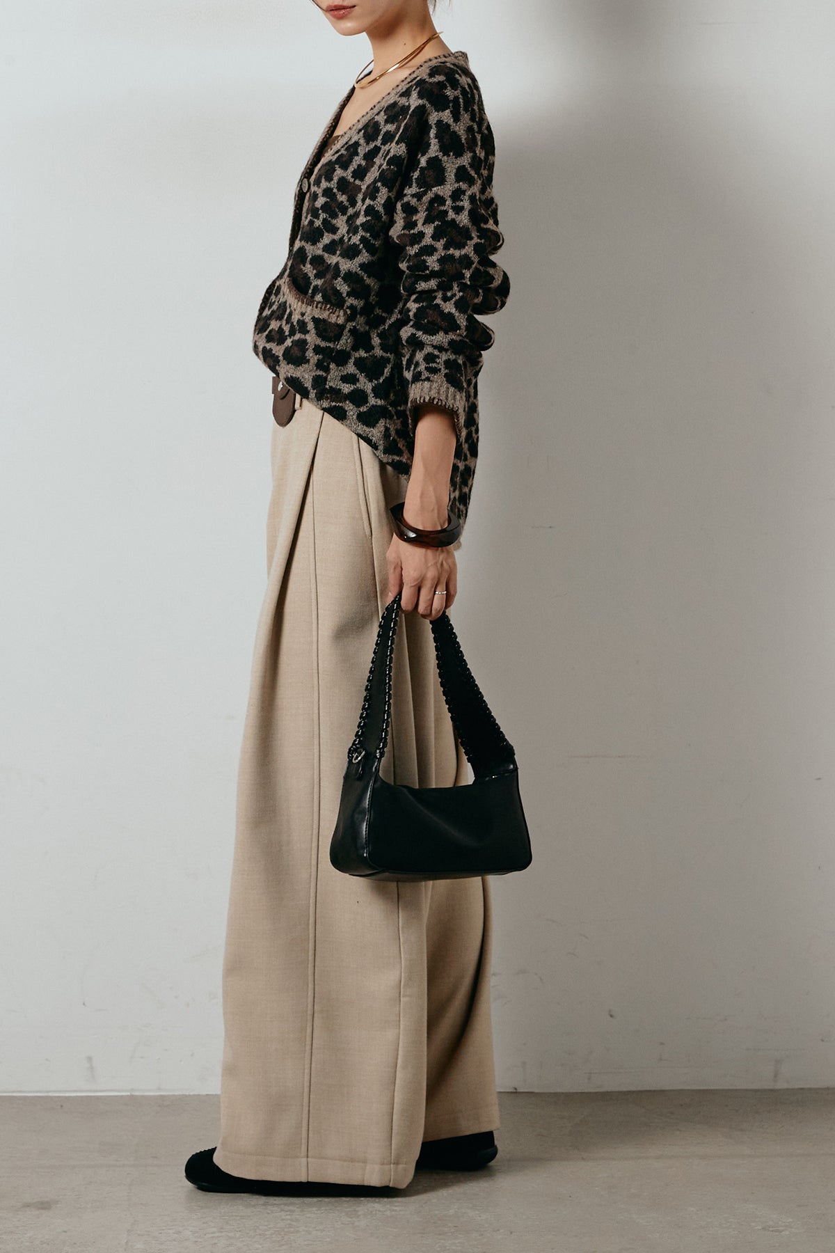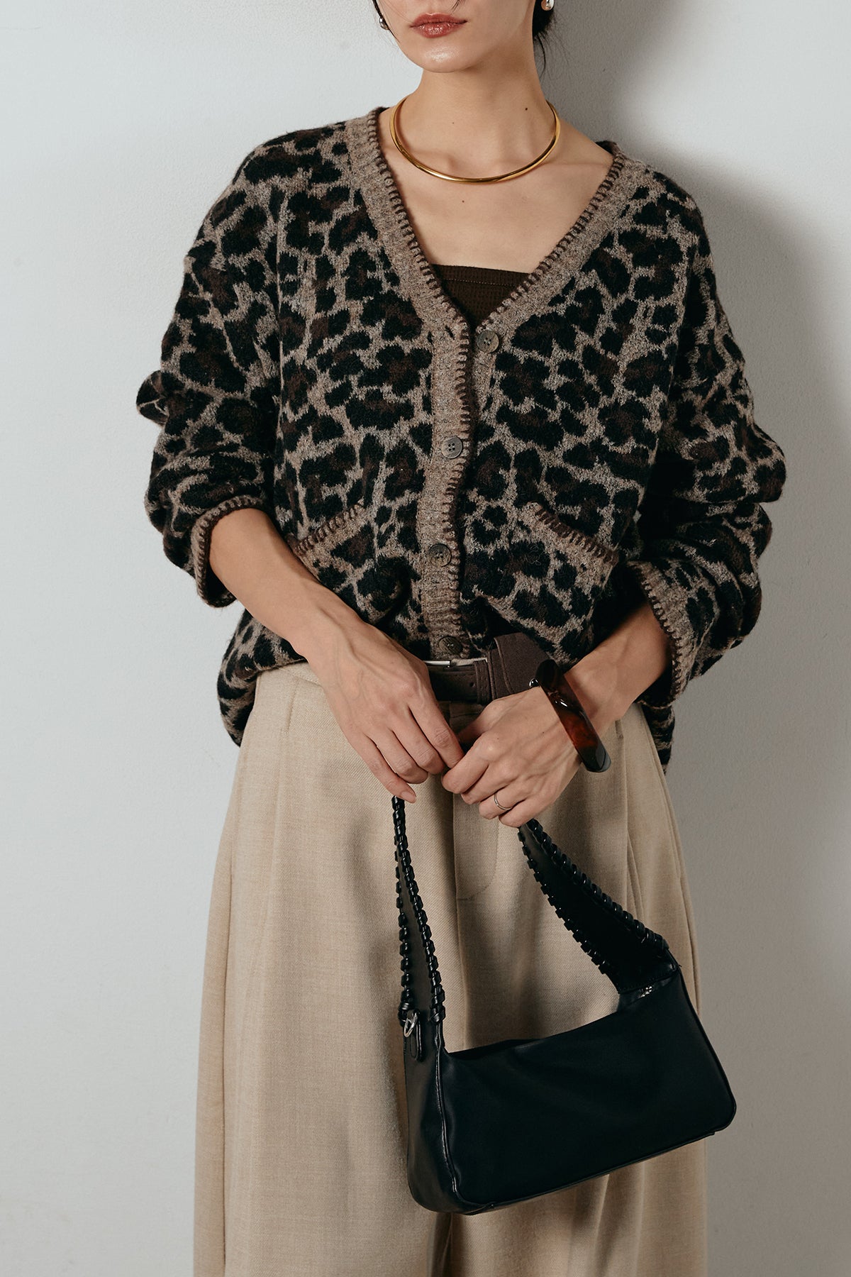 [SET]ステッチデザインレオパードニットカーディガン+ポーチベルト付きカーブパンツ(2set)