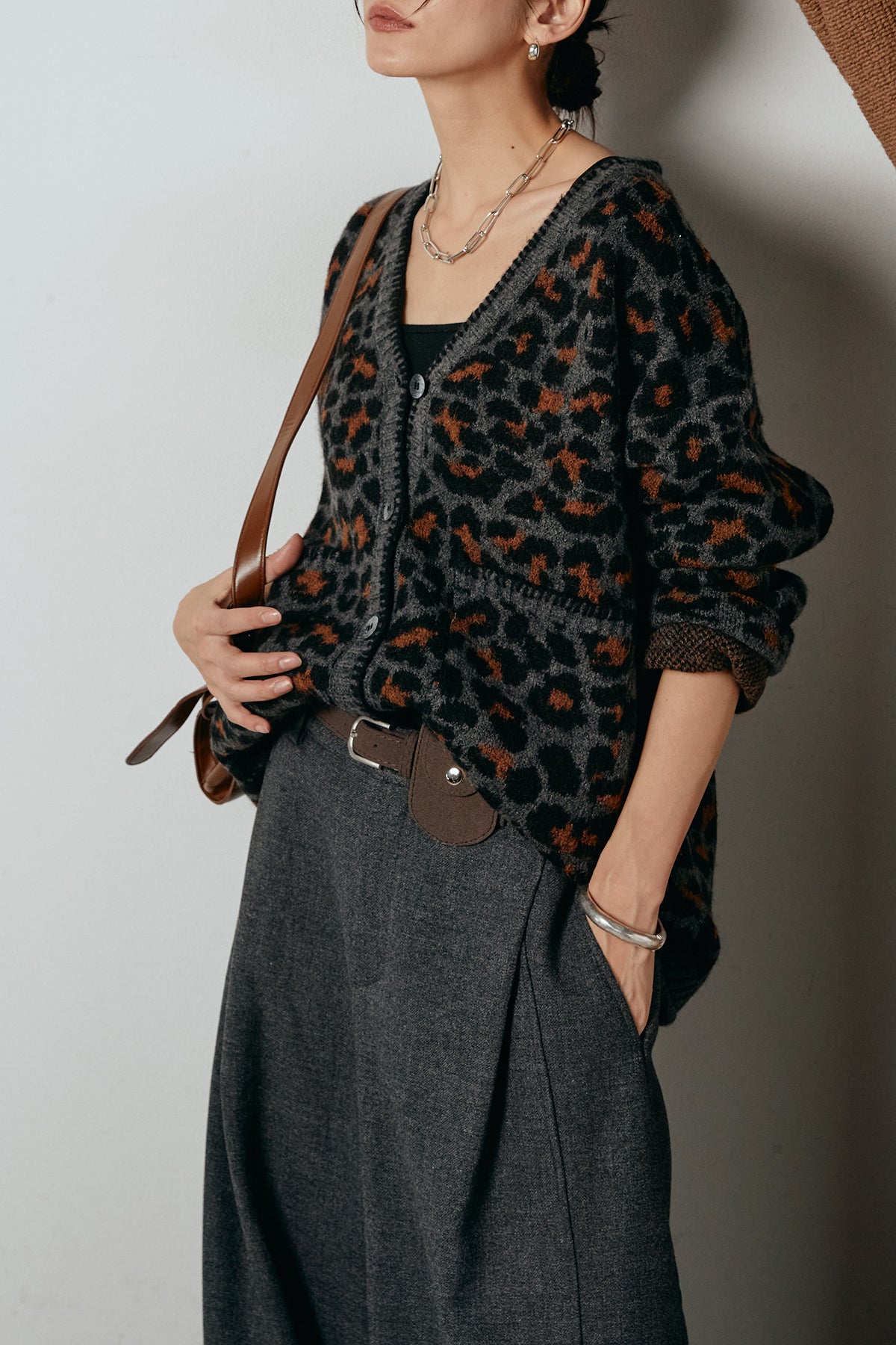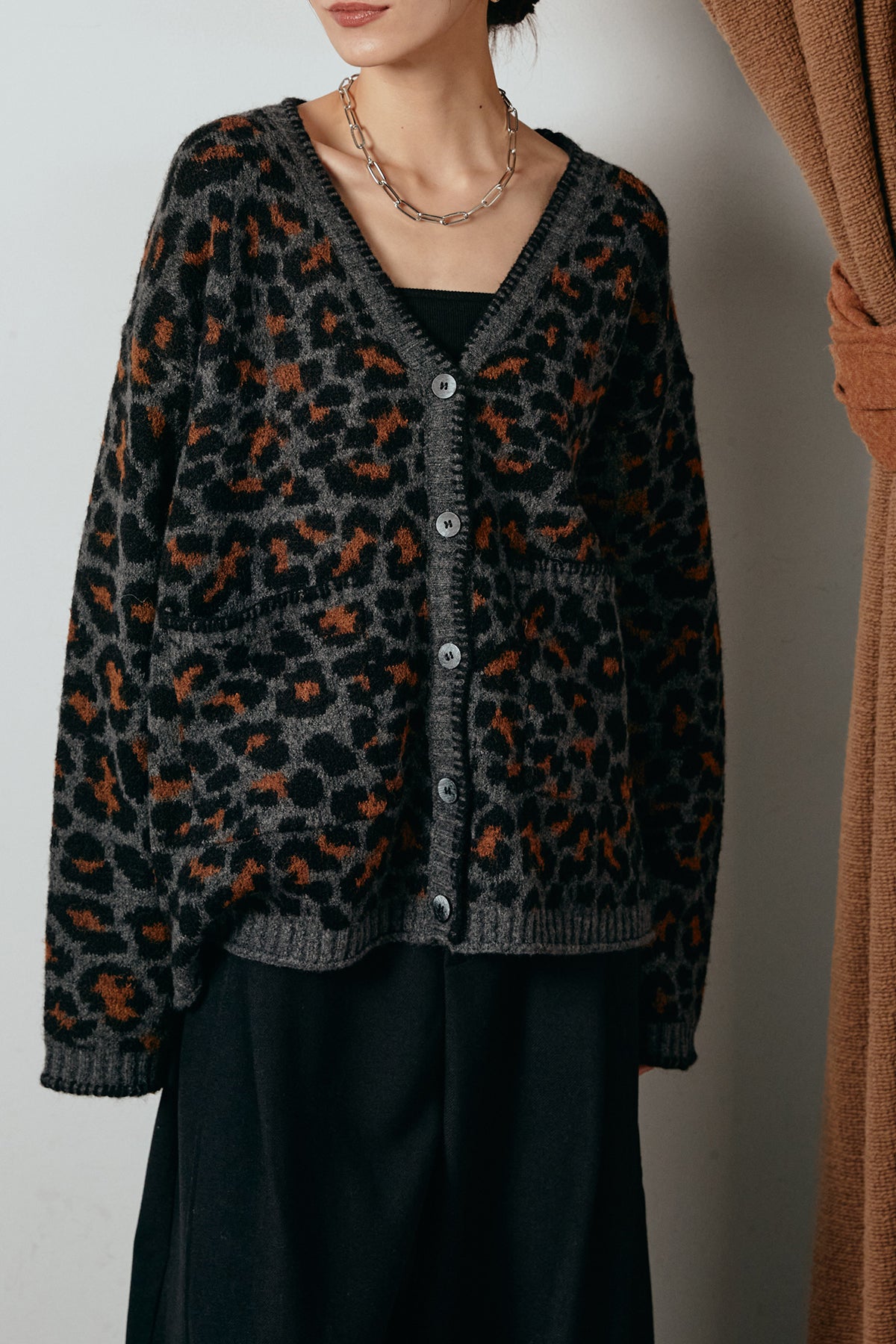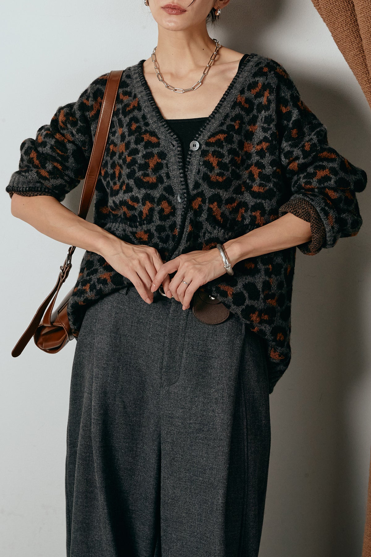 立体感のあるレオパード柄が目を惹くニットカーディガン。 ステッチを効かせたメリハリのあるデザインで、シンプルなアイテムに合わせるだけで印象的なスタイルに。 ゆったりとしたシルエットが抜け感を生み、羽織るだけで季節感を高めてくれます。 デイリーのワードローブに加えたい、存在感ある一枚。